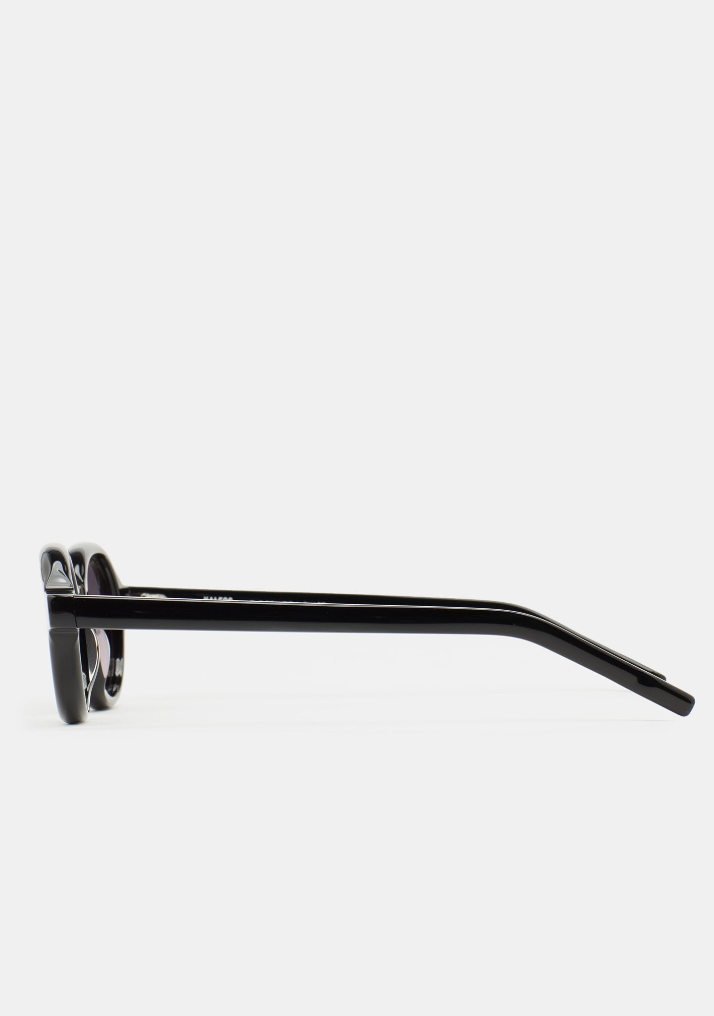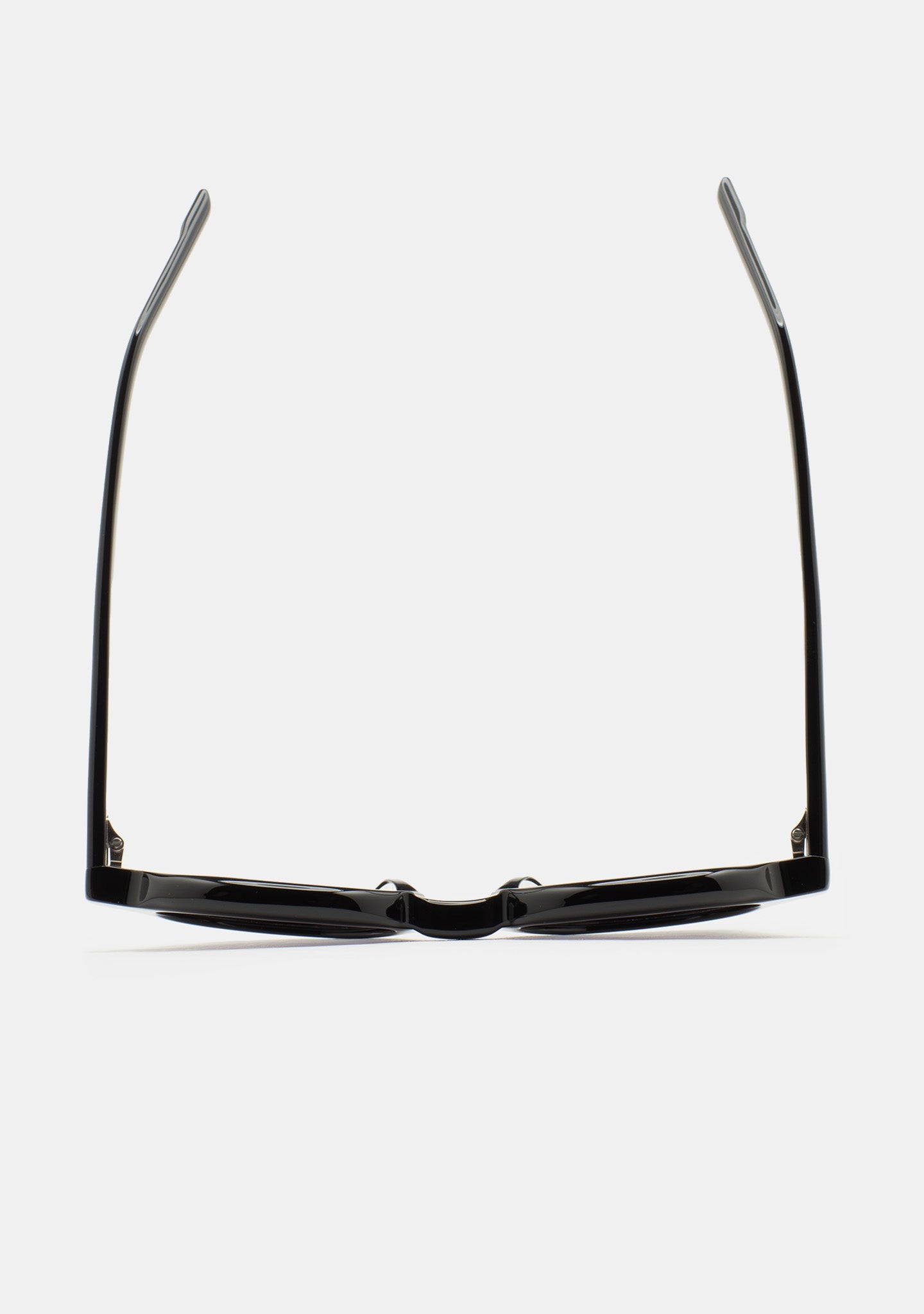 Ovale Sonnenbrille. Modernes Design mit subtilen Konturen, die den Unterschied machen. Front und Bügel aus schwarzem Acetat. Graue Verlaufsgläser Basis 2 mit 100 % UV-Schutz und Antireflex-Beschichtung. Gläser der Kategorie 3. Integrierte Nasenpads. Handgefertigt.