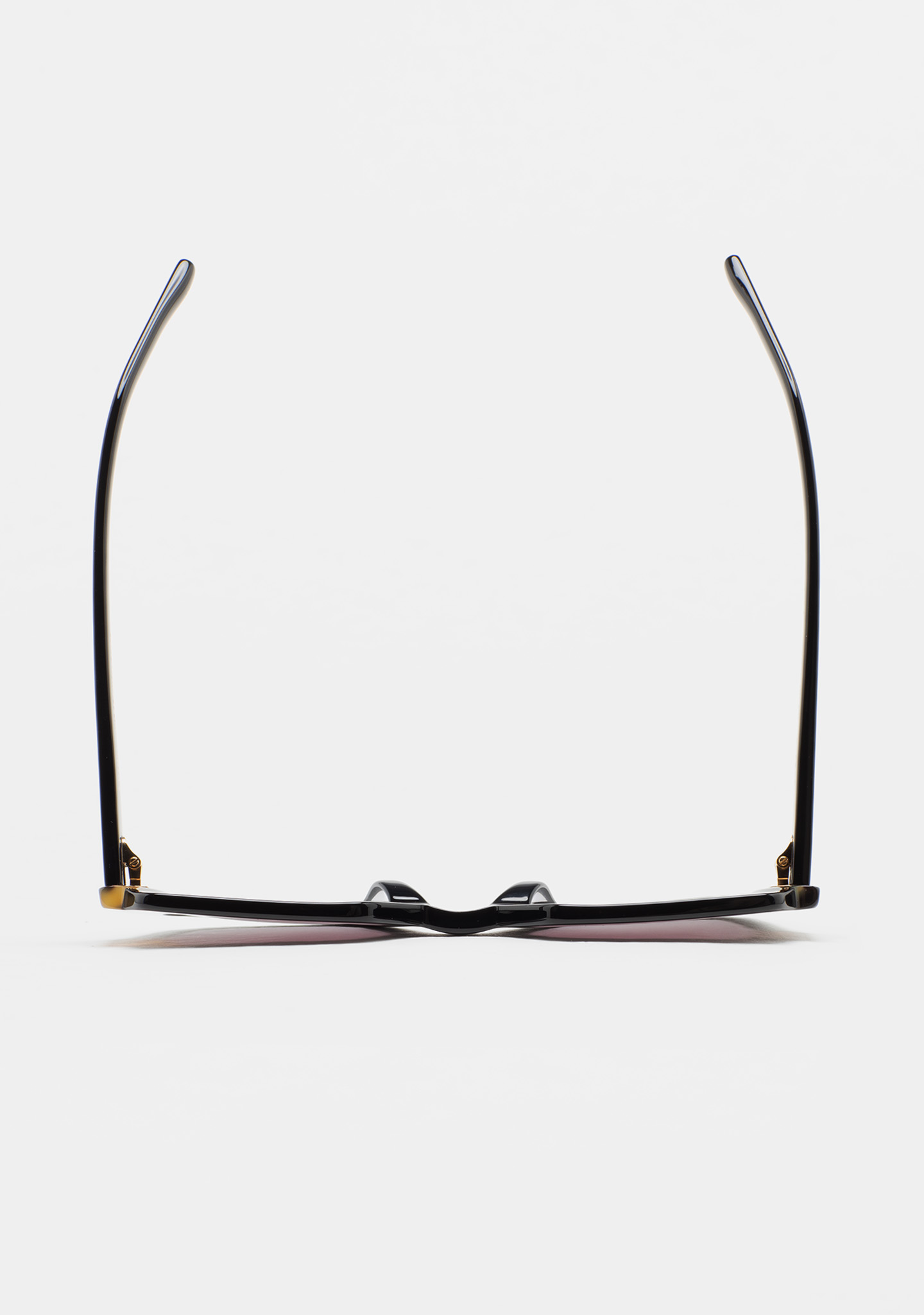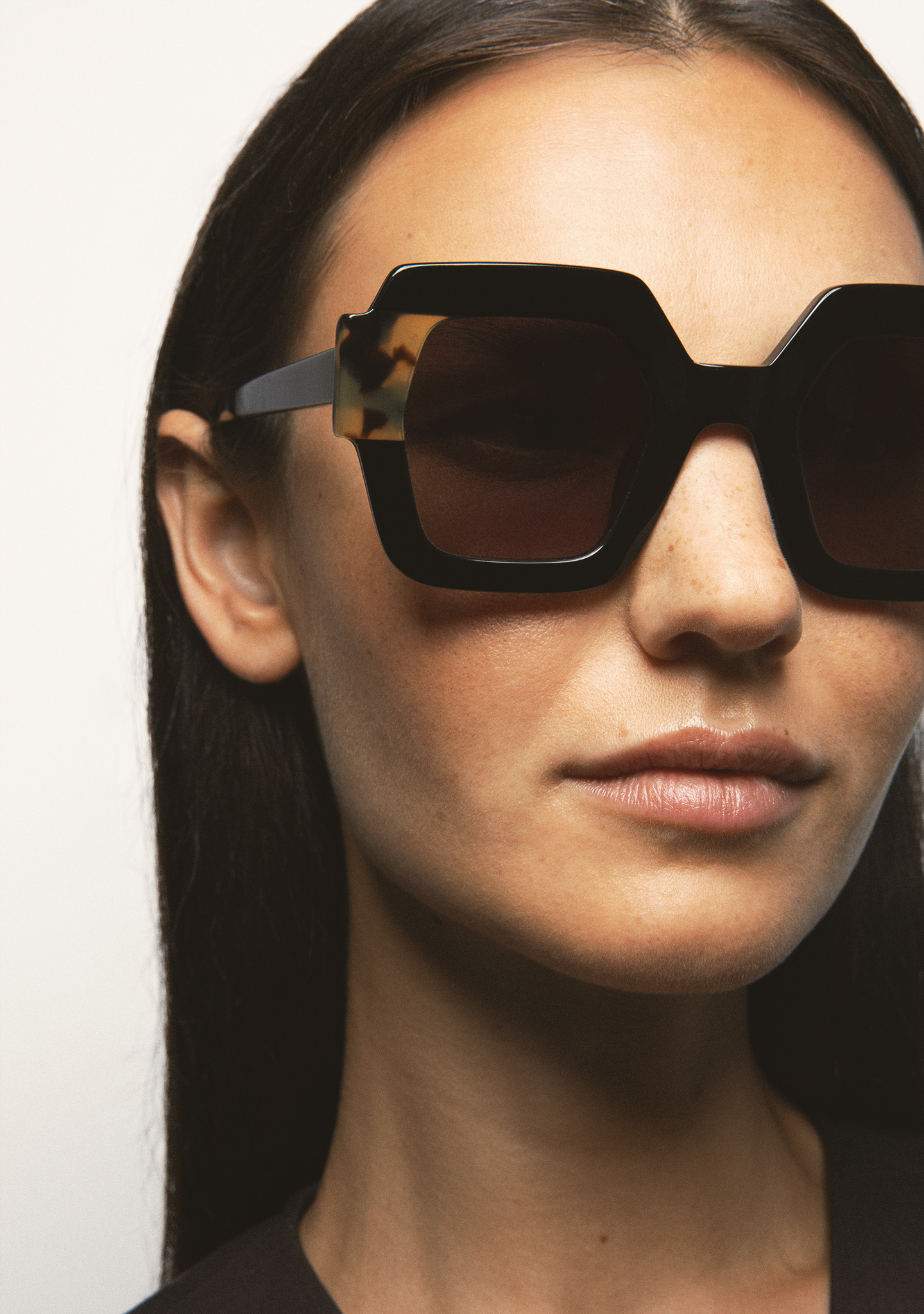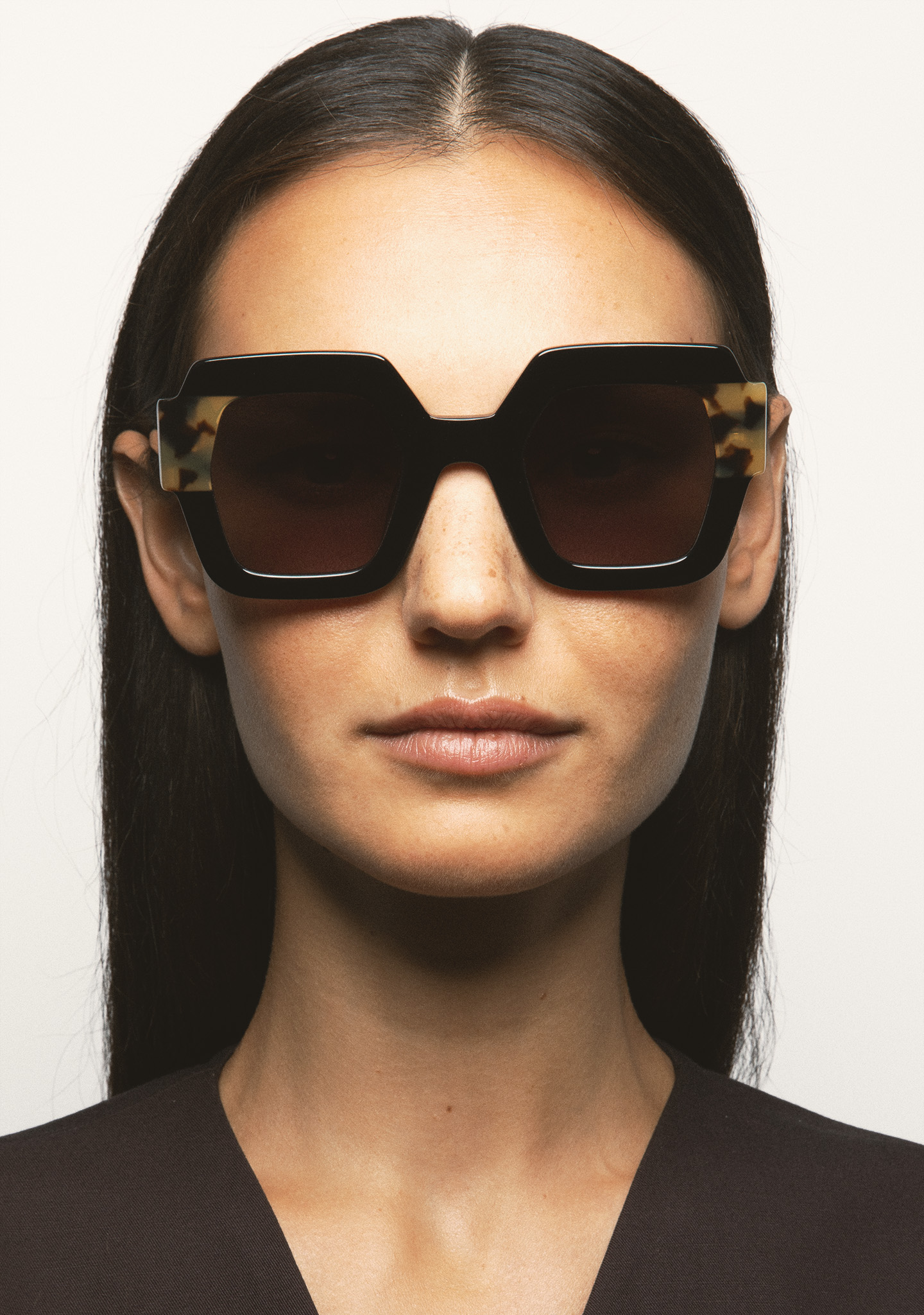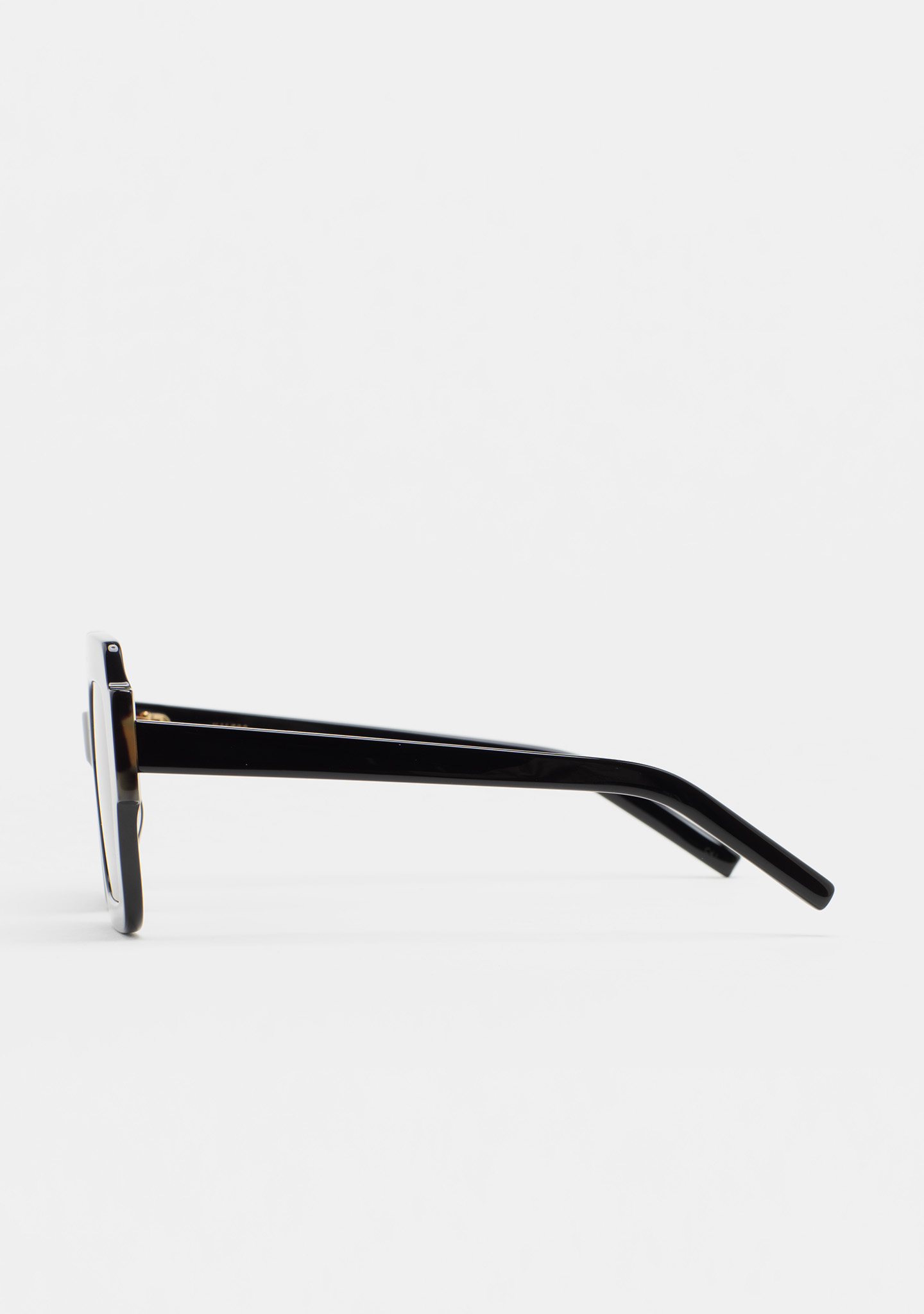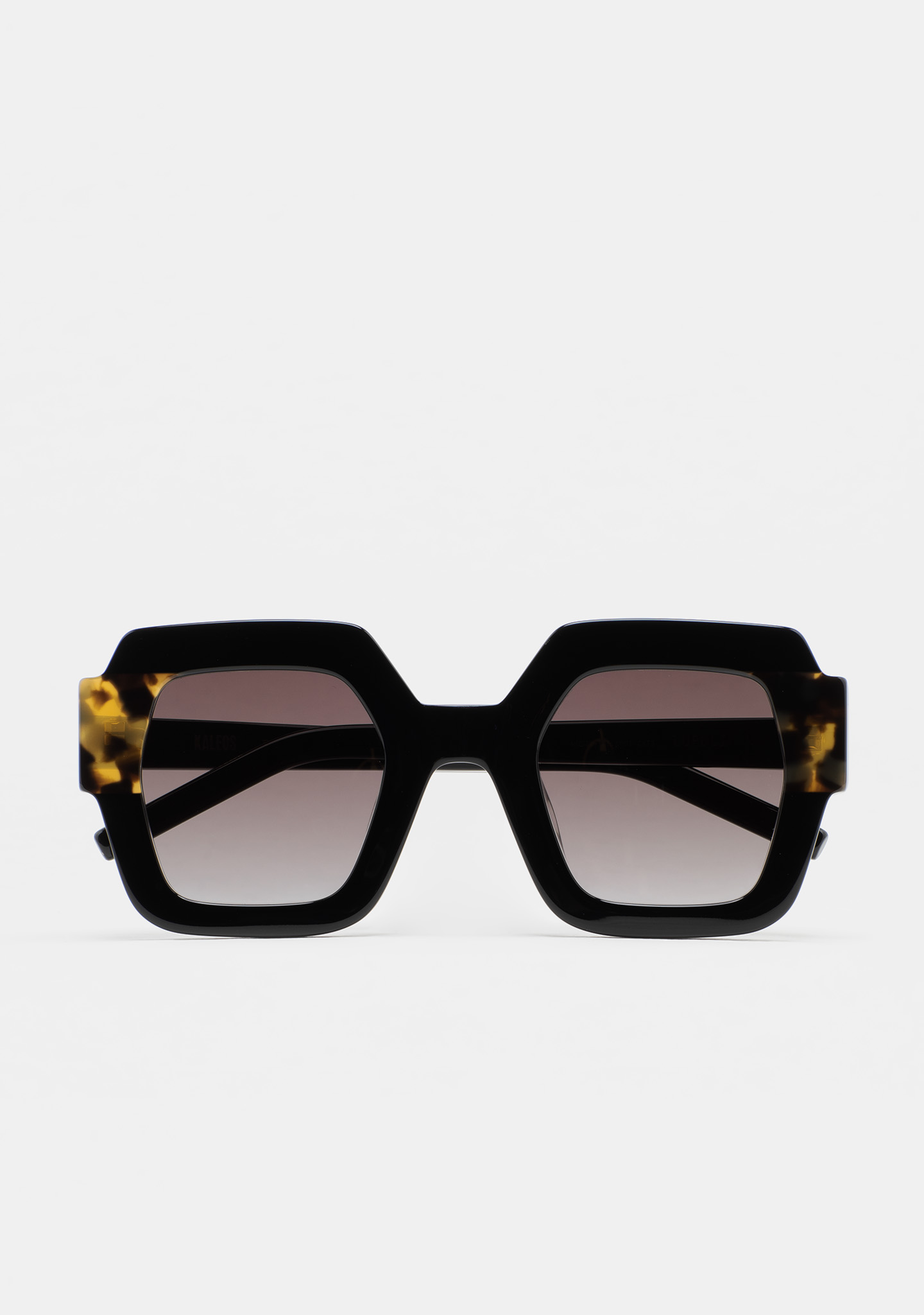 Quadratische Sonnenbrille. Vorderseite aus schwarzem Azetat mit havannabraunem Laminat. Bügel aus schwarzem Azetat. Grau verlaufende Linse mit Basis 2, 100% UV-Schutz und Anti-Reflex-Beschichtung. Kategorie 3 Linse. Integrierte Acetat-Polster. Handgefertigt.