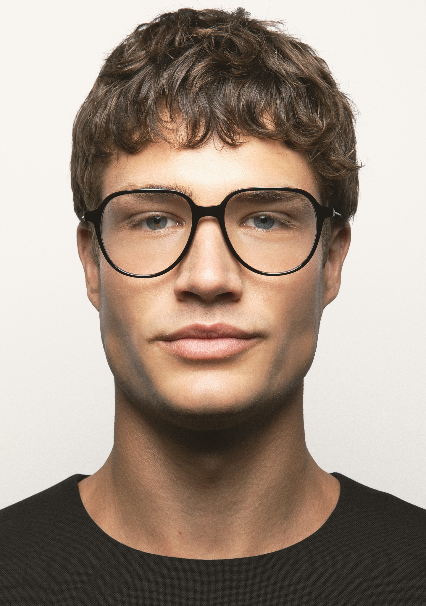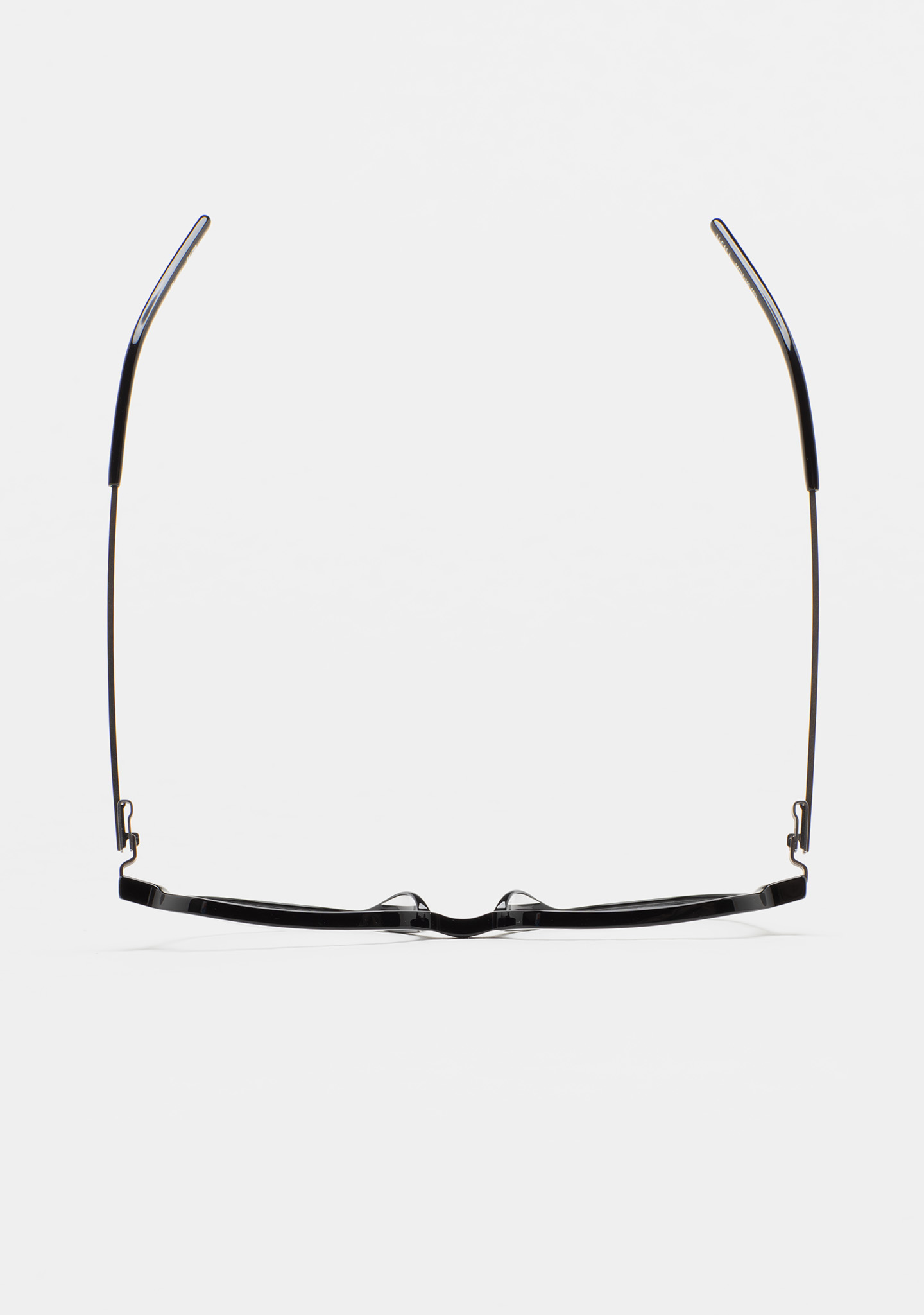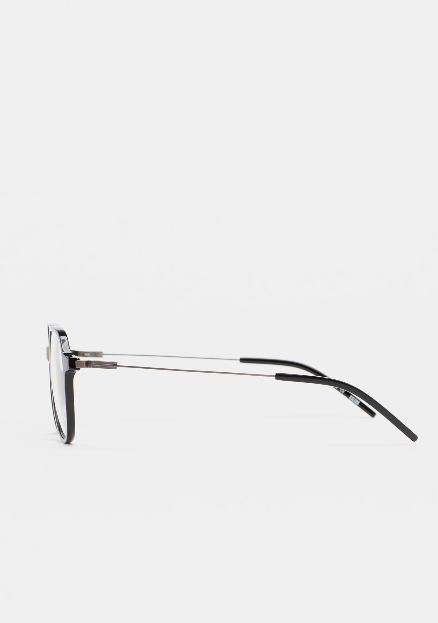Sehhilfe in Pilotenform. Front aus schwarzem High-Density-Acetat. Bügel aus matt dunkelgrauem Edelstahl mit schwarzen Acetat-Endstücken. Bügel mit neuer schraubenloser Scharniertechnologie. Integrierte Acetat-Nasenpads. Handgefertigt.