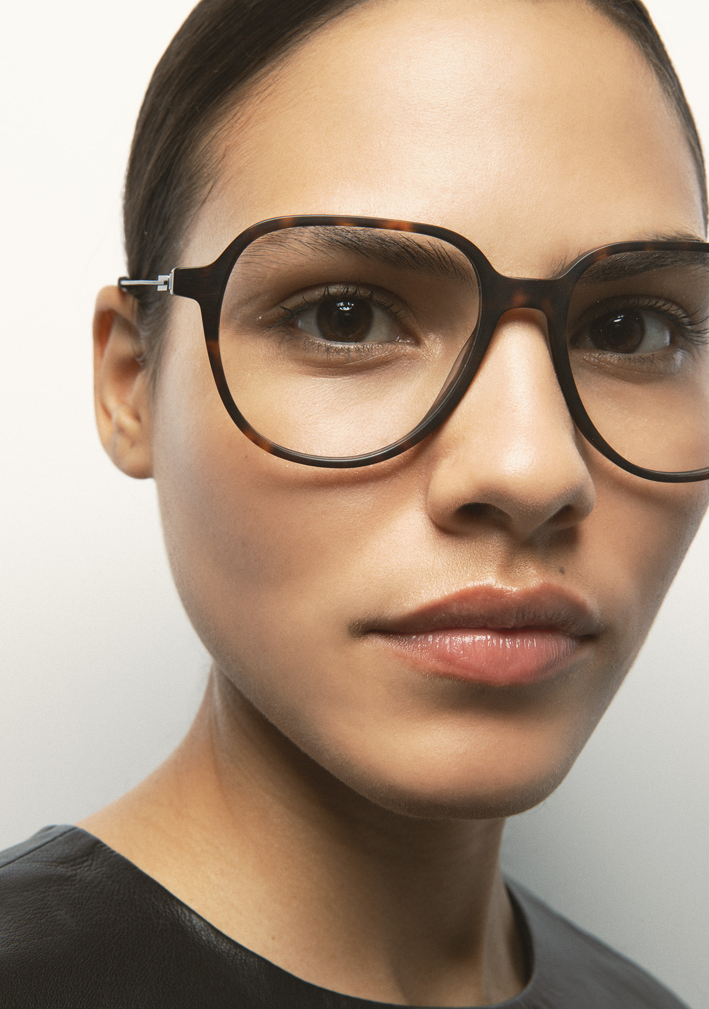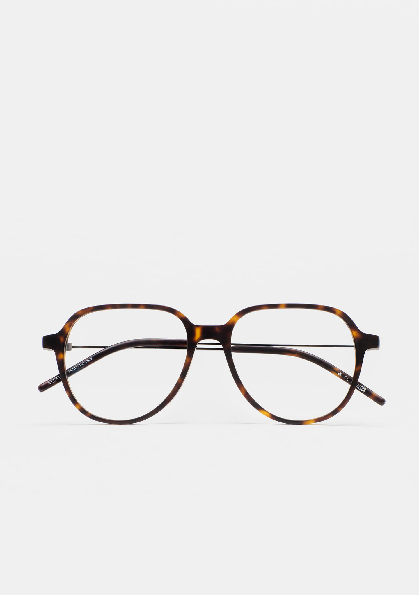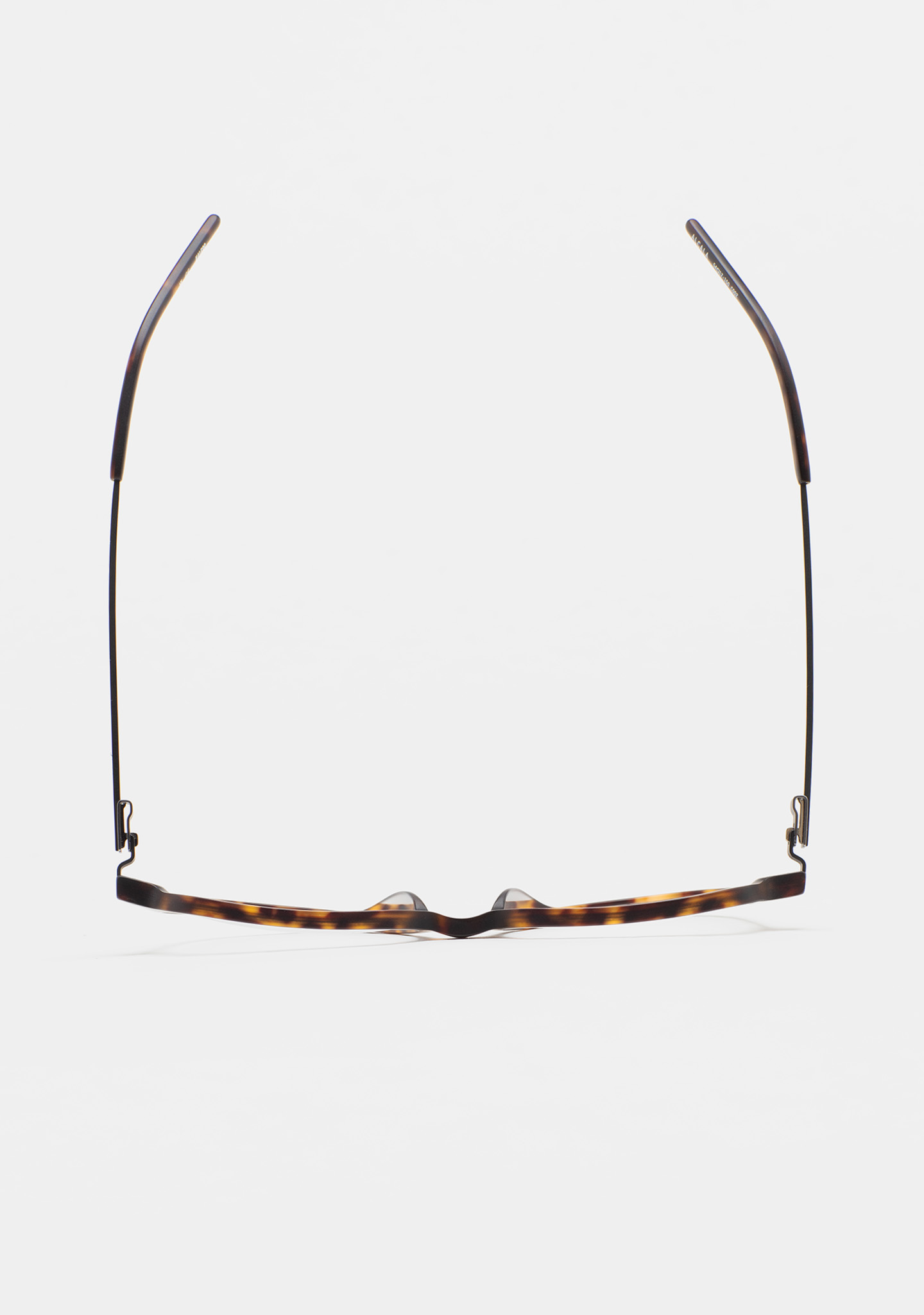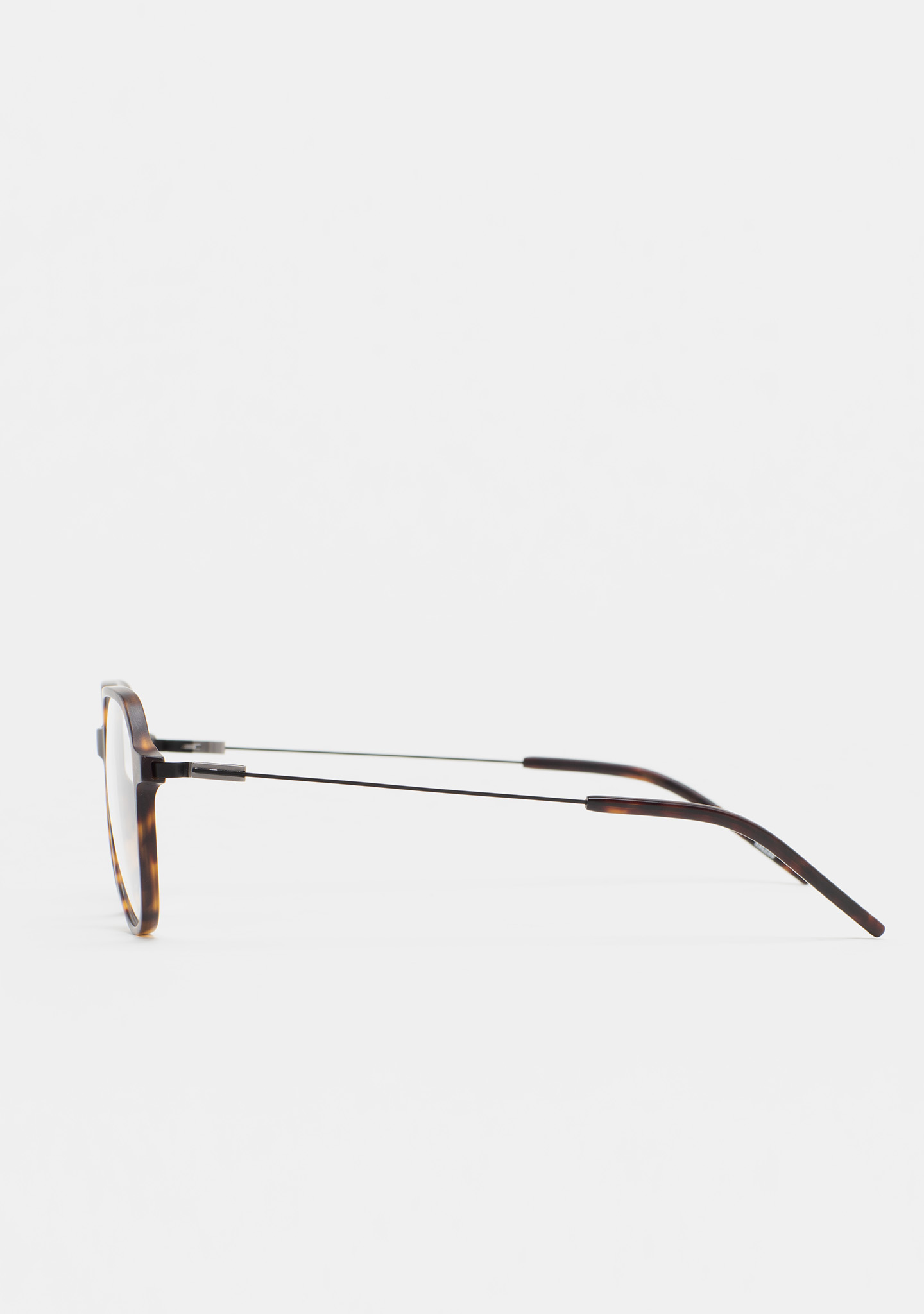Sehhilfe in Pilotenform. Front aus mattem dunkelbraunem Havana-High-Density-Acetat. Bügel aus mattem schwarzem Edelstahl mit dunkelbraunen Havana-Acetat-Endstücken. Bügel mit neuer schraubenloser Scharniertechnologie. Integrierte Acetat-Nasenpads. Handgefertigt.