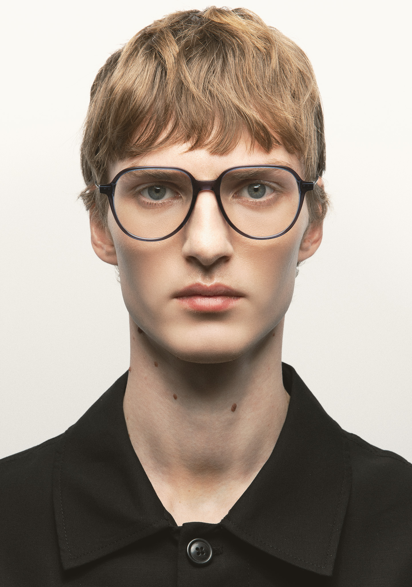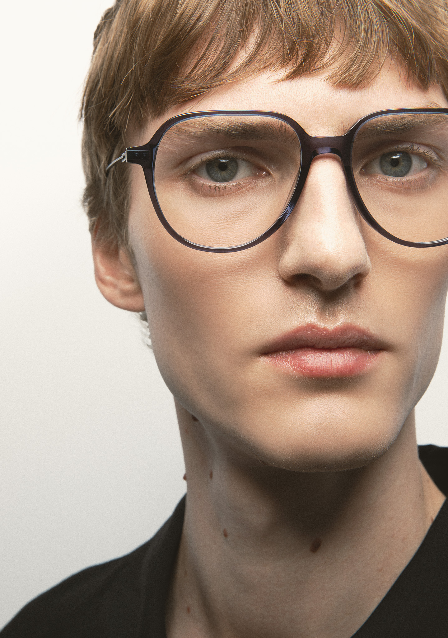 Sehhilfe in Pilotenform. Front aus transparent graublauem High-Density-Acetat. Bügel aus mattem schwarzem Edelstahl mit graublauen transparenten Endstücken. Bügel mit neuer schraubenloser Scharniertechnologie. Integrierte Acetat-Nasenpads. Handgefertigt.