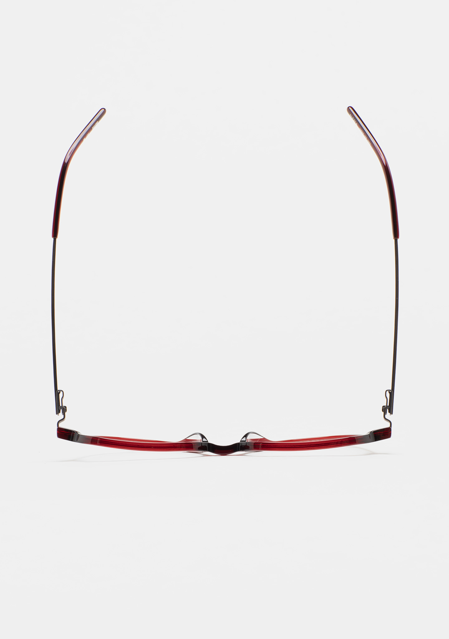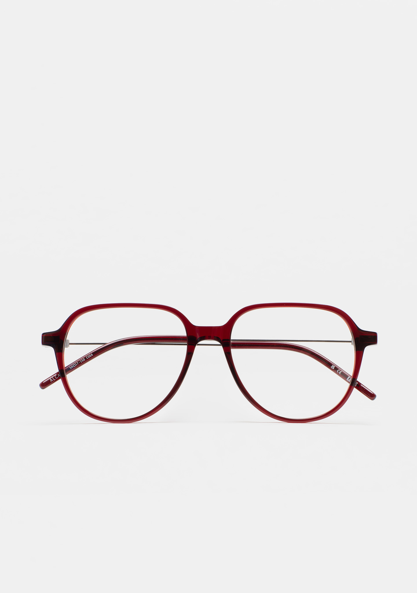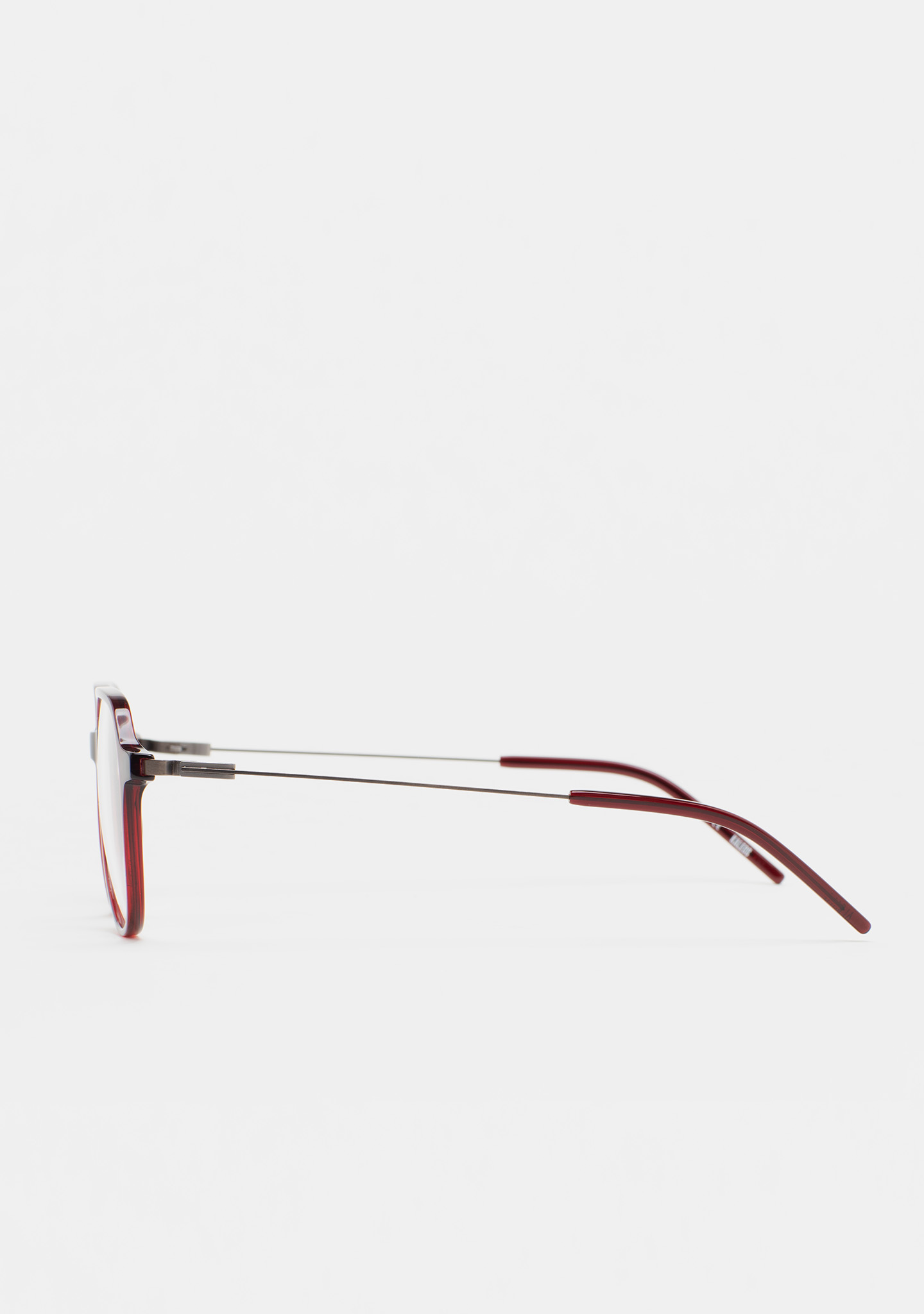 Sehhilfe in Pilotenform. Front aus transparent bordeauxfarbenem High-Density-Acetat. Bügel aus matt dunkelgrauem Edelstahl mit transparent bordeauxfarbenen Endstücken. Bügel mit neuer schraubenloser Scharniertechnologie. Integrierte Acetat-Nasenpads. Handgefertigt.