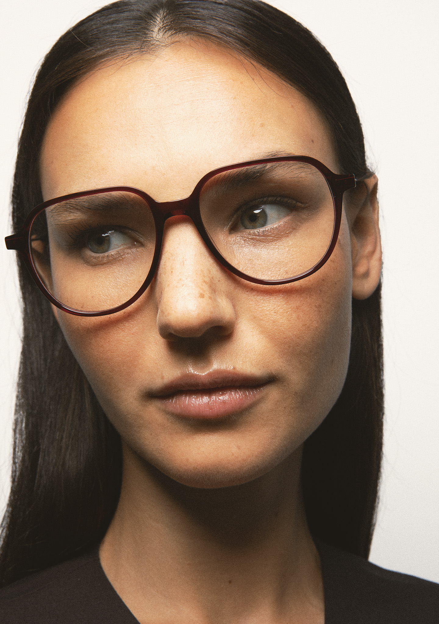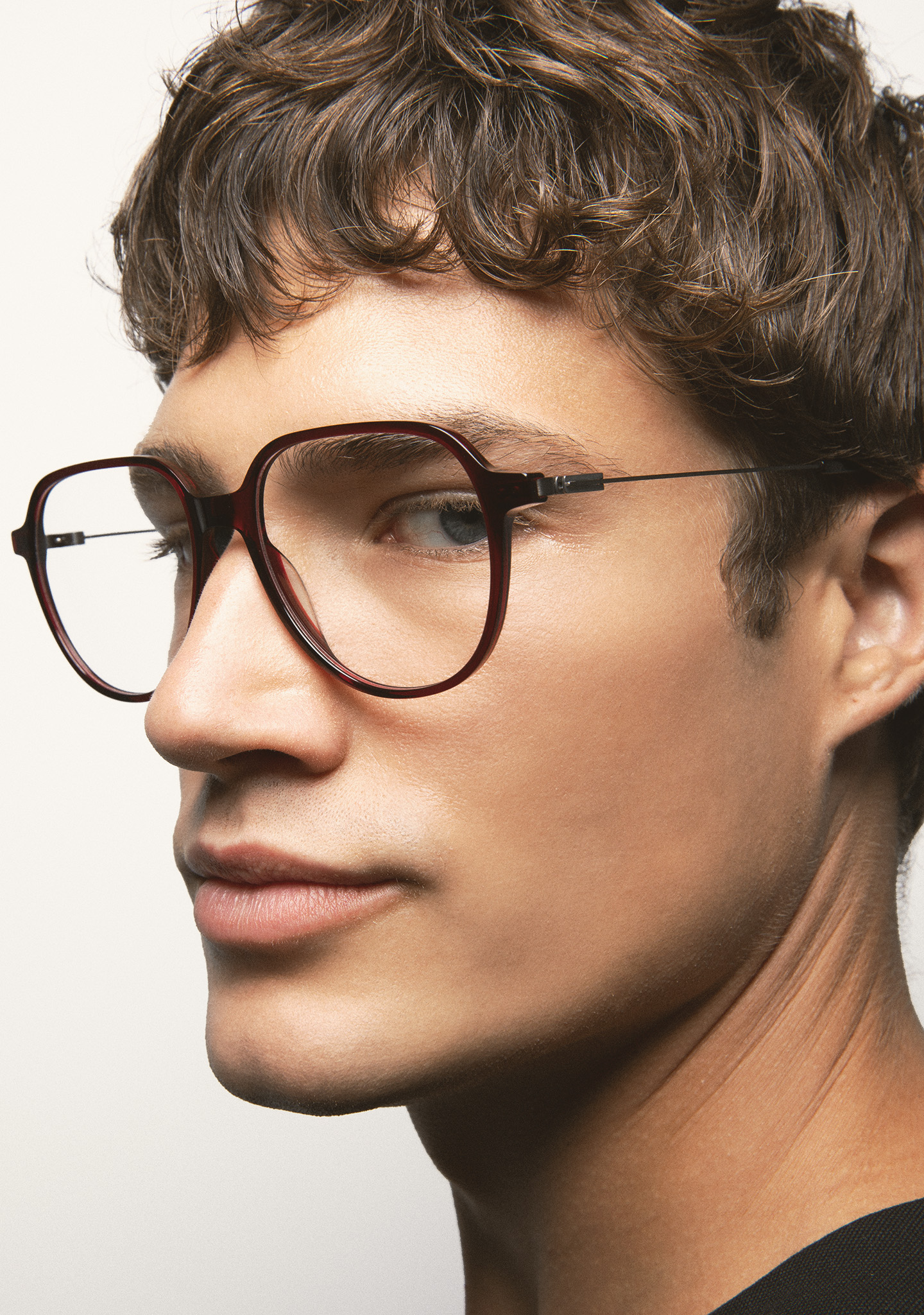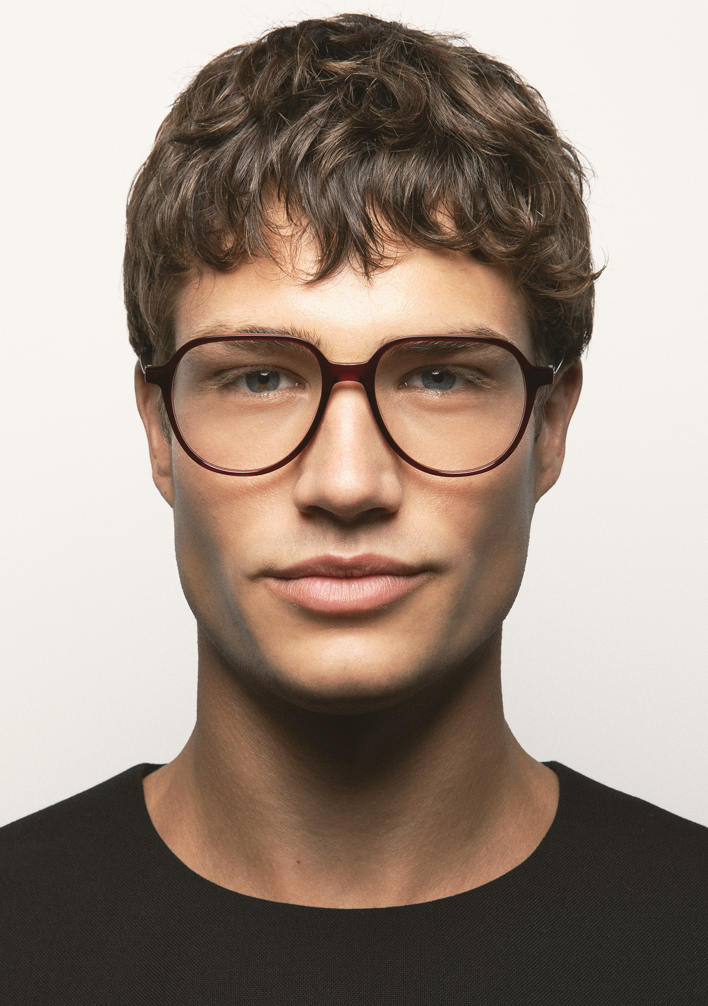 Sehhilfe in Pilotenform. Front aus transparent bordeauxfarbenem High-Density-Acetat. Bügel aus matt dunkelgrauem Edelstahl mit transparent bordeauxfarbenen Endstücken. Bügel mit neuer schraubenloser Scharniertechnologie. Integrierte Acetat-Nasenpads. Handgefertigt.