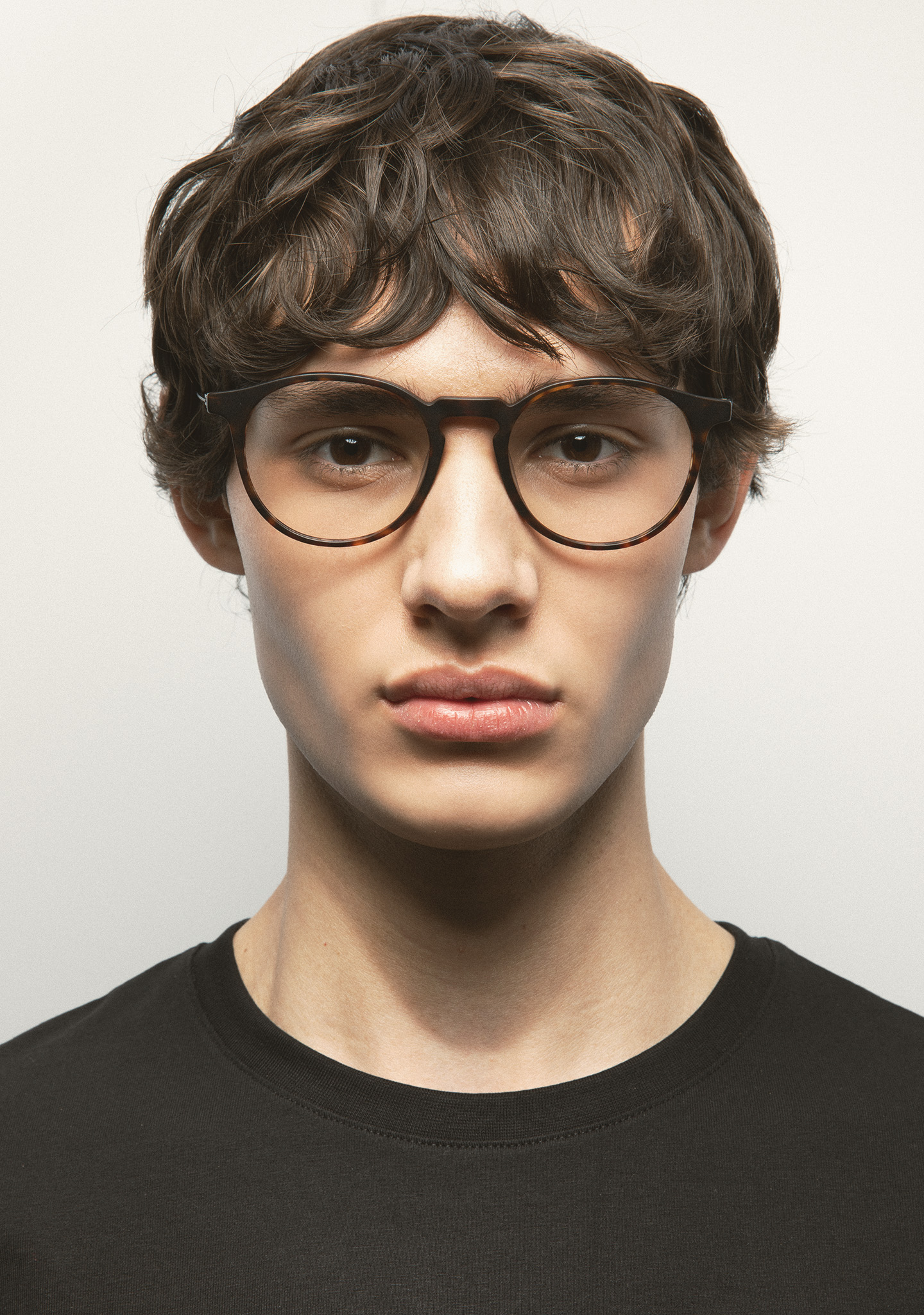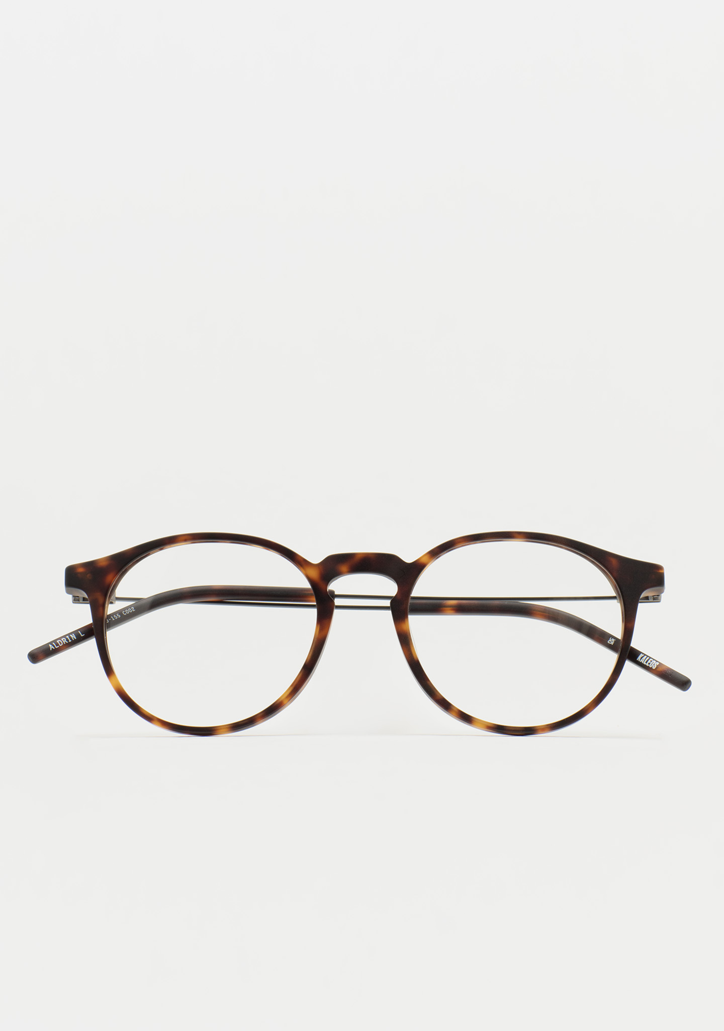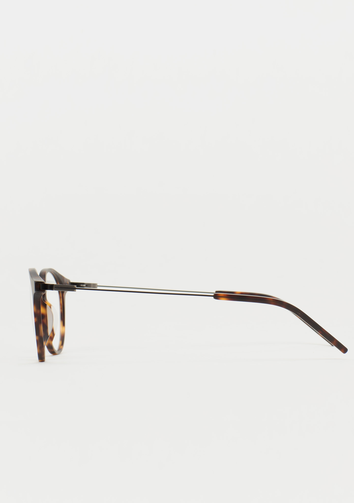 Pantos-Korrekturbrille. Zeitloses Design für den Alltag. Front aus mattem dunkelbraunem Havana-High-Density-Acetat. Bügel aus mattschwarzem Edelstahl mit mattem dunkelbraunem Havana-Acetat an den Bügelenden. Neue schraubenlose Scharnierkonstruktion. Integrierte Acetat-Nasenpads. Handgefertigt. Erhältlich in zwei Größen: mittel (M) und groß (L).