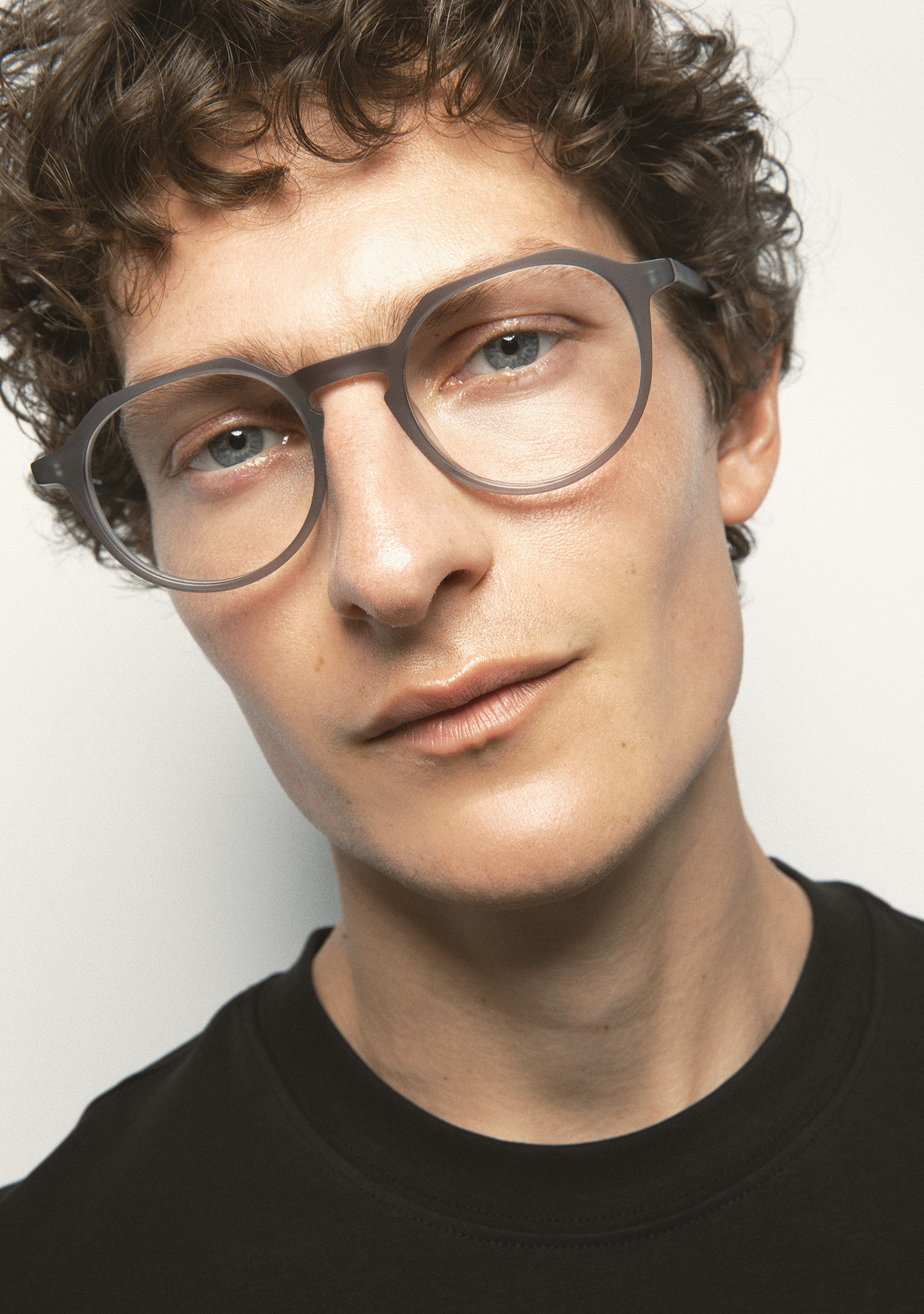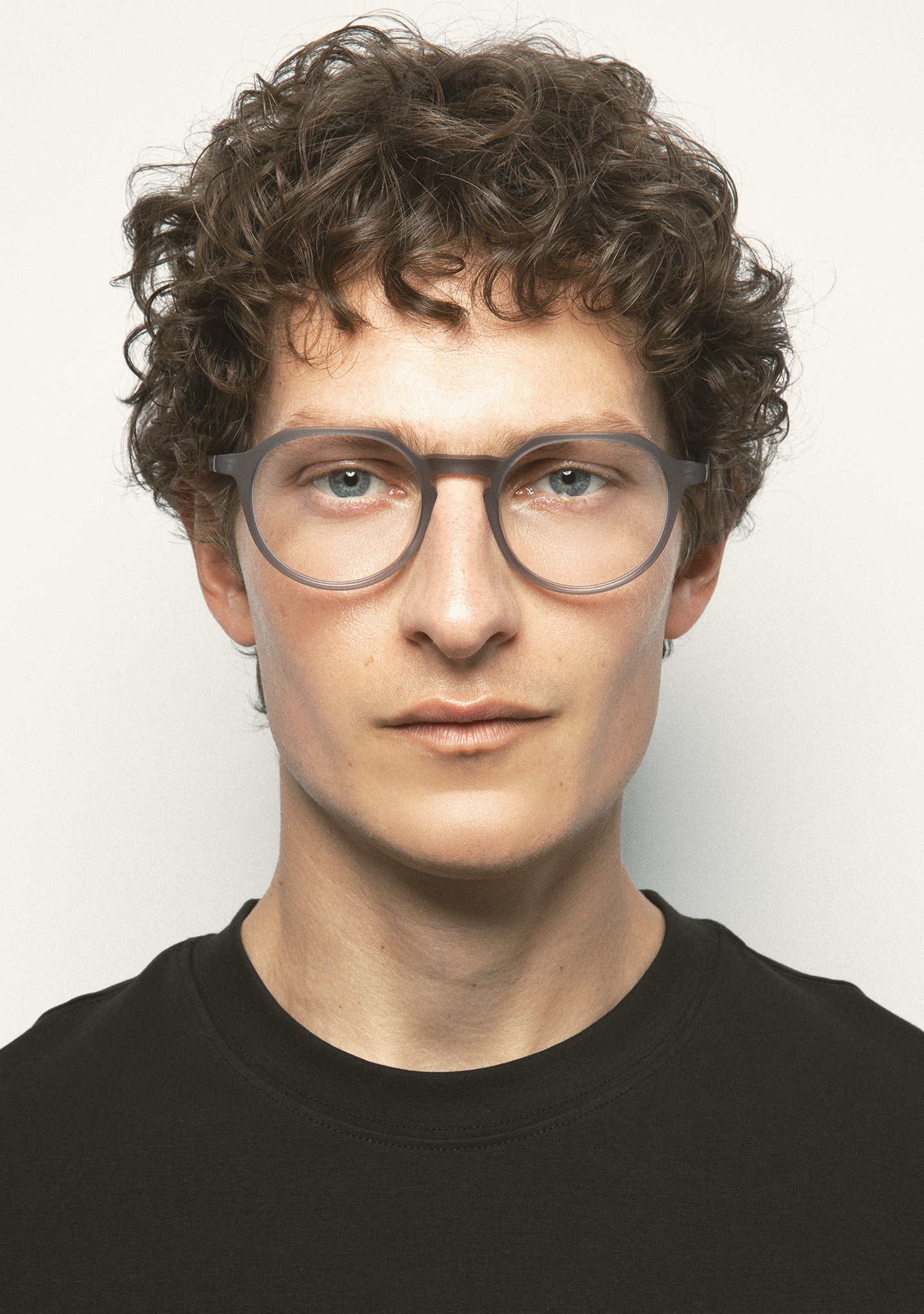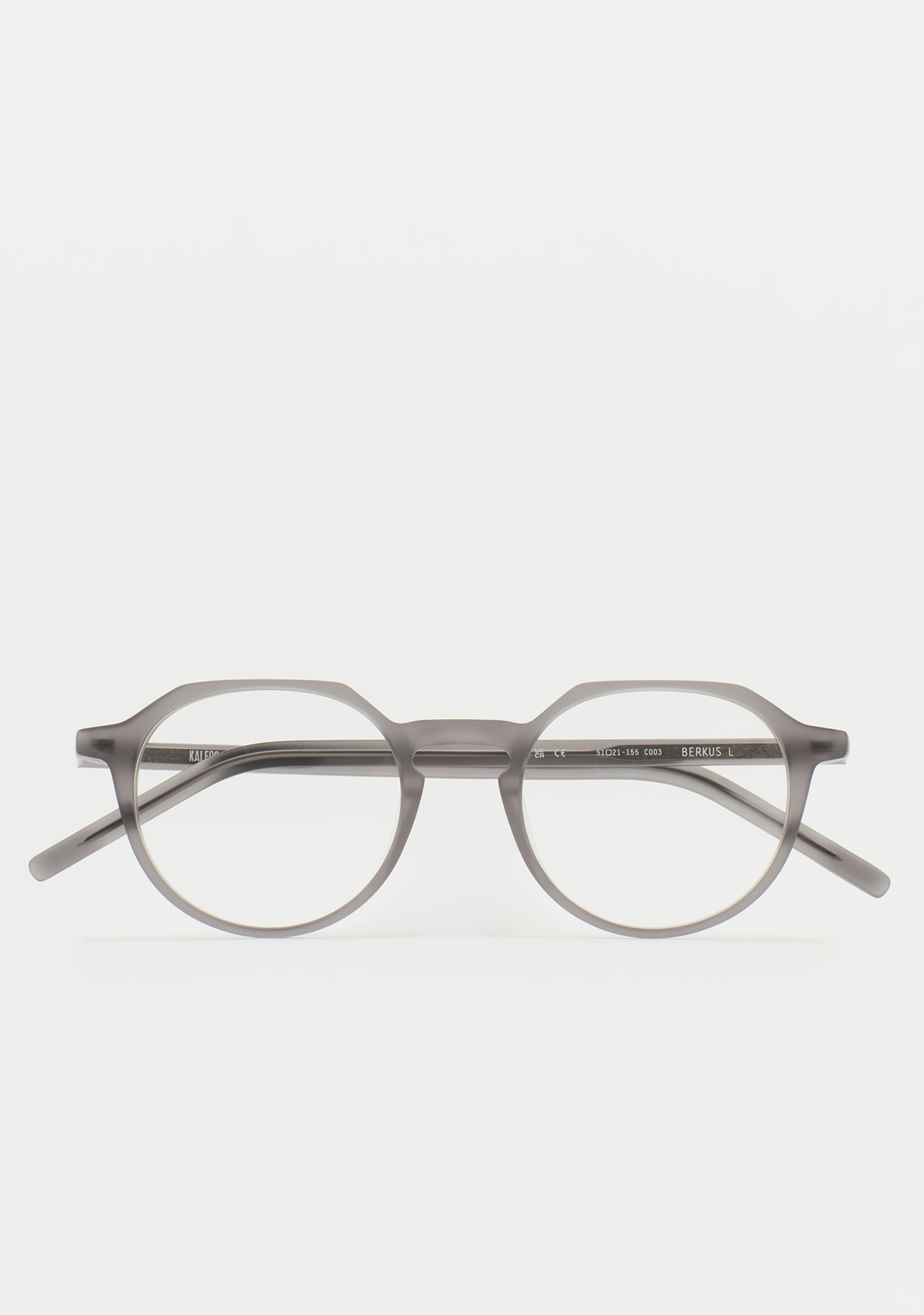 Pantos-förmige Korrekturbrille mit flacher Augenbrauenlinie und Schlüssellochsteg. Eine Silhouette, die Modernität und Eleganz vereint. Front und Bügel aus mattem transparentem grauem Acetat. Integrierte Acetat-Nasenpads. Handgefertigt. Erhältlich in zwei Größen: mittel (M) und groß (L).