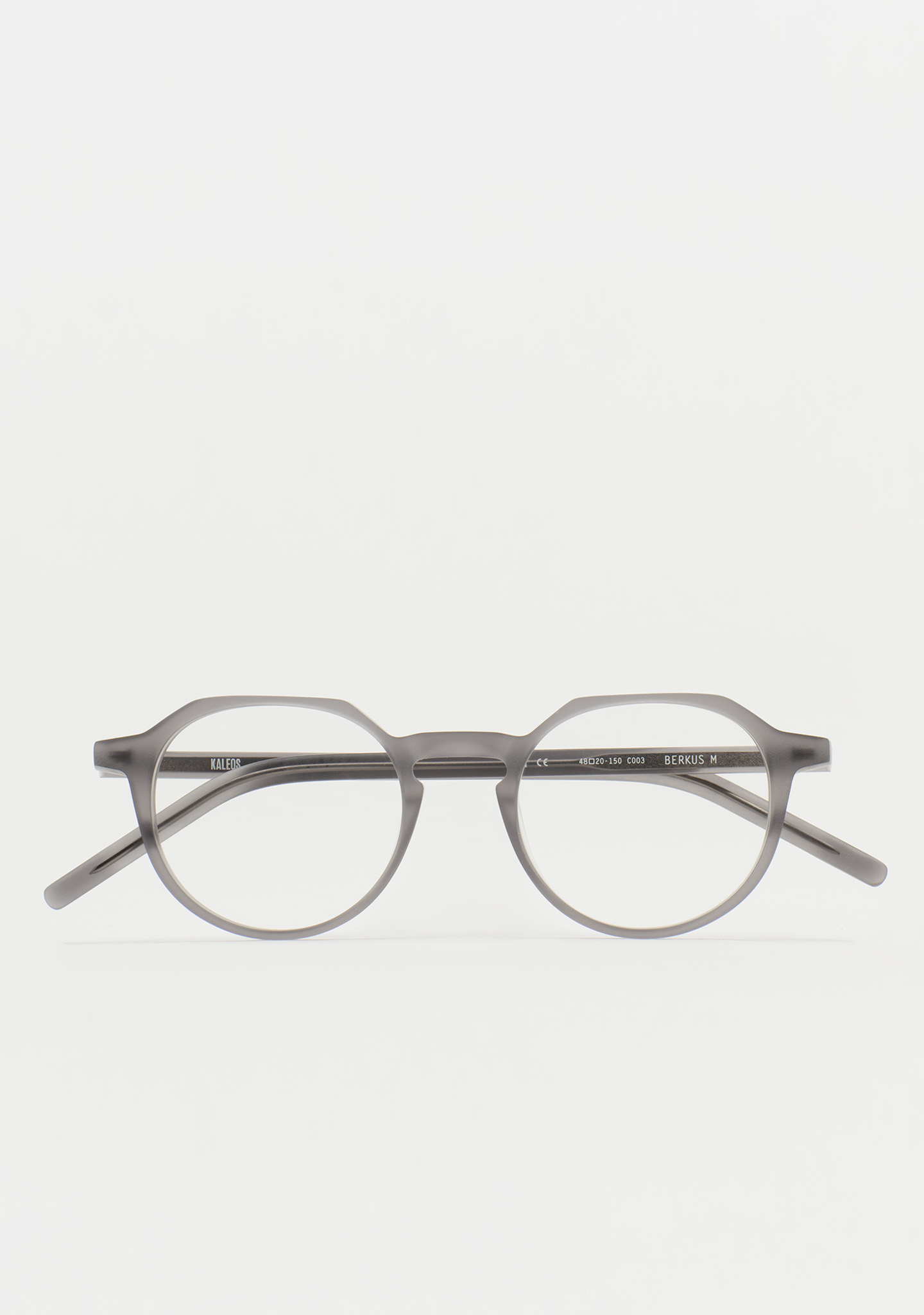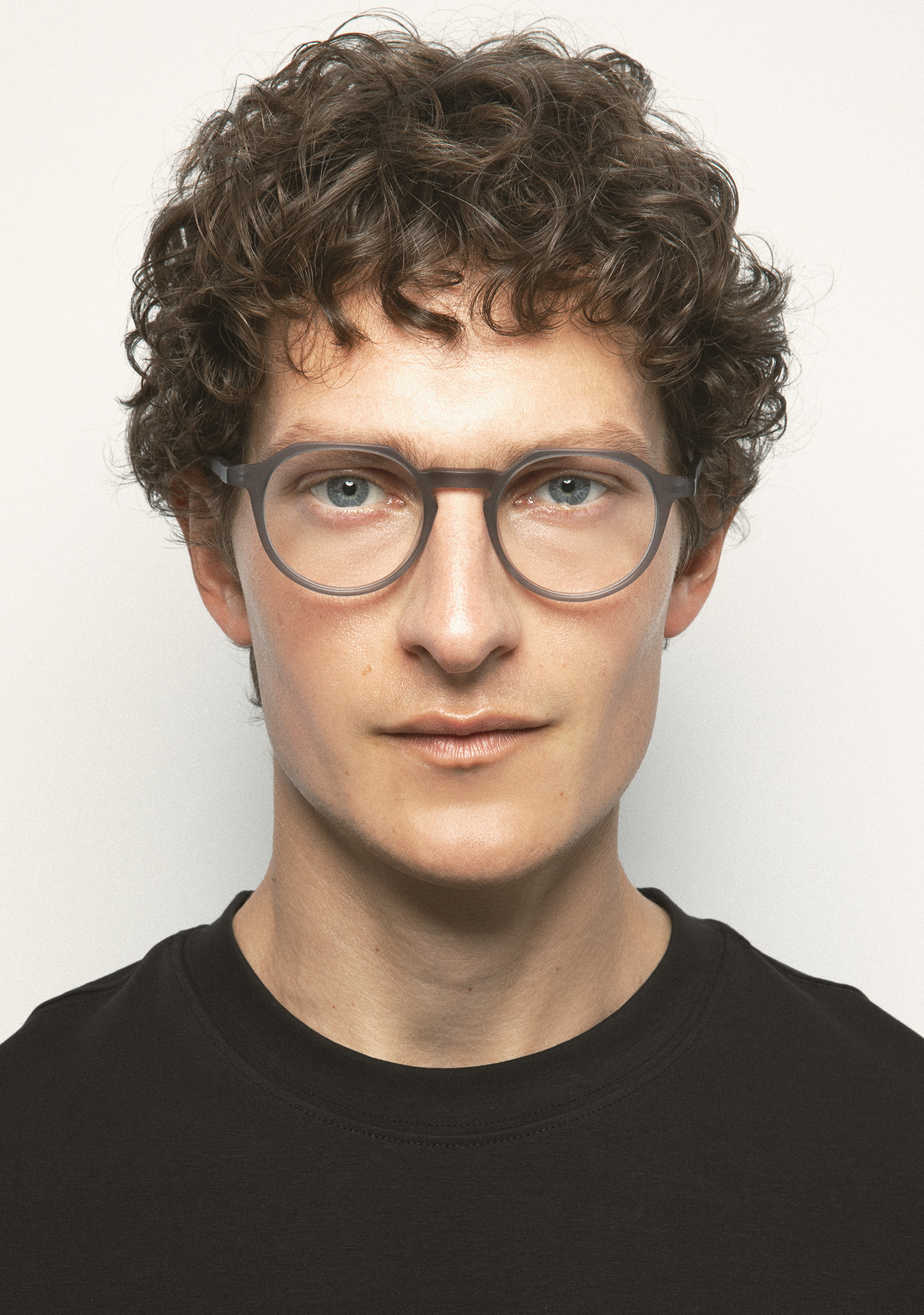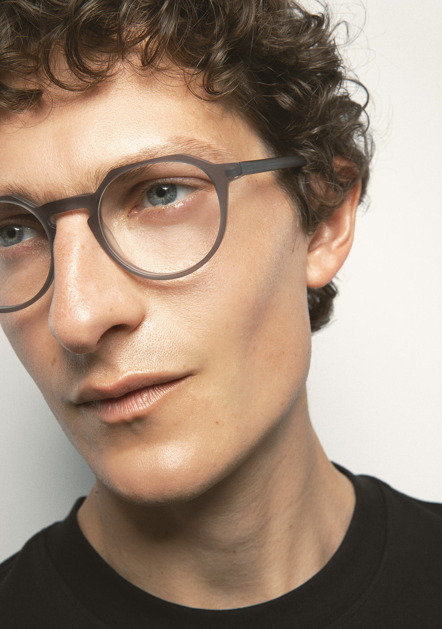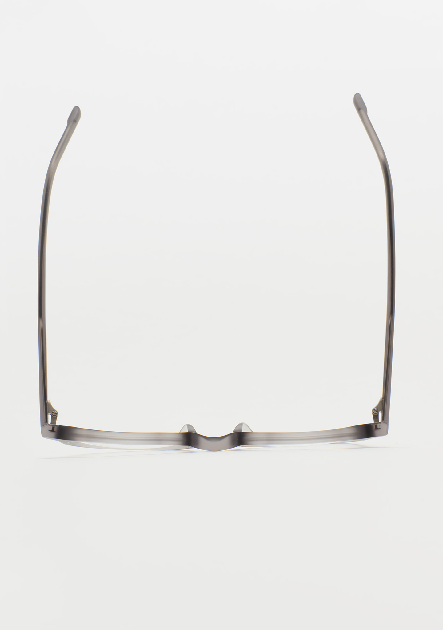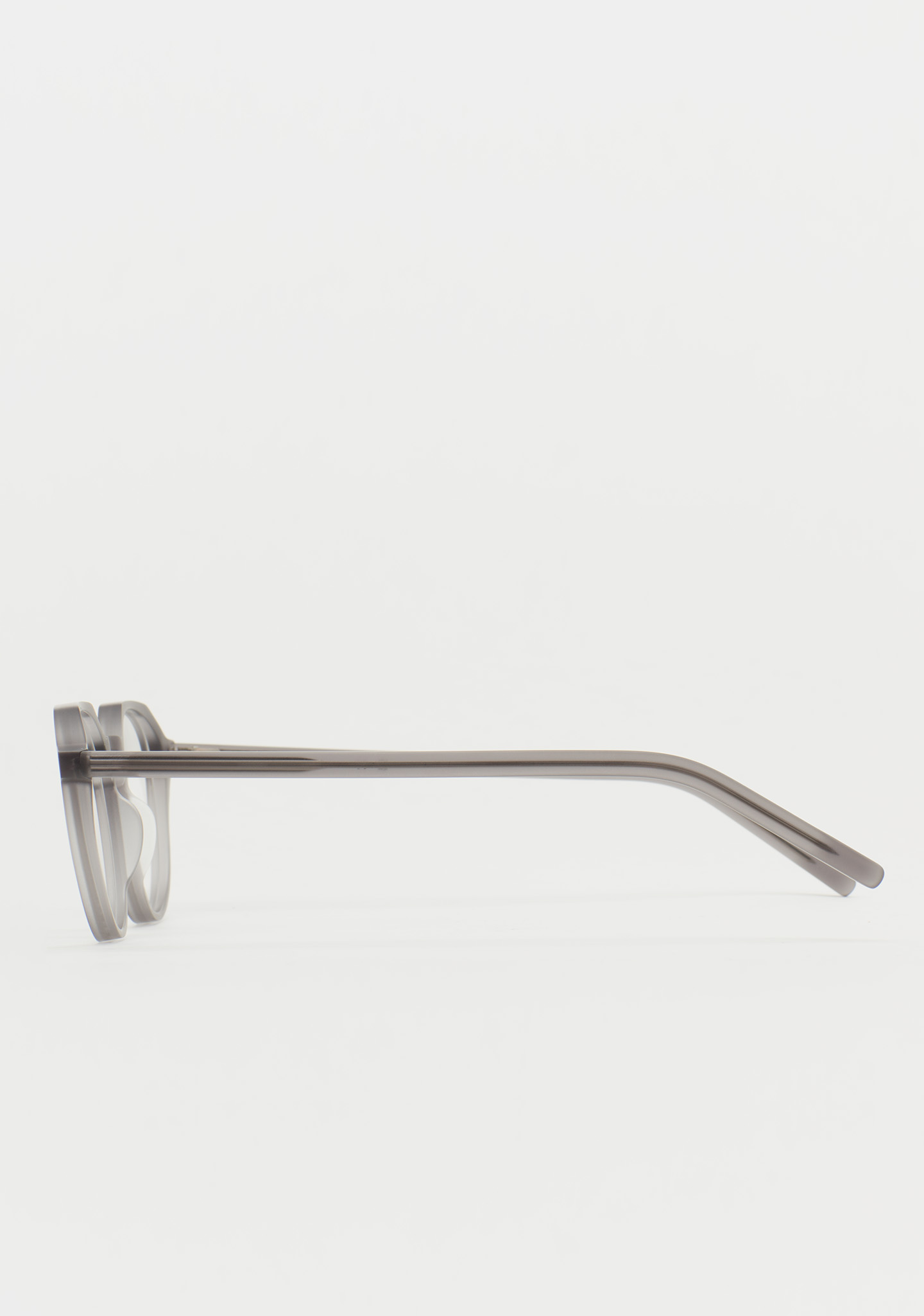 Pantos-förmige Korrekturbrille mit flacher Augenbrauenlinie und Schlüssellochsteg. Eine Silhouette, die Modernität und Eleganz vereint. Front und Bügel aus mattem transparentem grauem Acetat. Integrierte Acetat-Nasenpads. Handgefertigt. Erhältlich in zwei Größen: mittel (M) und groß (L).
