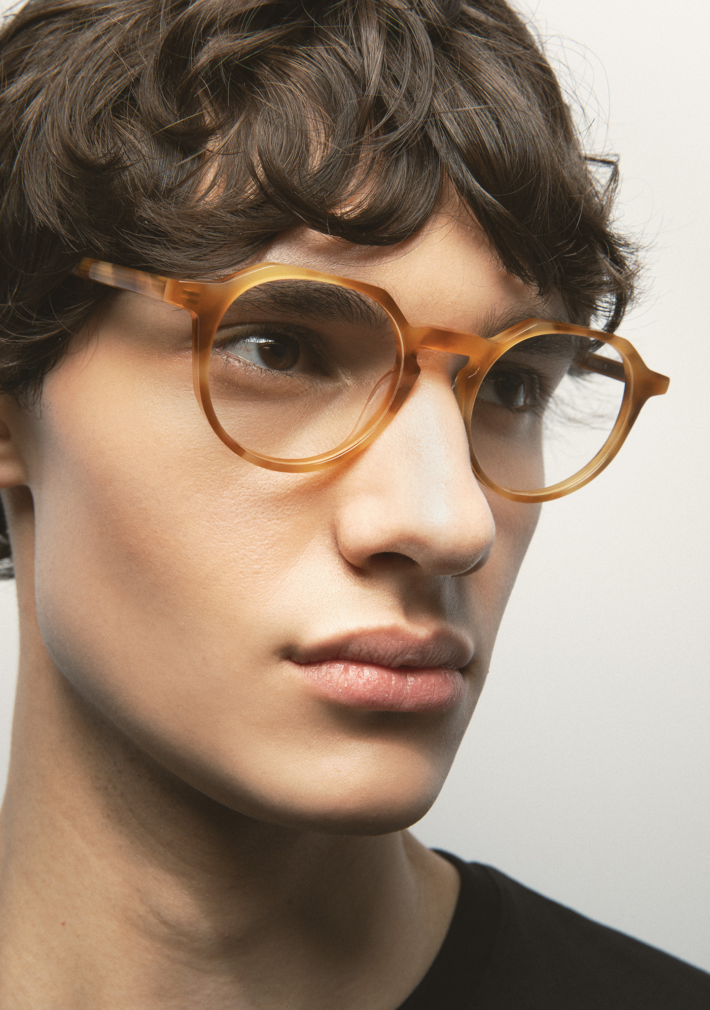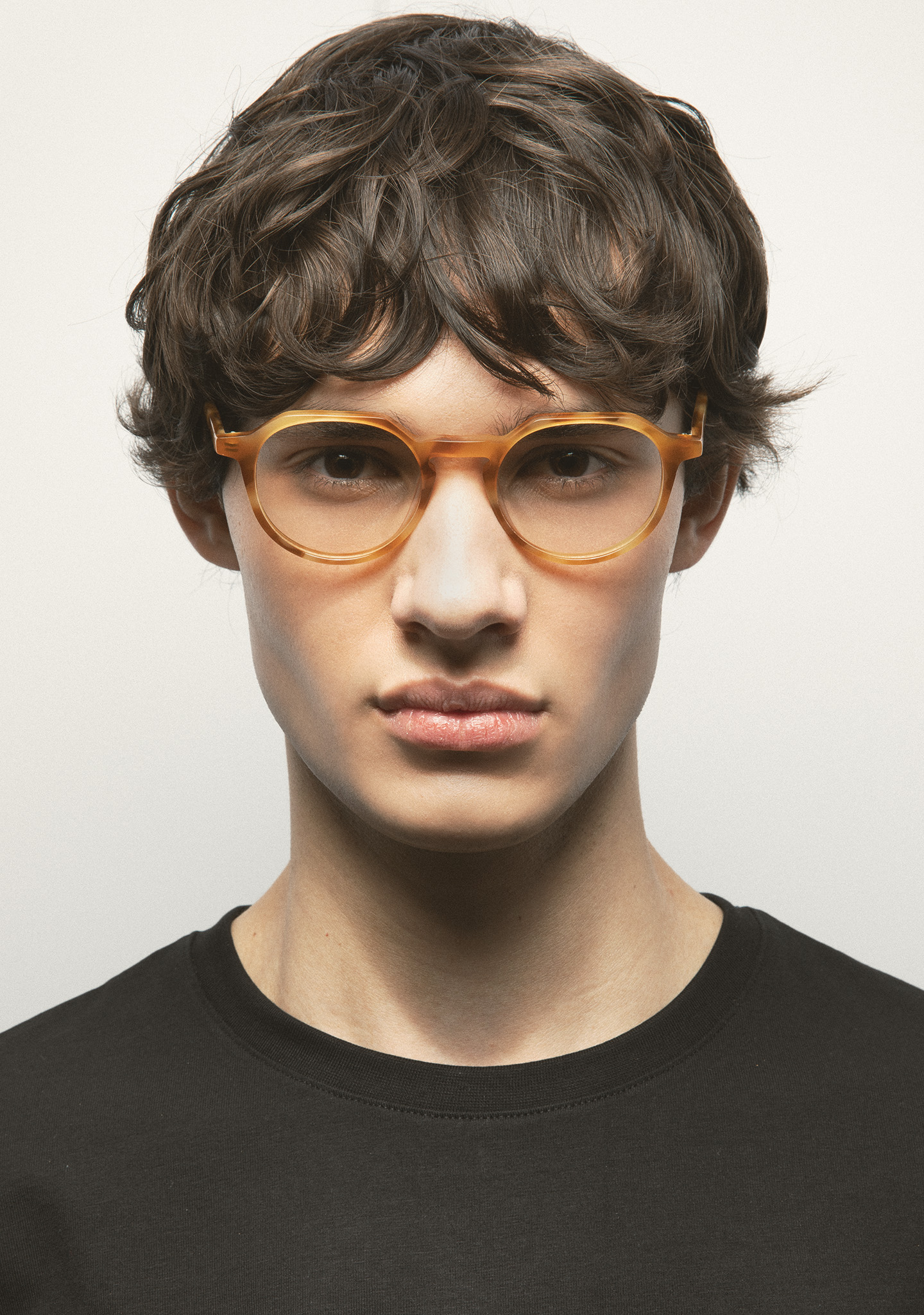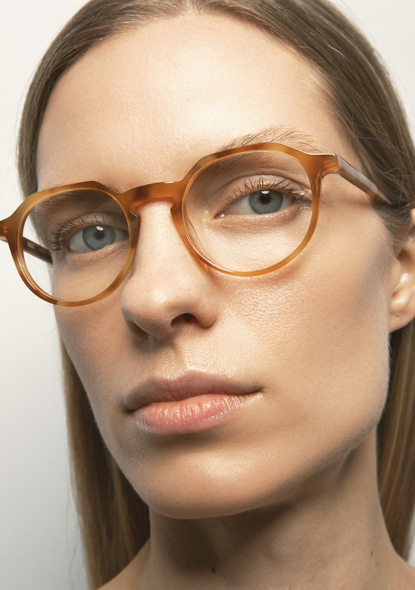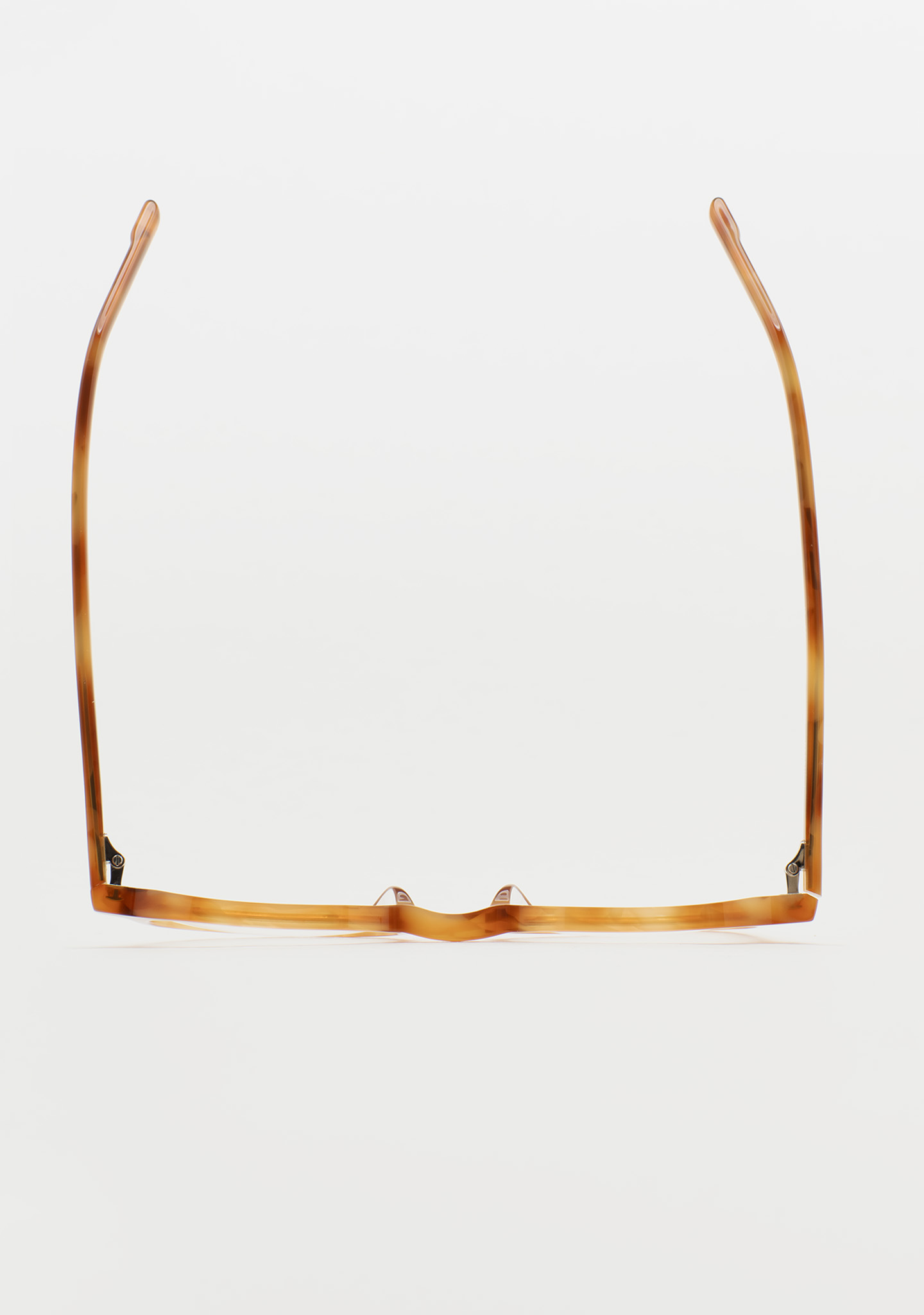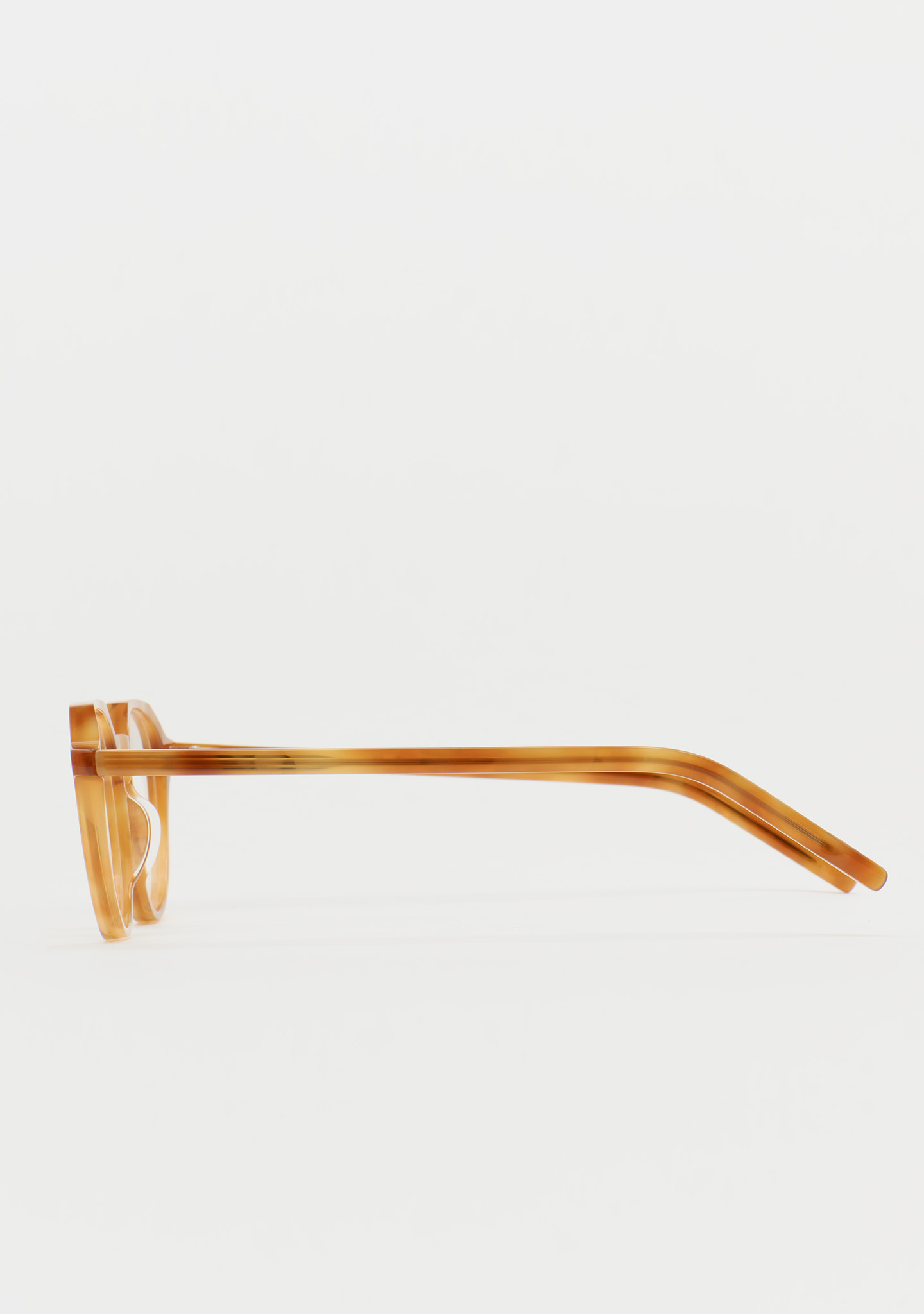 Pantos-förmige Korrekturbrille mit flacher Augenbrauenlinie und Schlüssellochsteg. Eine Silhouette, die Modernität und Eleganz vereint. Front und Bügel aus honigbraunem Havana-Acetat. Integrierte Acetat-Nasenpads. Handgefertigt. Erhältlich in zwei Größen: mittel (M) und groß (L).
