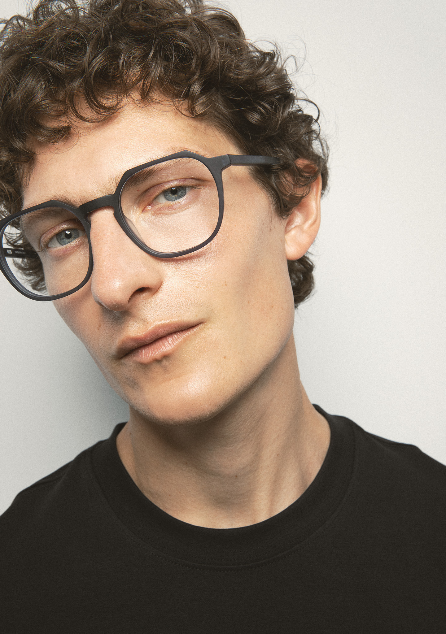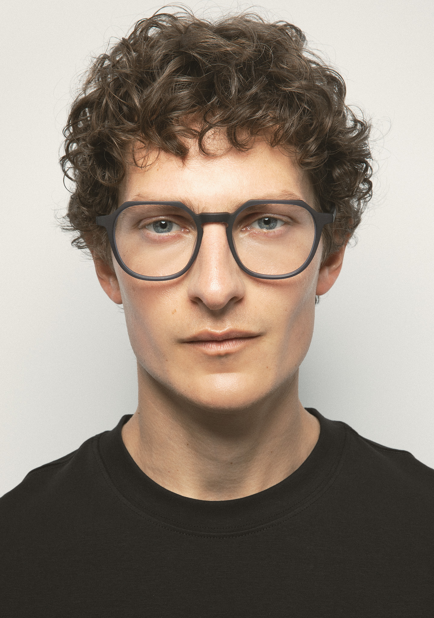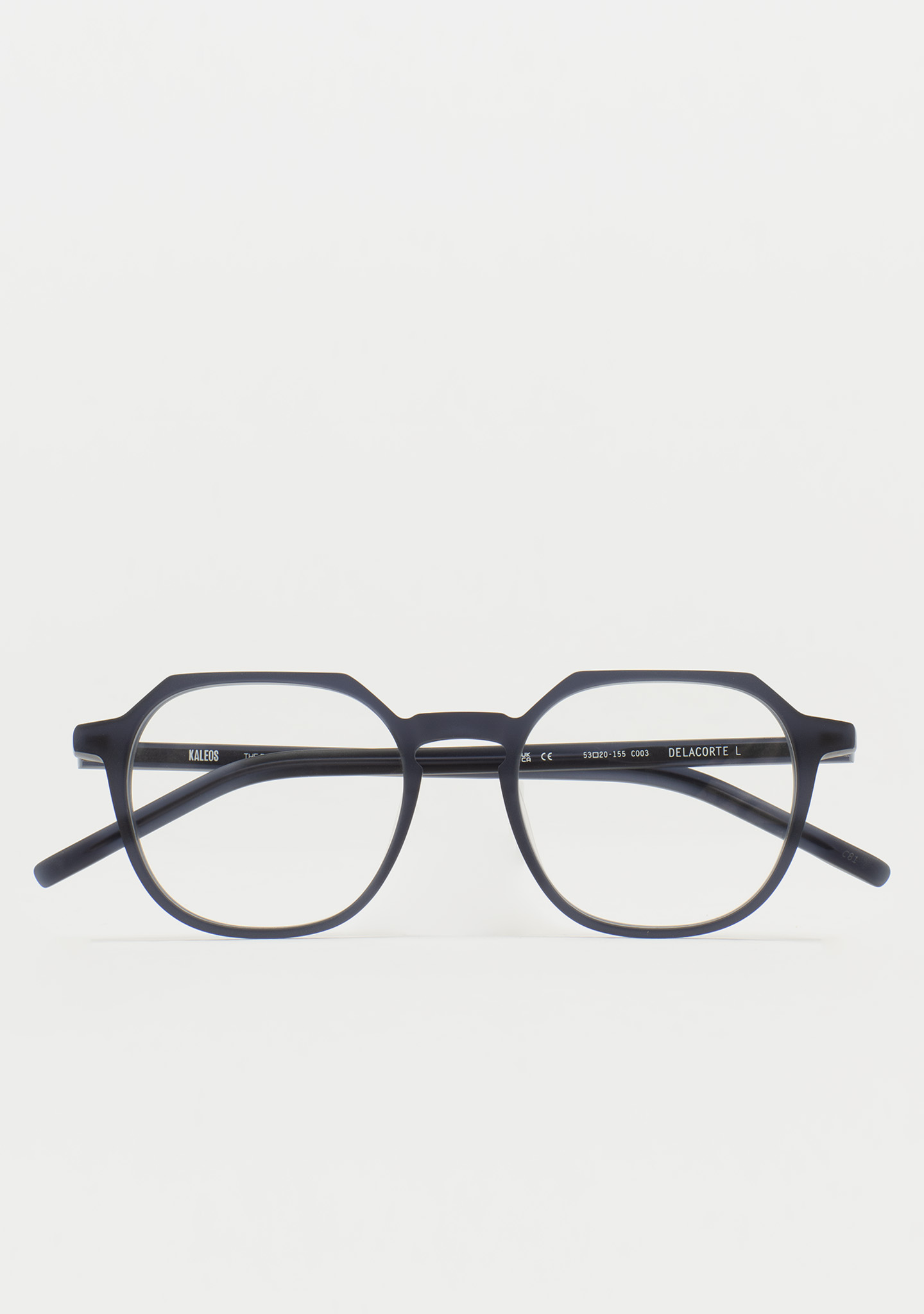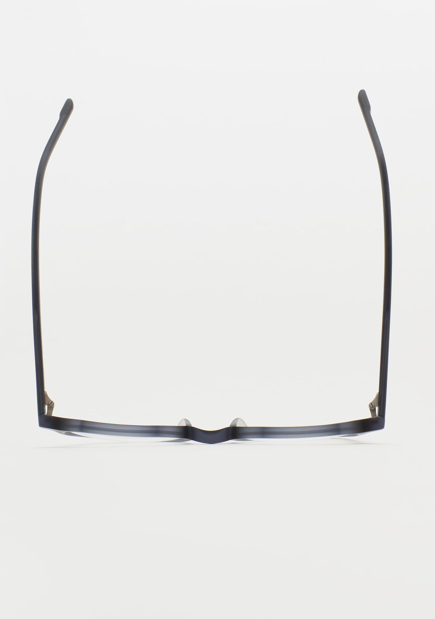 Quadratische Korrekturbrille mit flacher Augenbrauenlinie. Architektur, die sich zugleich leicht und robust anfühlt. Front und Bügel aus mattem transparentem blaugrauem Acetat. Integrierte Acetat-Nasenpads. Handgefertigt.