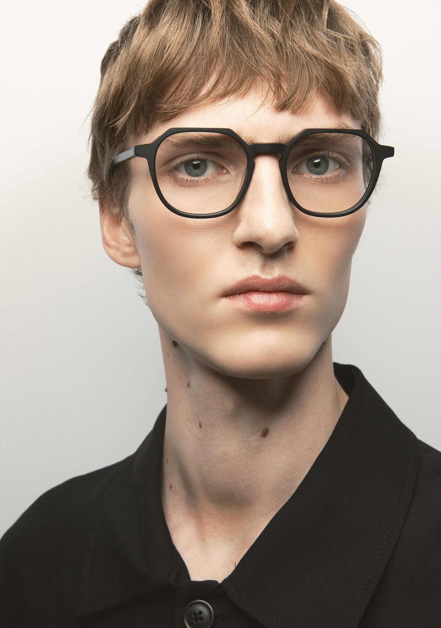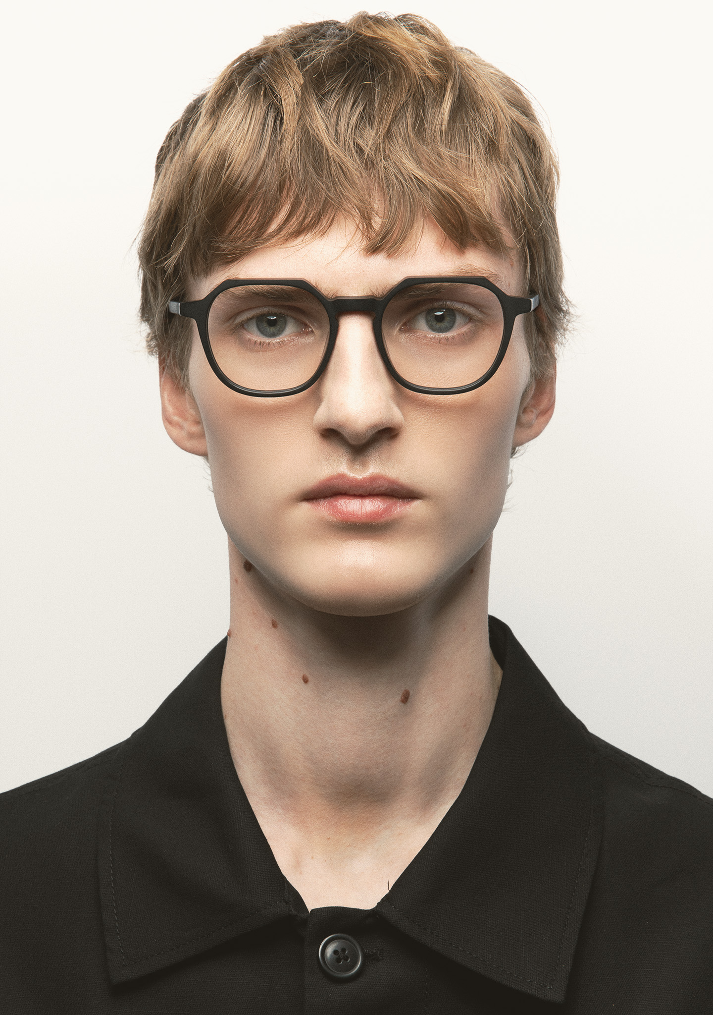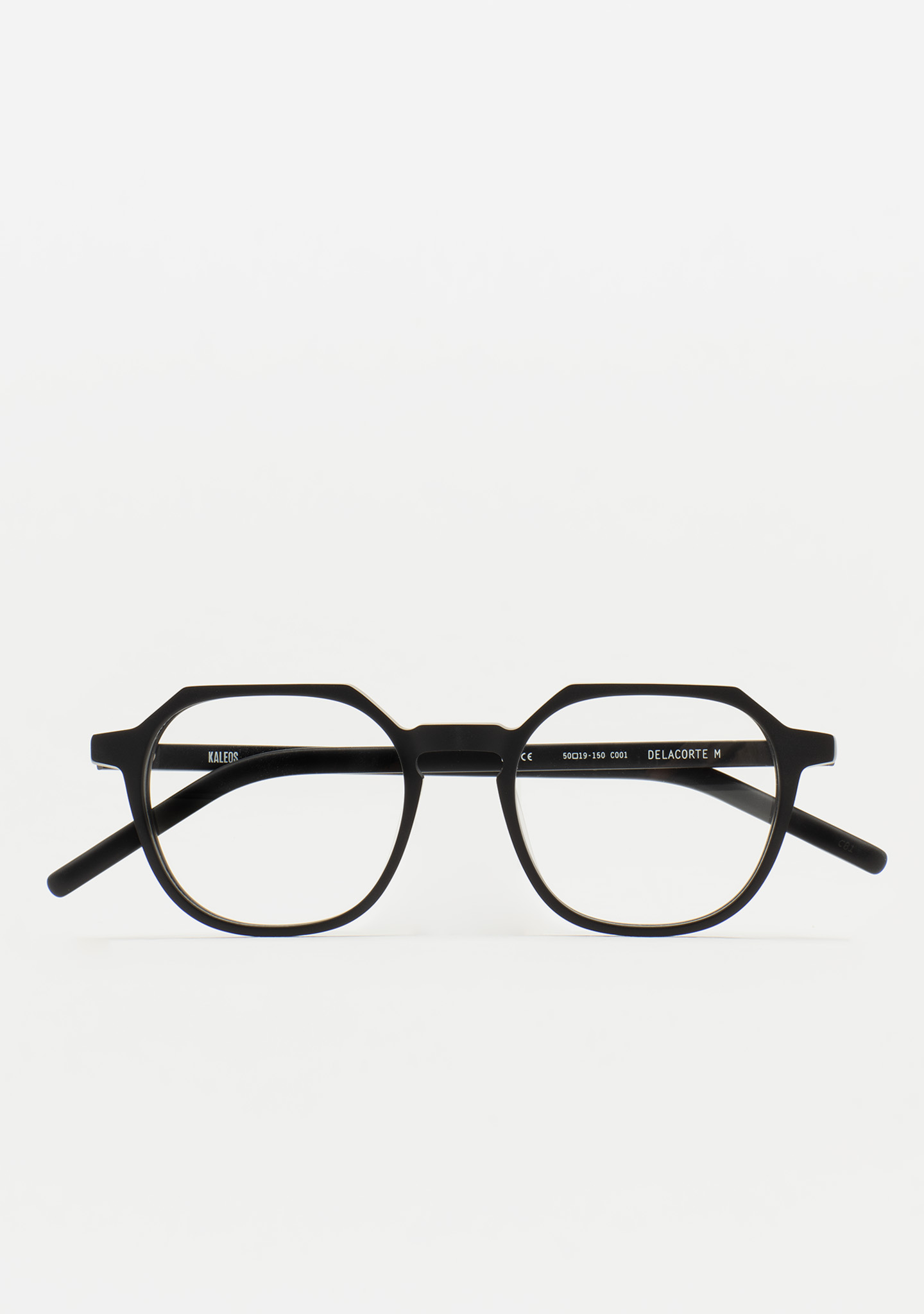 Quadratische Korrekturbrille mit flacher Augenbrauenlinie. Architektur, die sich zugleich leicht und robust anfühlt. Front und Bügel aus mattschwarzem Acetat. Integrierte Acetat-Nasenpads. Handgefertigt.