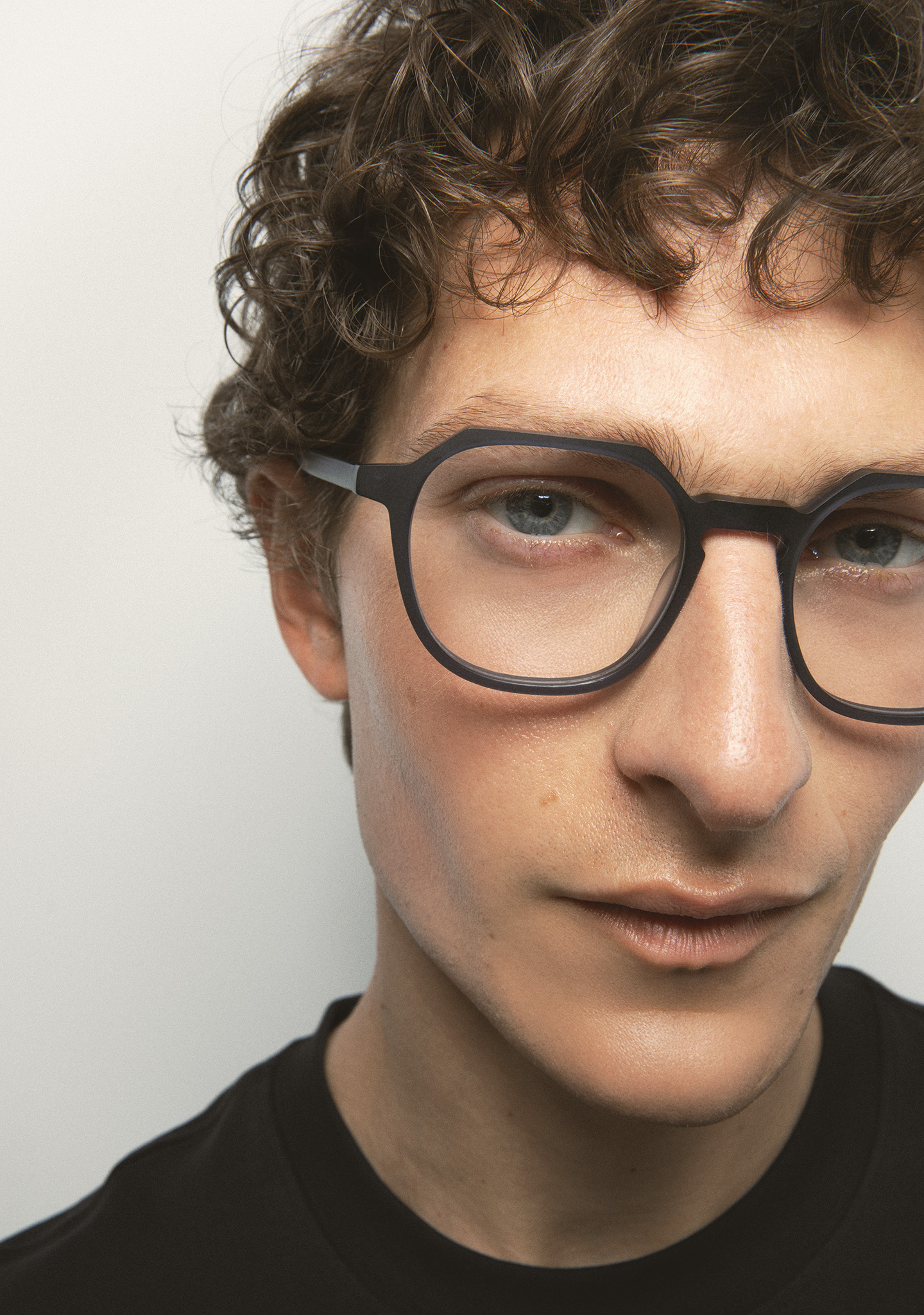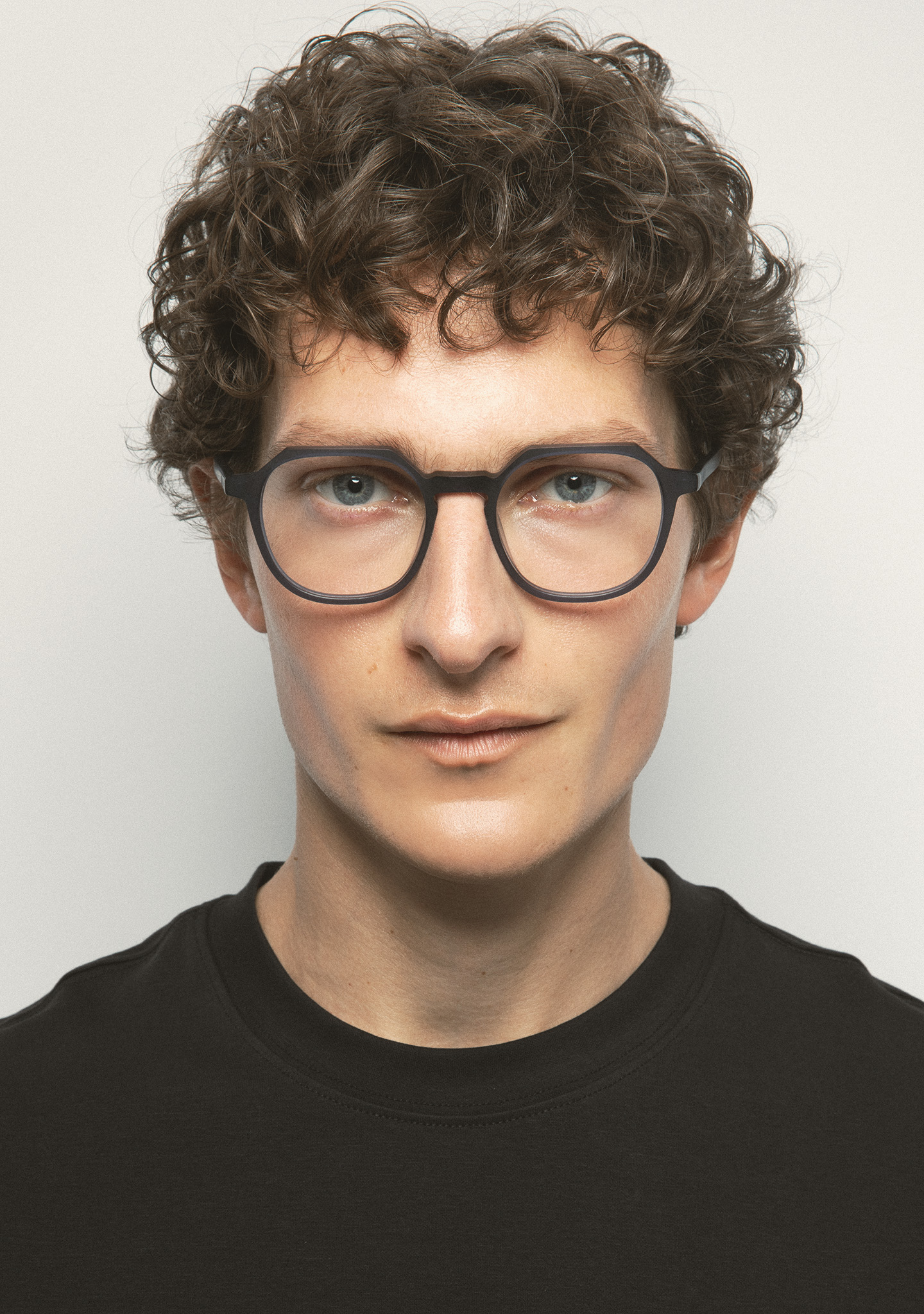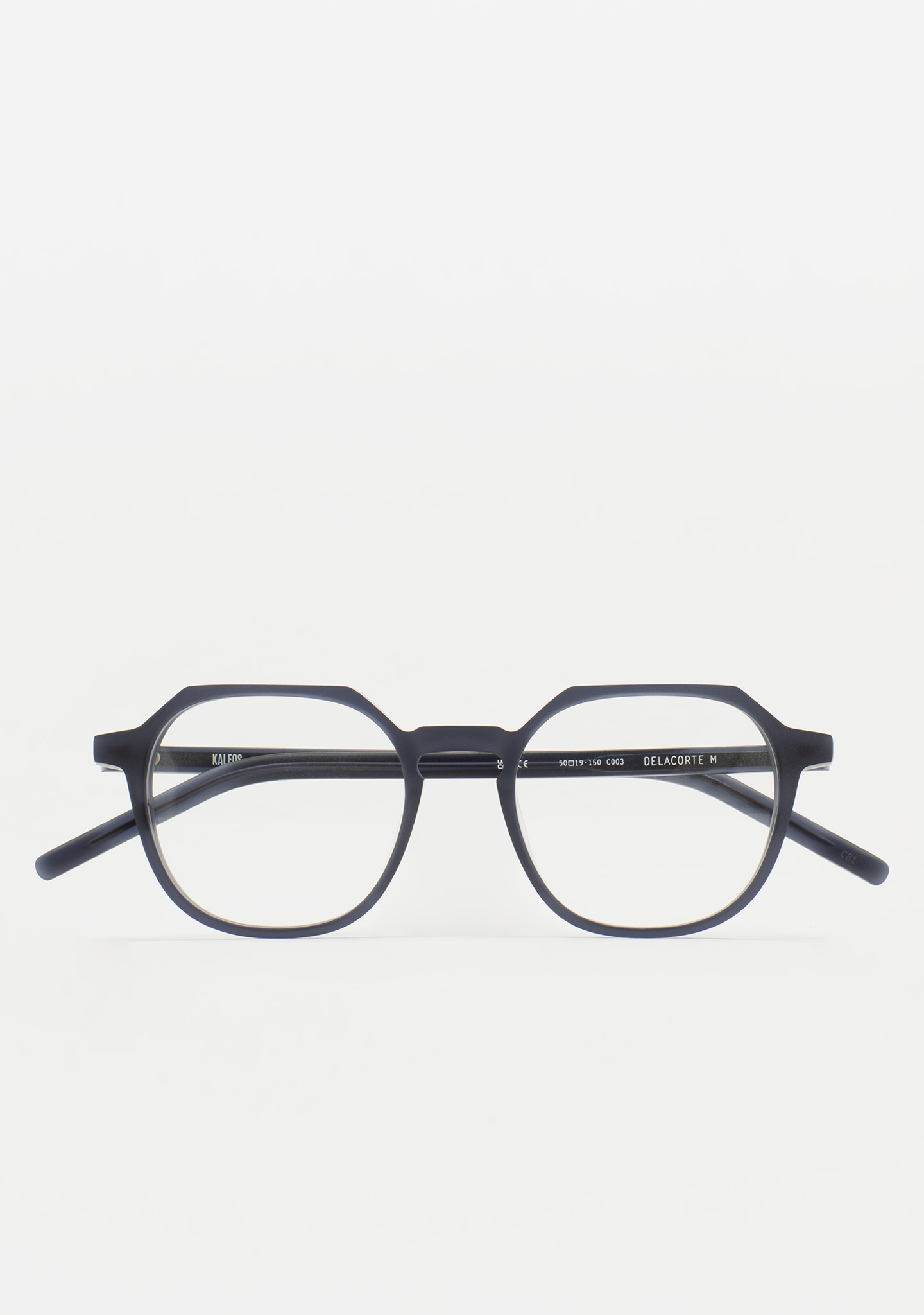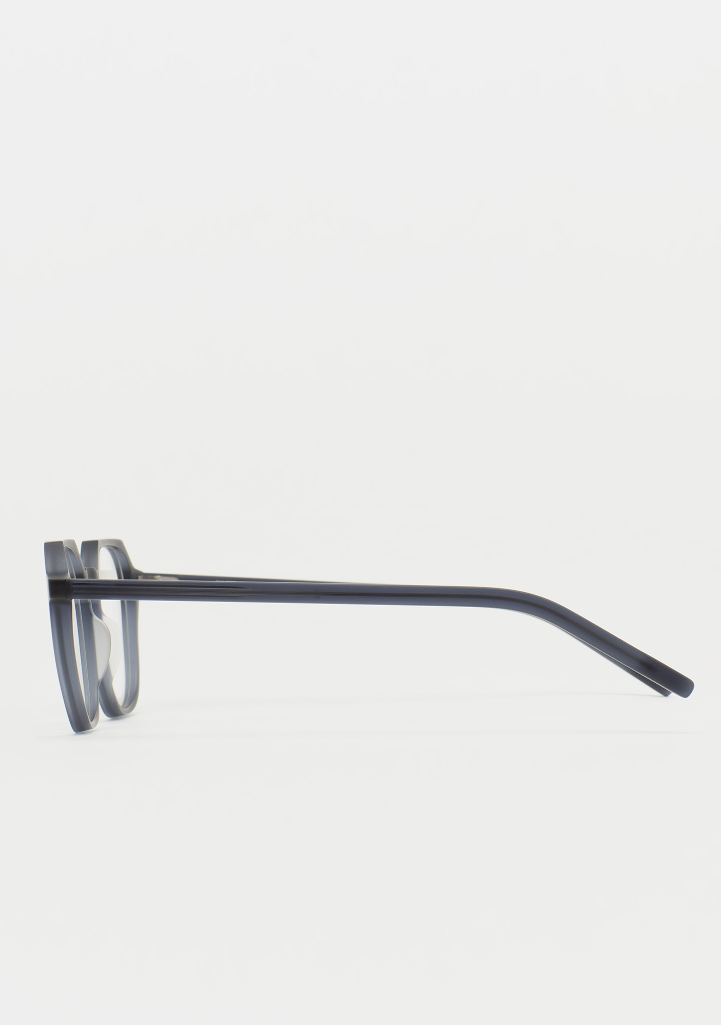 Quadratische Korrekturbrille mit flacher Augenbrauenlinie. Architektur, die sich zugleich leicht und robust anfühlt. Front und Bügel aus mattem transparentem blaugrauem Acetat. Integrierte Acetat-Nasenpads. Handgefertigt.