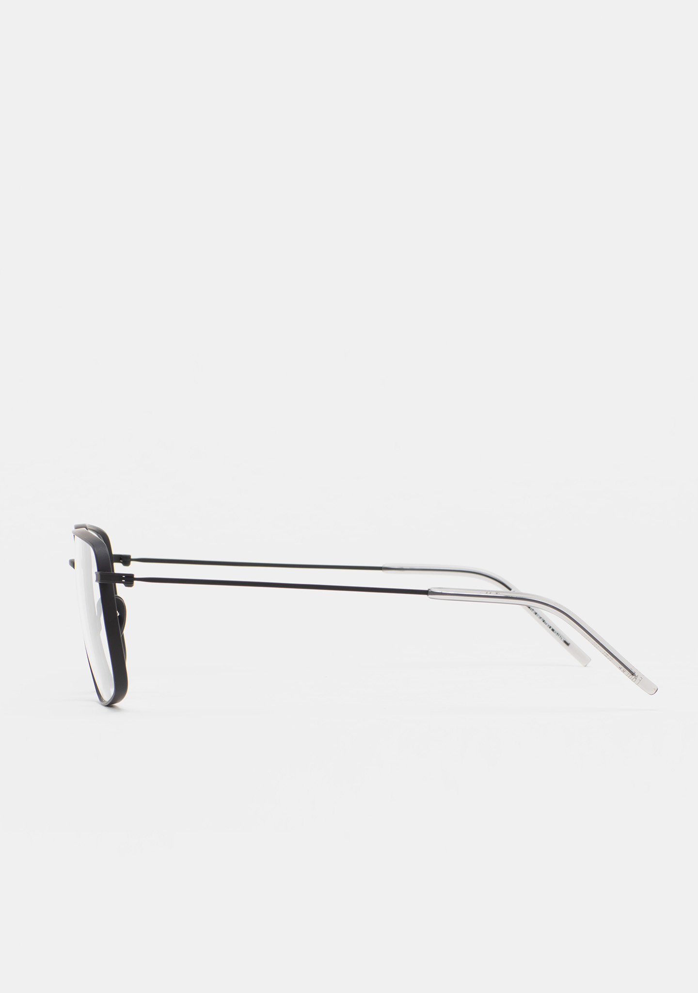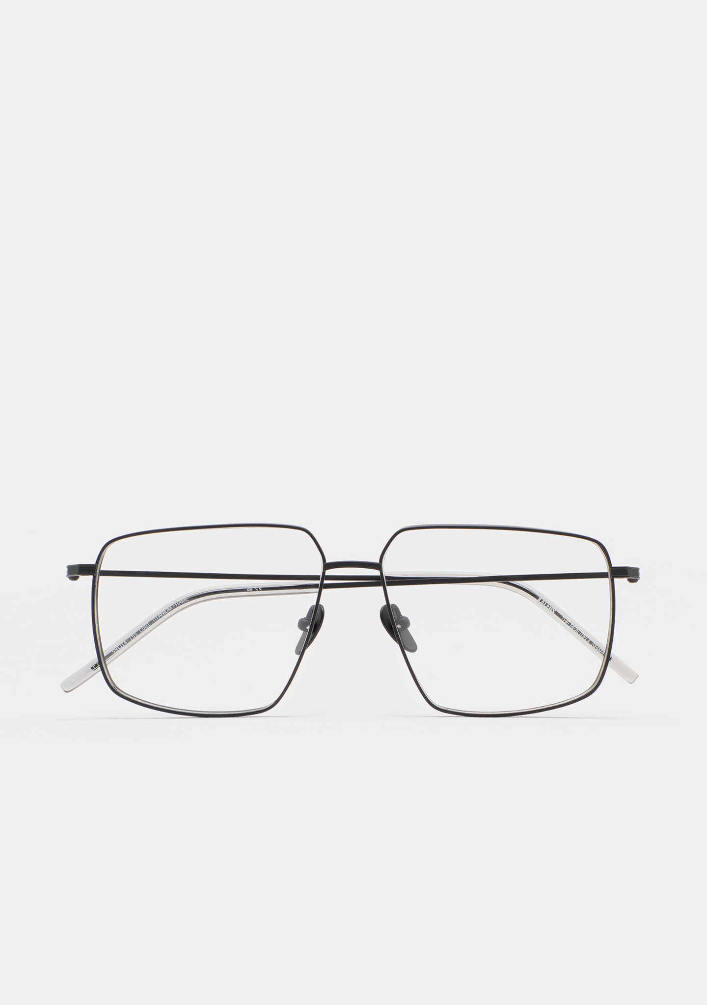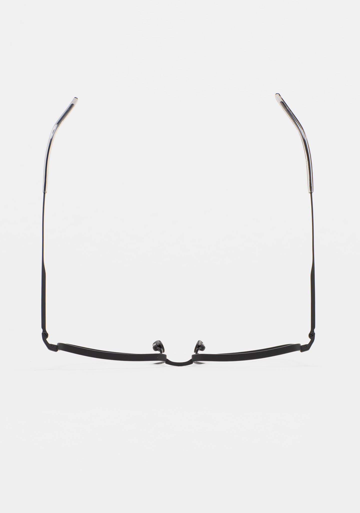 Sehhilfe in quadratischer Form. Front und Bügel aus mattem schwarzem Titan. Bügel mit Endstück aus transparent grauem Acetat. Integrierte Acetat-Nasenpads. Handgefertigt.