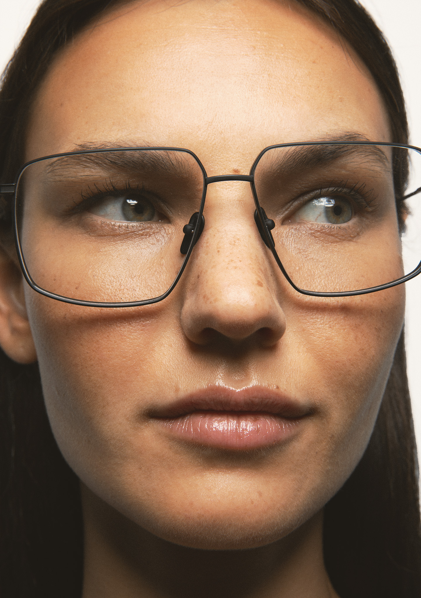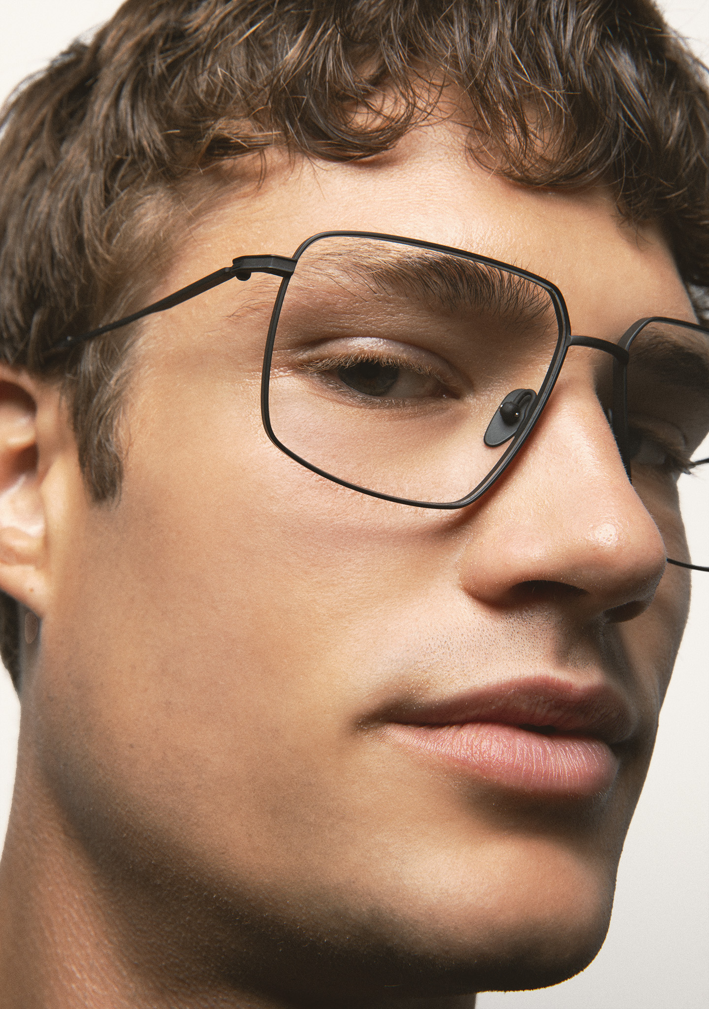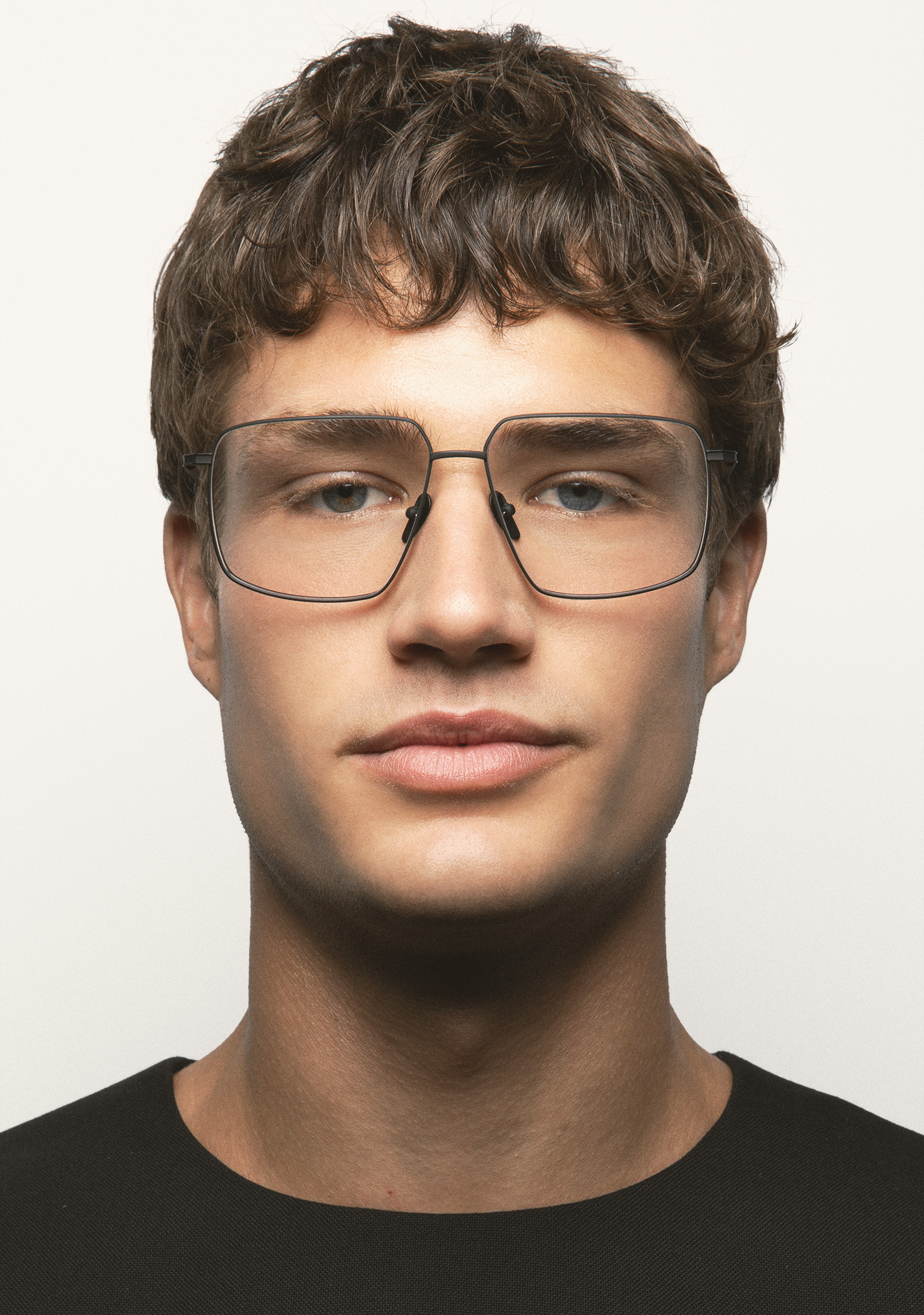Sehhilfe in quadratischer Form. Front und Bügel aus mattem schwarzem Titan. Bügel mit Endstück aus transparent grauem Acetat. Integrierte Acetat-Nasenpads. Handgefertigt.