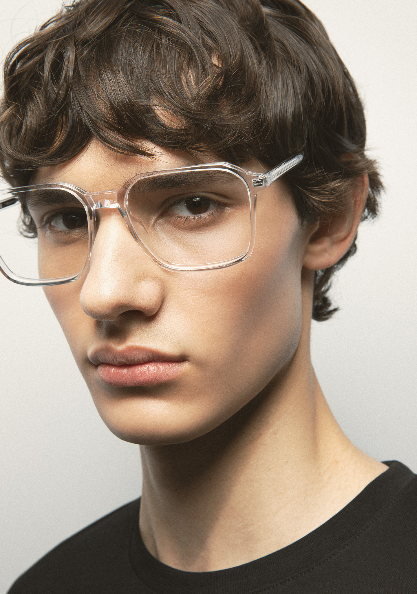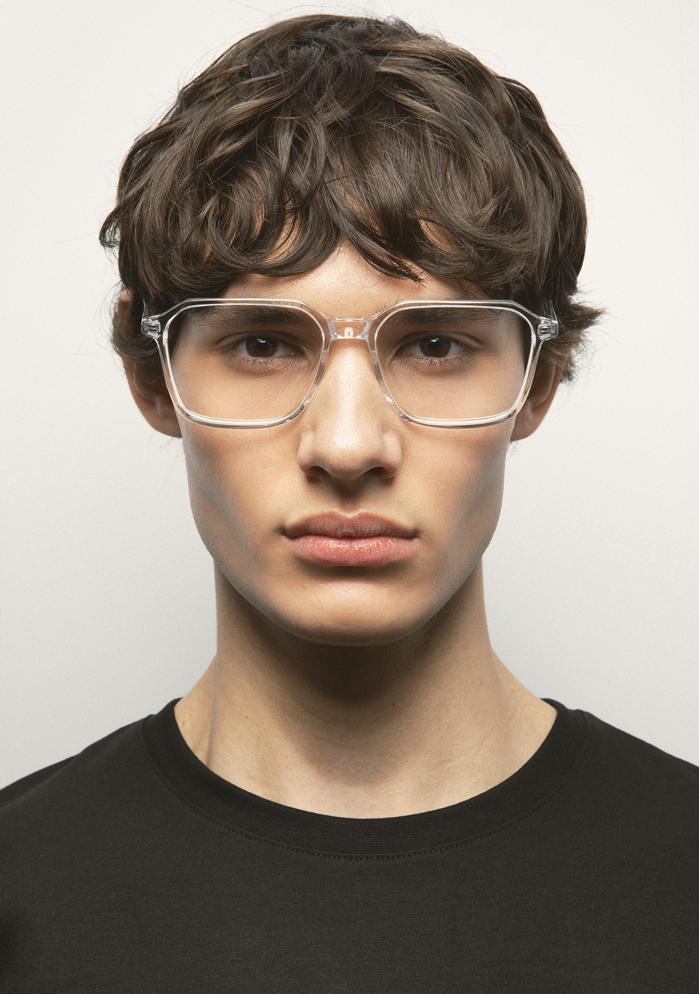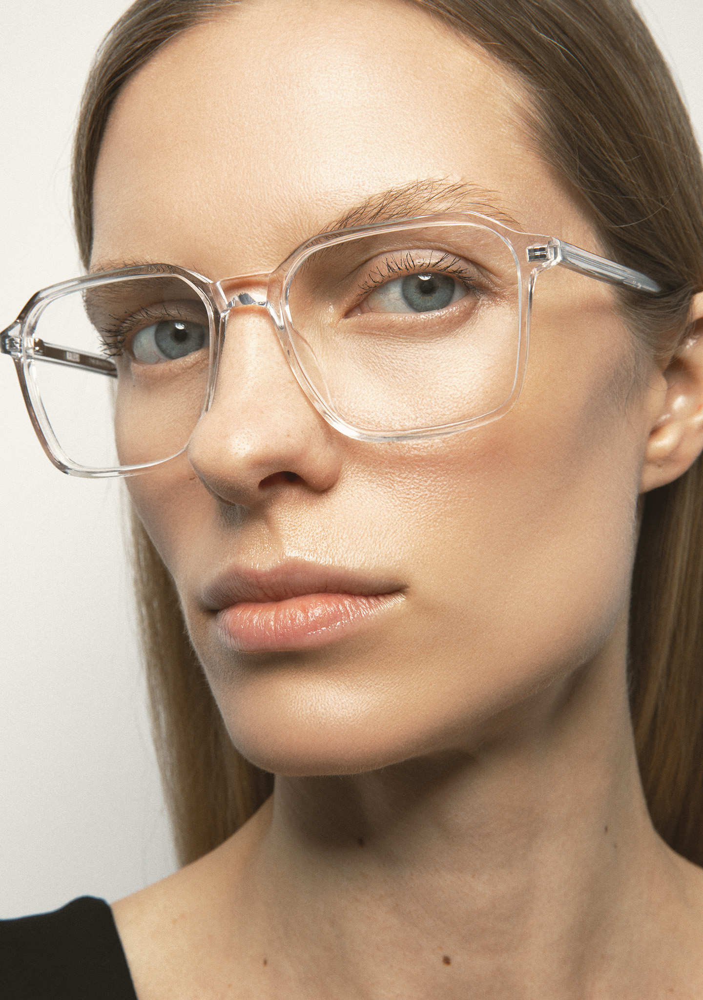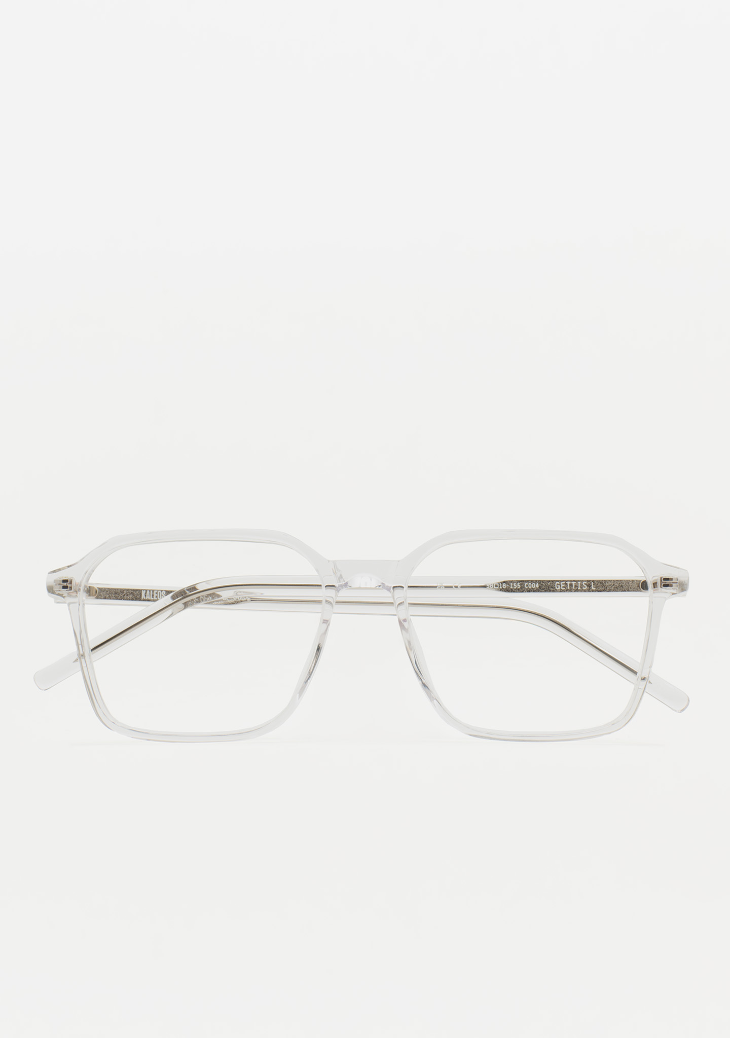 Rechteckige Korrekturbrille. Minimalistisches Design ohne überflüssige Details. Front und Bügel aus transparentem Kristall-Acetat. Integrierte Acetat-Nasenpads. Handgefertigt.