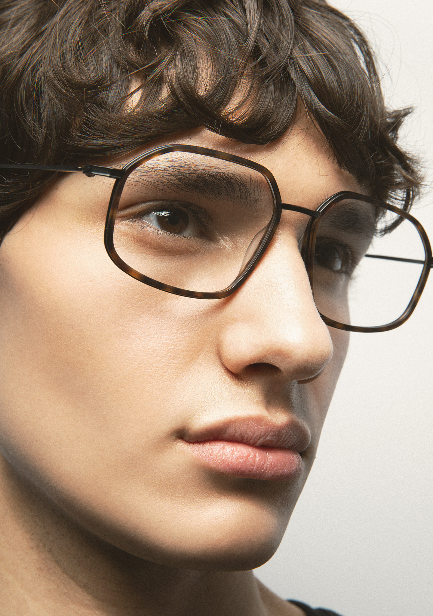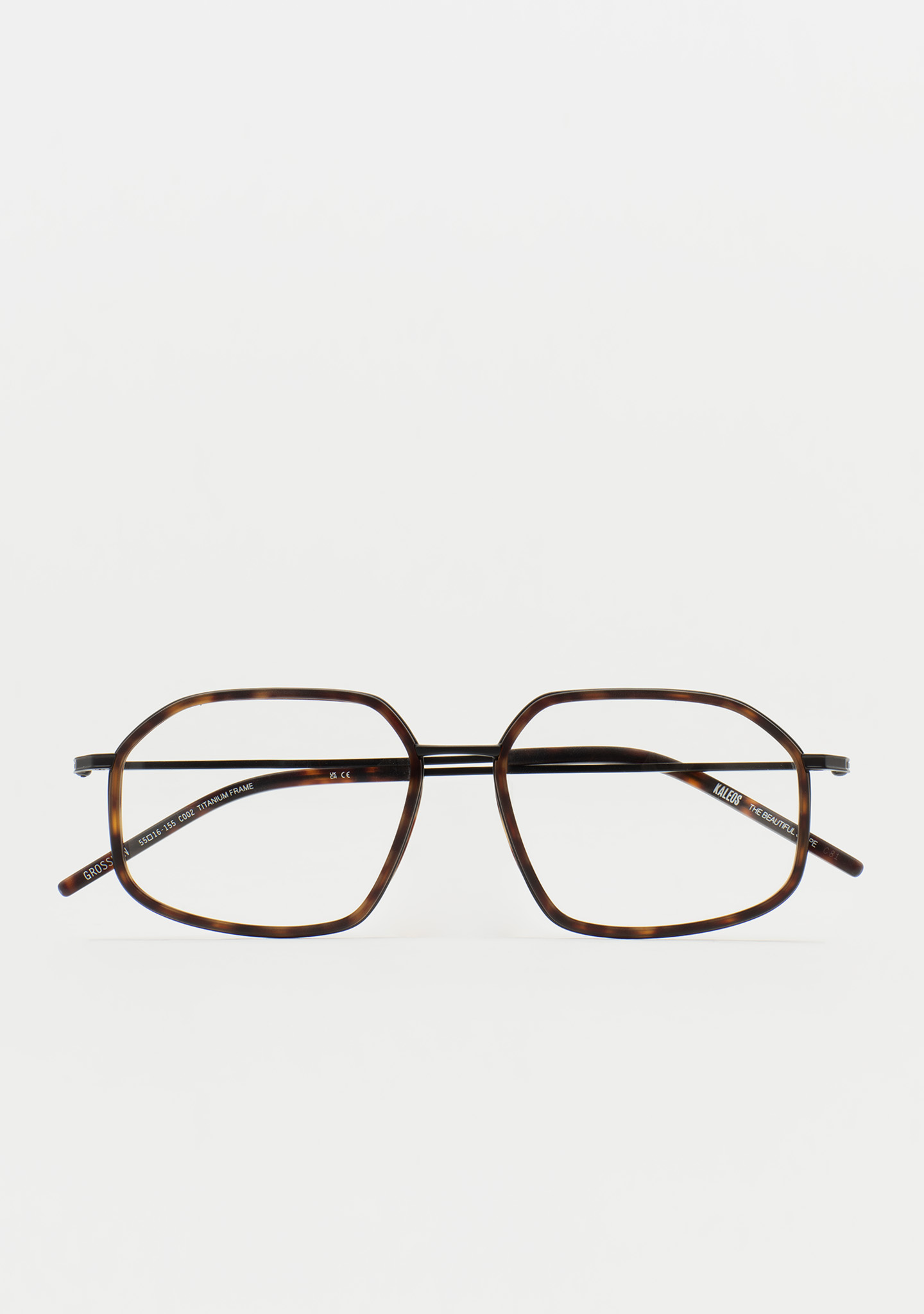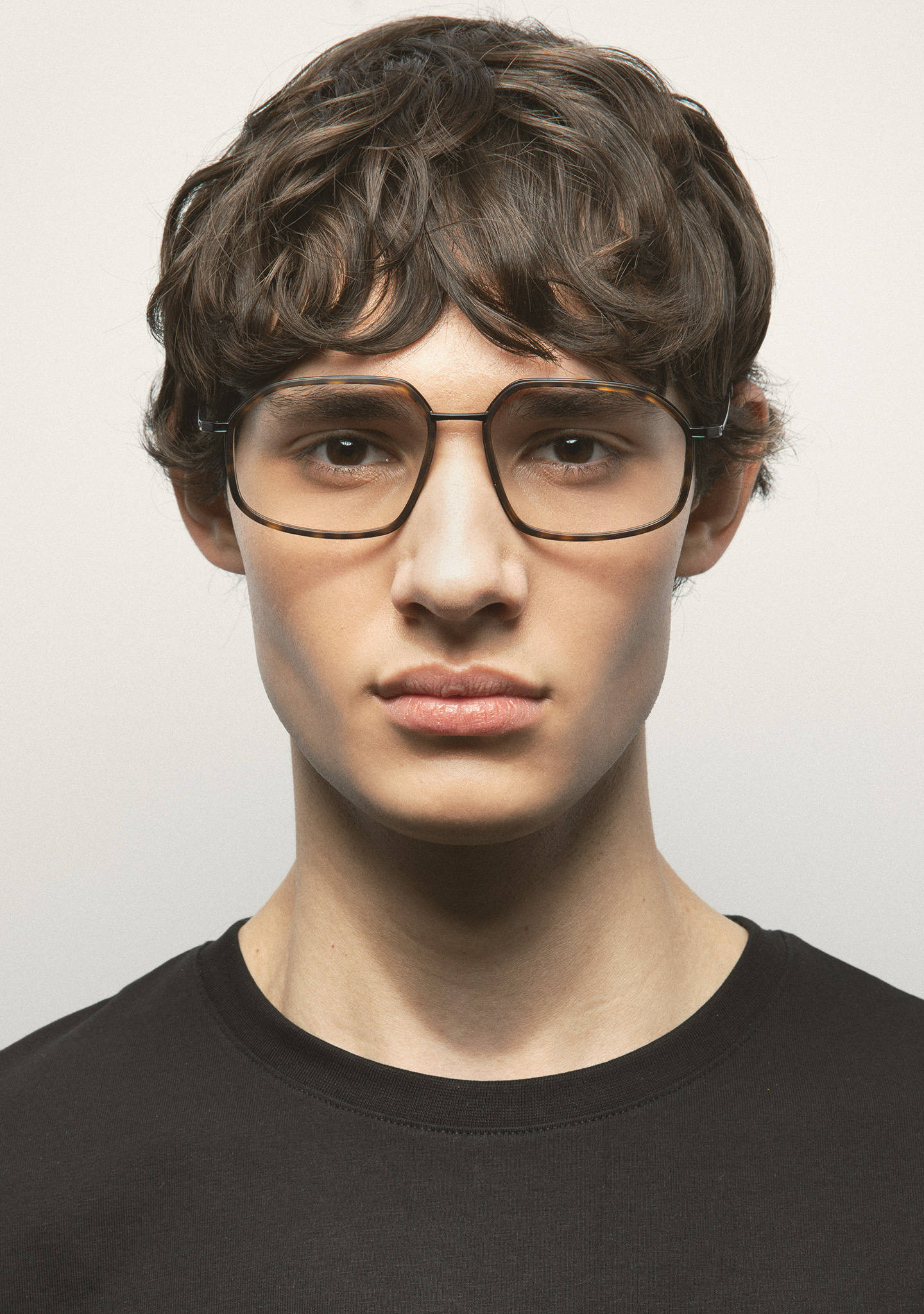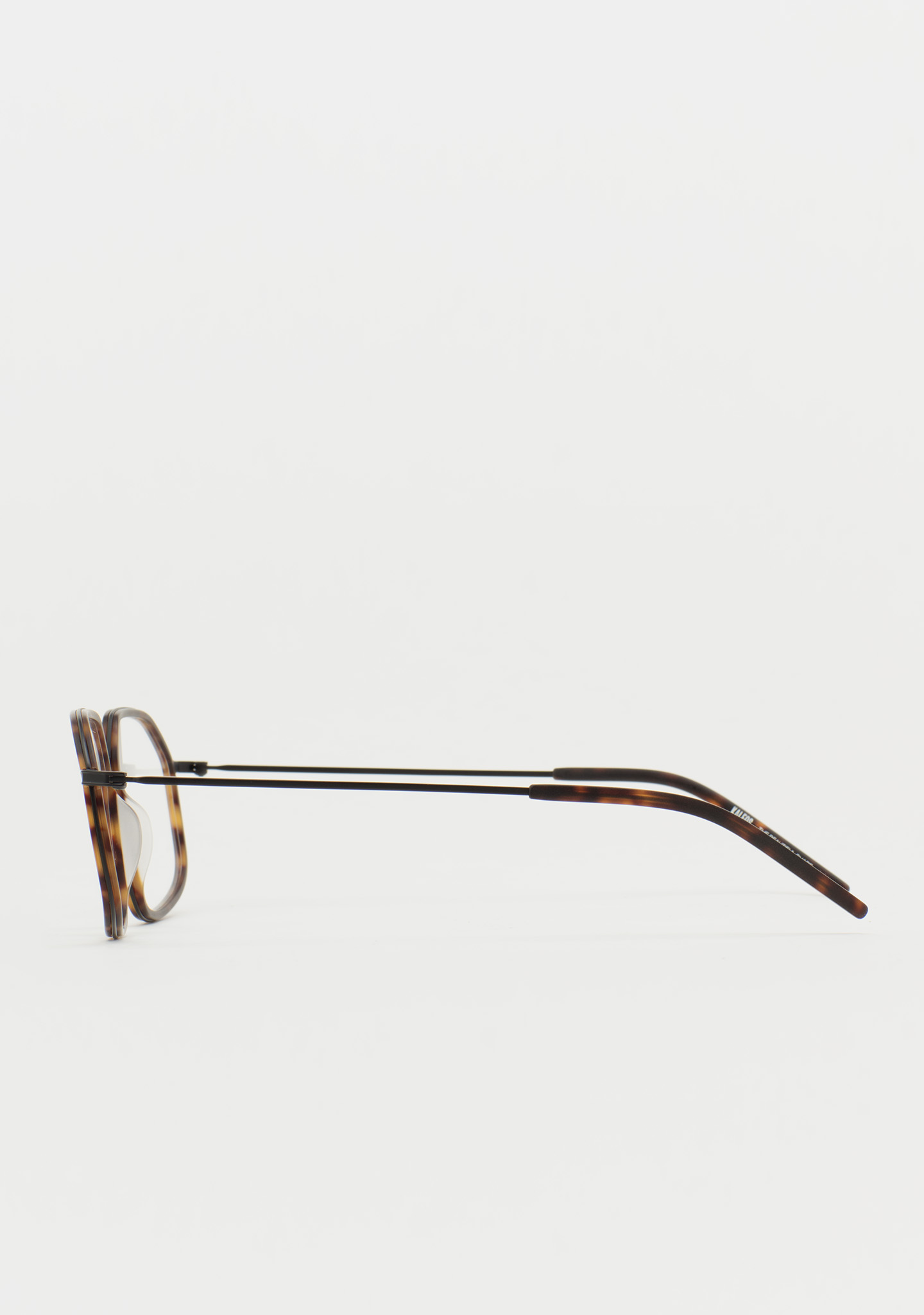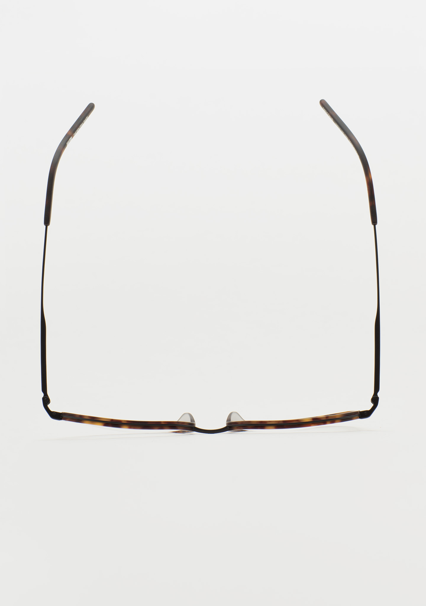 Aviator-Korrekturbrille. Design, das Stärke und Leichtigkeit vereint. Titanfront mit mattem dunkelbraunem Havana-High-Density-Acetat-Rand. Steg und Bügel aus schwarzem Titan, Bügelenden aus mattem dunkelbraunem Havana-Acetat. Integrierte Acetat-Nasenpads. Handgefertigt.