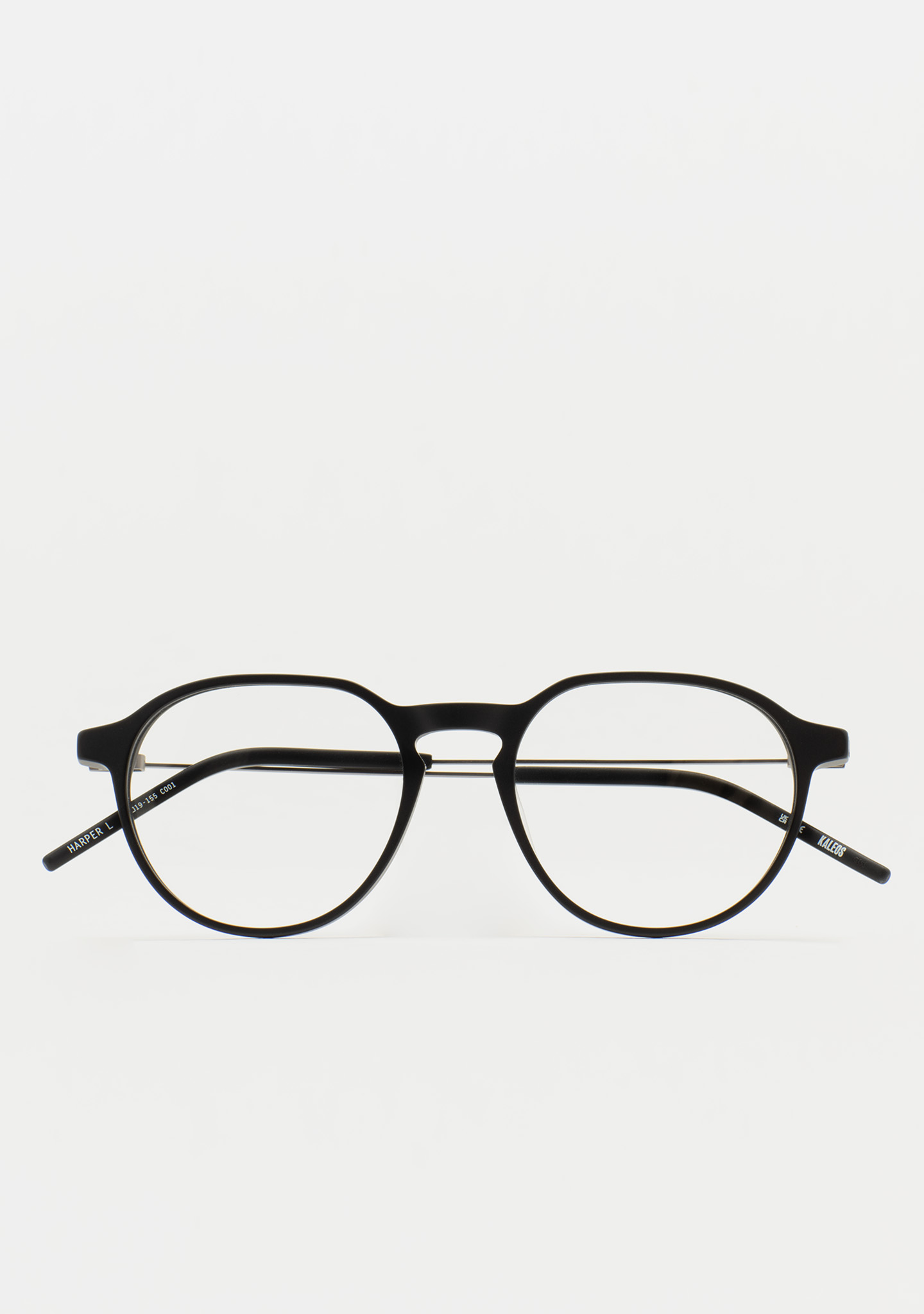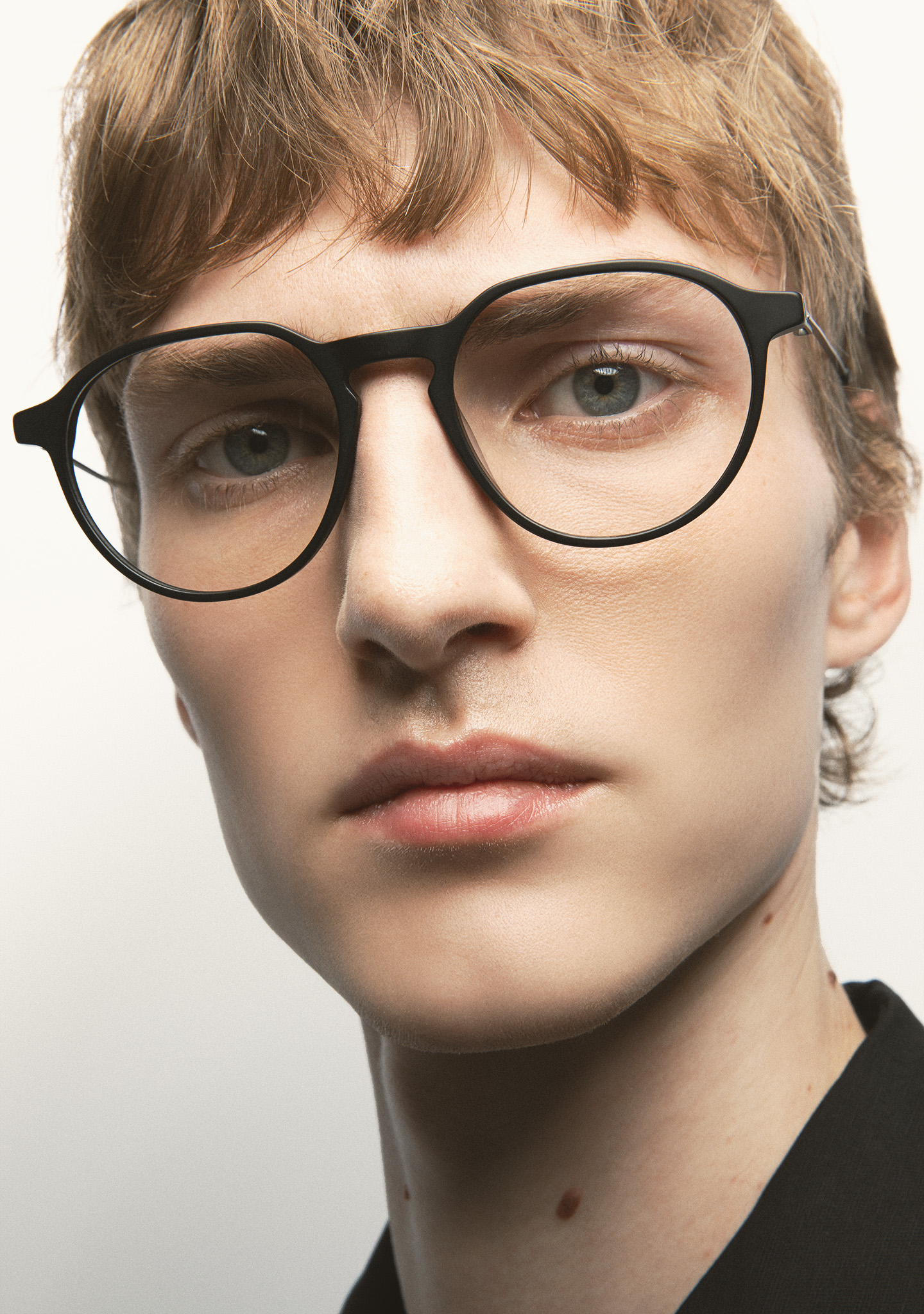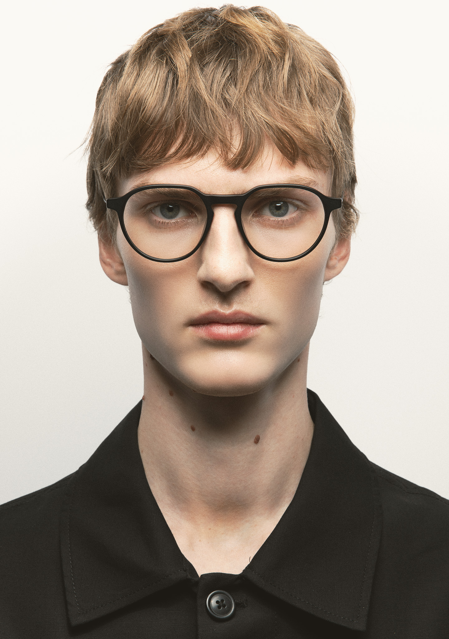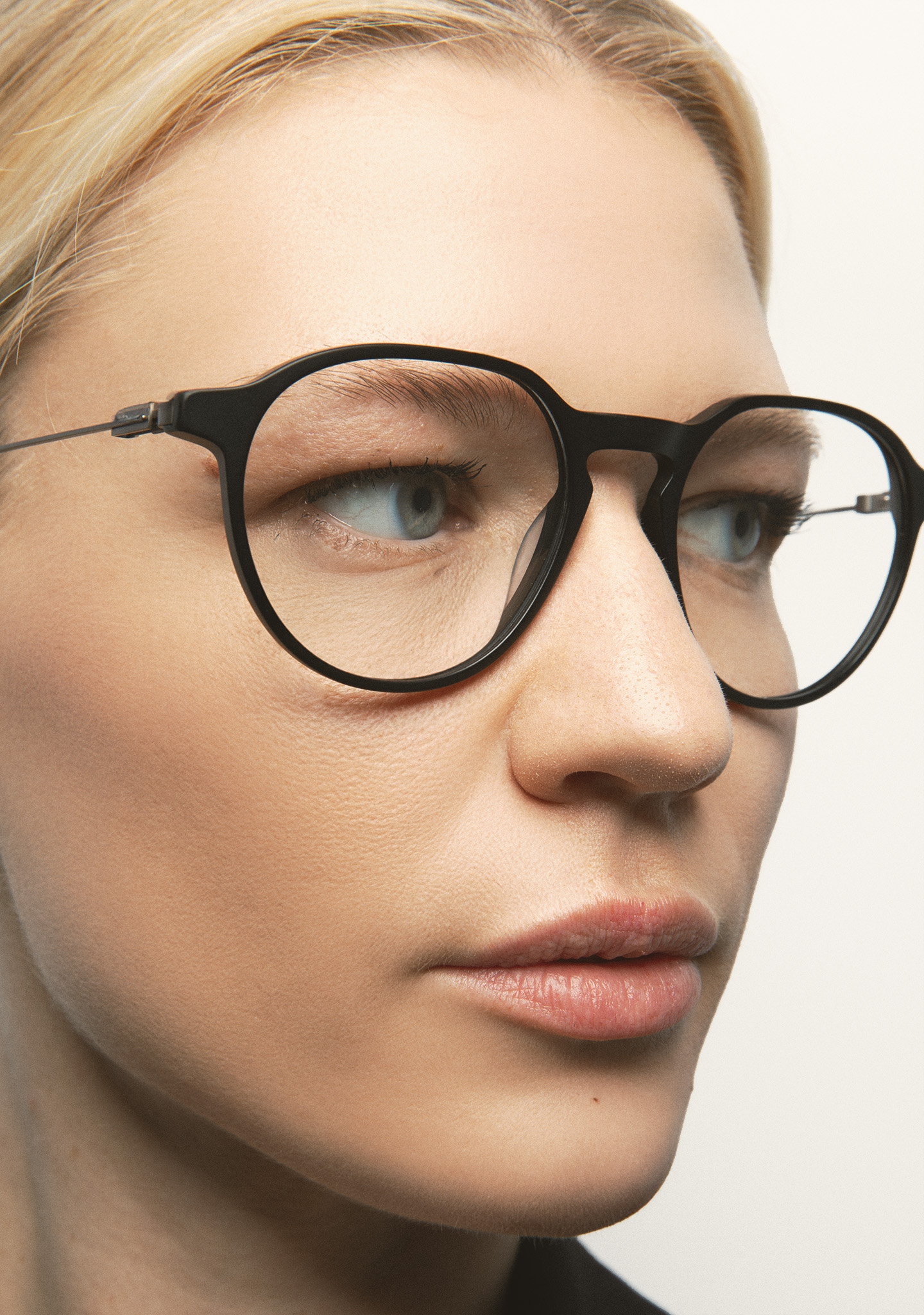 Pantos-Korrekturbrille. Geometrie, die das Wesentliche neu definiert. Front aus mattschwarzem High-Density-Acetat. Bügel aus matt dunkelgrauem Edelstahl mit mattschwarzen Acetat-Enden. Neue schraubenlose Scharnierkonstruktion. Integrierte Acetat-Nasenpads. Handgefertigt. Erhältlich in zwei Größen: mittel (M) und groß (L).