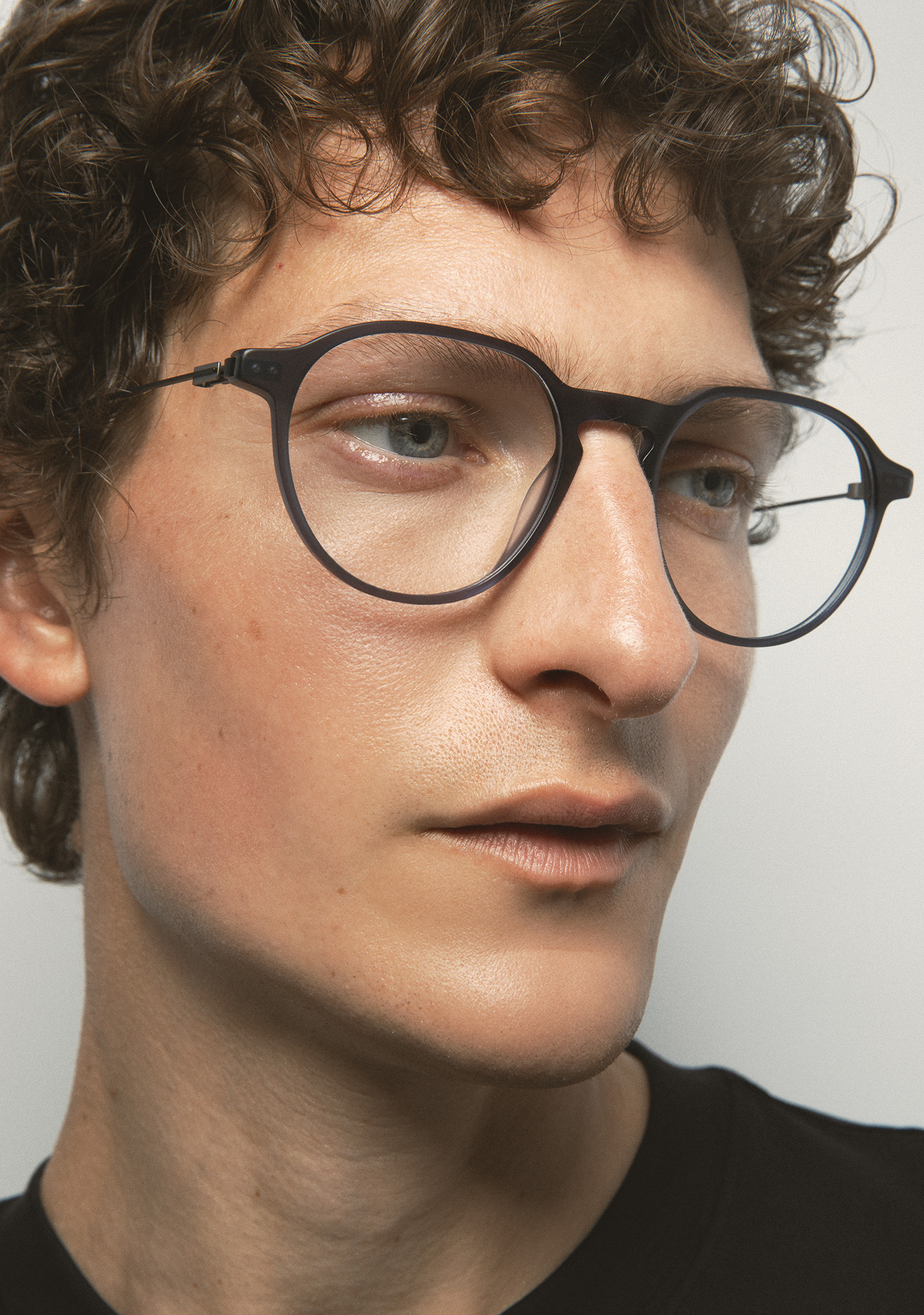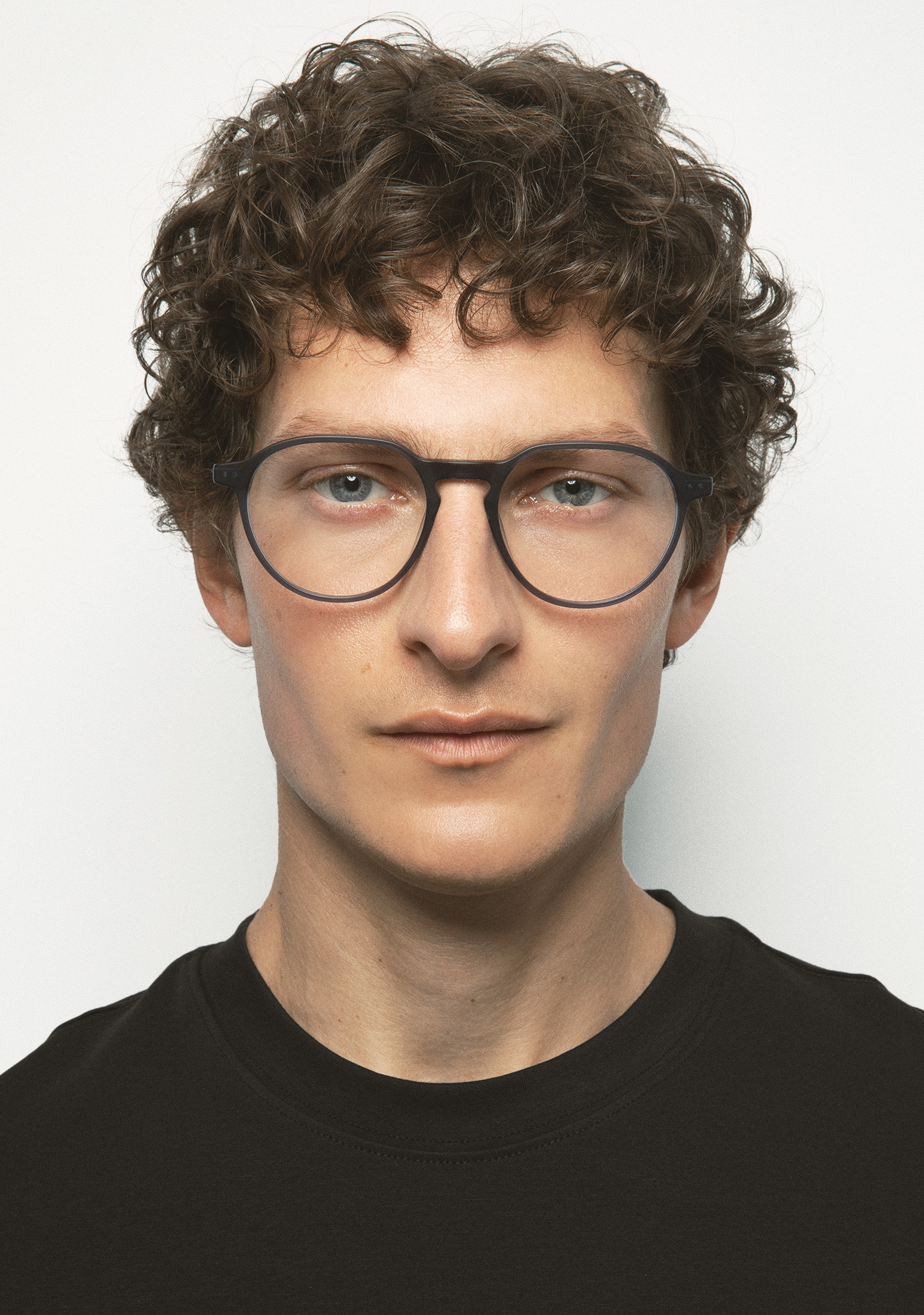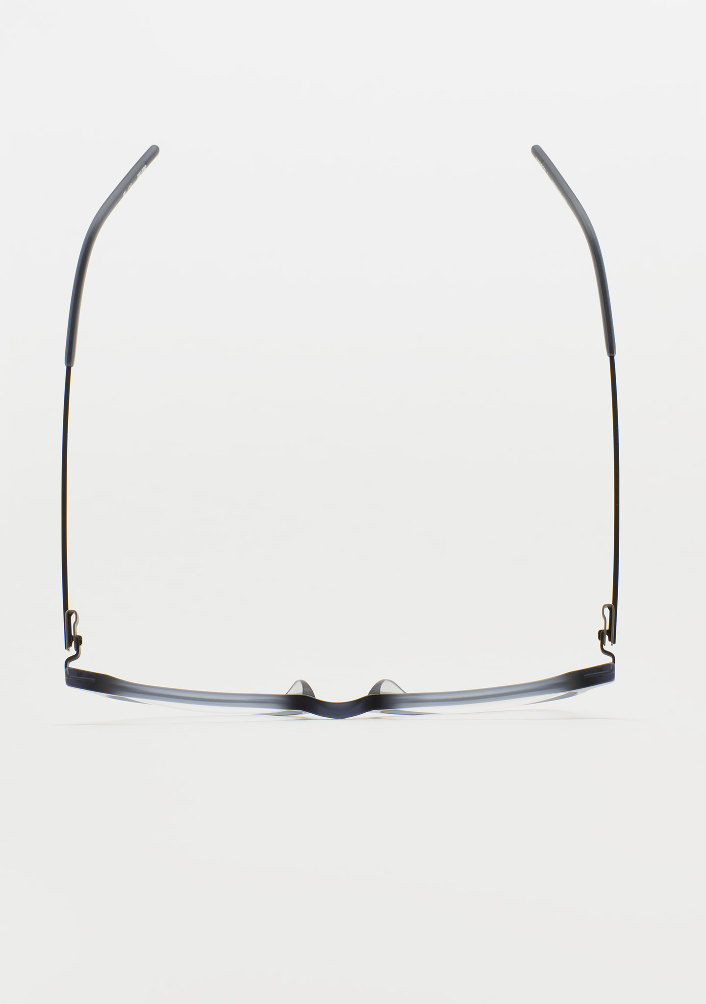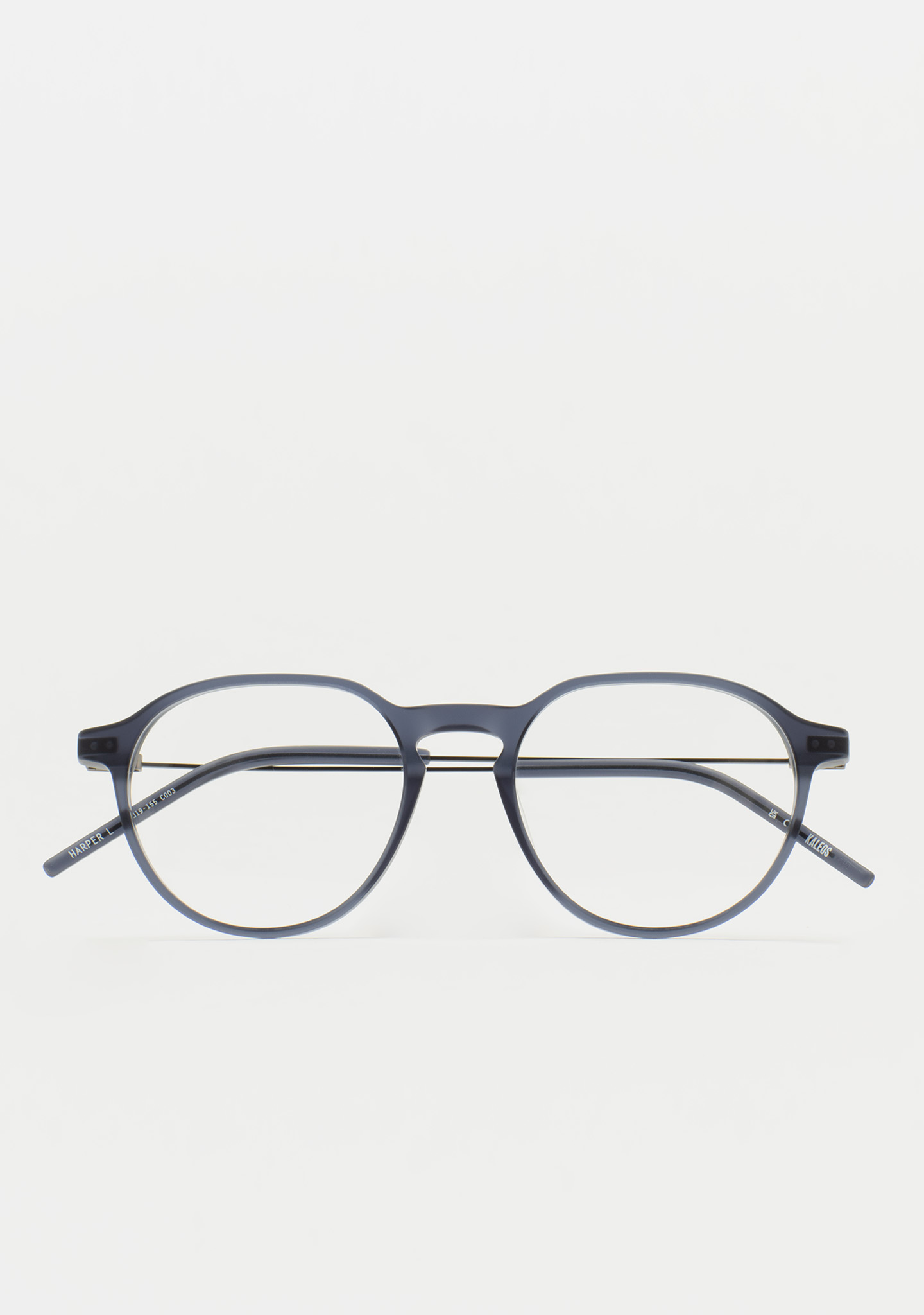 Pantos-Korrekturbrille. Geometrie, die das Wesentliche neu definiert. Front aus mattem transparentem blaugrauem Acetat. Bügel aus mattschwarzem Edelstahl mit matten transparenten blaugrauen Acetat-Enden. Neue schraubenlose Scharnierkonstruktion. Integrierte Acetat-Nasenpads. Handgefertigt. Erhältlich in zwei Größen: mittel (M) und groß (L).