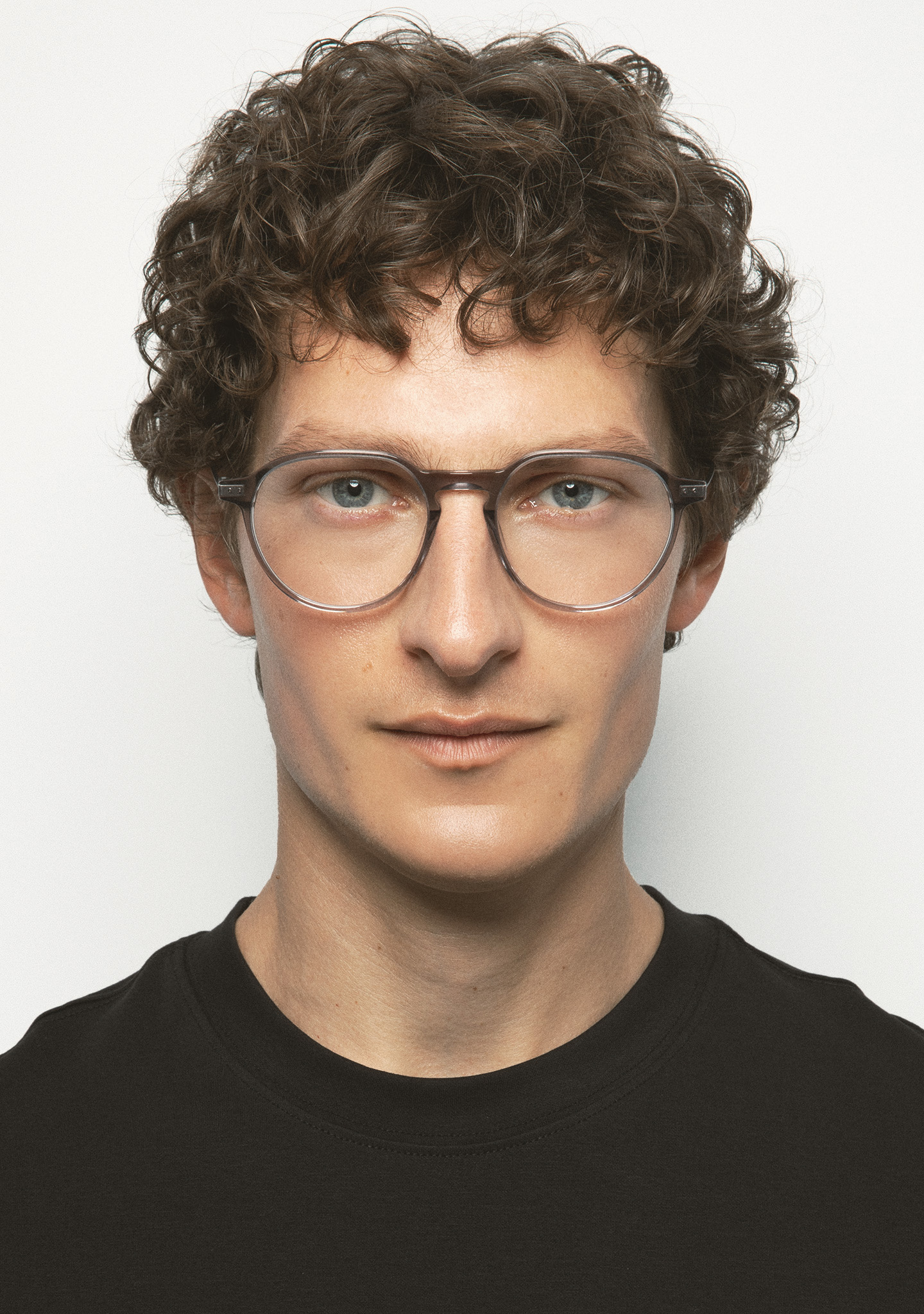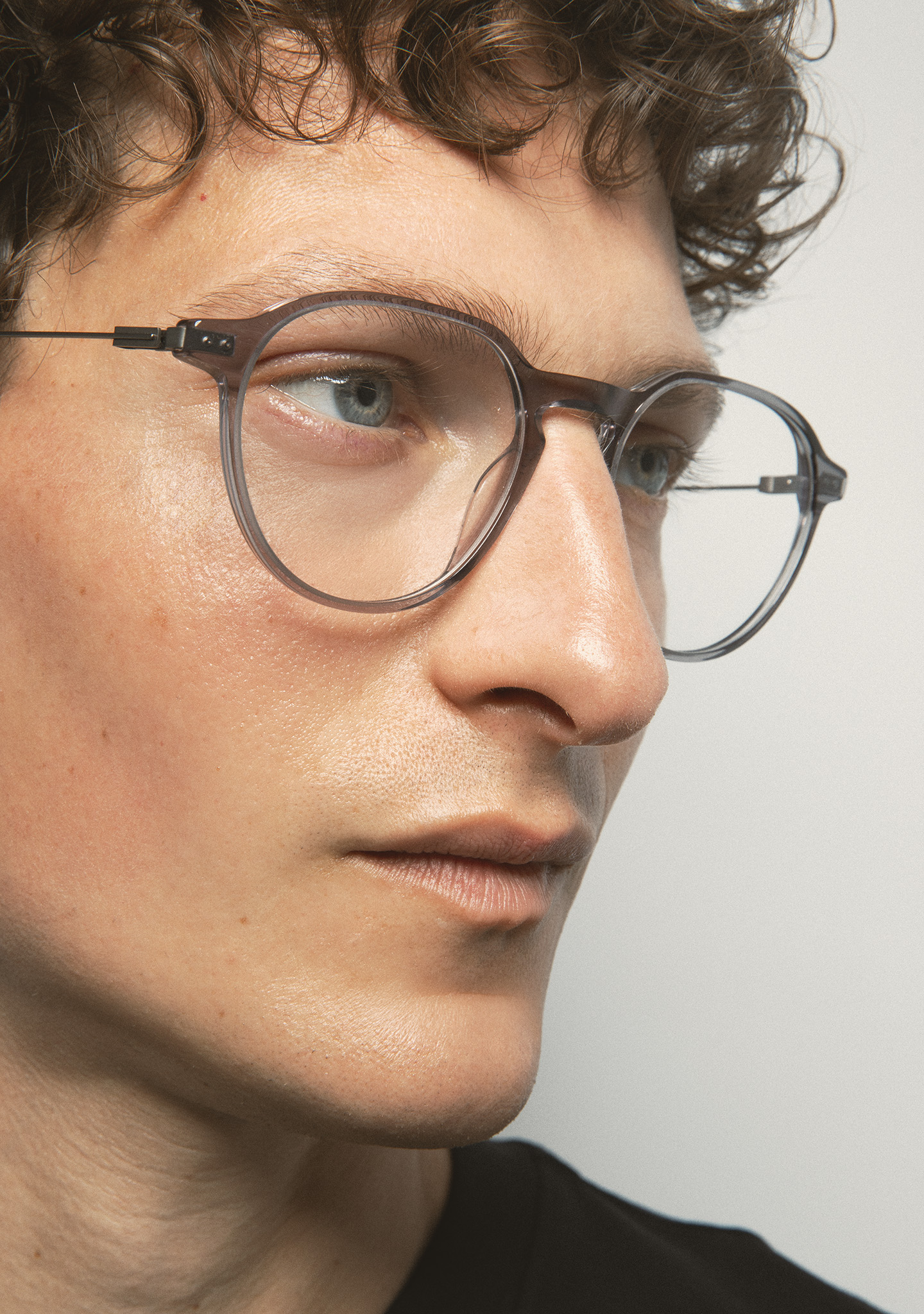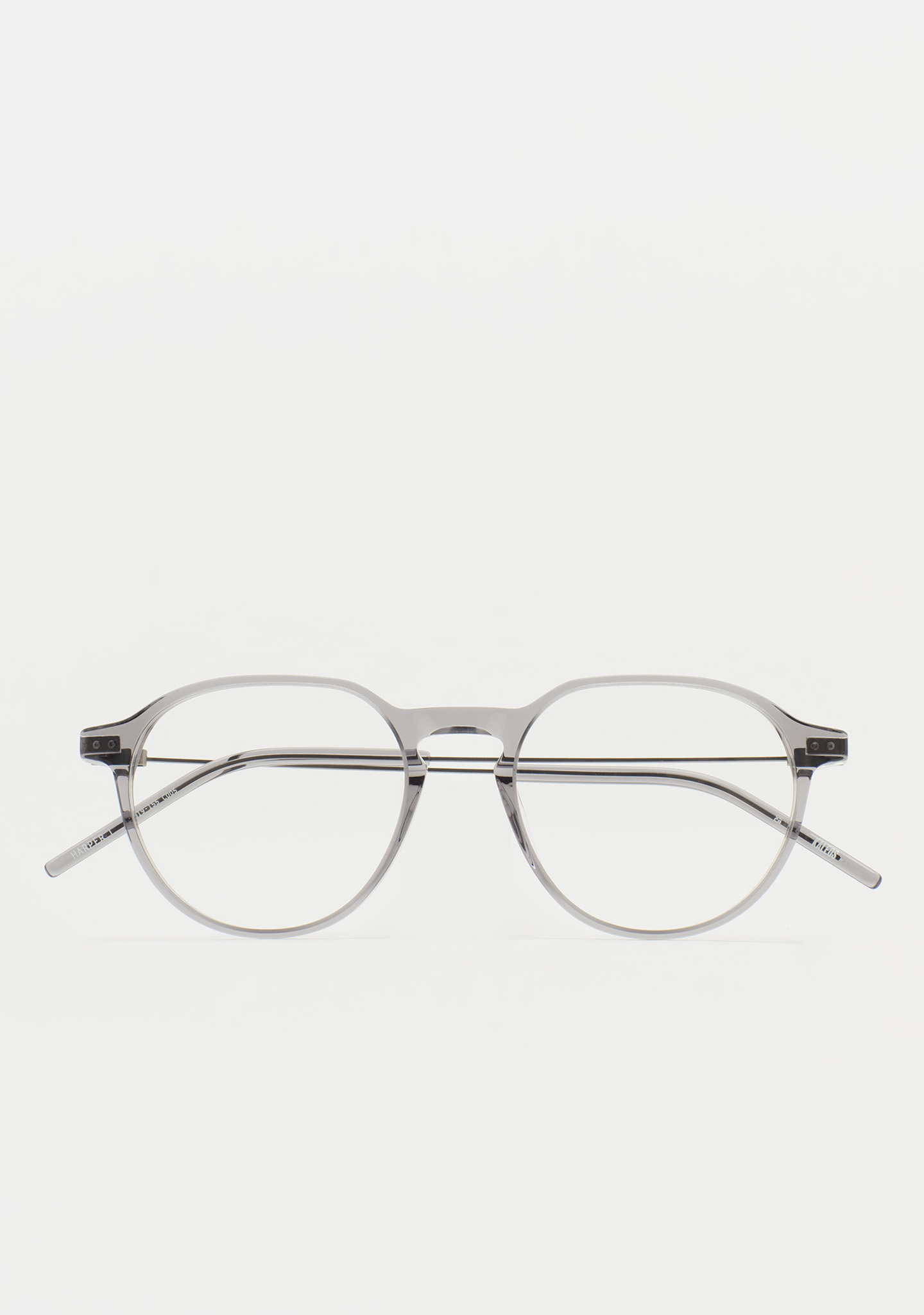 Pantos-Korrekturbrille. Geometrie, die das Wesentliche neu definiert. Front aus transparentem grauem High-Density-Acetat. Bügel aus matt dunkelgrauem Edelstahl mit transparenten grauen Acetat-Enden. Neue schraubenlose Scharnierkonstruktion. Integrierte Acetat-Nasenpads. Handgefertigt. Erhältlich in zwei Größen: mittel (M) und groß (L).