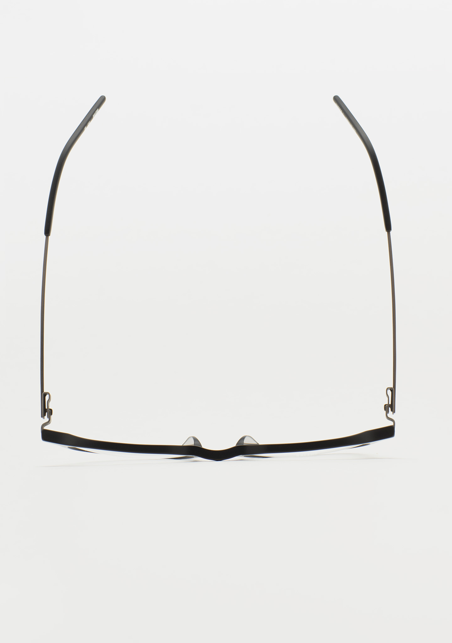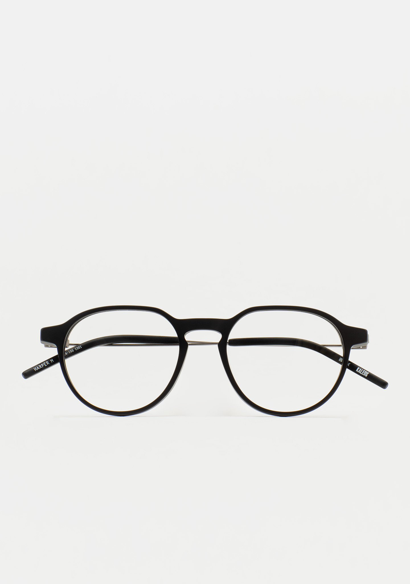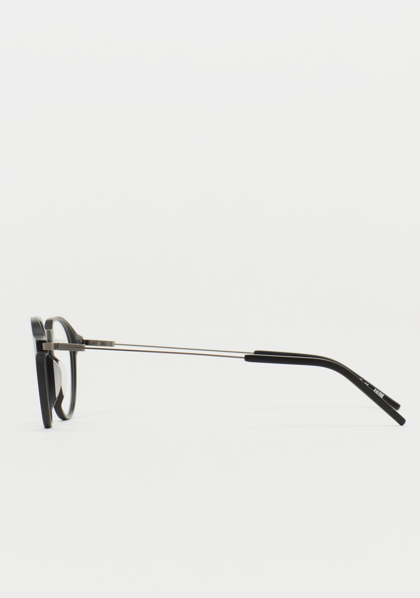 Korrektionsfassung in Pantos-Form. Eine Geometrie, die das Wesentliche neu definiert. Front aus hochdichtem, mattschwarzem Acetat. Bügel aus matt dunkelgrauem Edelstahl mit mattschwarzen Acetatenden. Bügel mit neuer schraubenloser Scharnierkonstruktion. Integrierte Acetat-Nasenpads. Handgefertigt. Erhältlich in zwei Größen: Medium (M) und Large (L).
