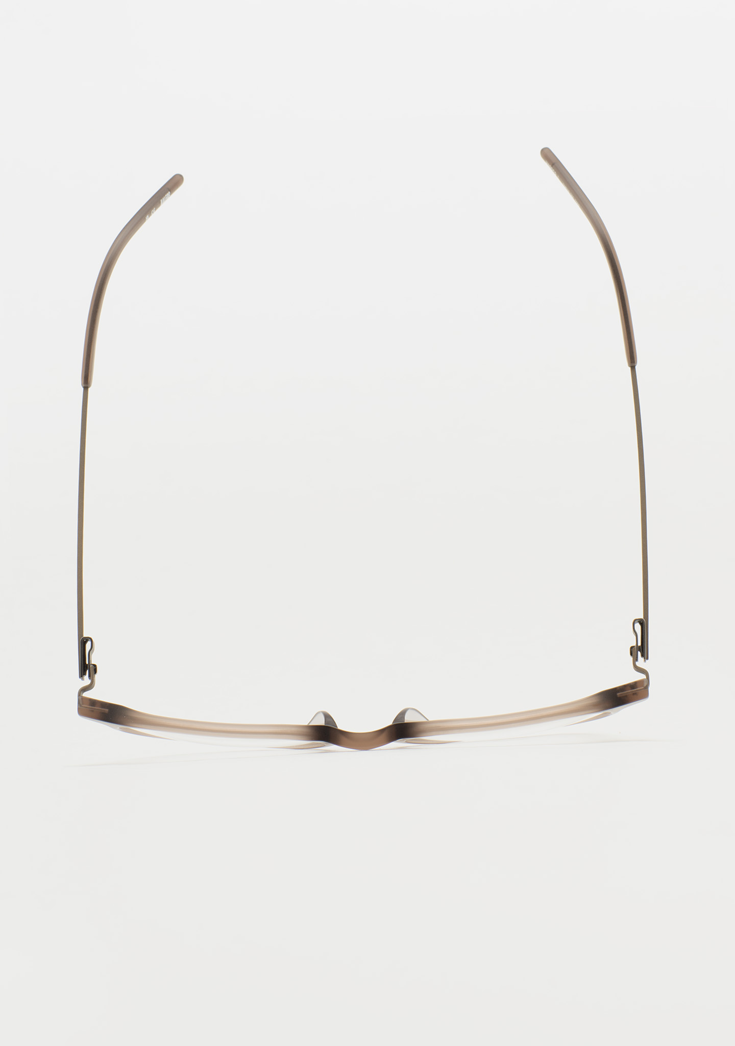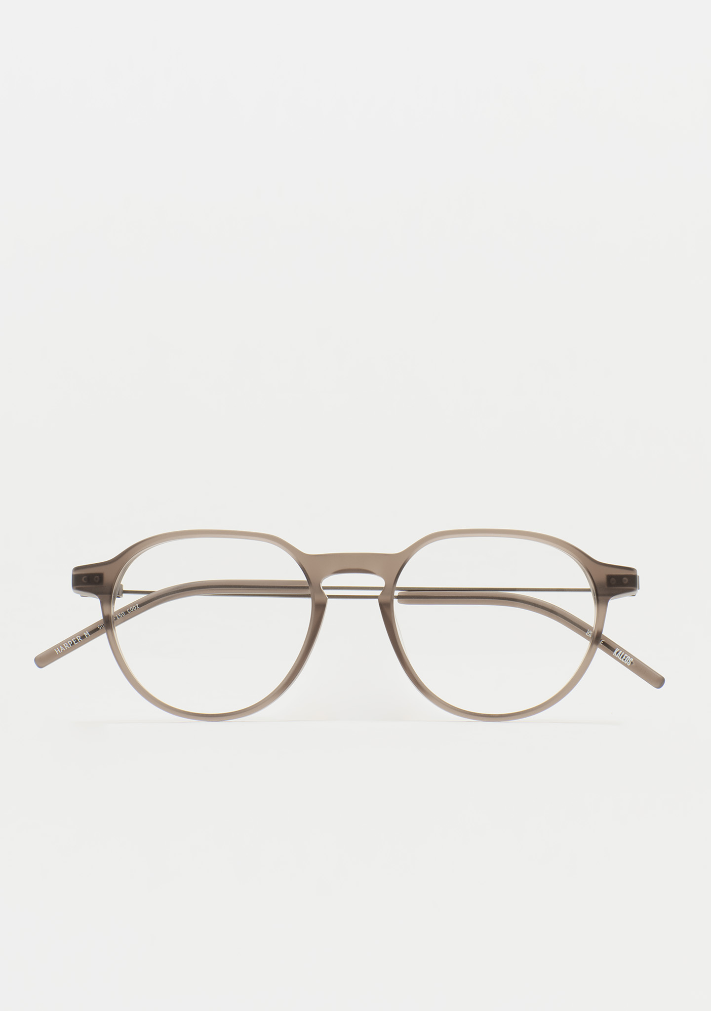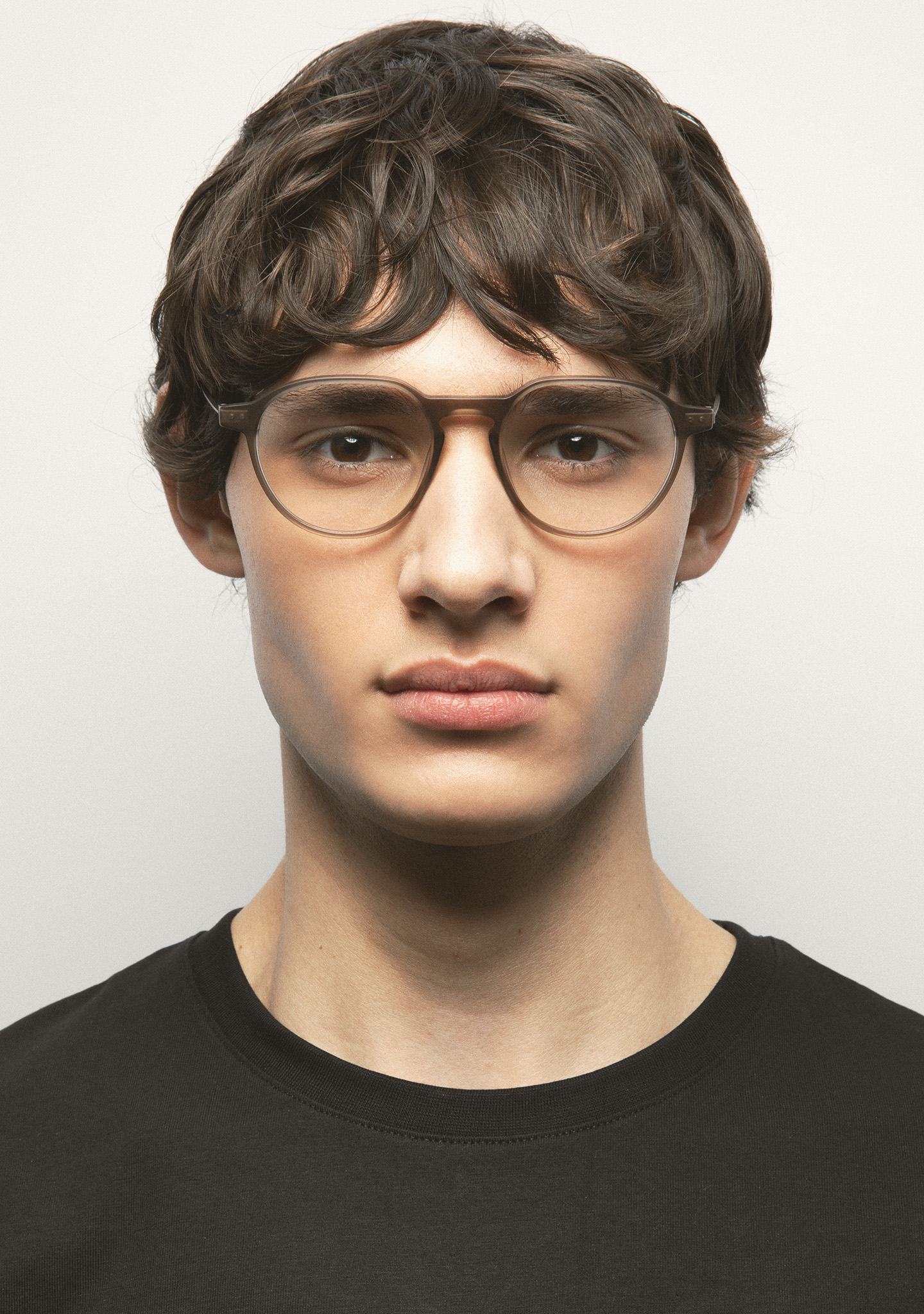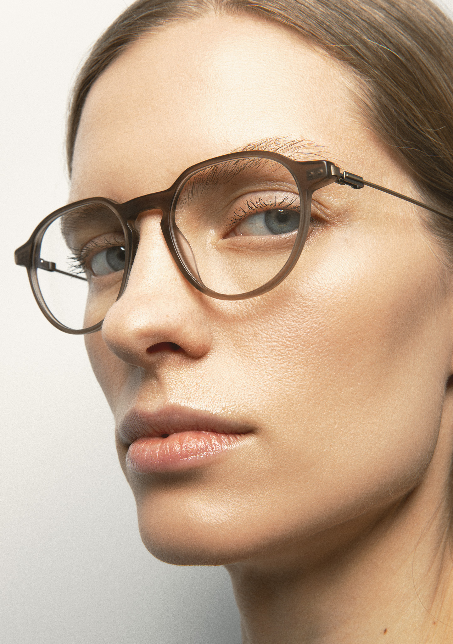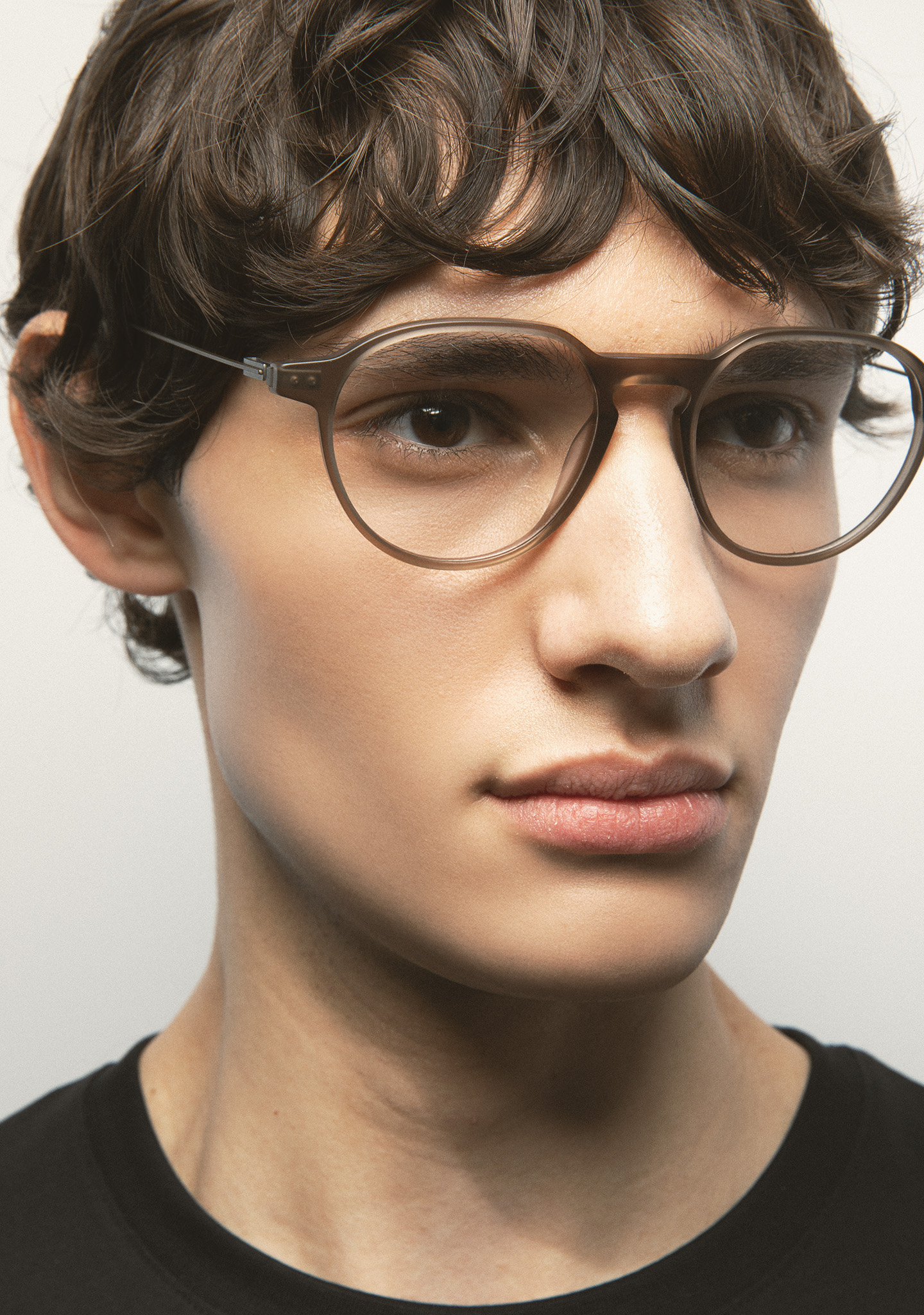 Pantos-Korrekturbrille. Geometrie, die das Wesentliche neu definiert. Front aus mattem transparentem braunem High-Density-Acetat. Bügel aus braunem Edelstahl mit matten transparenten braunen Acetat-Enden. Neue schraubenlose Scharnierkonstruktion. Integrierte Acetat-Nasenpads. Handgefertigt. Erhältlich in zwei Größen: mittel (M) und groß (L).