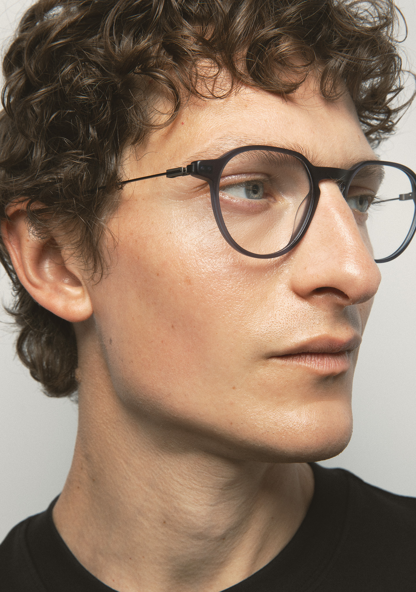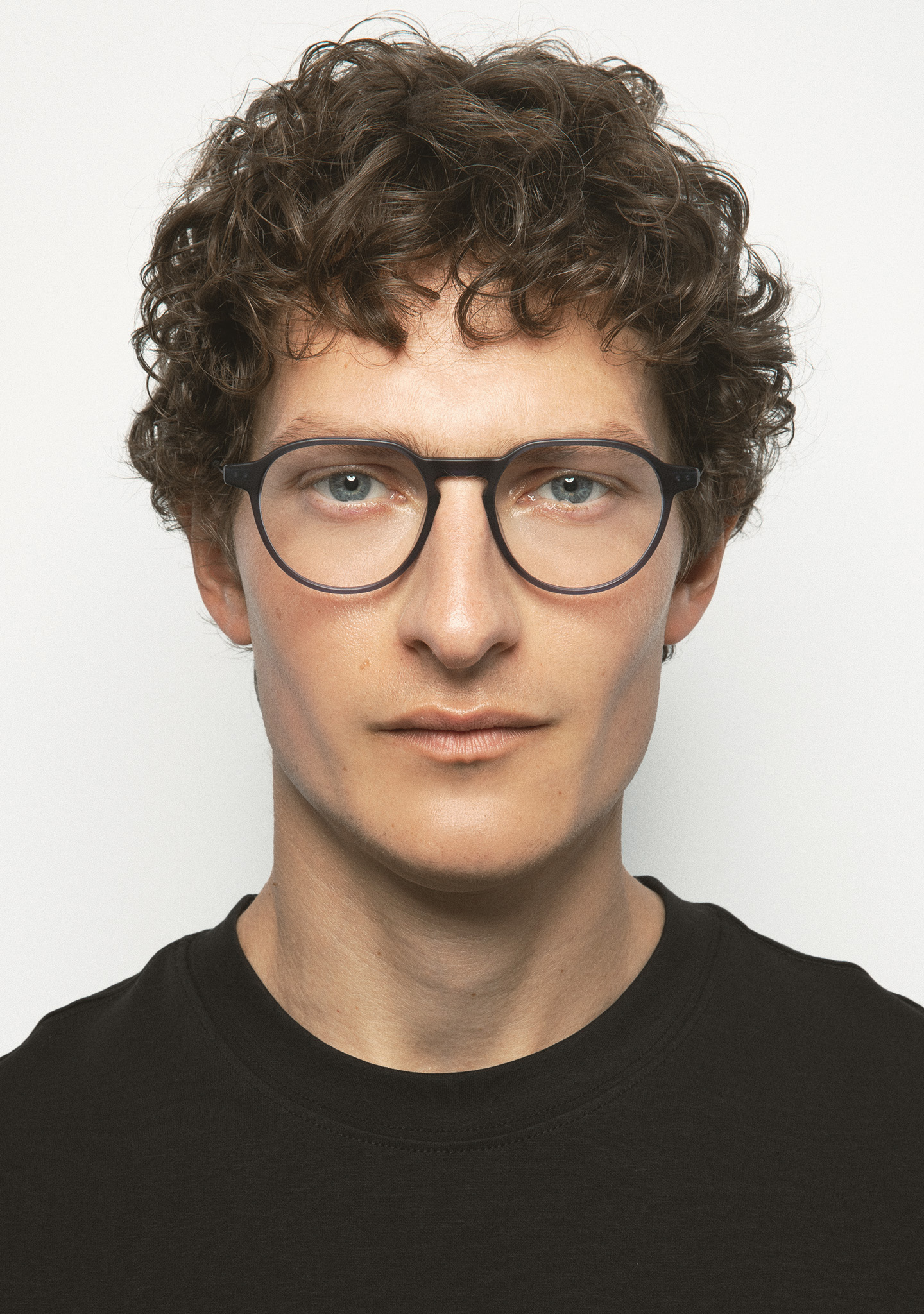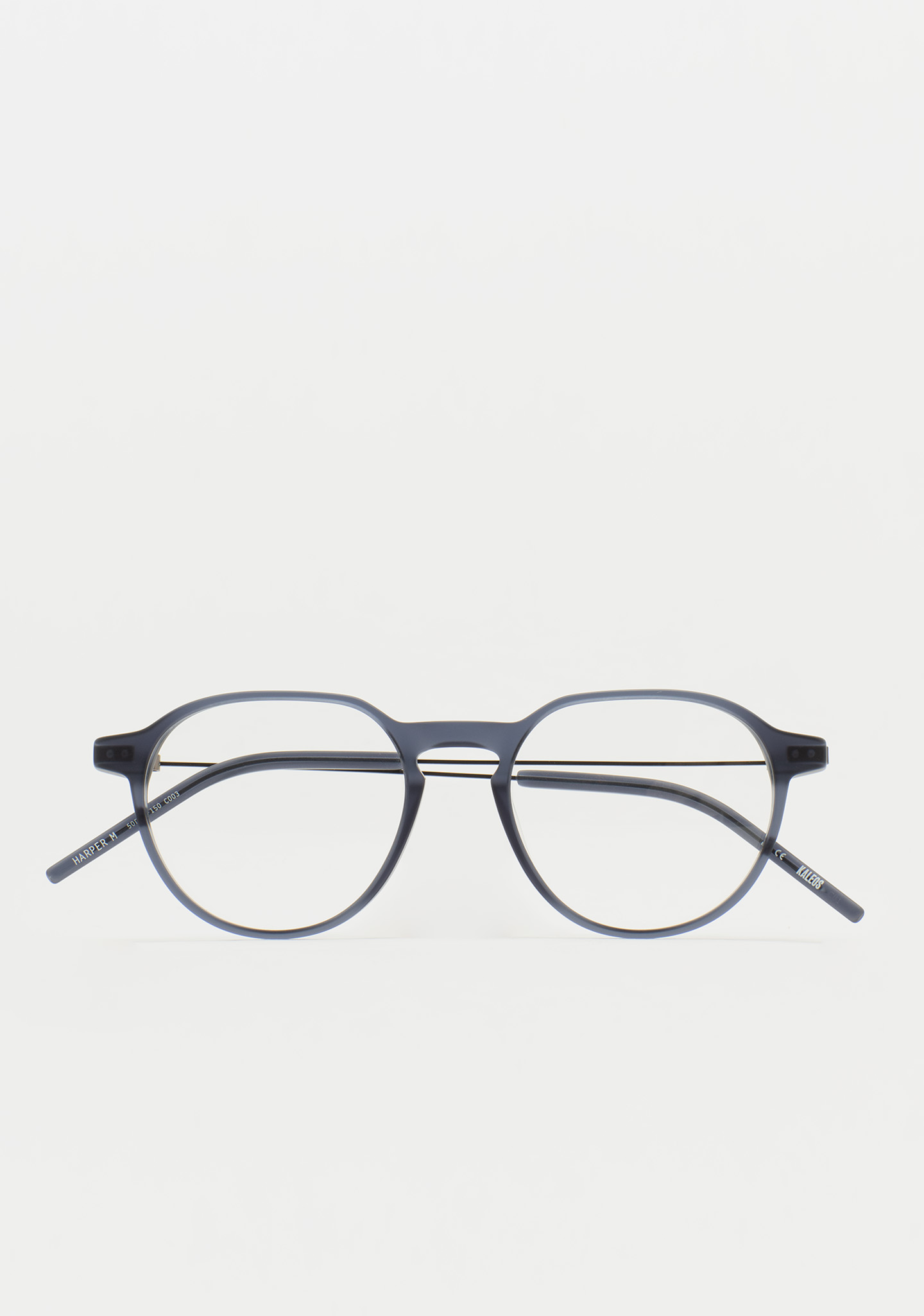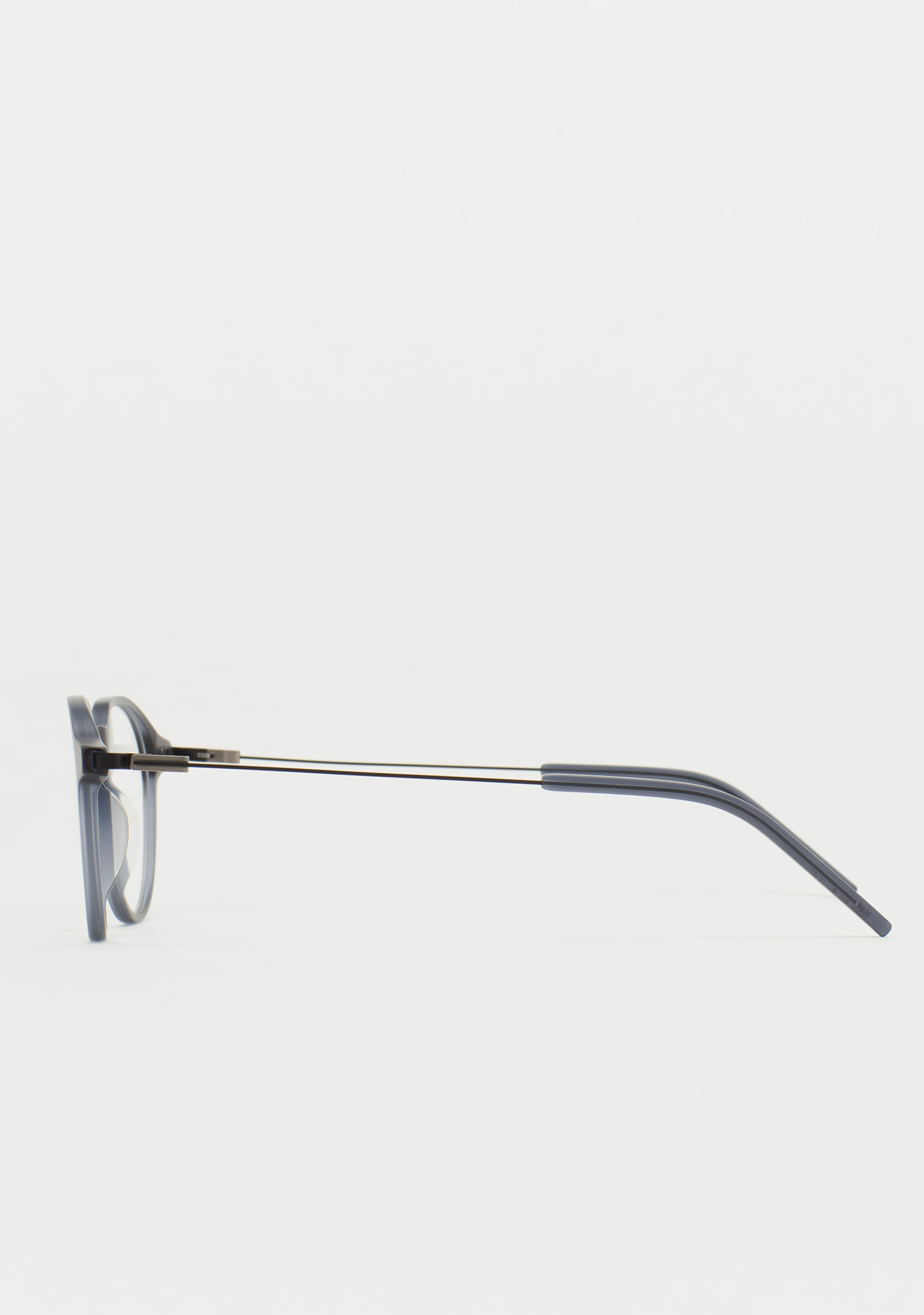 Pantos-Korrekturbrille. Geometrie, die das Wesentliche neu definiert. Front aus mattem transparentem blaugrauem Acetat. Bügel aus mattschwarzem Edelstahl mit matten transparenten blaugrauen Acetat-Enden. Neue schraubenlose Scharnierkonstruktion. Integrierte Acetat-Nasenpads. Handgefertigt. Erhältlich in zwei Größen: mittel (M) und groß (L).