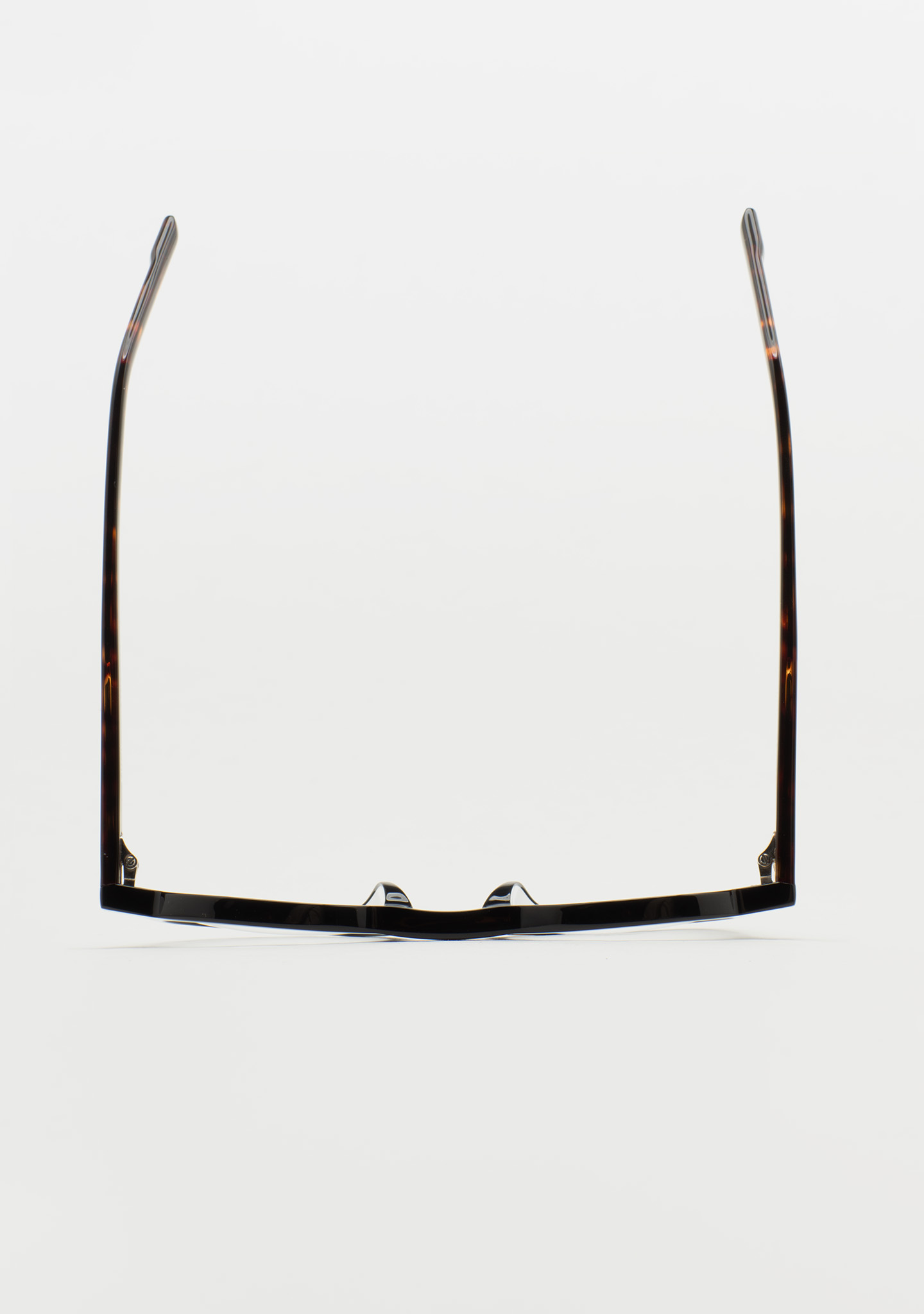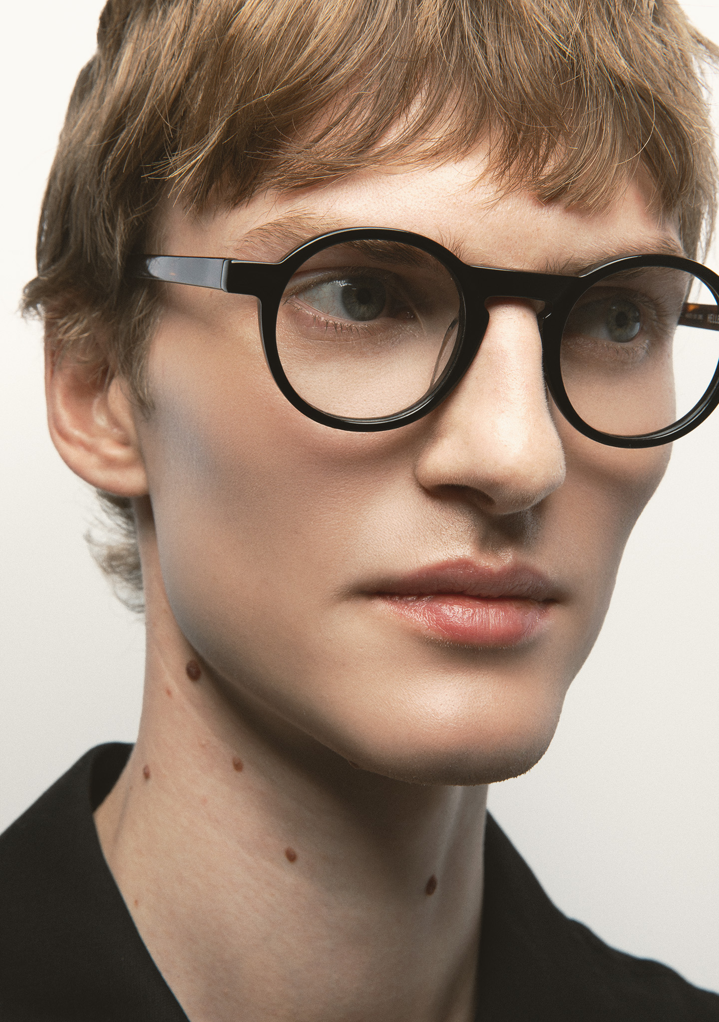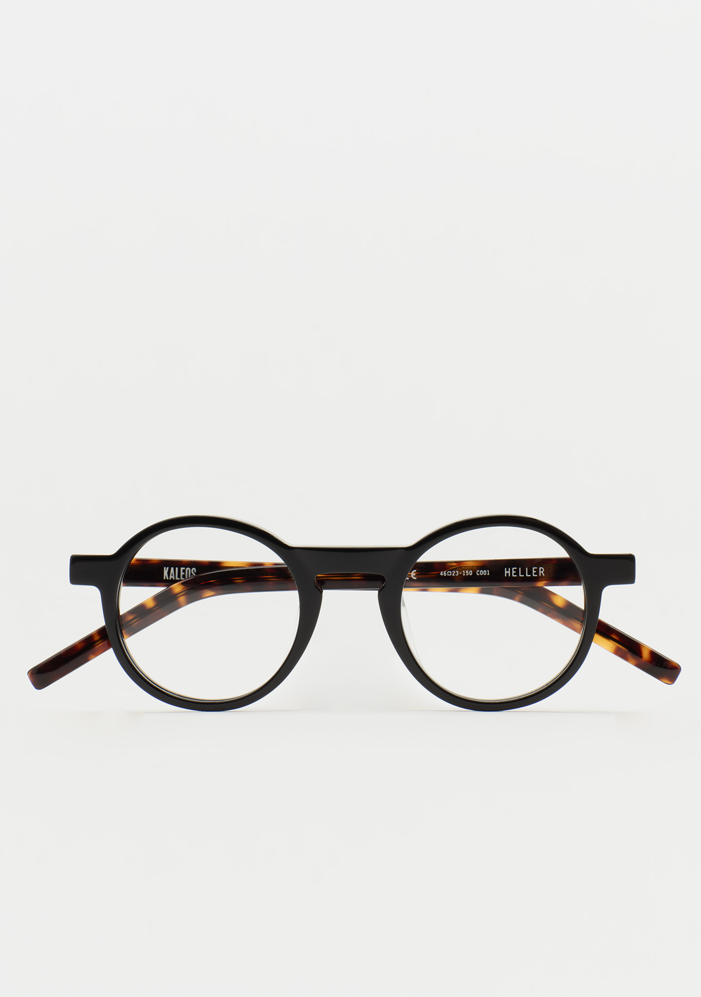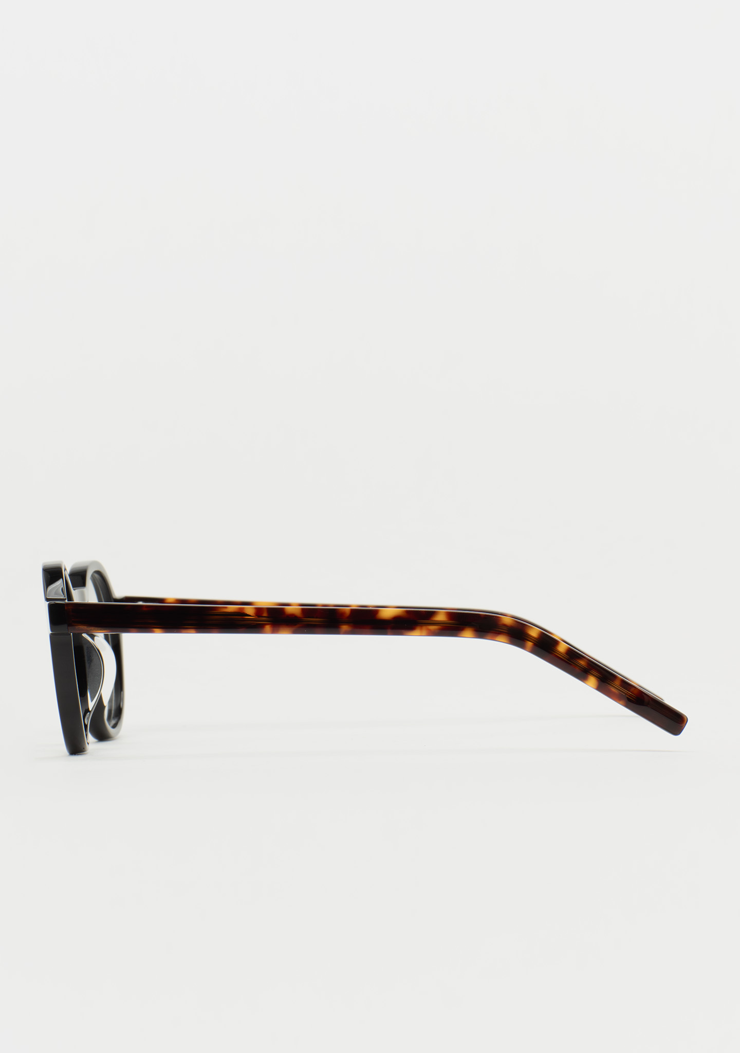 Runde Korrekturbrille. Eine Silhouette mit eigenständigem Stil. Front aus schwarzem Acetat mit Bügeln aus dunkelbraunem Havana-Acetat. Integrierte Acetat-Nasenpads. Handgefertigt.