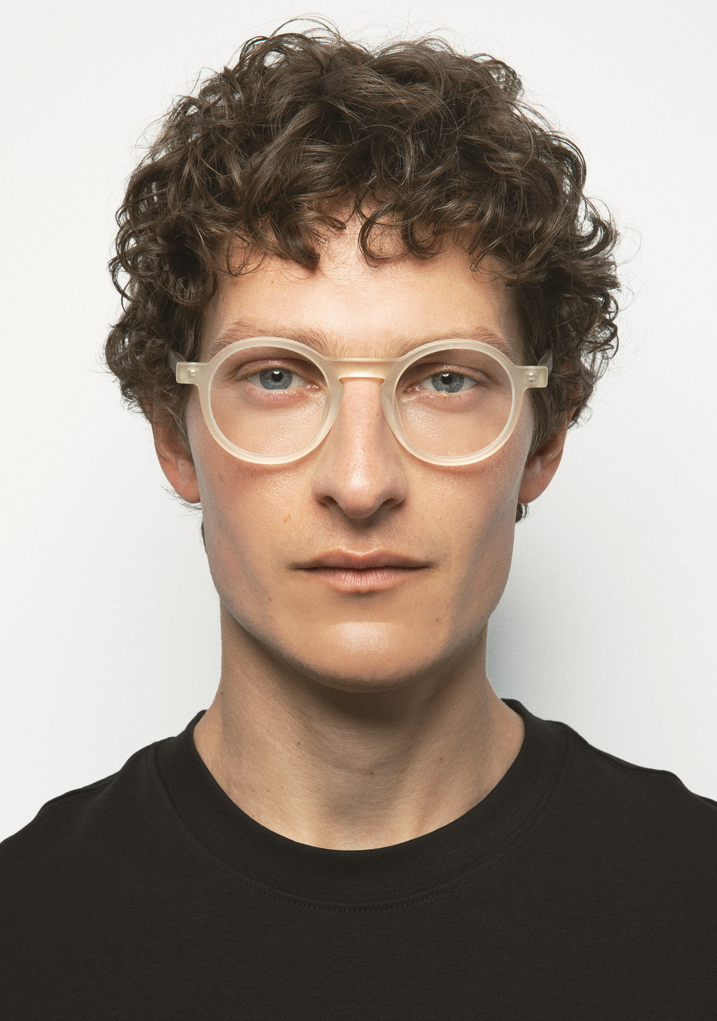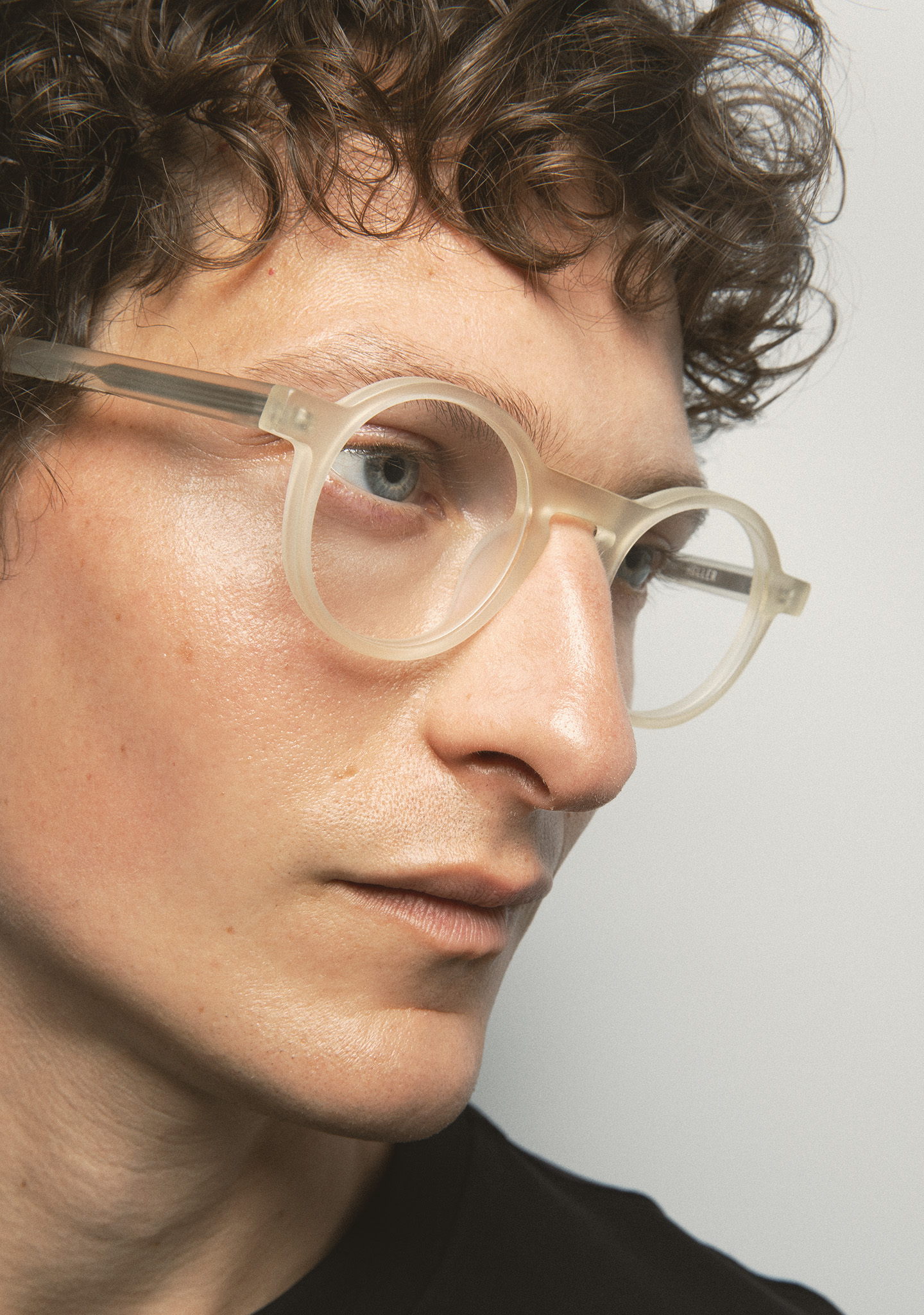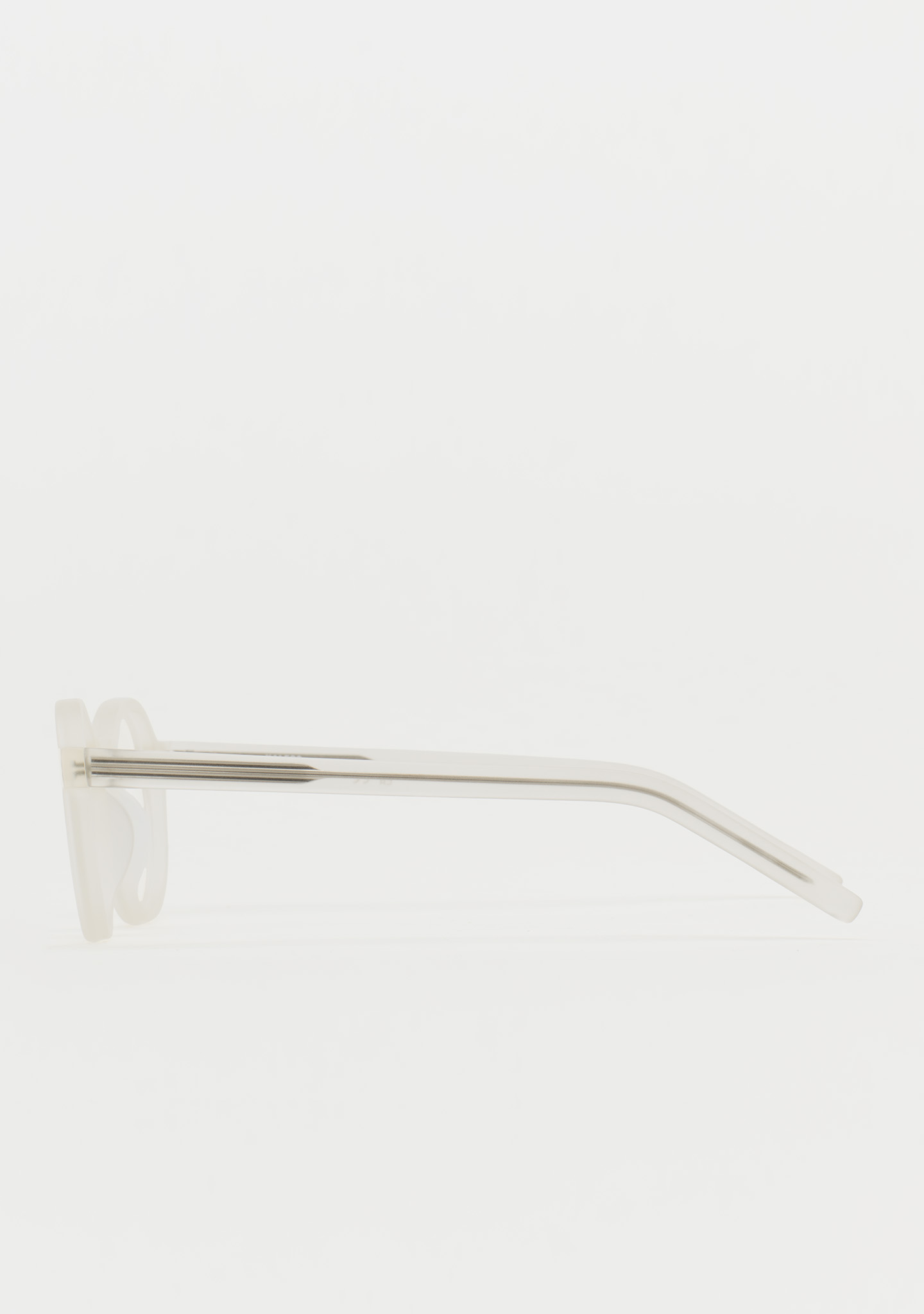 Runde Korrekturbrille. Eine Silhouette mit eigenständigem Stil. Front und Bügel aus mattem transparentem Kristall-Acetat. Integrierte Acetat-Nasenpads. Handgefertigt.