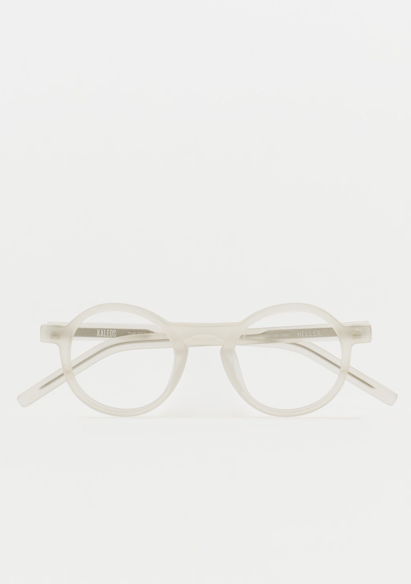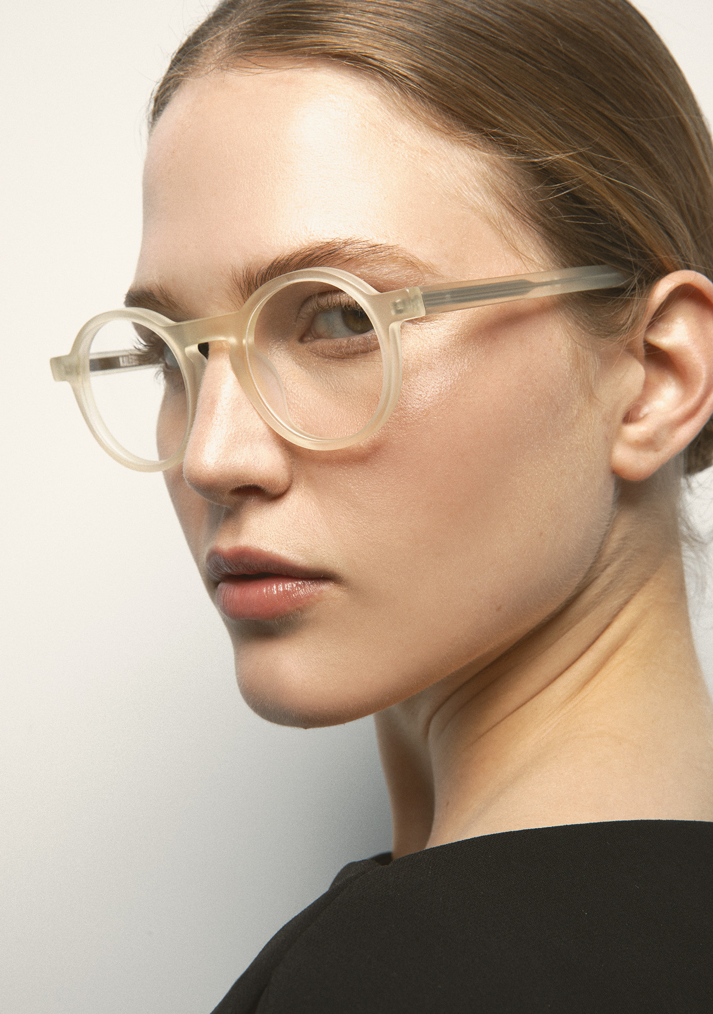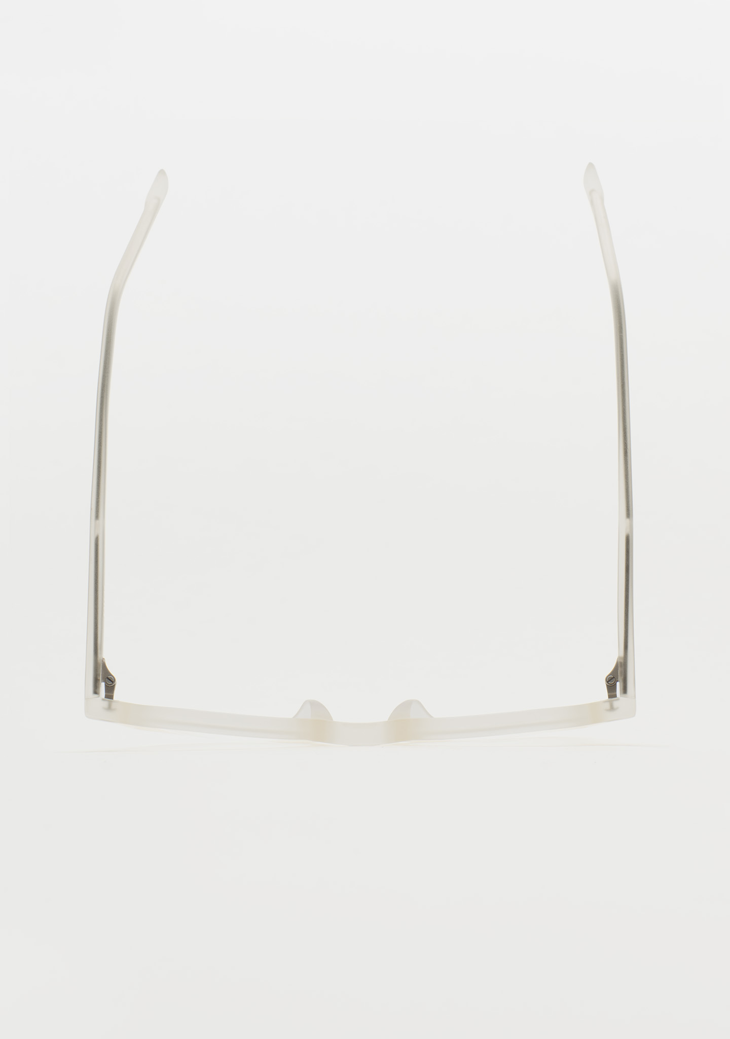 Runde Korrekturbrille. Eine Silhouette mit eigenständigem Stil. Front und Bügel aus mattem transparentem Kristall-Acetat. Integrierte Acetat-Nasenpads. Handgefertigt.