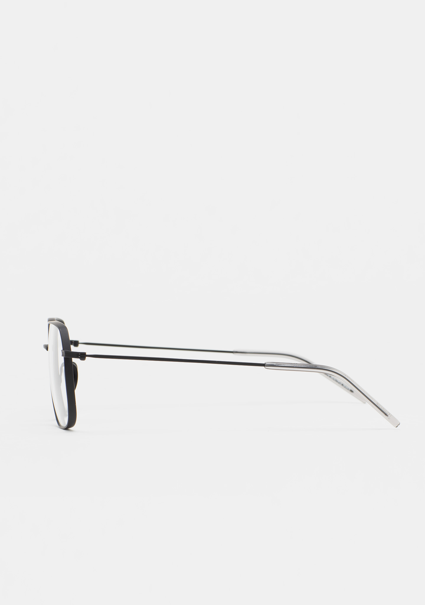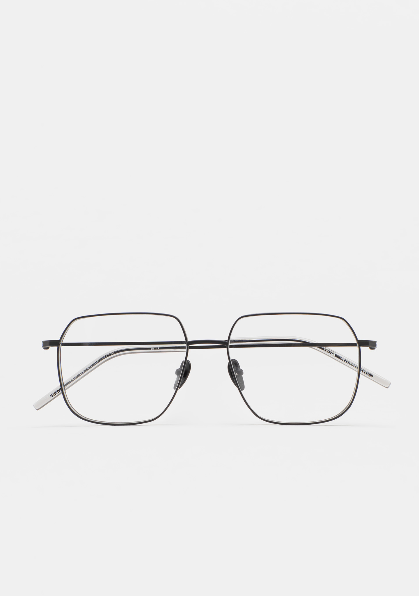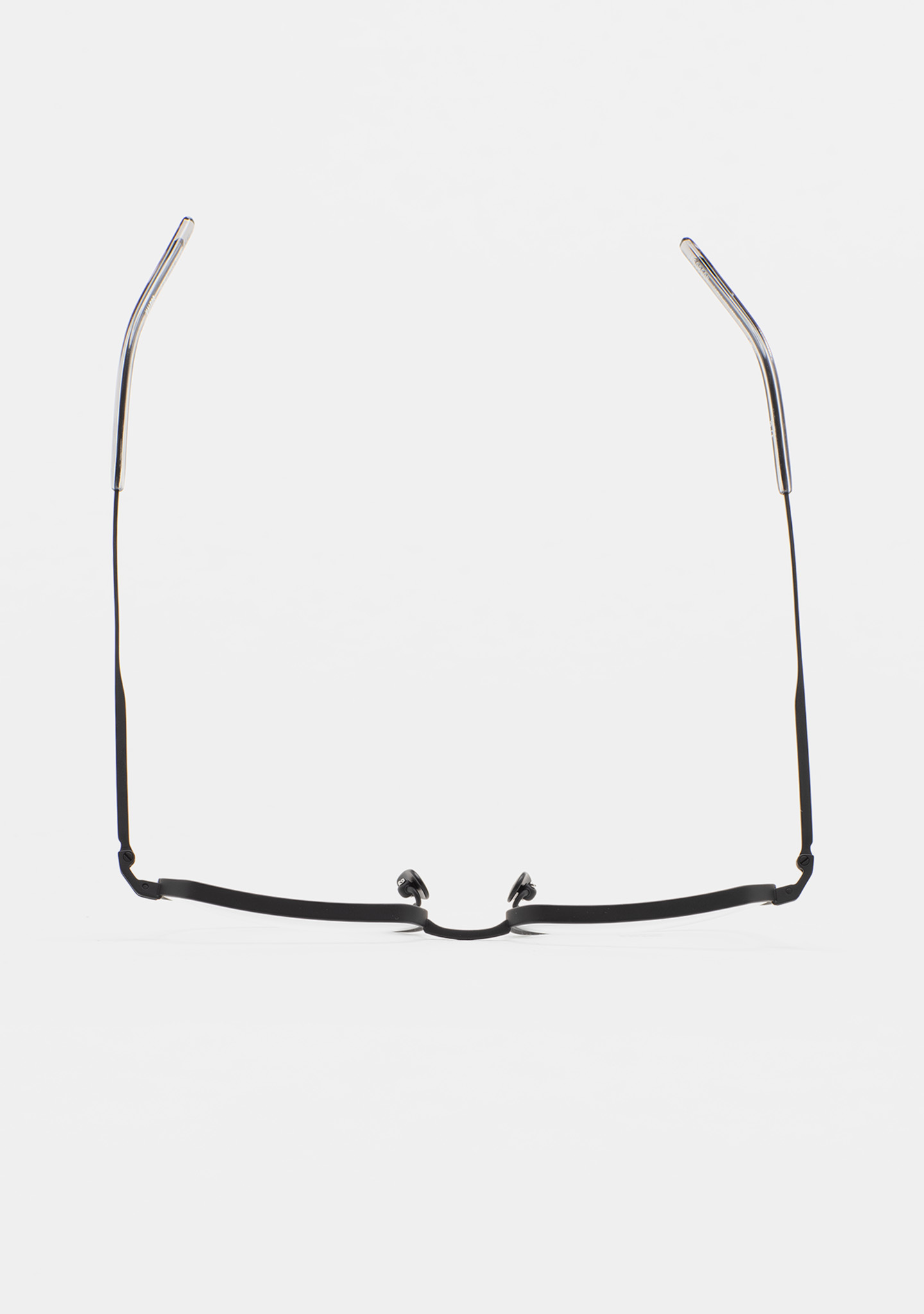 Sehhilfe in quadratischer Form. Front und Bügel aus mattem schwarzem Titan. Bügel mit Endstück aus transparent grauem Acetat. Integrierte Acetat-Nasenpads. Handgefertigt.