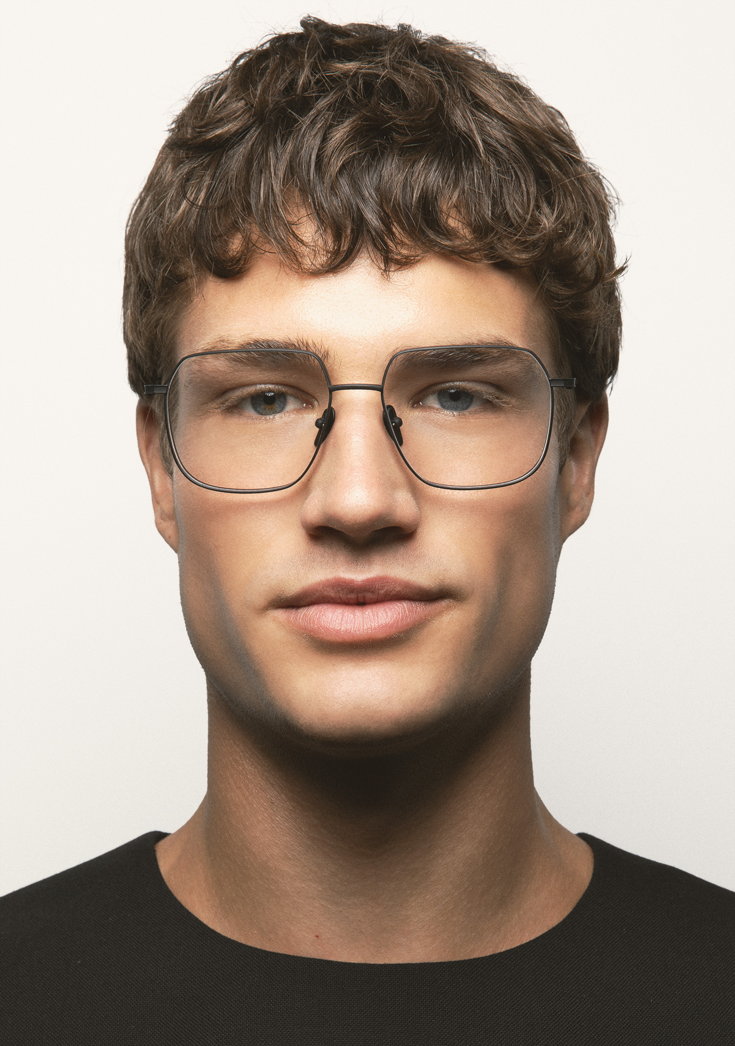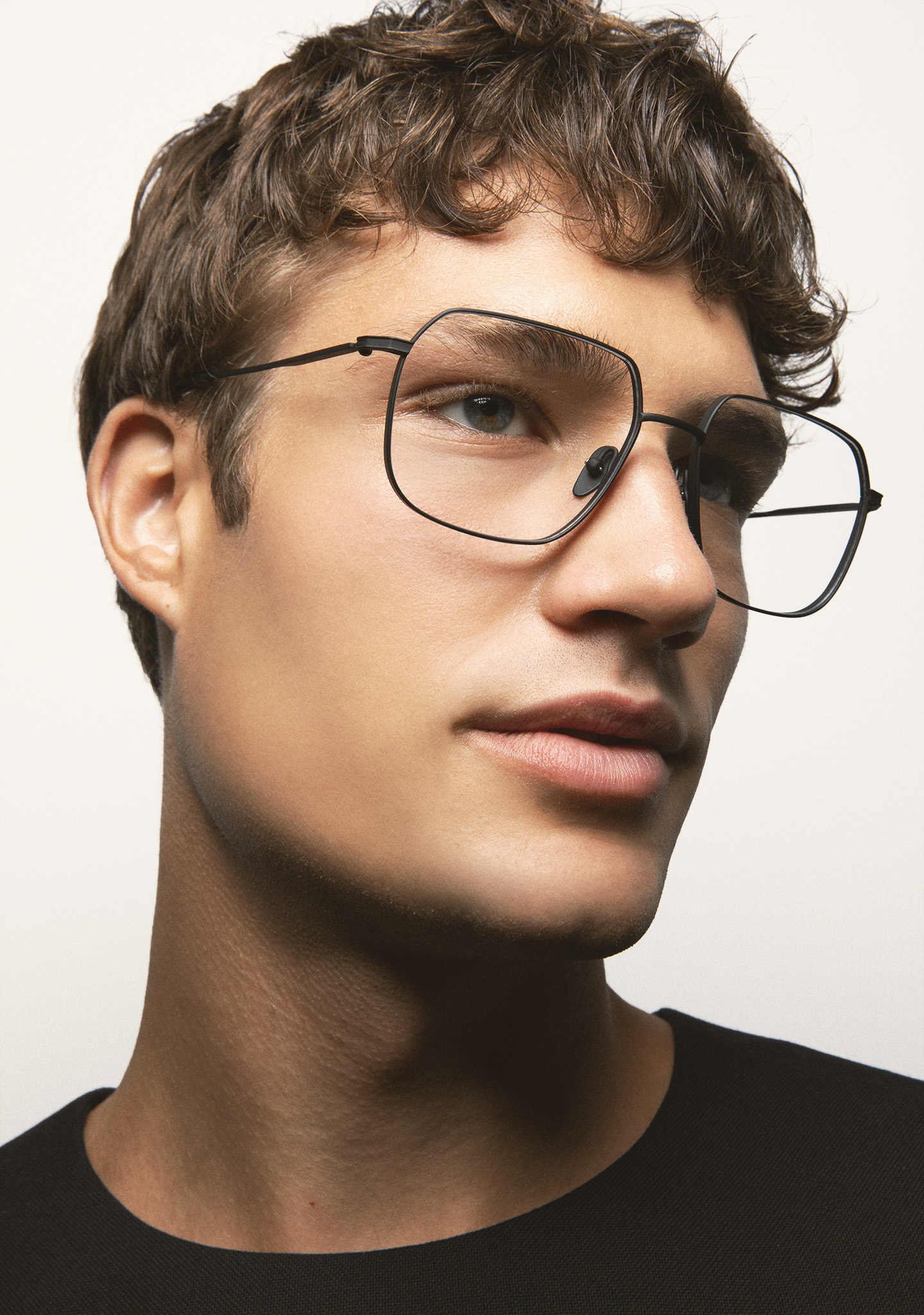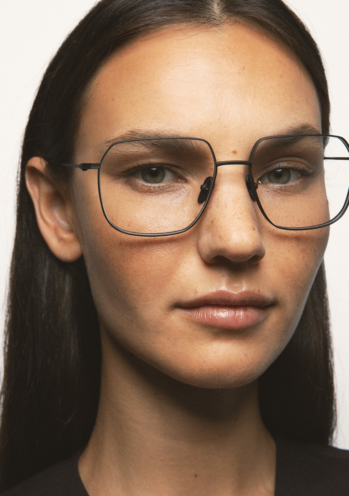 Sehhilfe in quadratischer Form. Front und Bügel aus mattem schwarzem Titan. Bügel mit Endstück aus transparent grauem Acetat. Integrierte Acetat-Nasenpads. Handgefertigt.