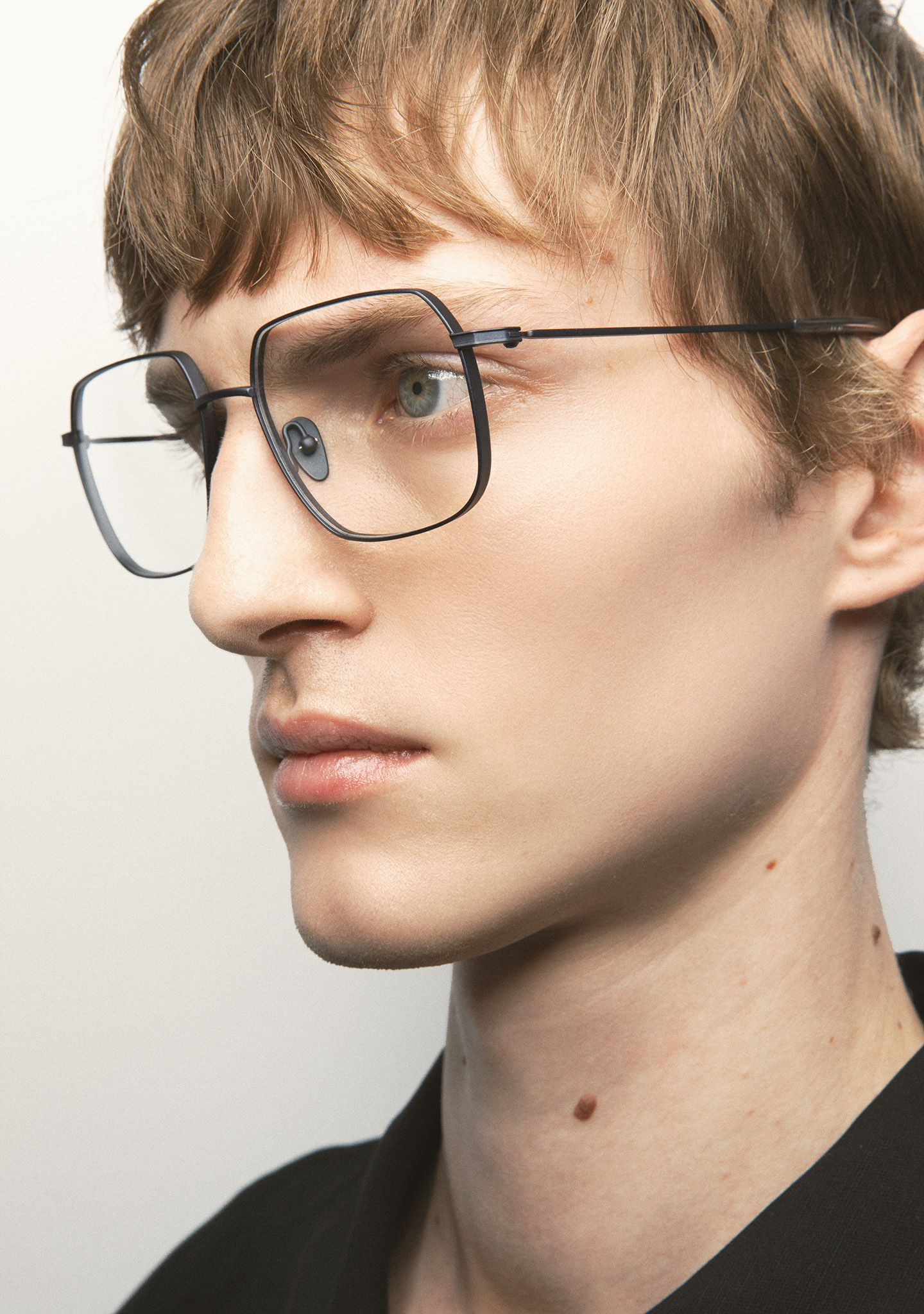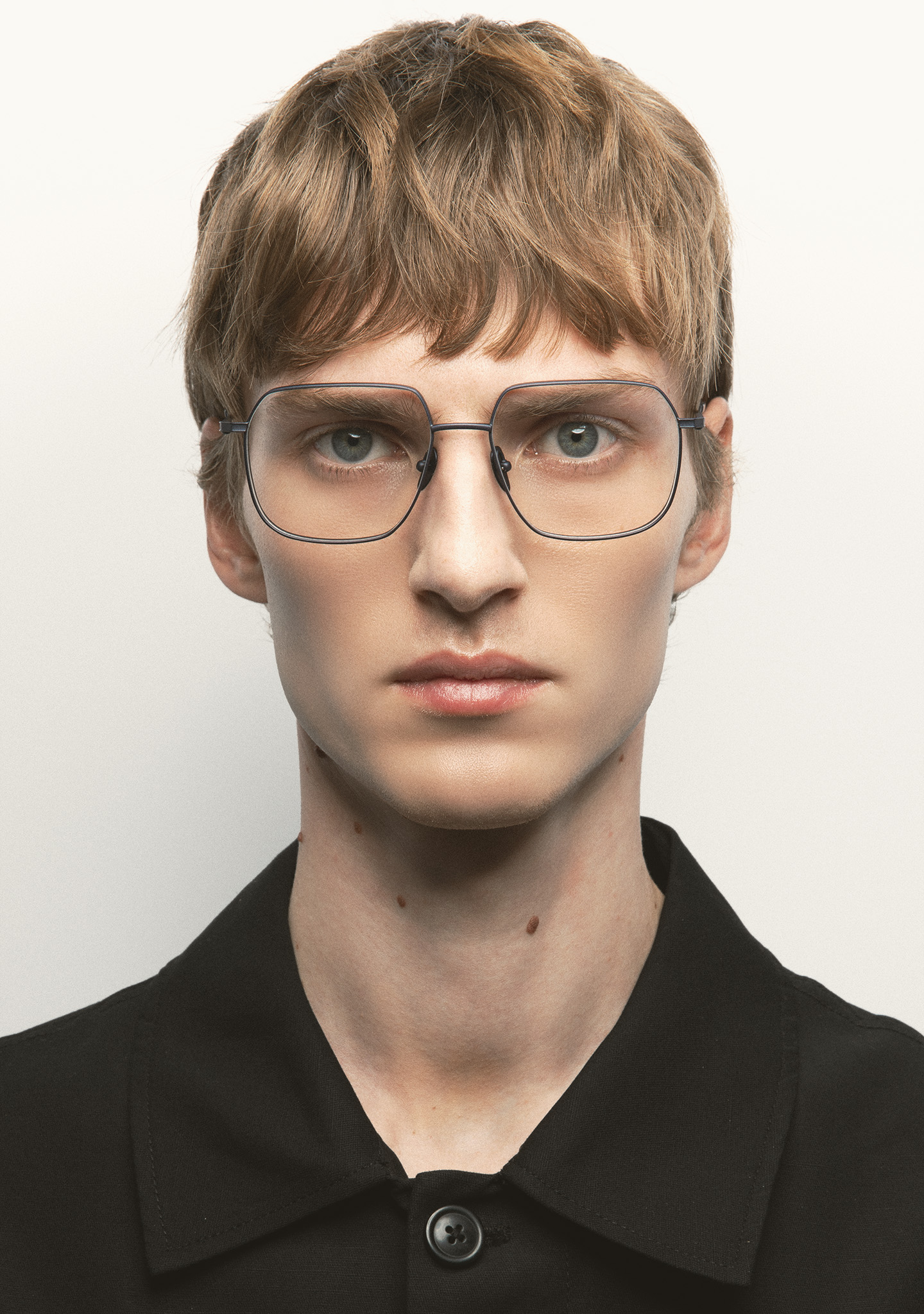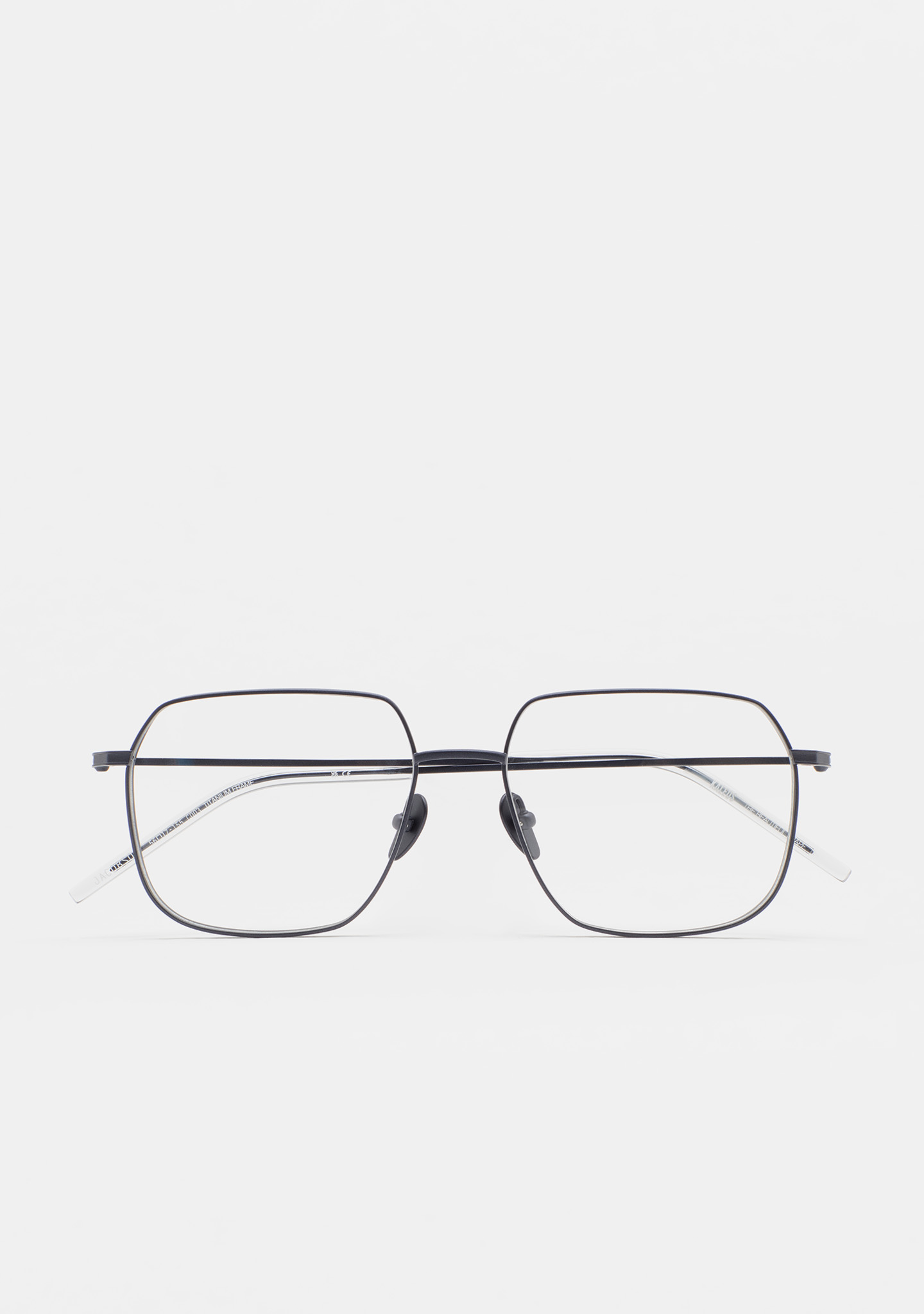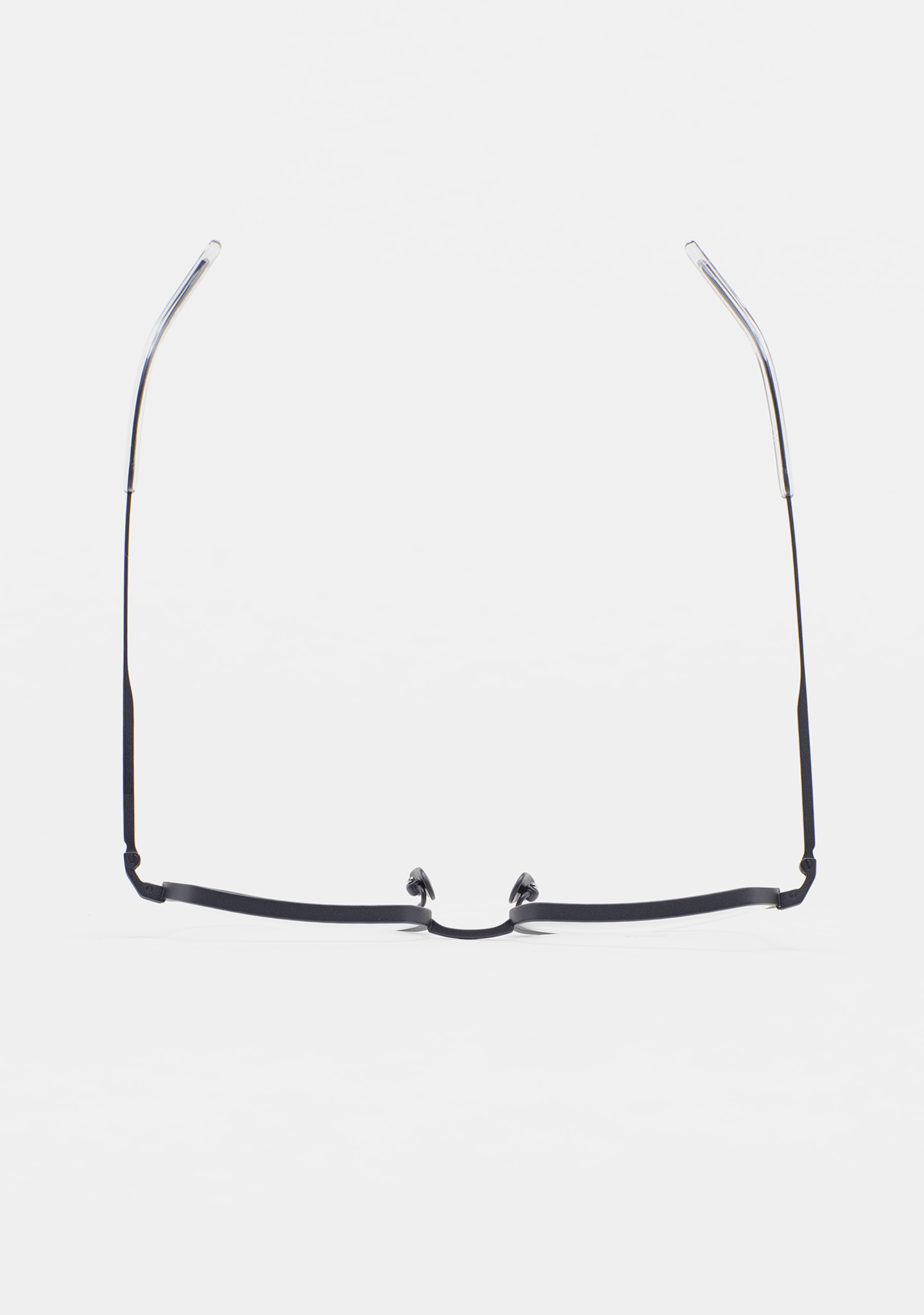 Sehhilfe in quadratischer Form. Front und Bügel aus blauem Titan. Bügel mit Endstück aus transparent hellgrauem Acetat. Integrierte Acetat-Nasenpads. Handgefertigt.