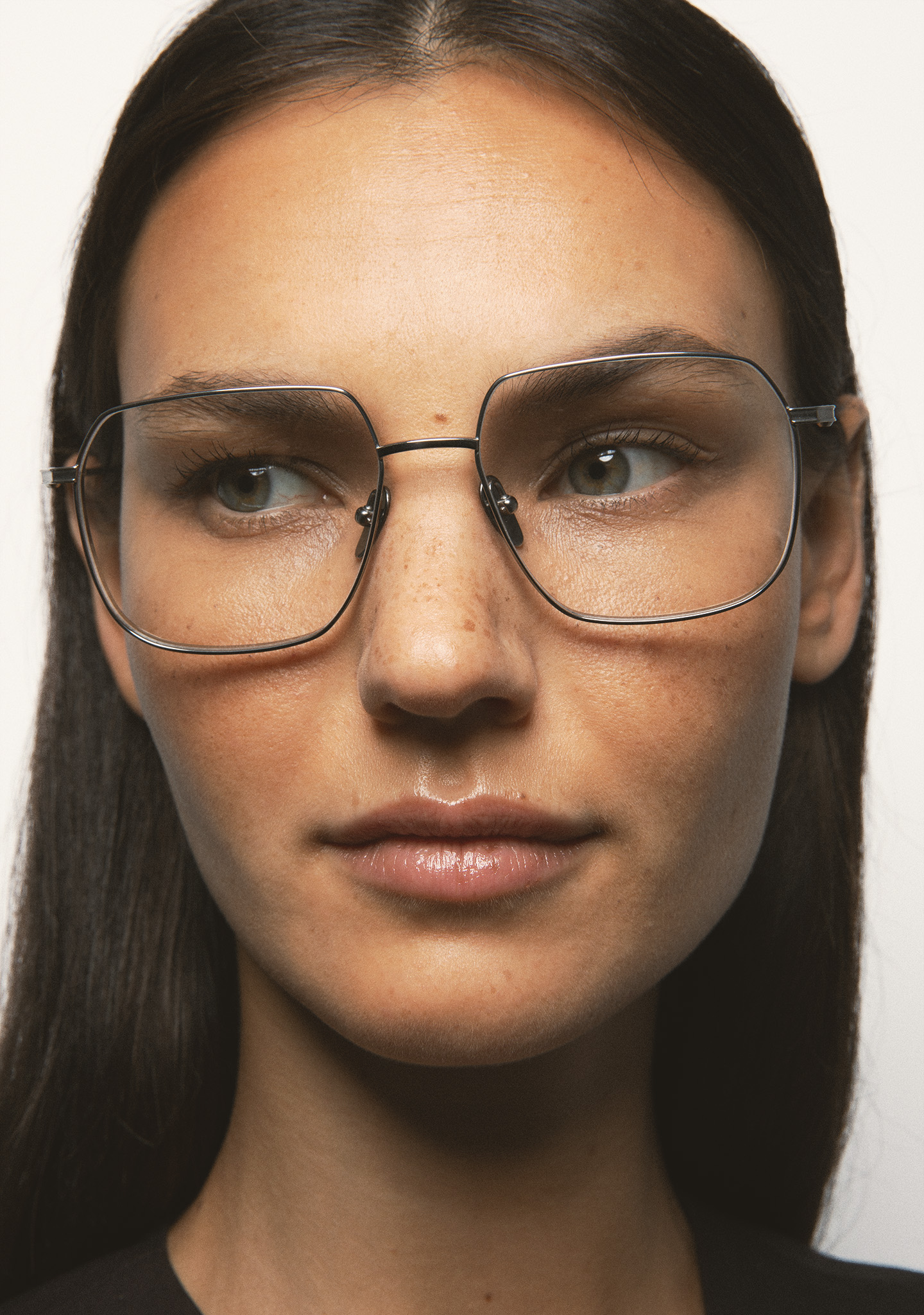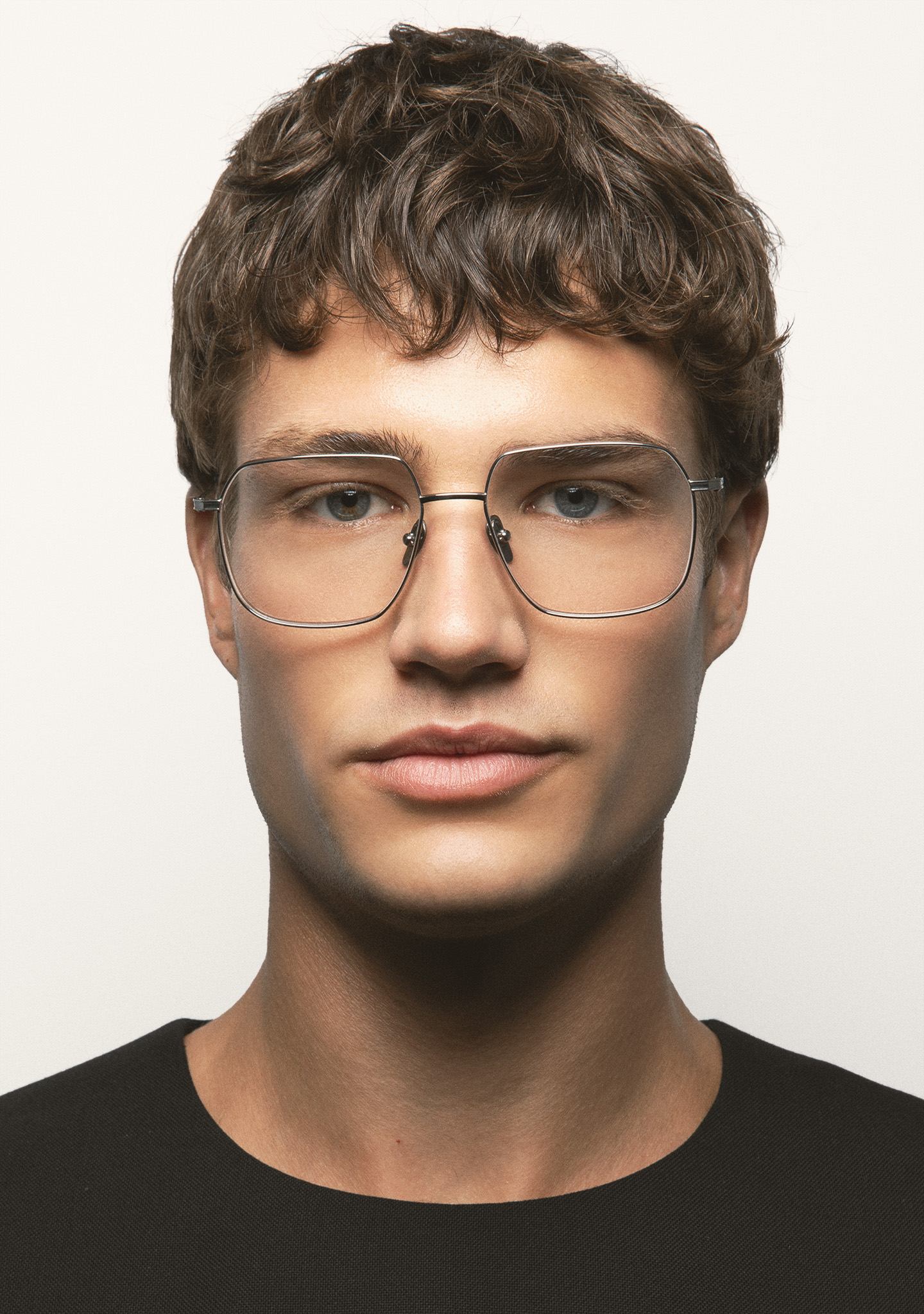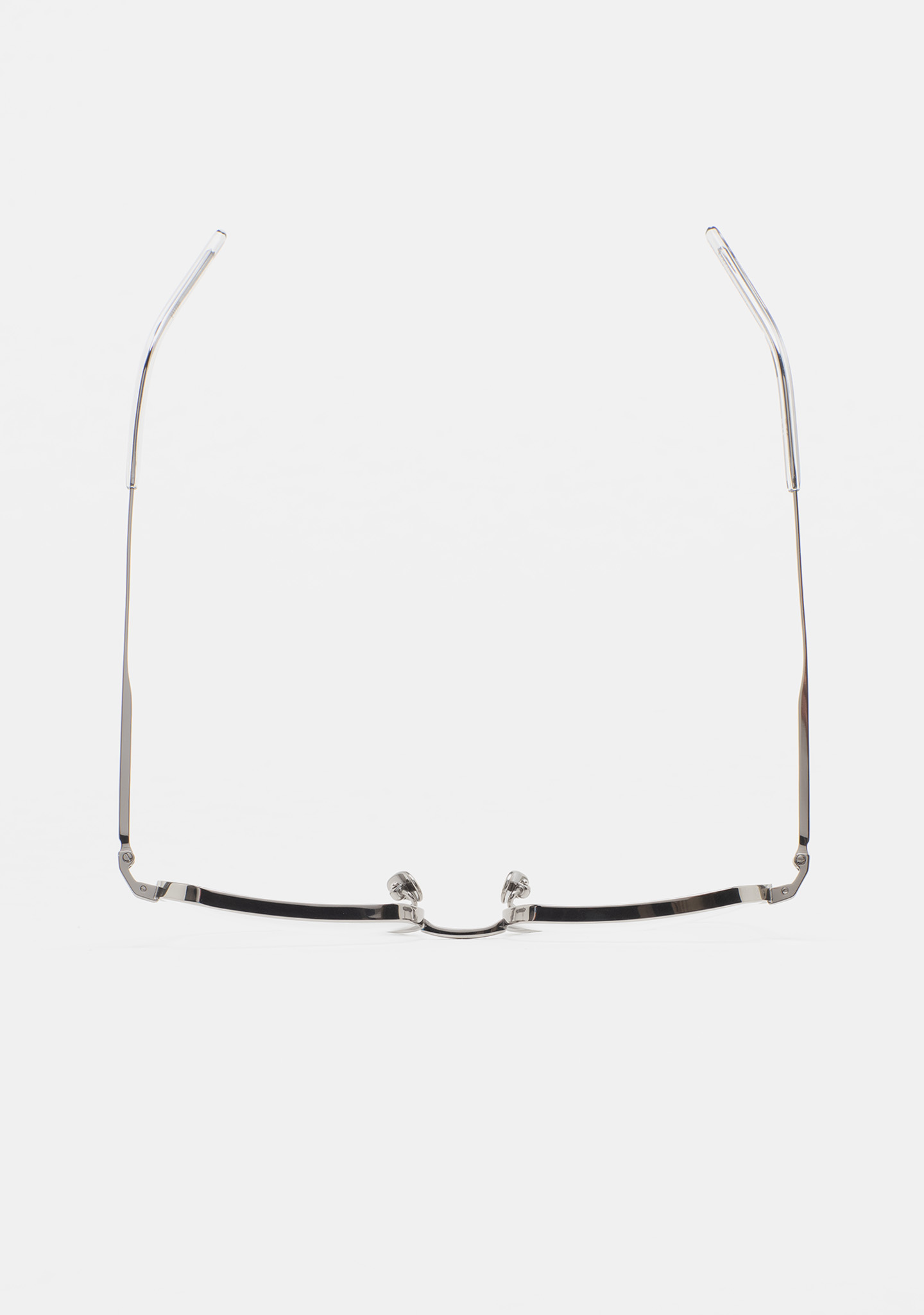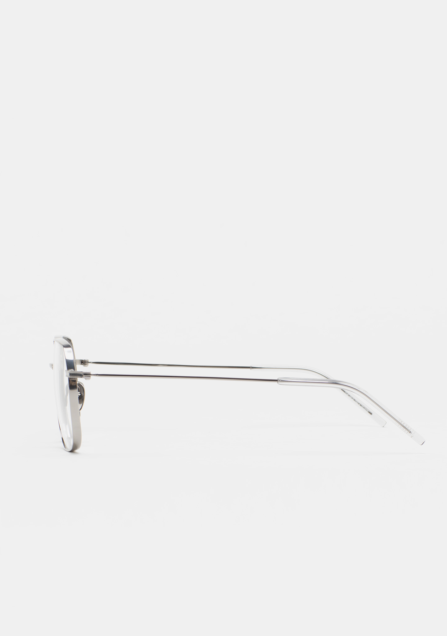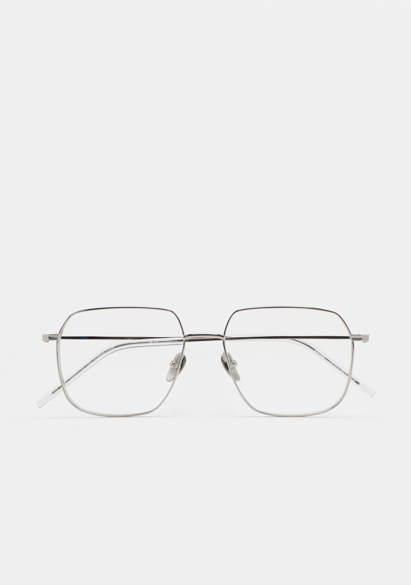 Sehhilfe in quadratischer Form. Front und Bügel aus silbernem Titan. Bügel mit Endstück aus transparent grauem Acetat. Integrierte Acetat-Nasenpads. Handgefertigt.