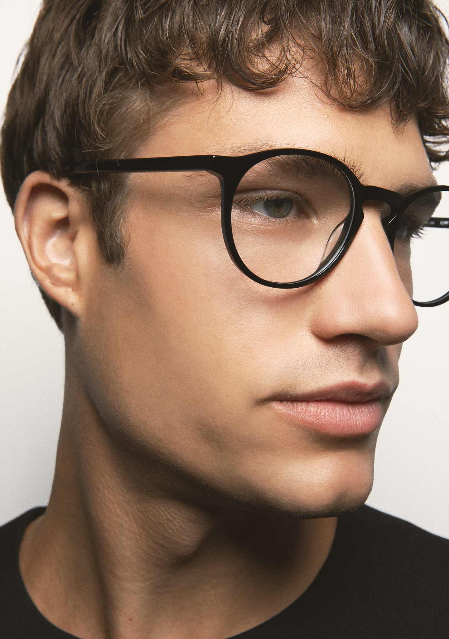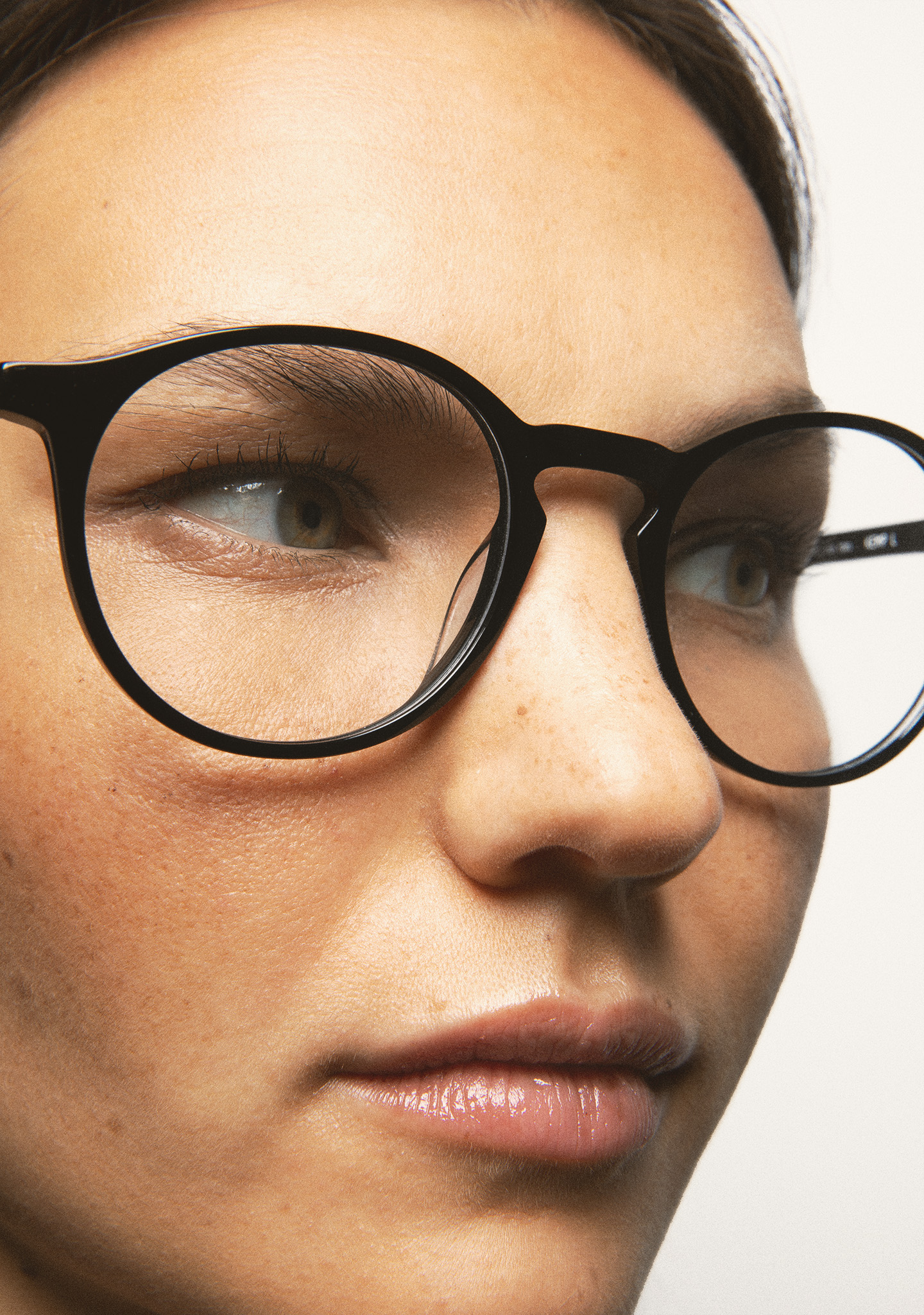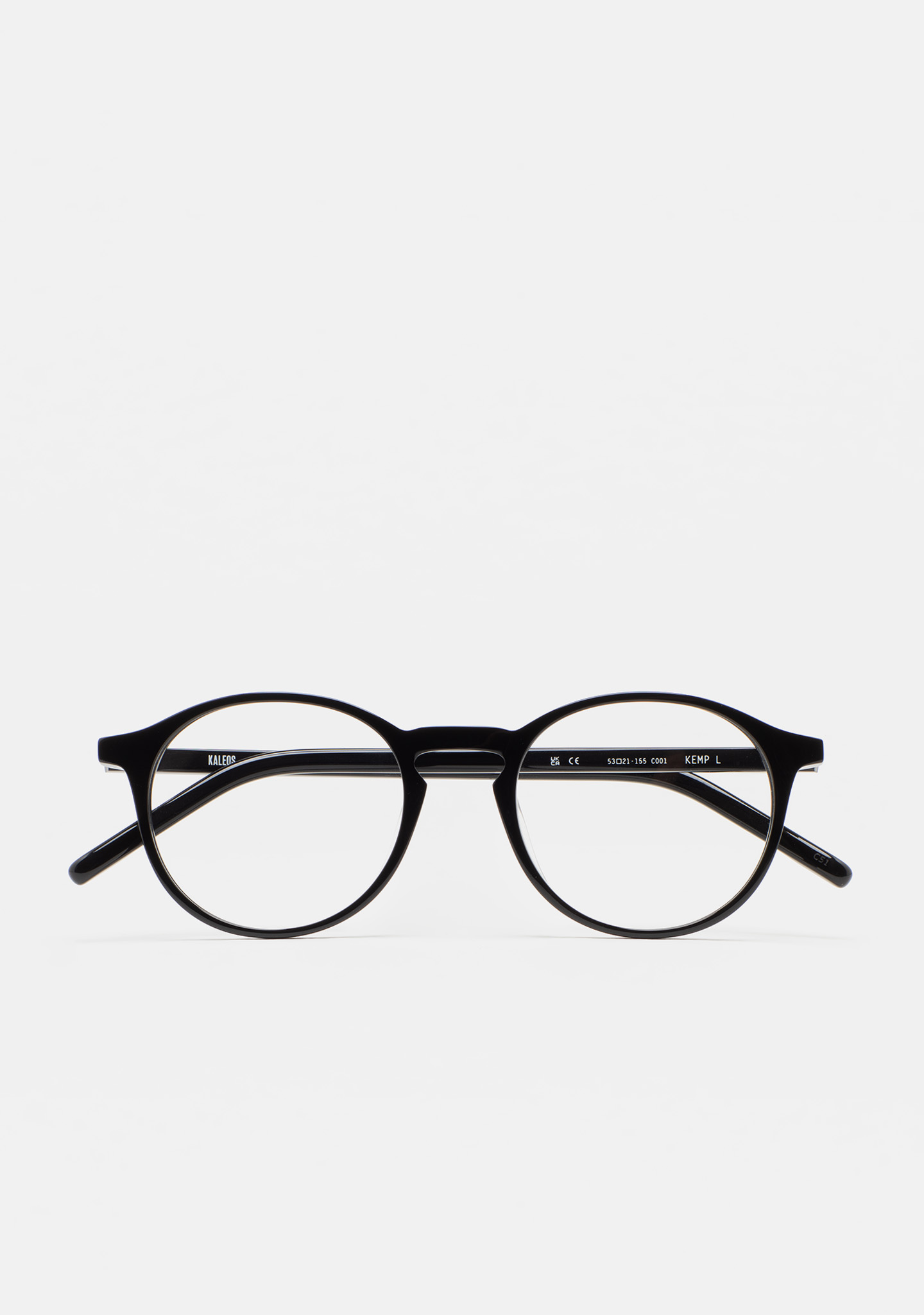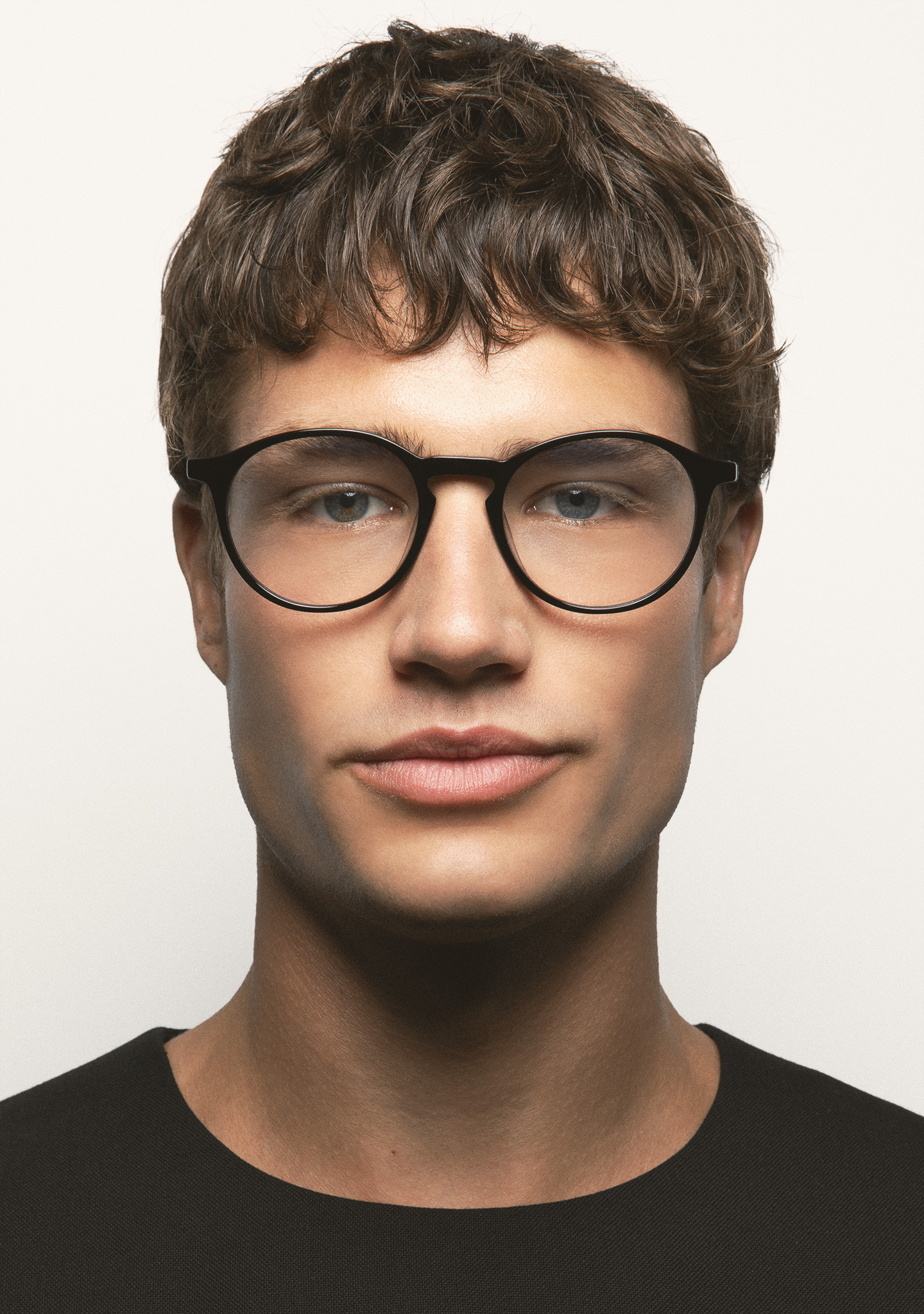 Sehhilfe in Pantos-Form. Front und Bügel aus schwarzem High-Density-Acetat. Integrierte Acetat-Nasenpads. Handgefertigt. Erhältlich in zwei Größen: Medium (M) und Large (L).