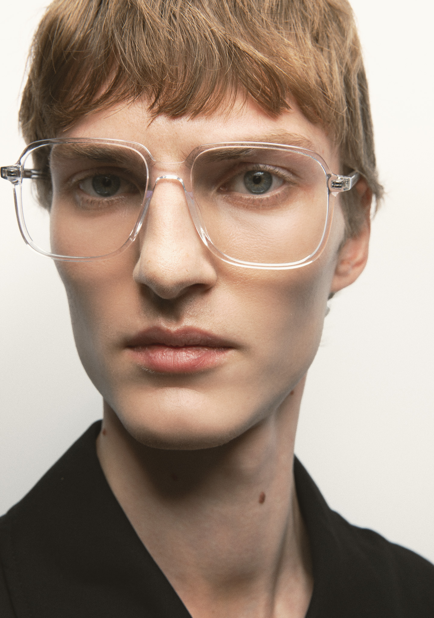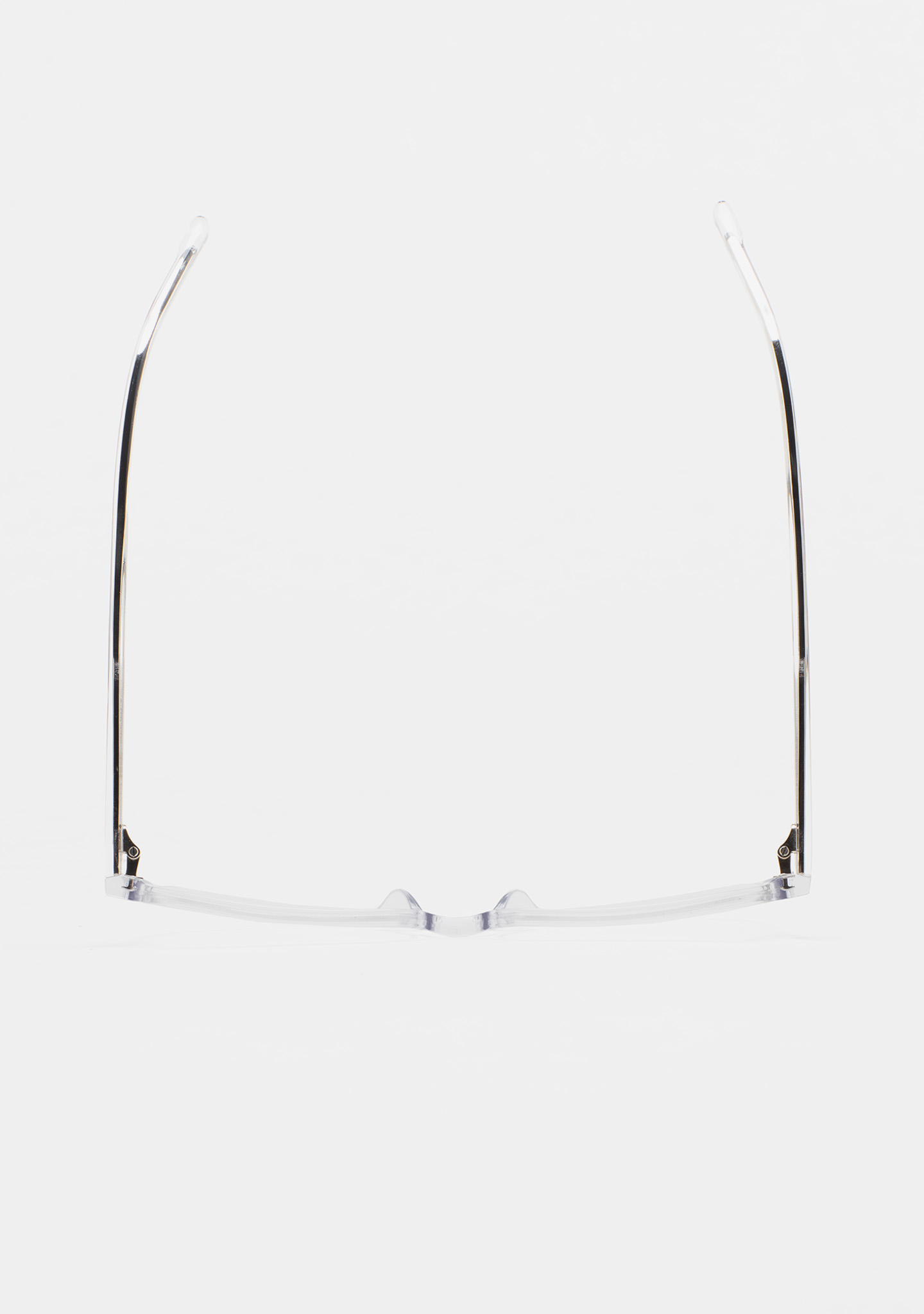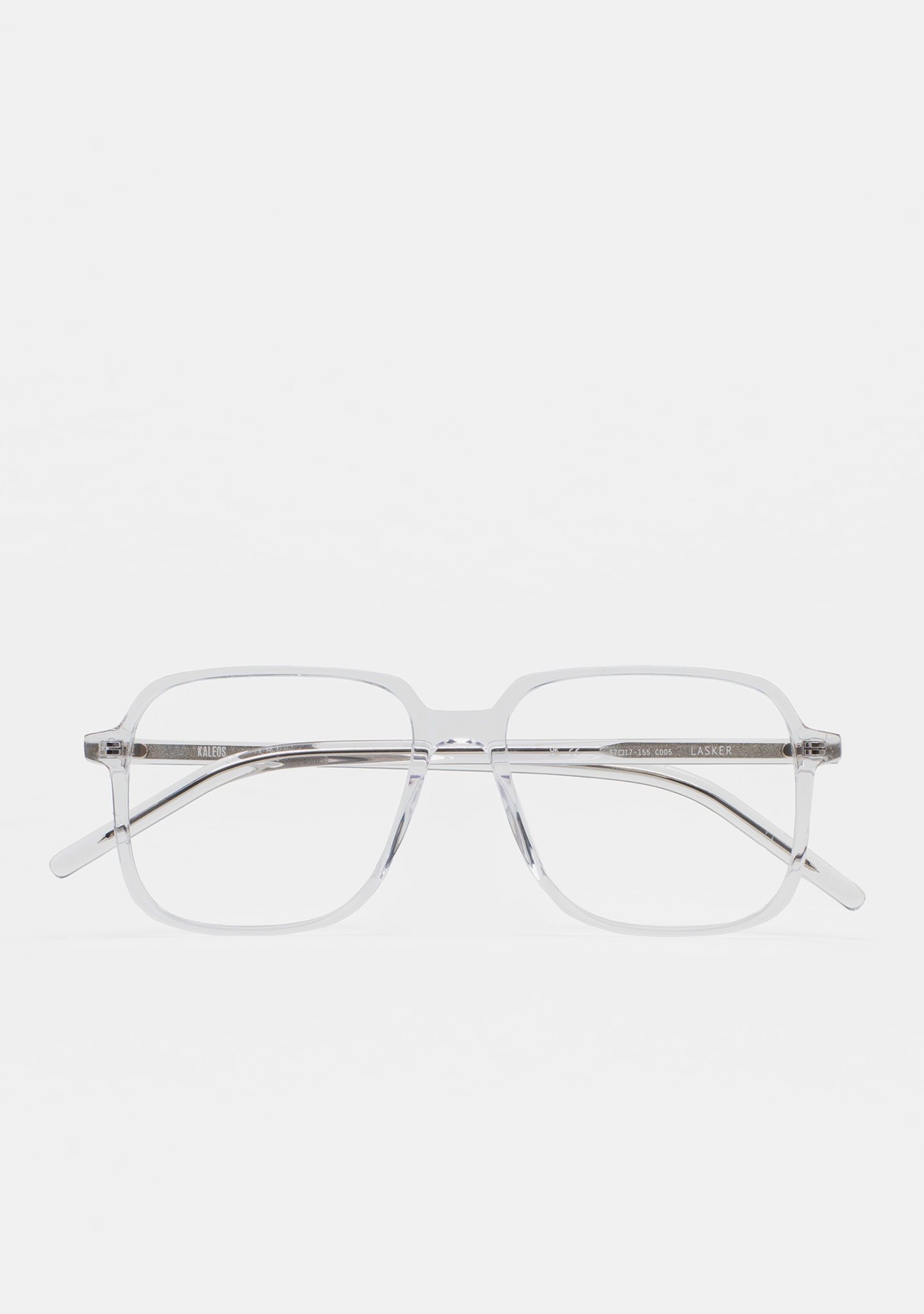 Sehhilfe in quadratischer Form. Front und Bügel aus transparentem High-Density-Acetat. Integrierte Acetat-Nasenpads. Handgefertigt.