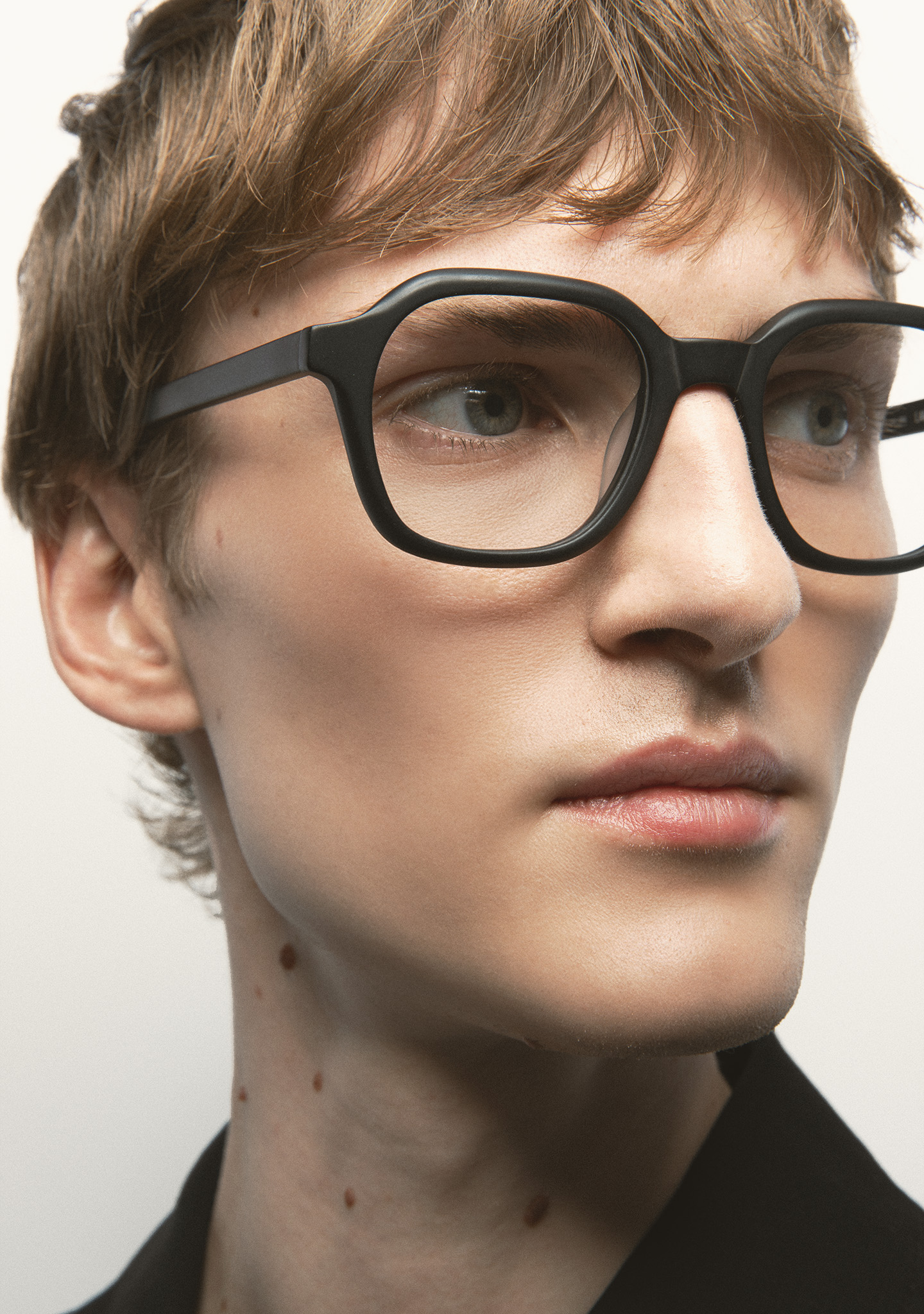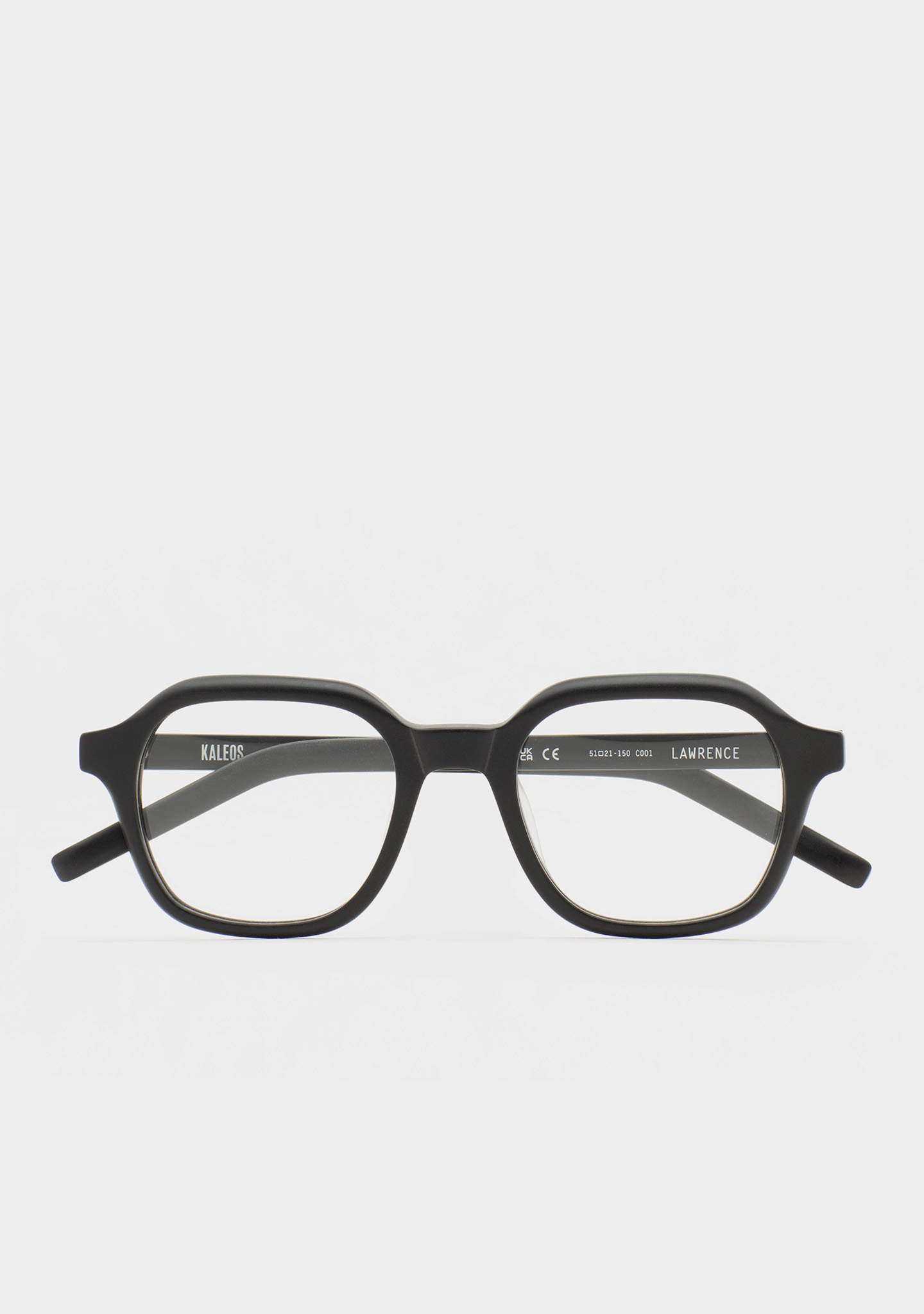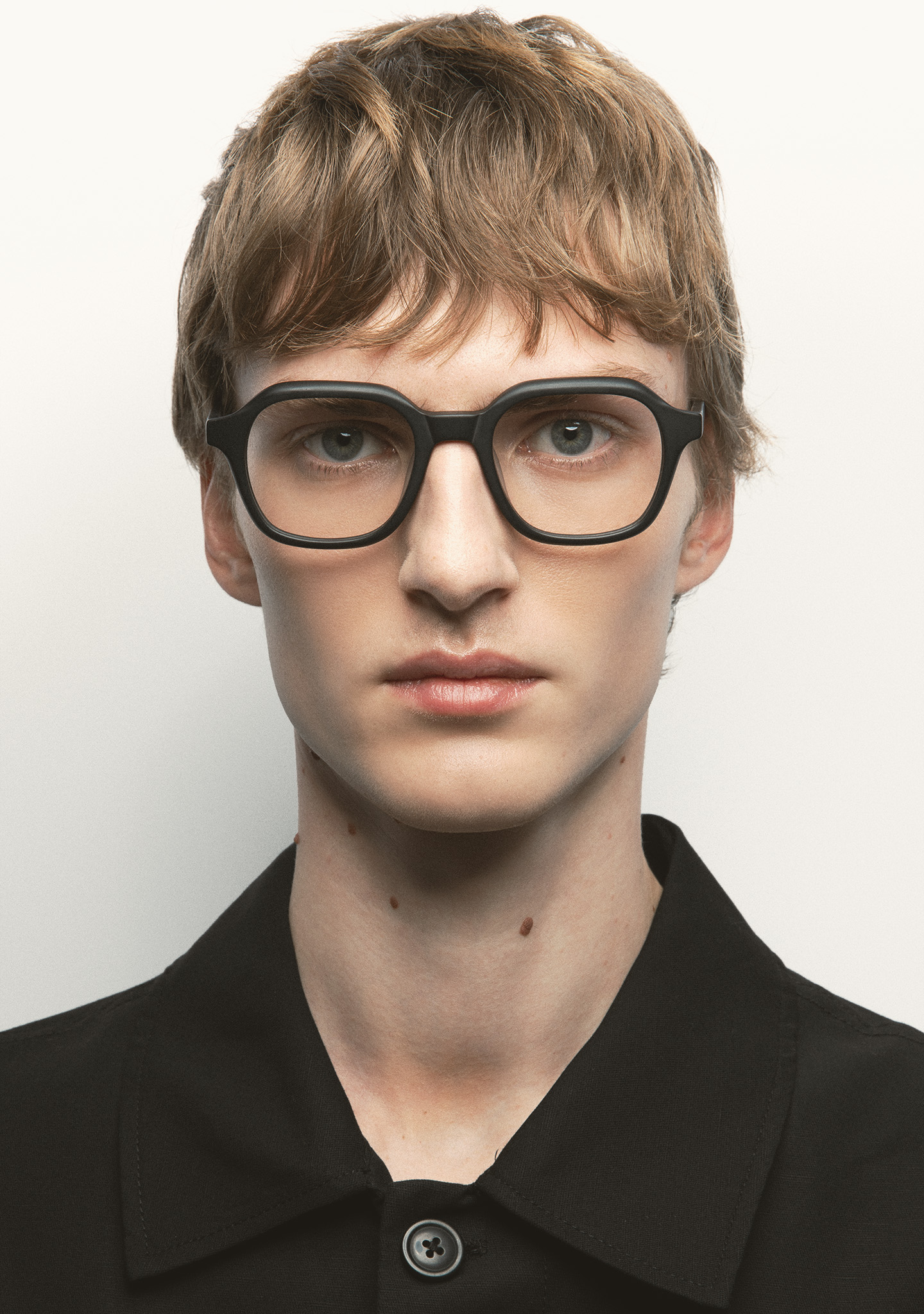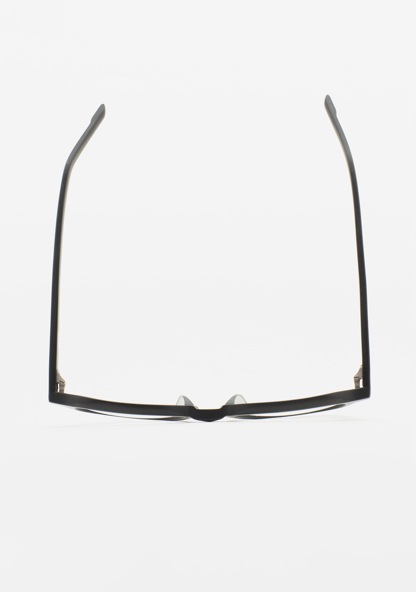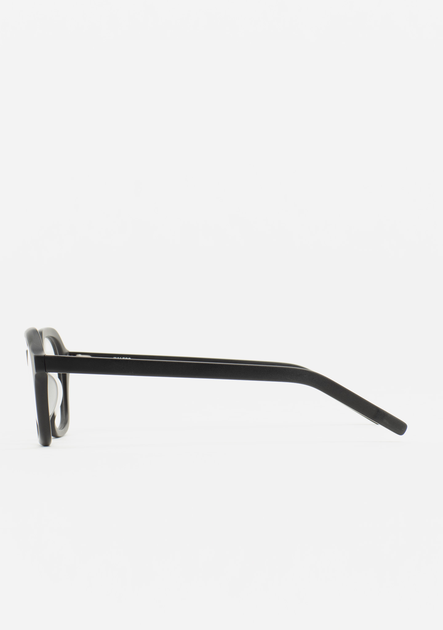 Quadratische Korrekturbrille. Minimalismus mit eigenständigem Charakter. Front und Bügel aus mattschwarzem Acetat. Integrierte Acetat-Nasenpads. Handgefertigt.