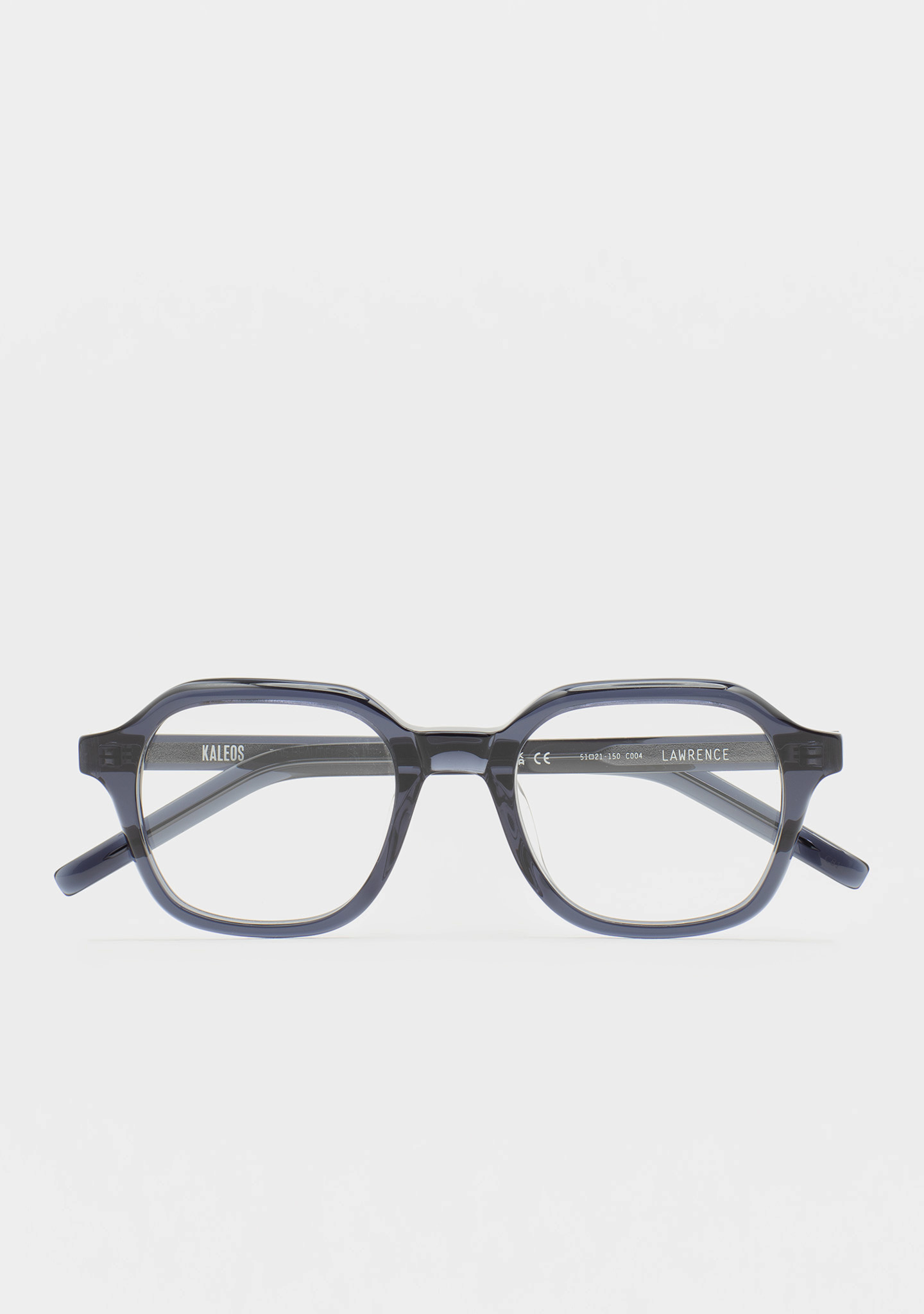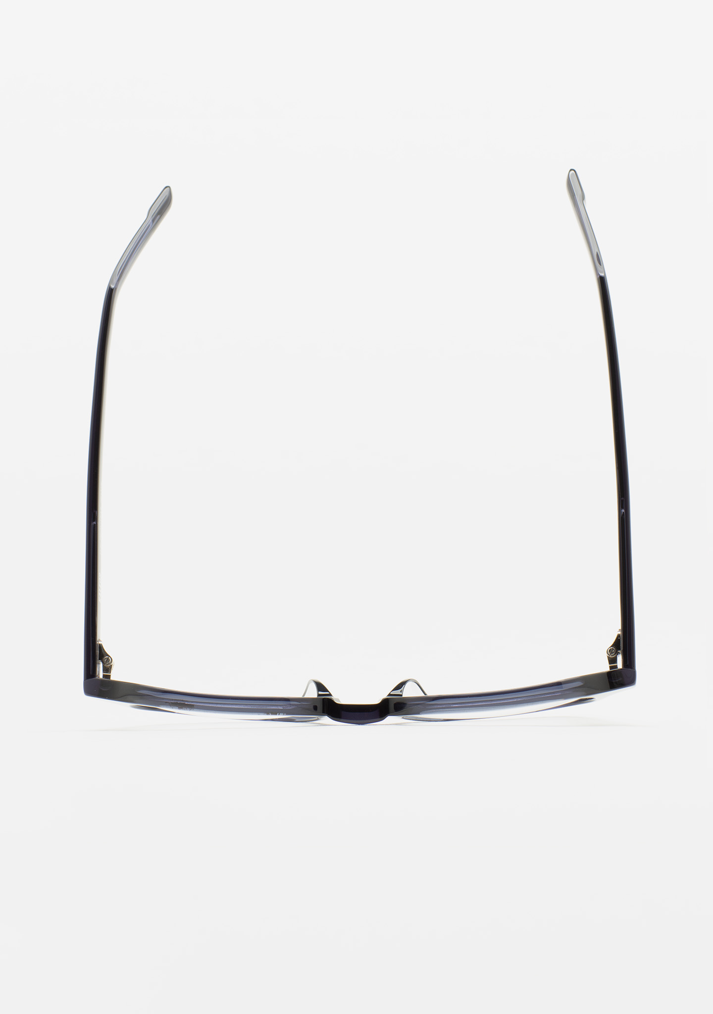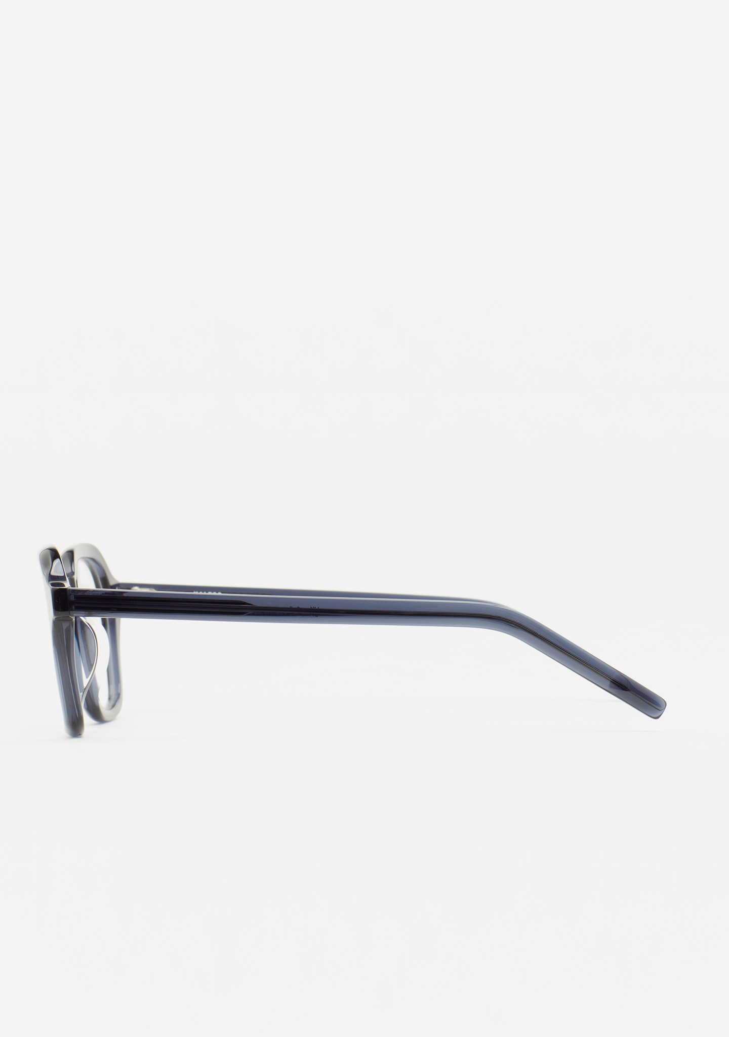 Quadratische Korrekturbrille. Minimalismus mit eigenständigem Charakter. Front und Bügel aus blaugrauem transparentem Acetat. Integrierte Acetat-Nasenpads. Handgefertigt.
