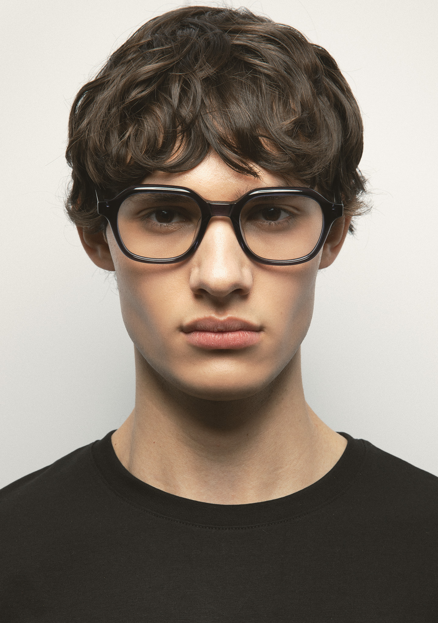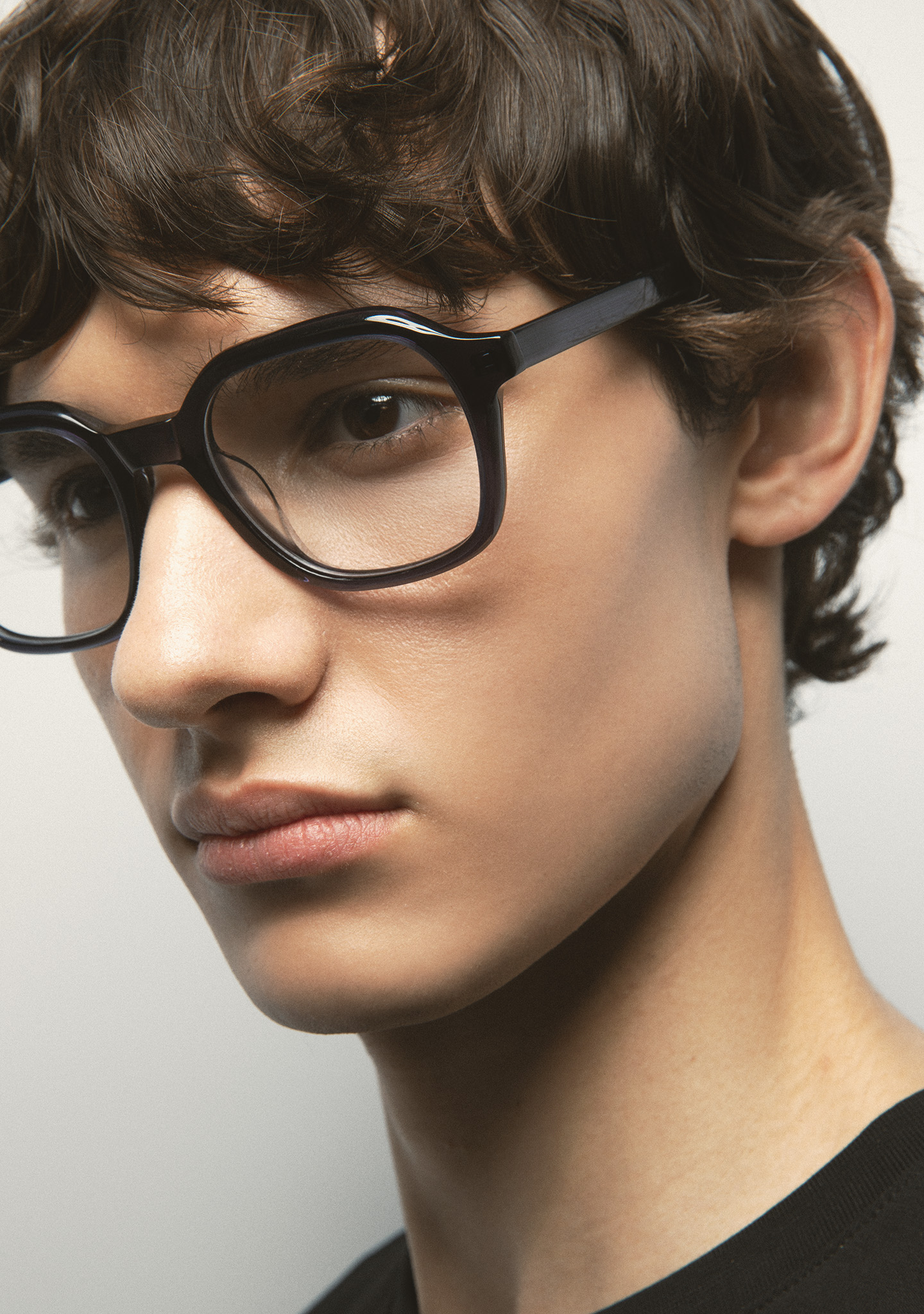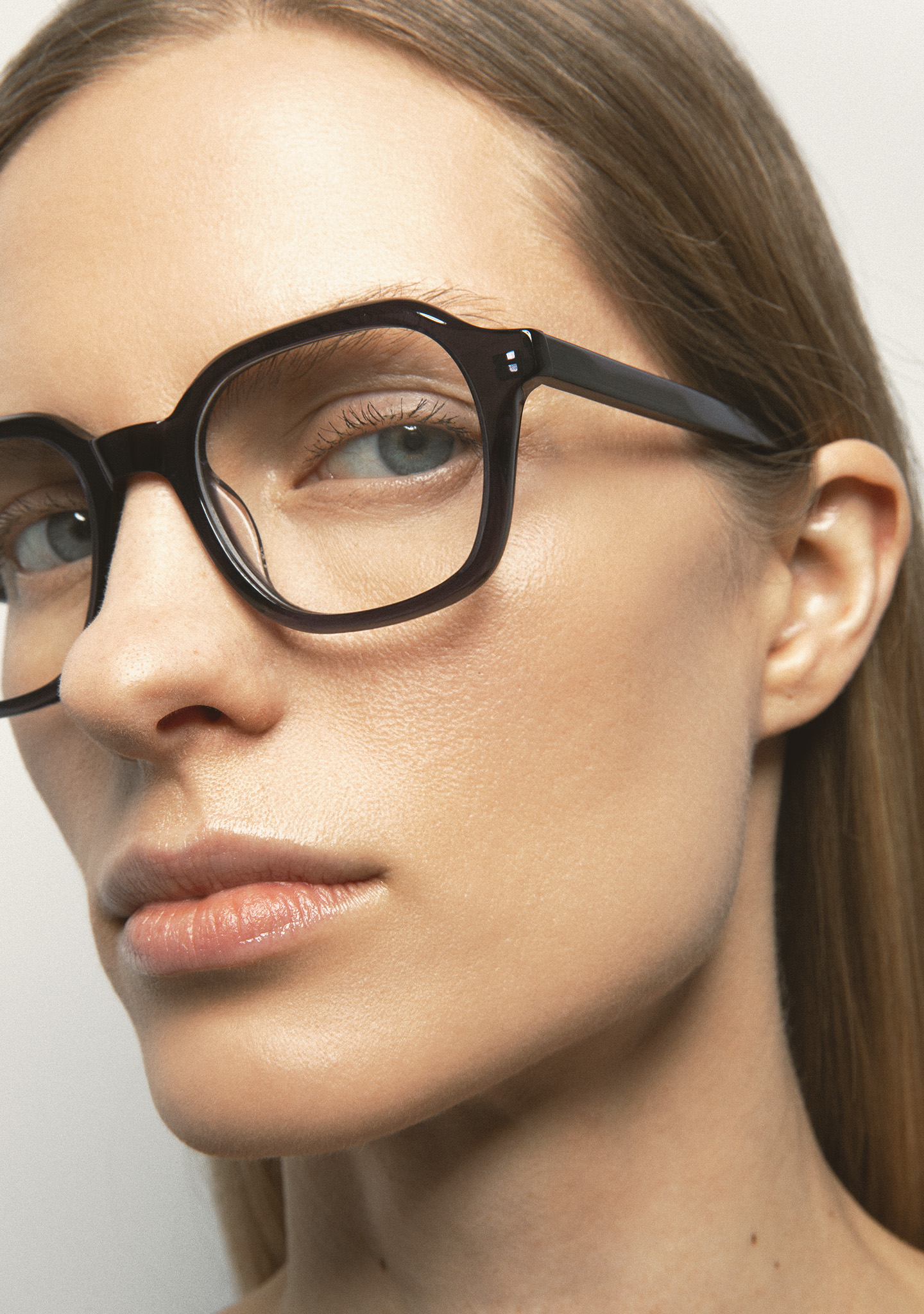 Quadratische Korrekturbrille. Minimalismus mit eigenständigem Charakter. Front und Bügel aus blaugrauem transparentem Acetat. Integrierte Acetat-Nasenpads. Handgefertigt.