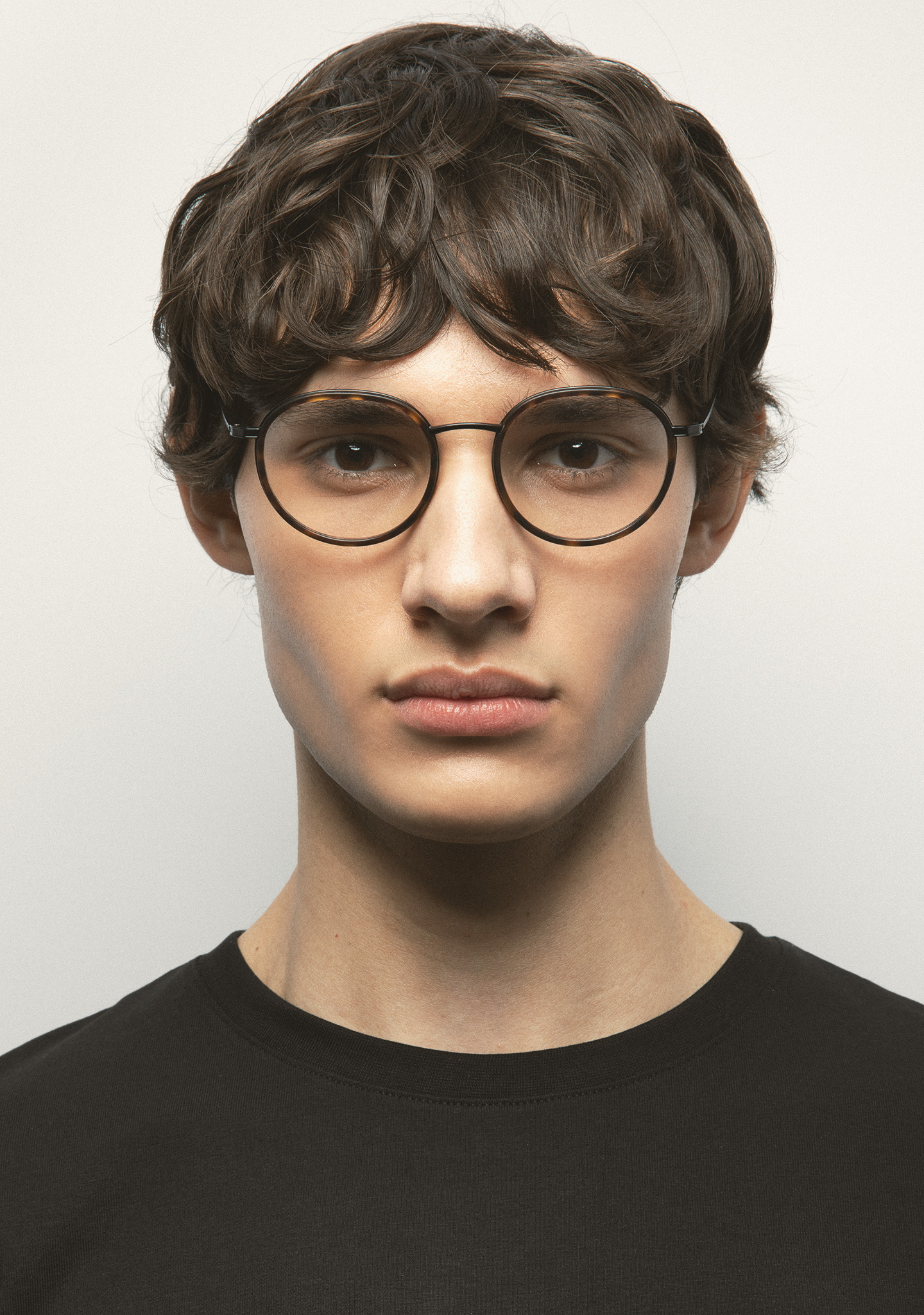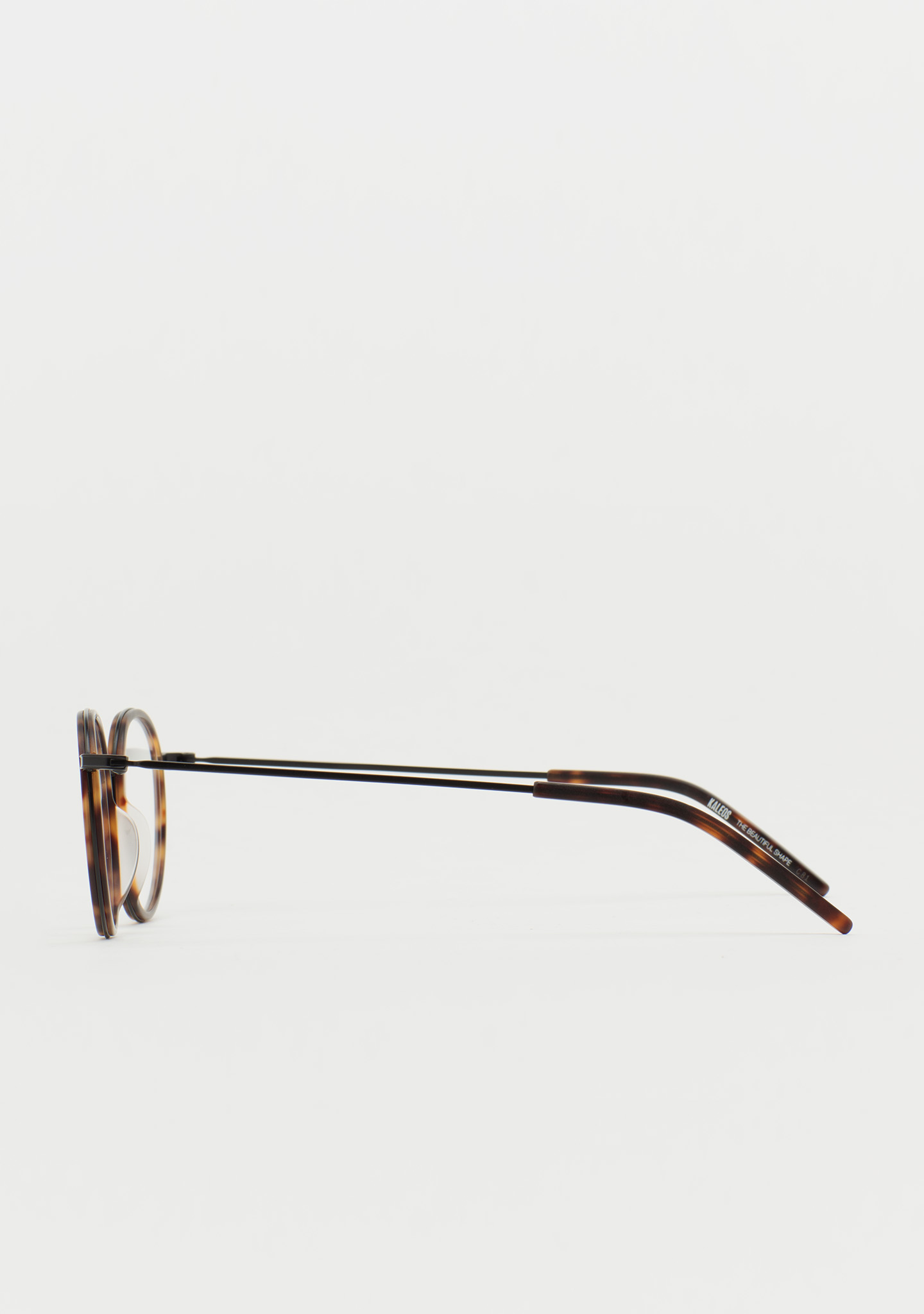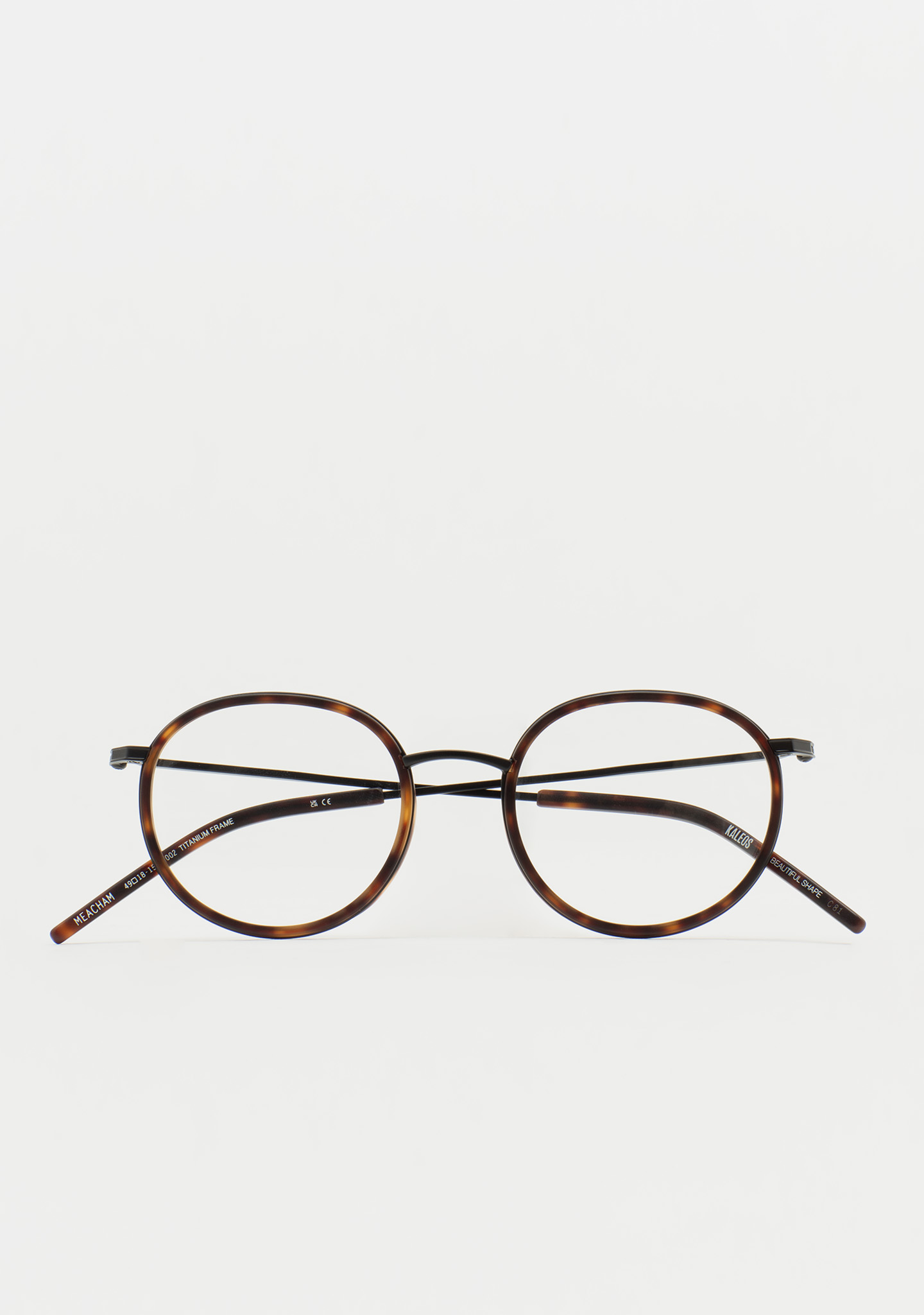 Runde Korrekturbrille. Ein Design, das für Langlebigkeit und Charakter steht. Titanfront mit mattem dunkelbraunem Havana-High-Density-Acetat-Rand. Steg und Bügel aus schwarzem Titan, Bügelenden aus mattem dunkelbraunem Havana-Acetat. Integrierte Acetat-Nasenpads. Handgefertigt.
