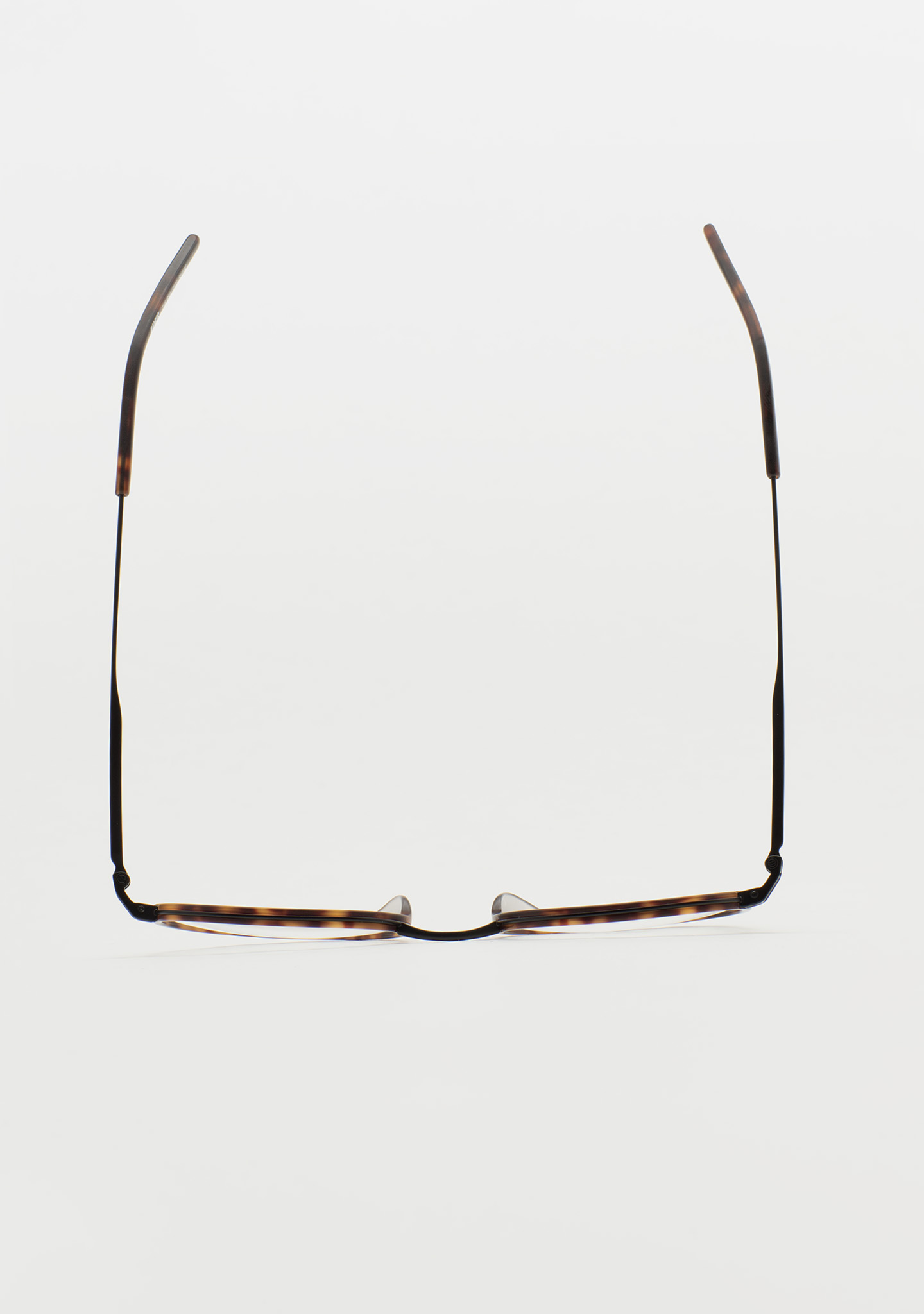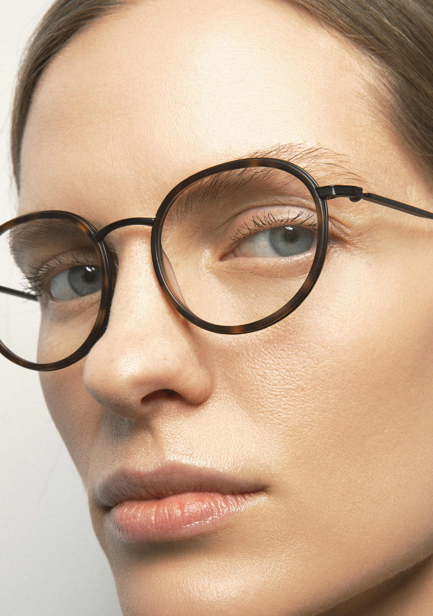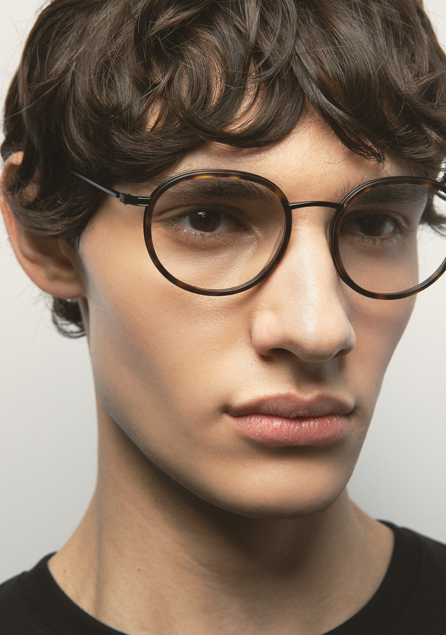 Runde Korrekturbrille. Ein Design, das für Langlebigkeit und Charakter steht. Titanfront mit mattem dunkelbraunem Havana-High-Density-Acetat-Rand. Steg und Bügel aus schwarzem Titan, Bügelenden aus mattem dunkelbraunem Havana-Acetat. Integrierte Acetat-Nasenpads. Handgefertigt.