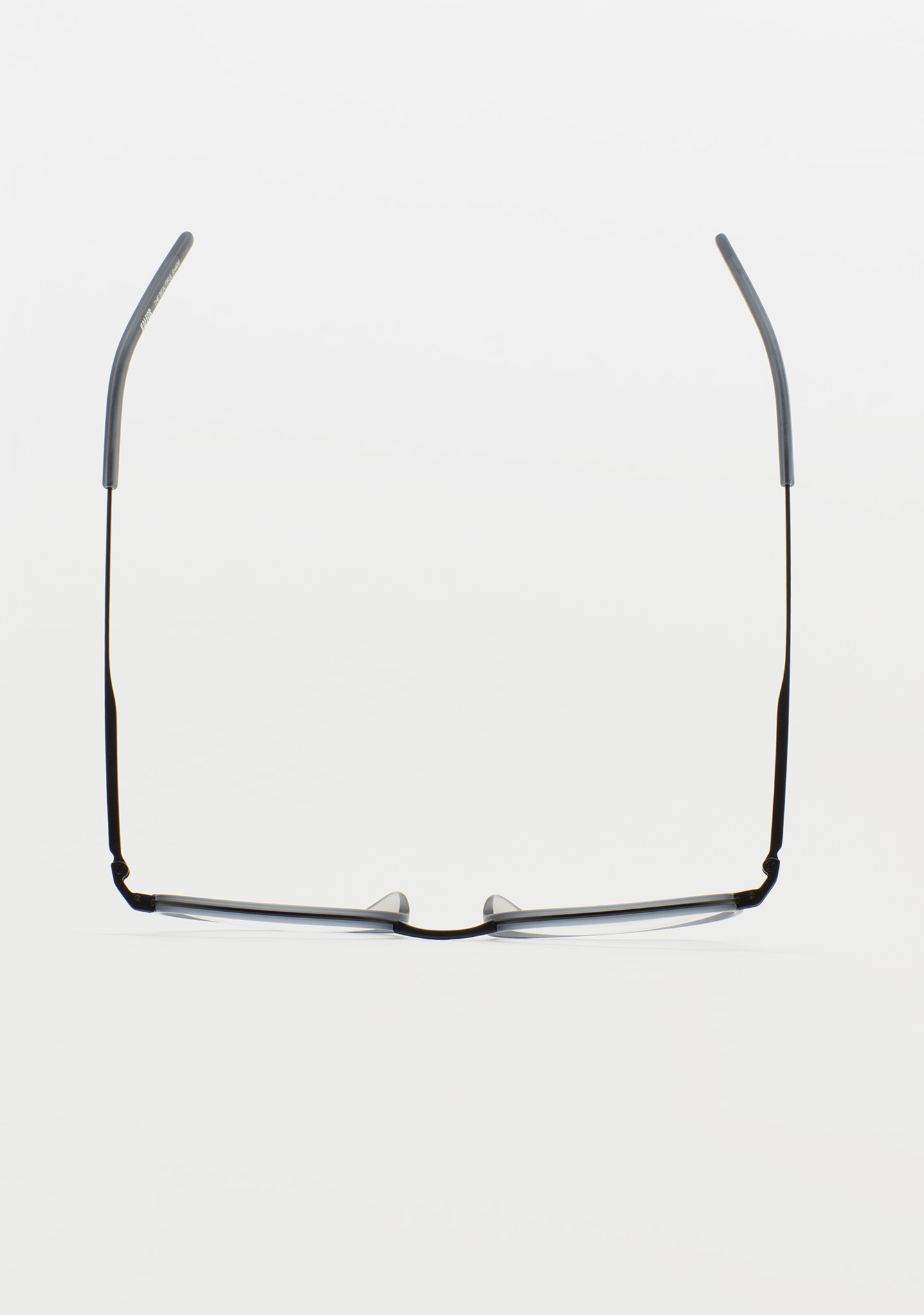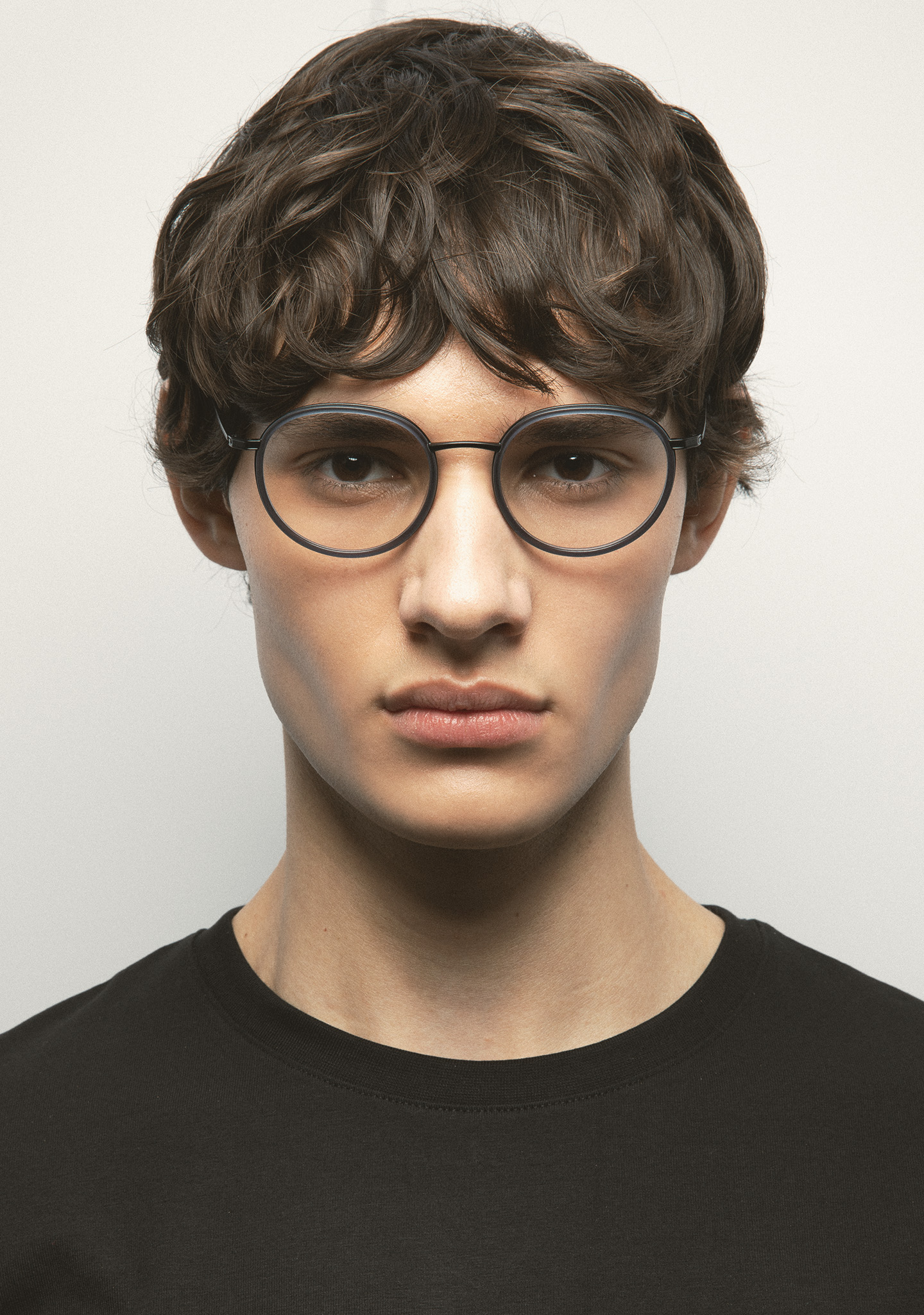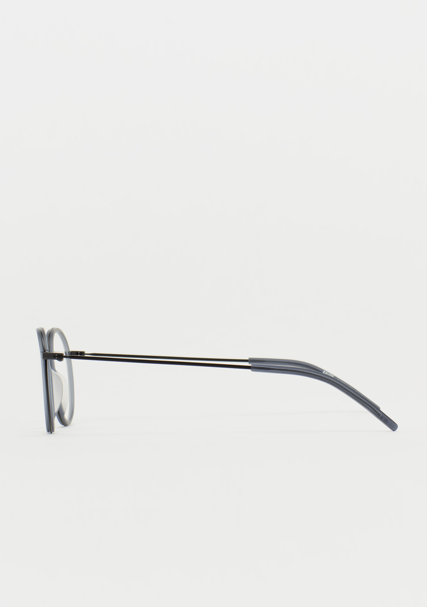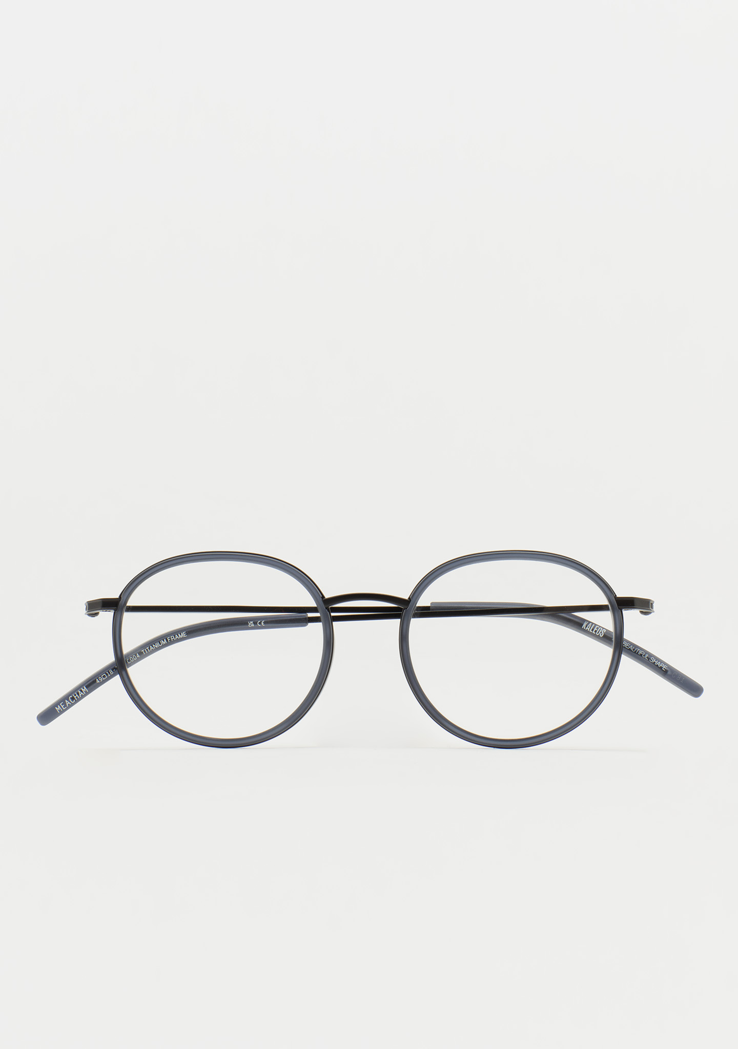 Runde Korrekturbrille. Ein Design, das für Langlebigkeit und Charakter steht. Titanfront mit mattem transparentem blauem High-Density-Acetat-Rand. Steg und Bügel aus schwarzem Titan, Bügelenden aus mattem transparentem blauem Acetat. Integrierte Acetat-Nasenpads. Handgefertigt.