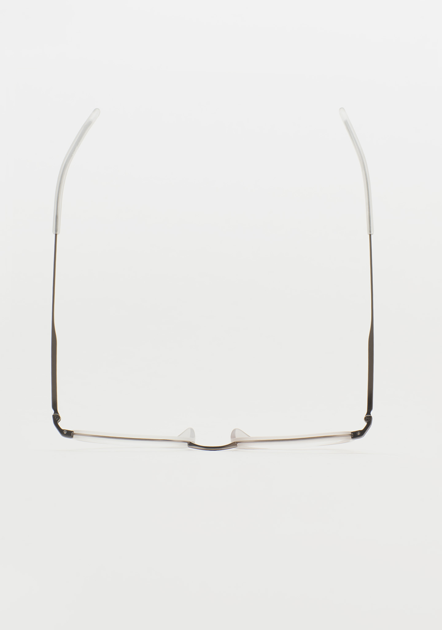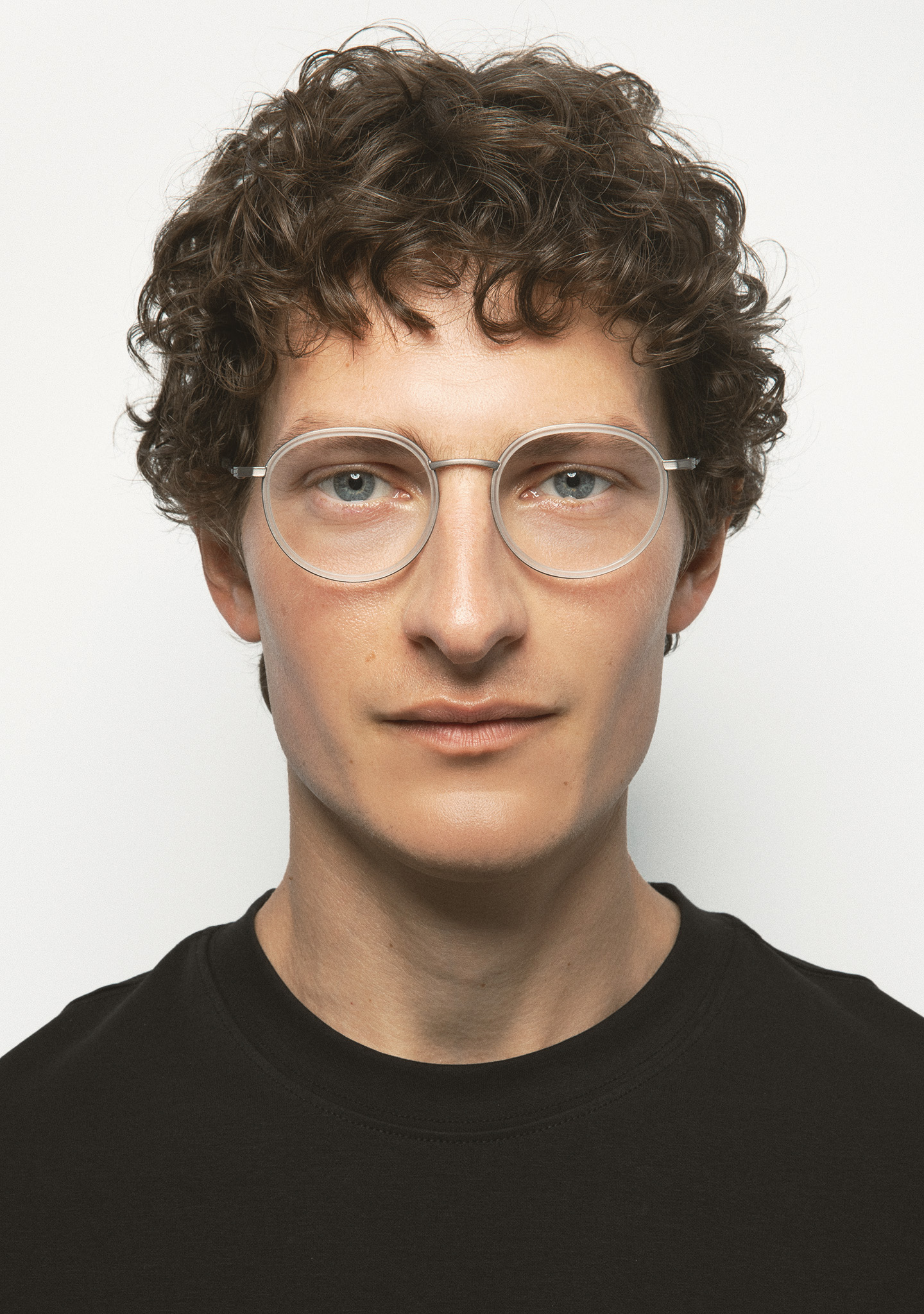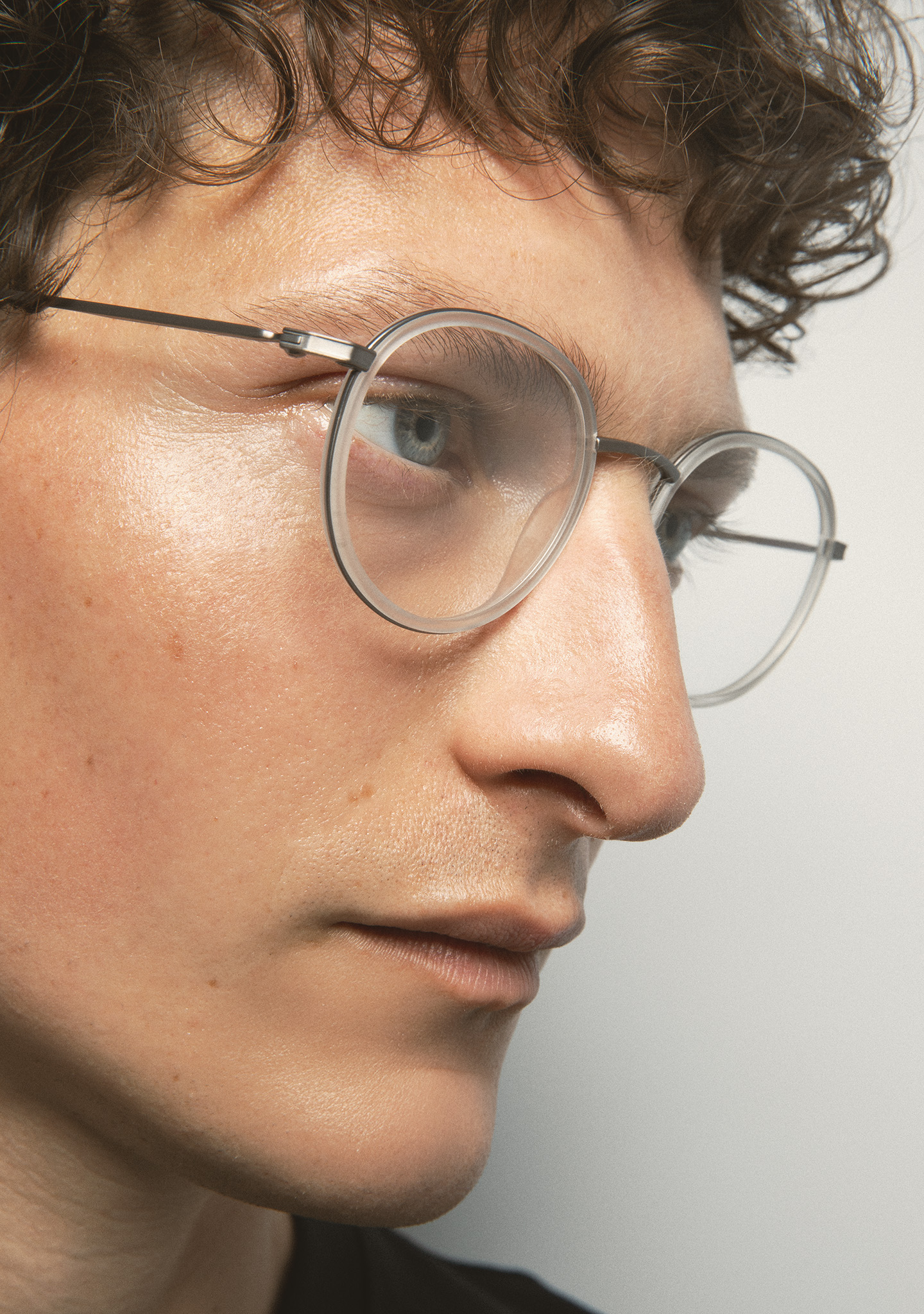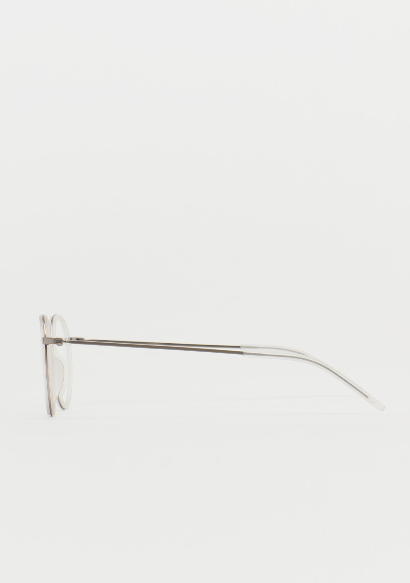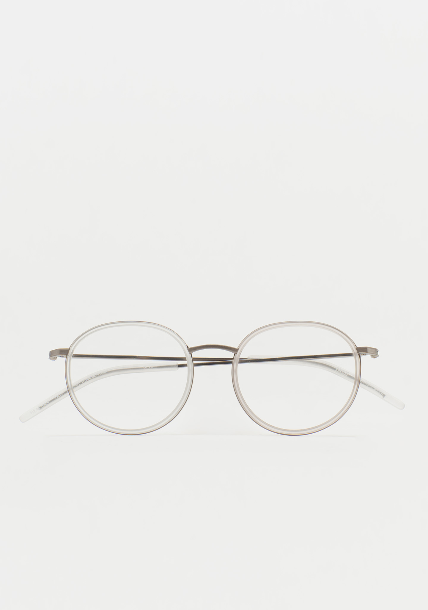 Runde Korrekturbrille. Ein Design, das für Langlebigkeit und Charakter steht. Titanfront mit mattem transparentem Kristall-High-Density-Acetat-Rand. Steg und Bügel aus matt dunkelgrauem Titan, Bügelenden aus mattem transparentem Kristall-Acetat. Integrierte Acetat-Nasenpads. Handgefertigt.