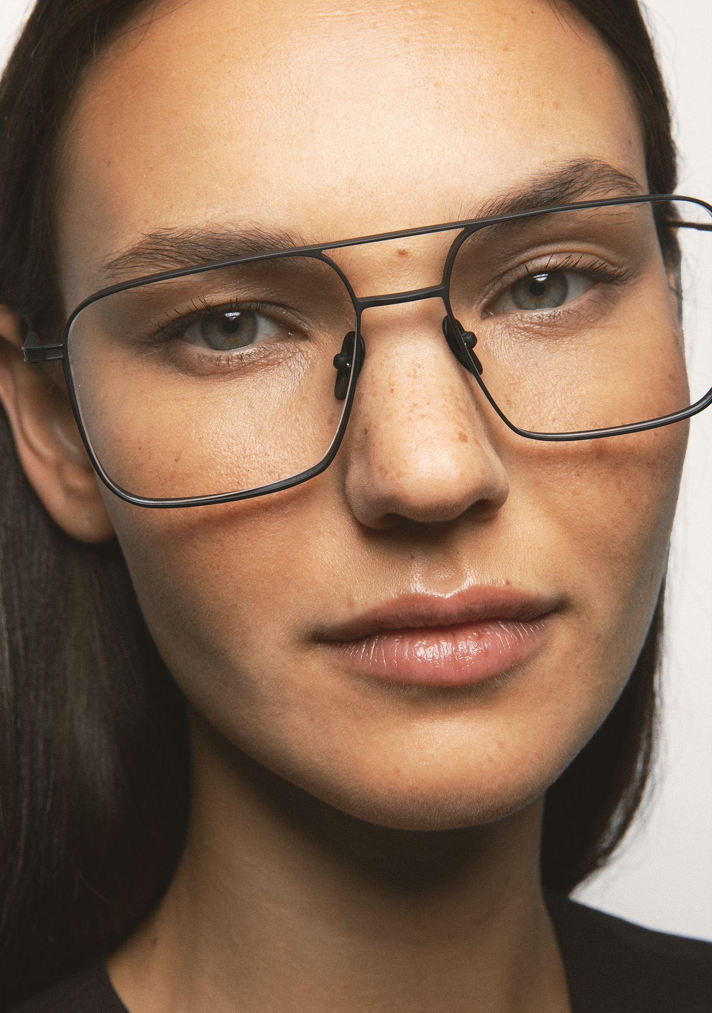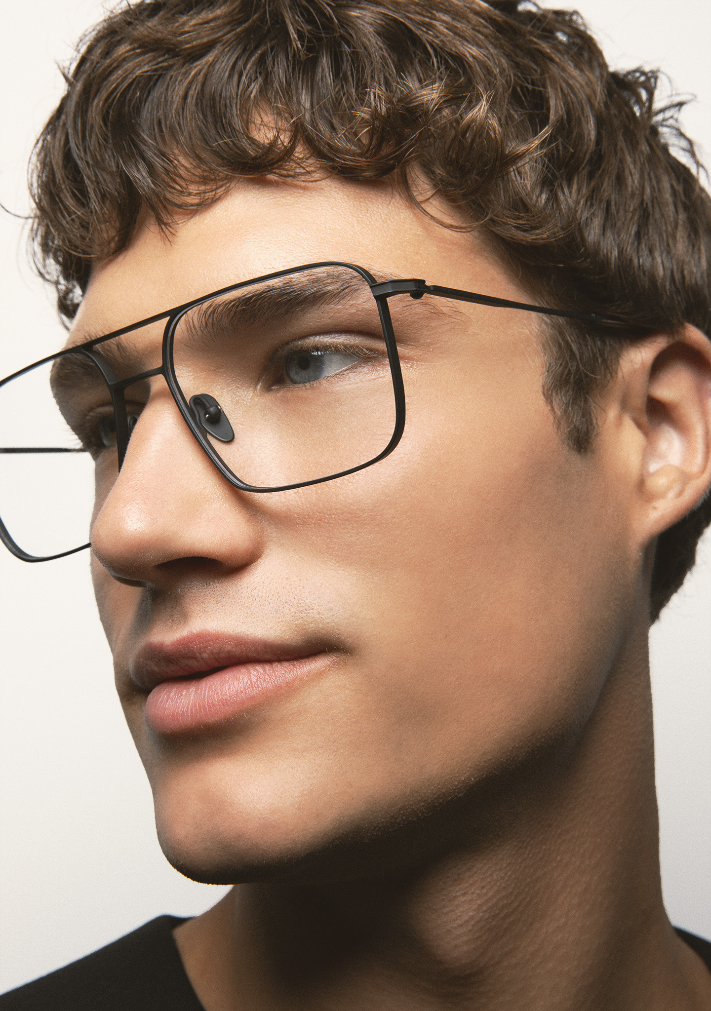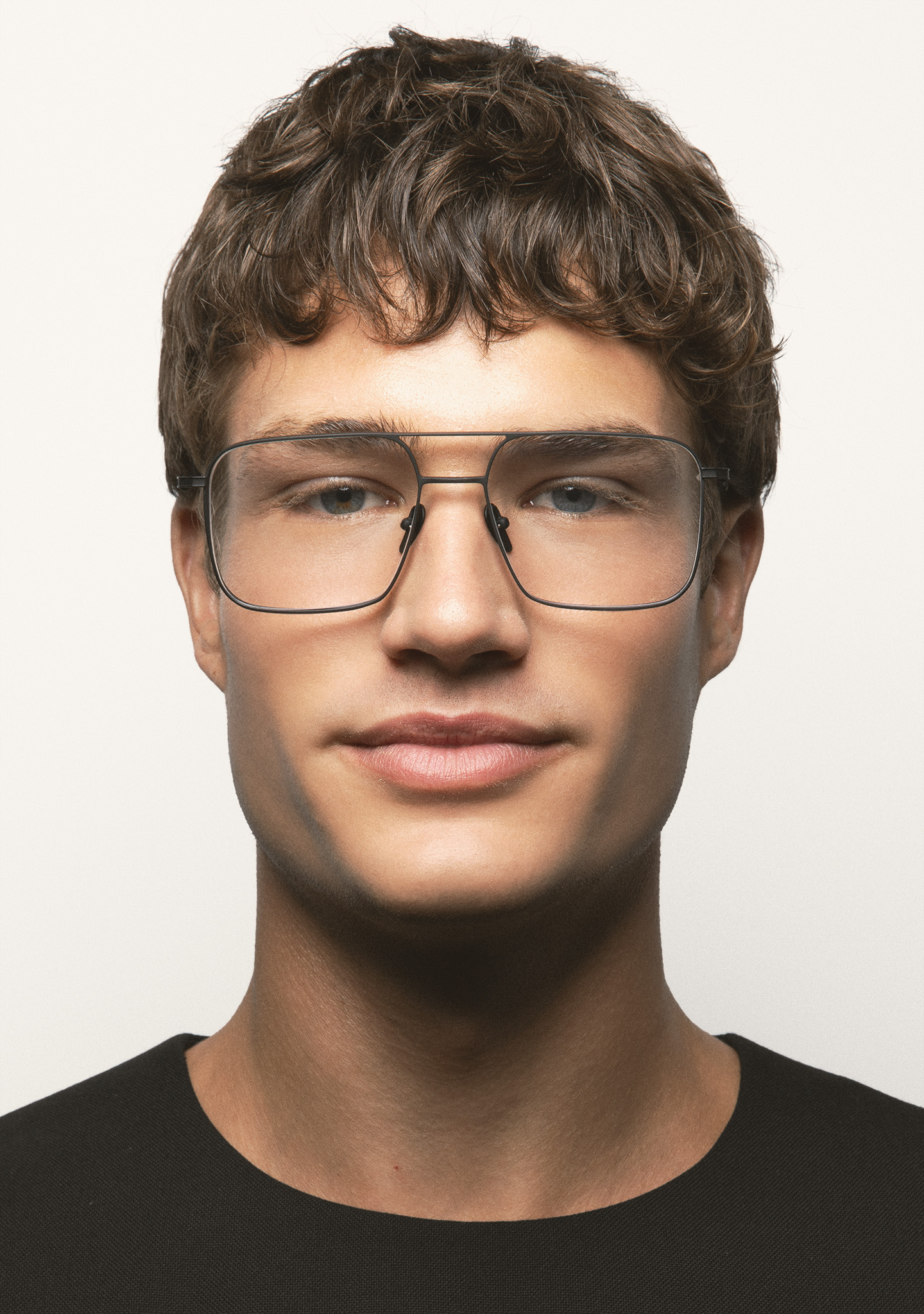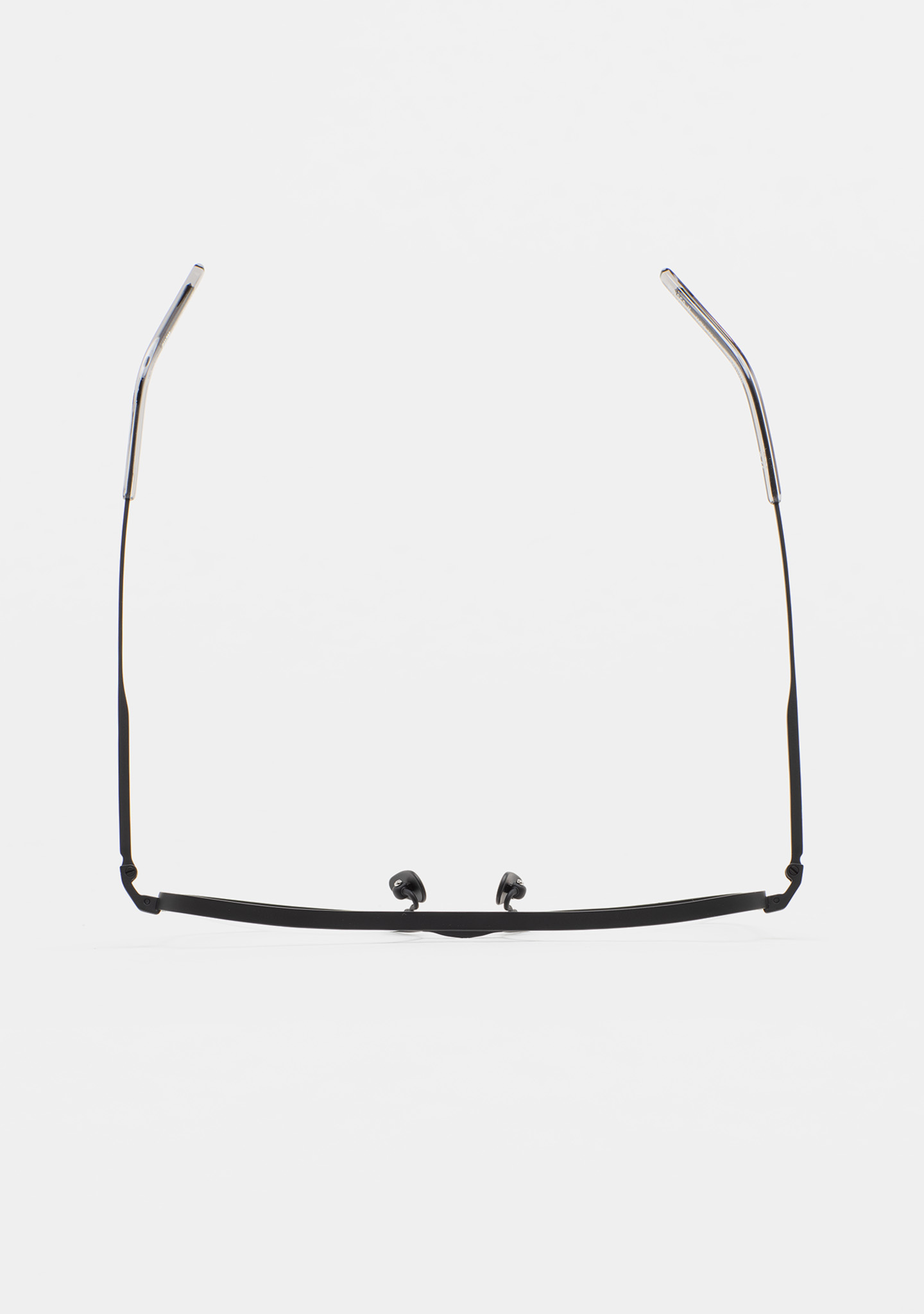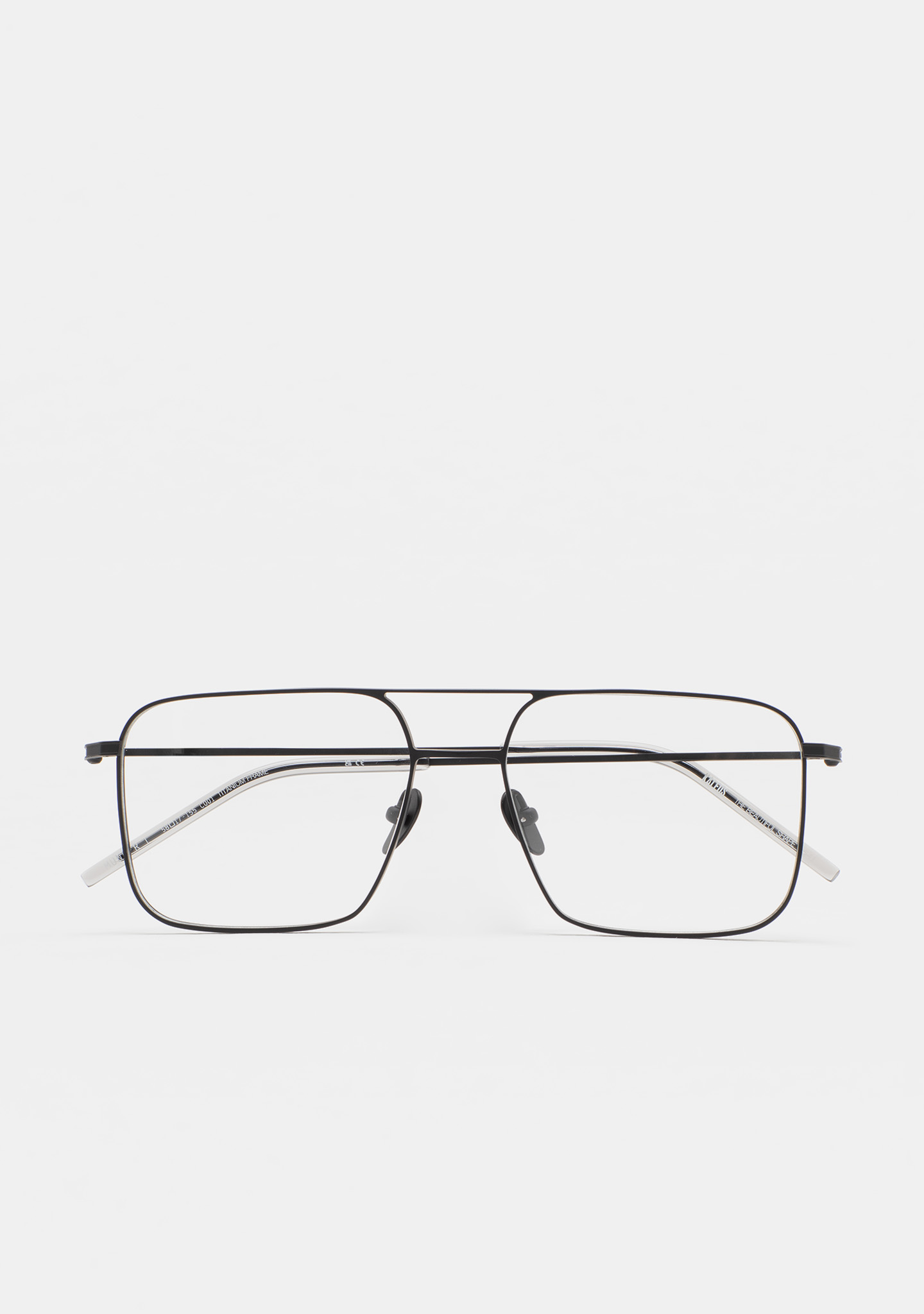 Sehhilfe in rechteckiger Form mit Doppelsteg. Front und Bügel aus mattem schwarzem Titan. Bügel mit Endstück aus transparent grauem Acetat. Integrierte Acetat-Nasenpads. Handgefertigt. Erhältlich in zwei Größen: Medium (M) und Large (L).