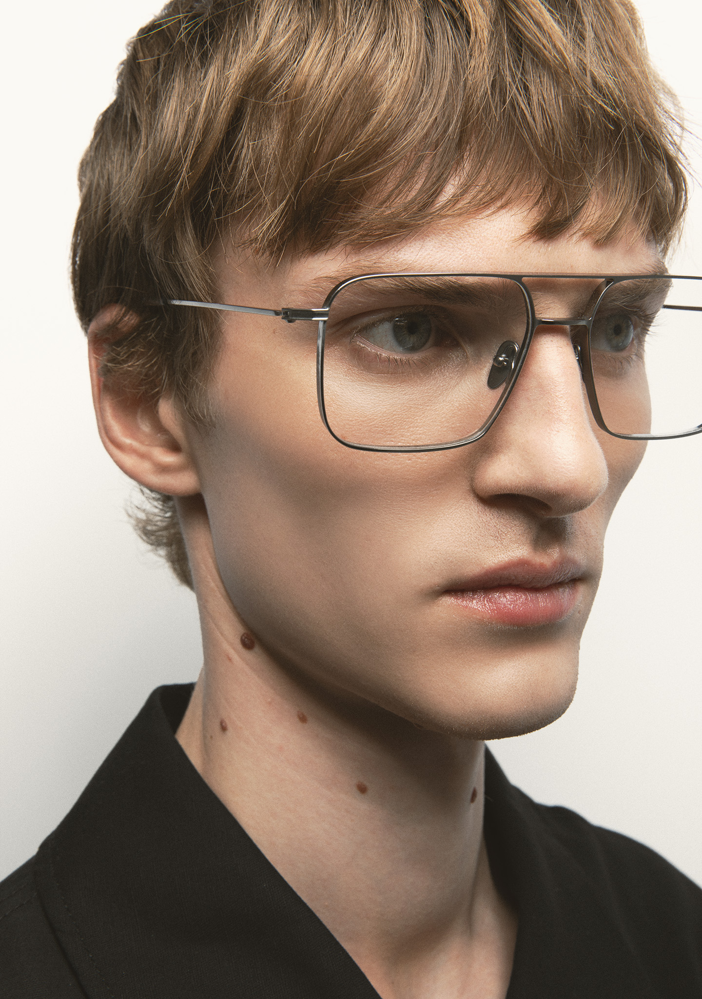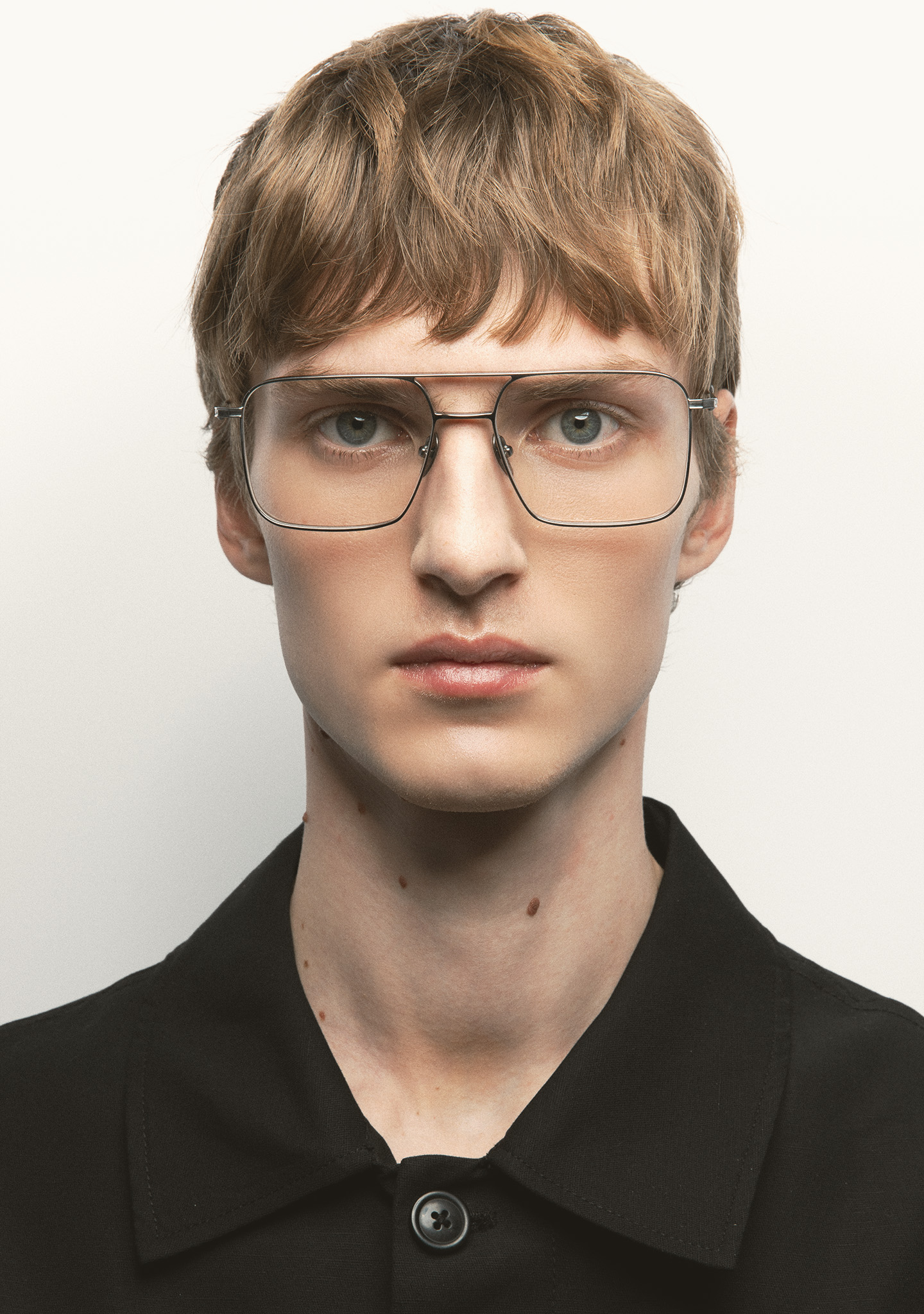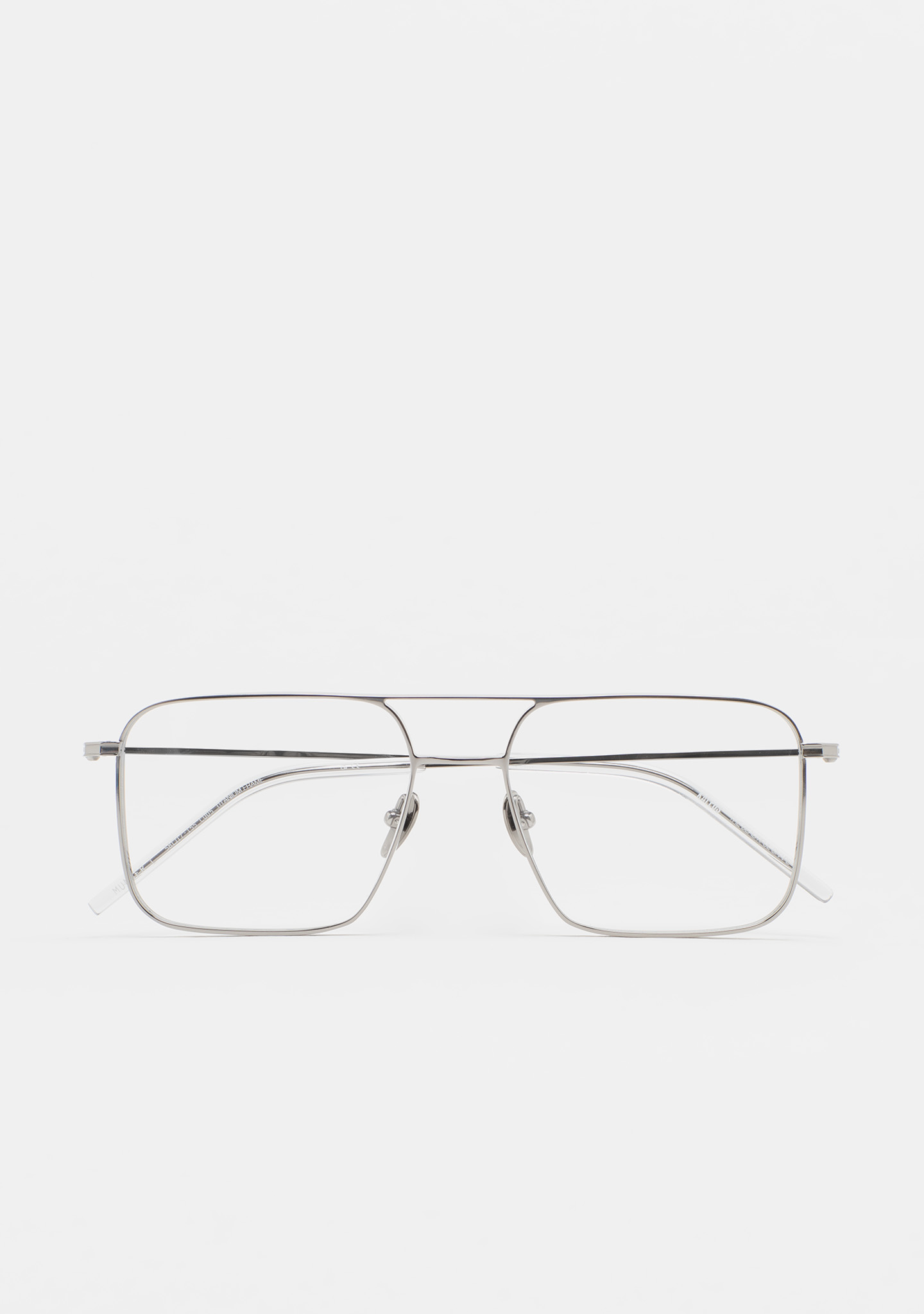 Sehhilfe in rechteckiger Form mit Doppelsteg. Front und Bügel aus silbernem Titan. Bügel mit Endstück aus transparent grauem Acetat. Integrierte Acetat-Nasenpads. Handgefertigt. Erhältlich in zwei Größen: Medium (M) und Large (L).