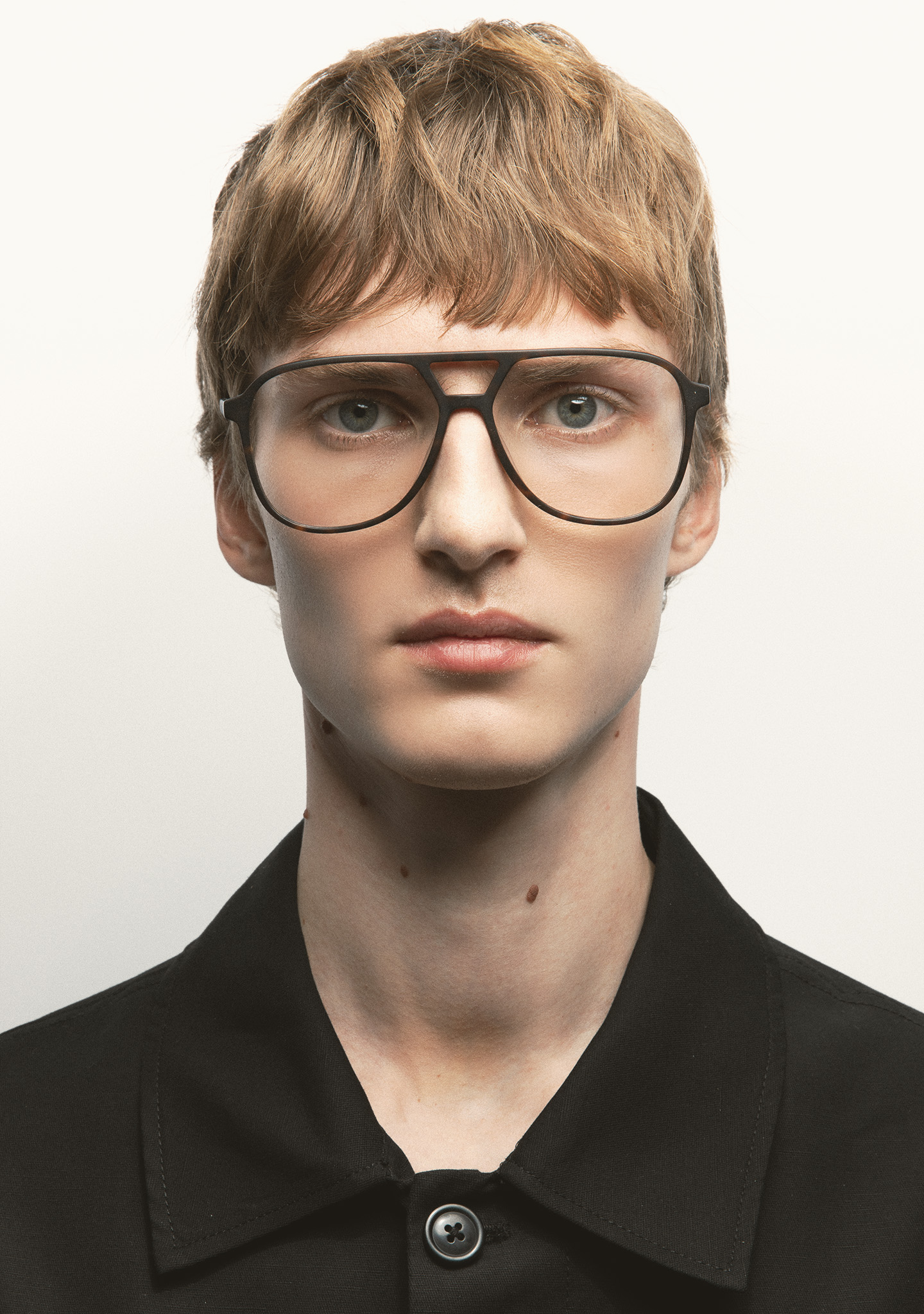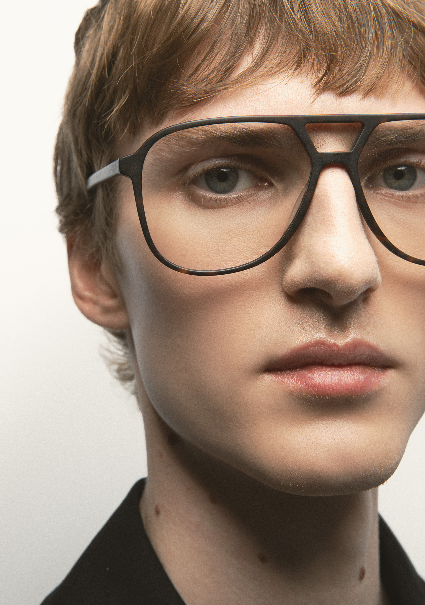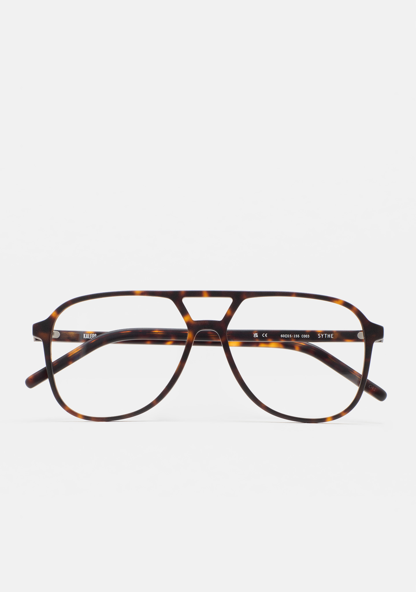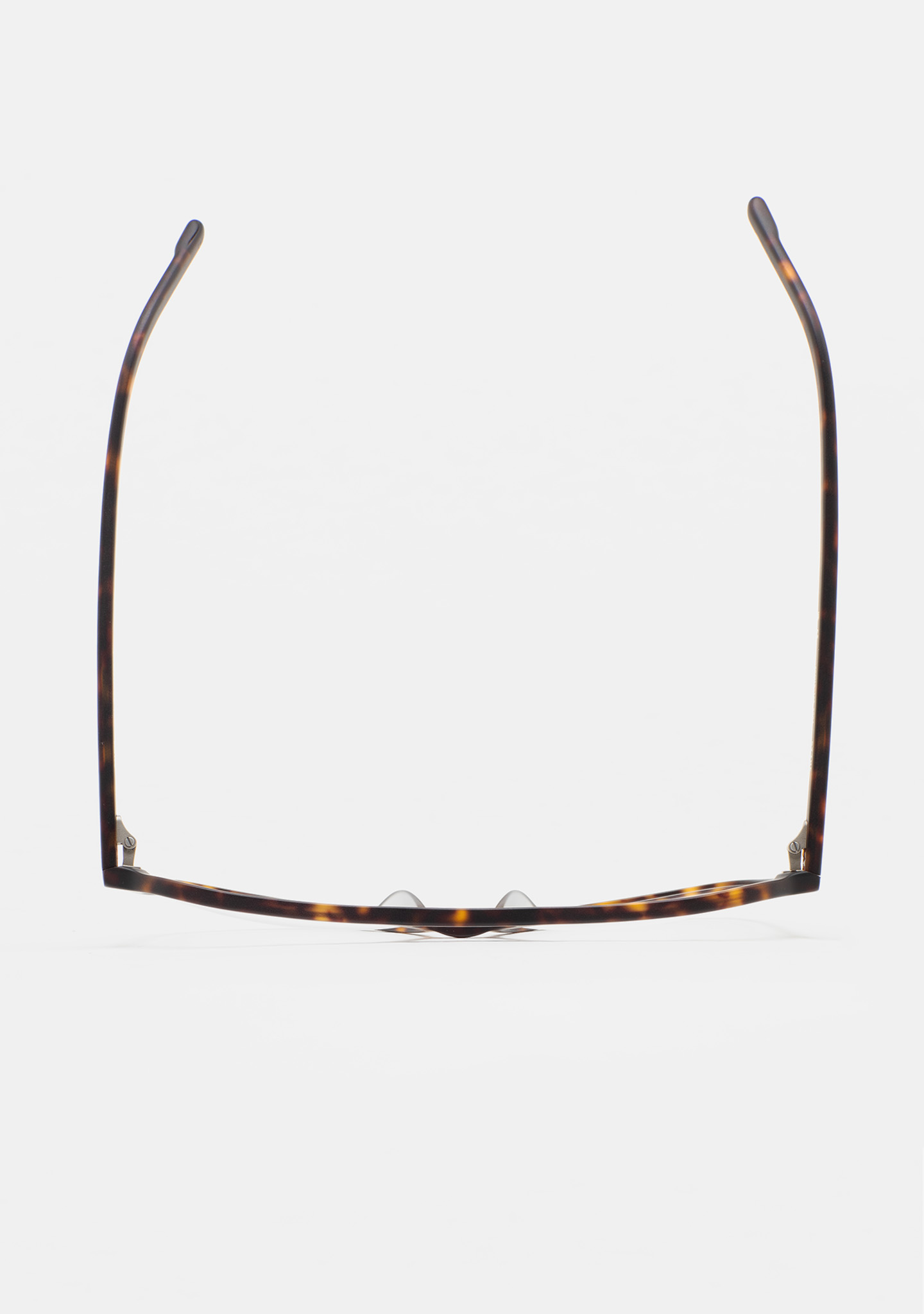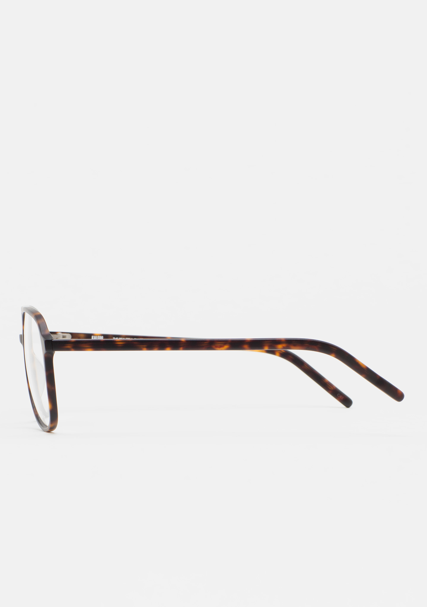 Sehhilfe in Pilotenform mit Doppelsteg. Front und Bügel aus mattem dunkelbraunem Havana-High-Density-Acetat. Integrierte Acetat-Nasenpads. Handgefertigt. Erhältlich in zwei Größen: Medium (M) und Large (L).
