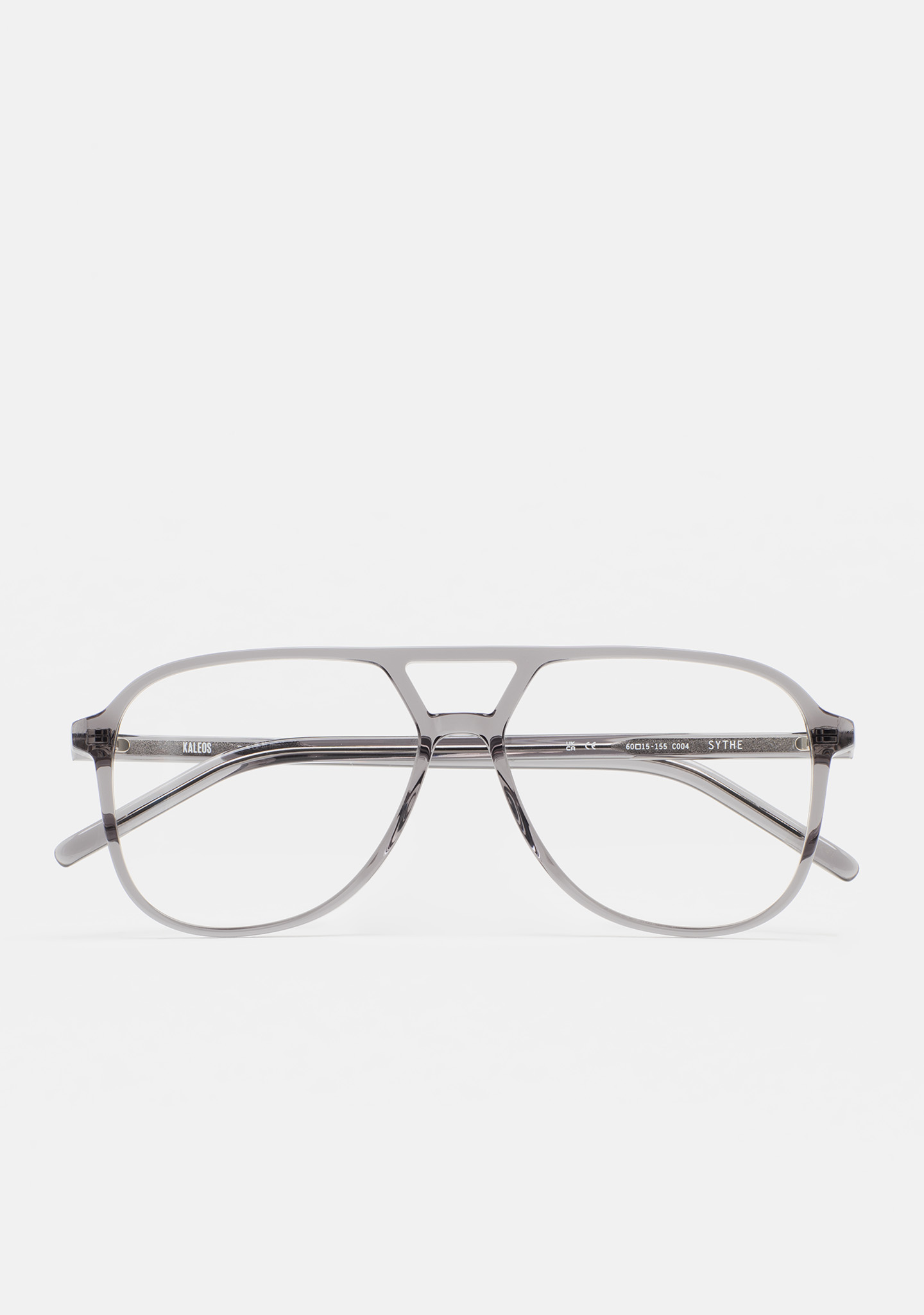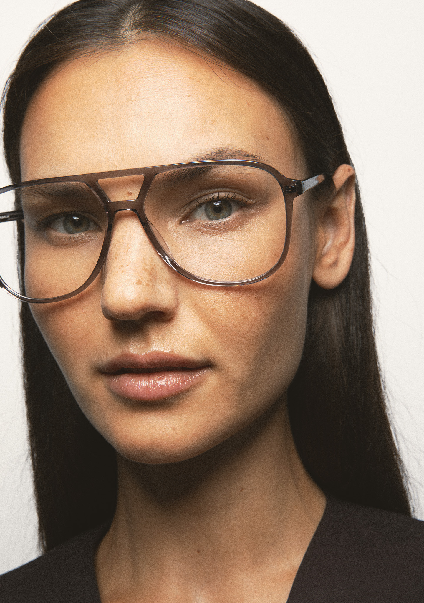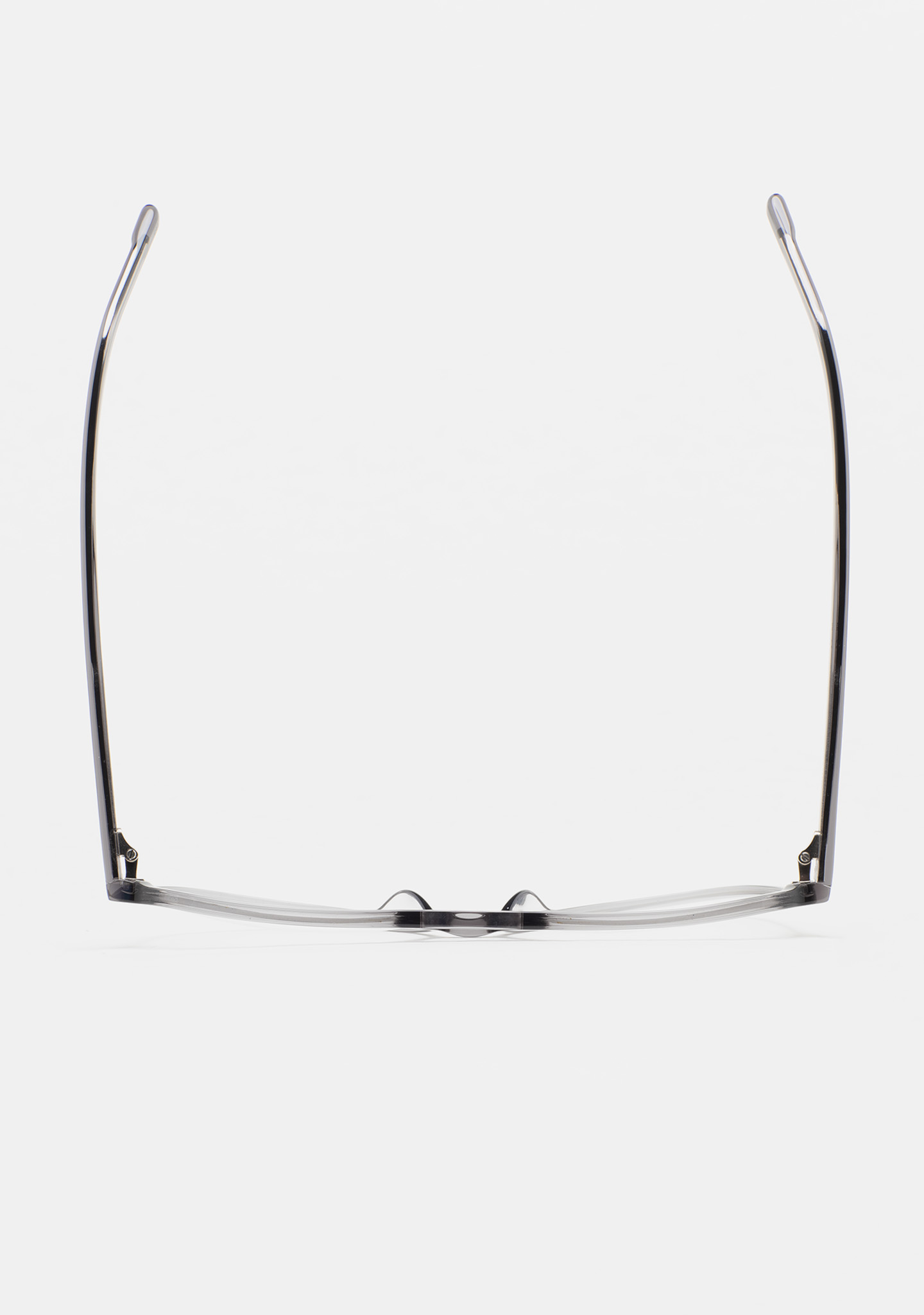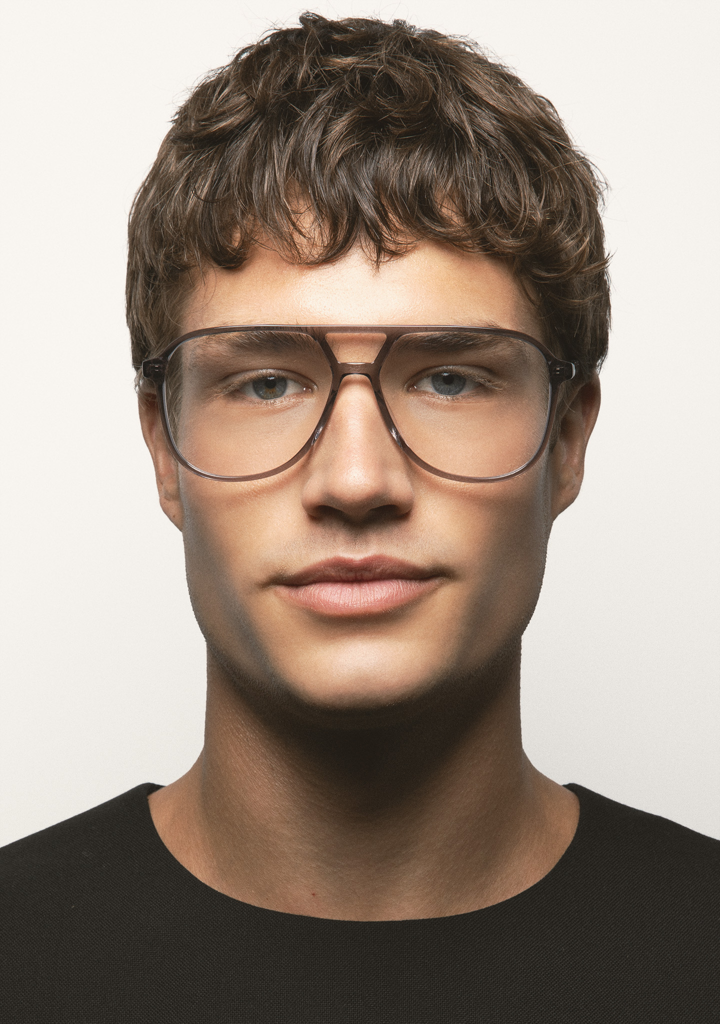 Sehhilfe in Pilotenform mit Doppelsteg. Front und Bügel aus transparentem grauem High-Density-Acetat. Integrierte Acetat-Nasenpads. Handgefertigt. Erhältlich in zwei Größen: Medium (M) und Large (L).