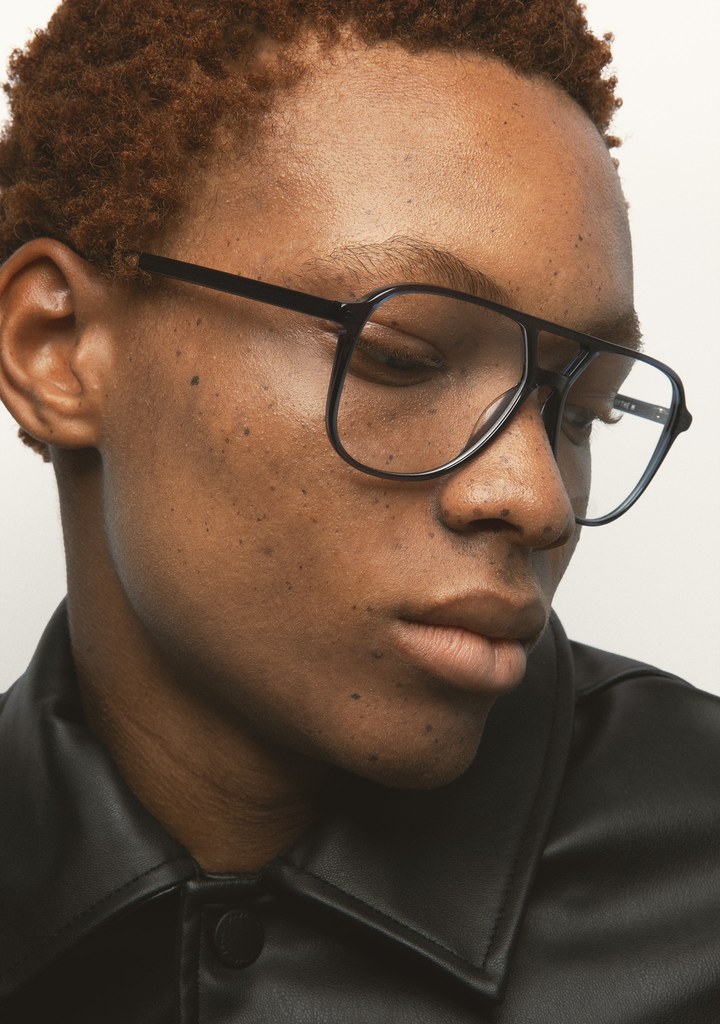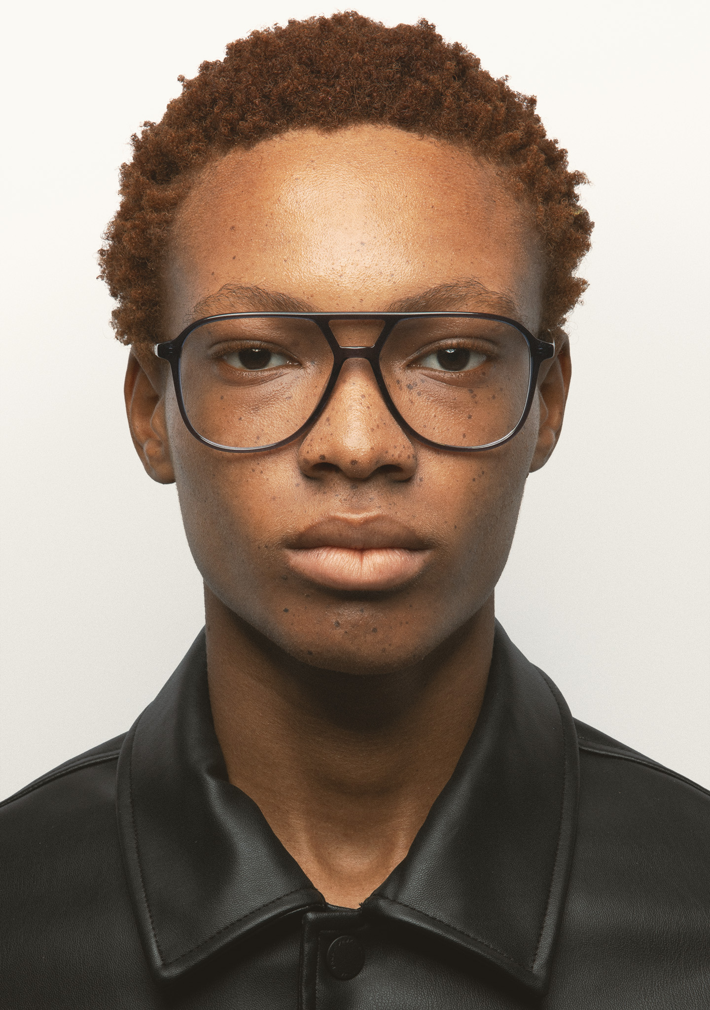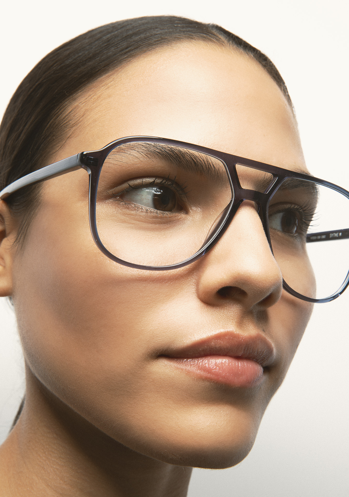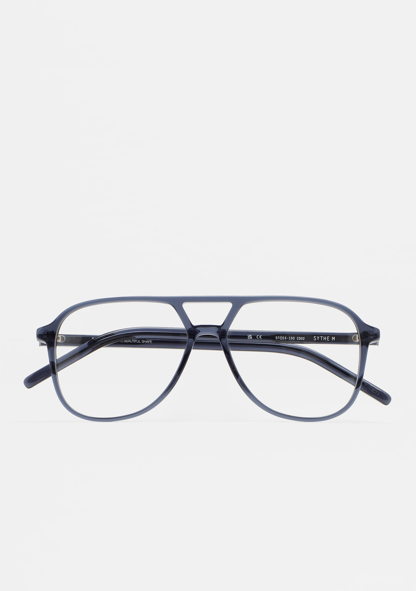 Sehhilfe in Pilotenform mit Doppelsteg. Front und Bügel aus transparent graublauem High-Density-Acetat. Integrierte Acetat-Nasenpads. Handgefertigt. Erhältlich in zwei Größen: Medium (M) und Large (L).