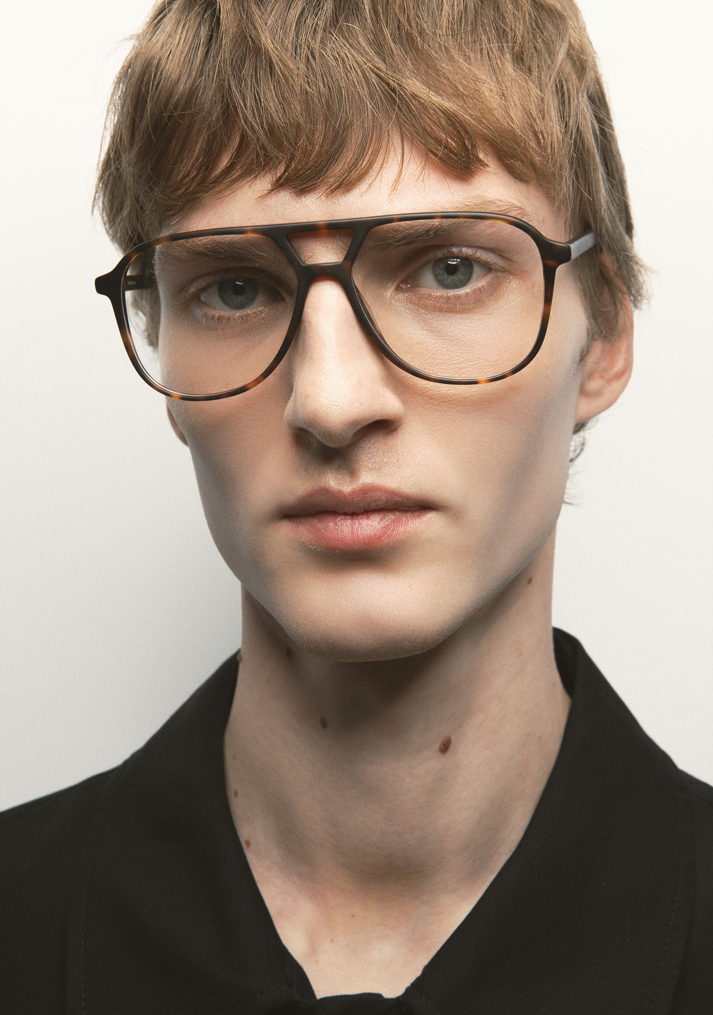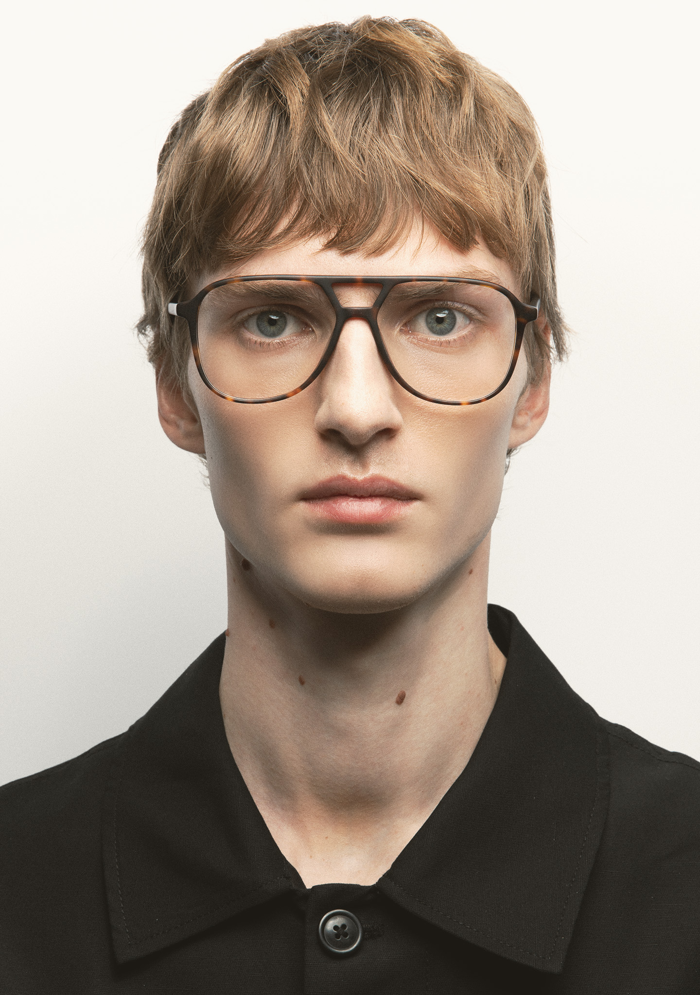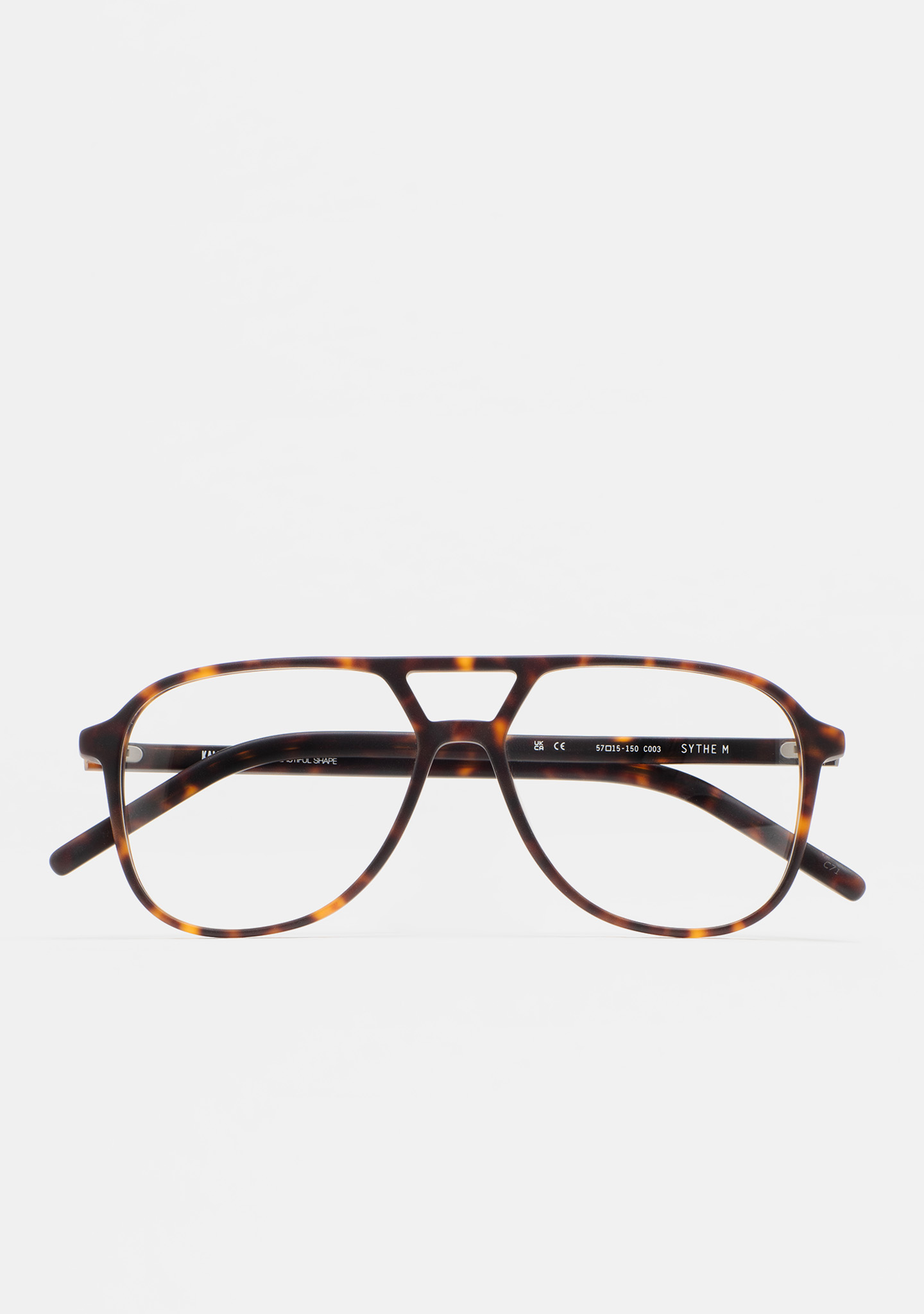 Sehhilfe in Pilotenform mit Doppelsteg. Front und Bügel aus mattem dunkelbraunem Havana-High-Density-Acetat. Integrierte Acetat-Nasenpads. Handgefertigt. Erhältlich in zwei Größen: Medium (M) und Large (L).