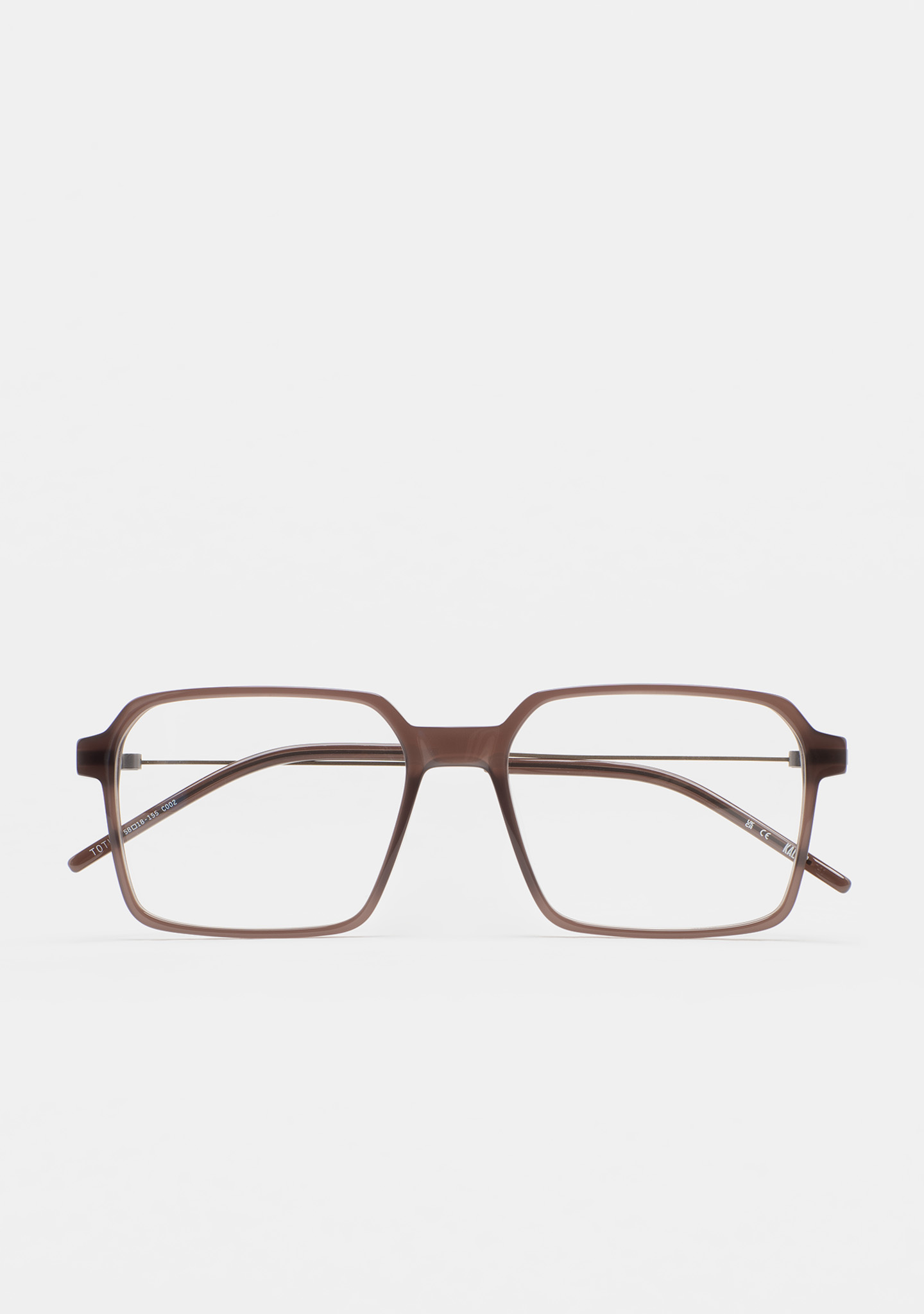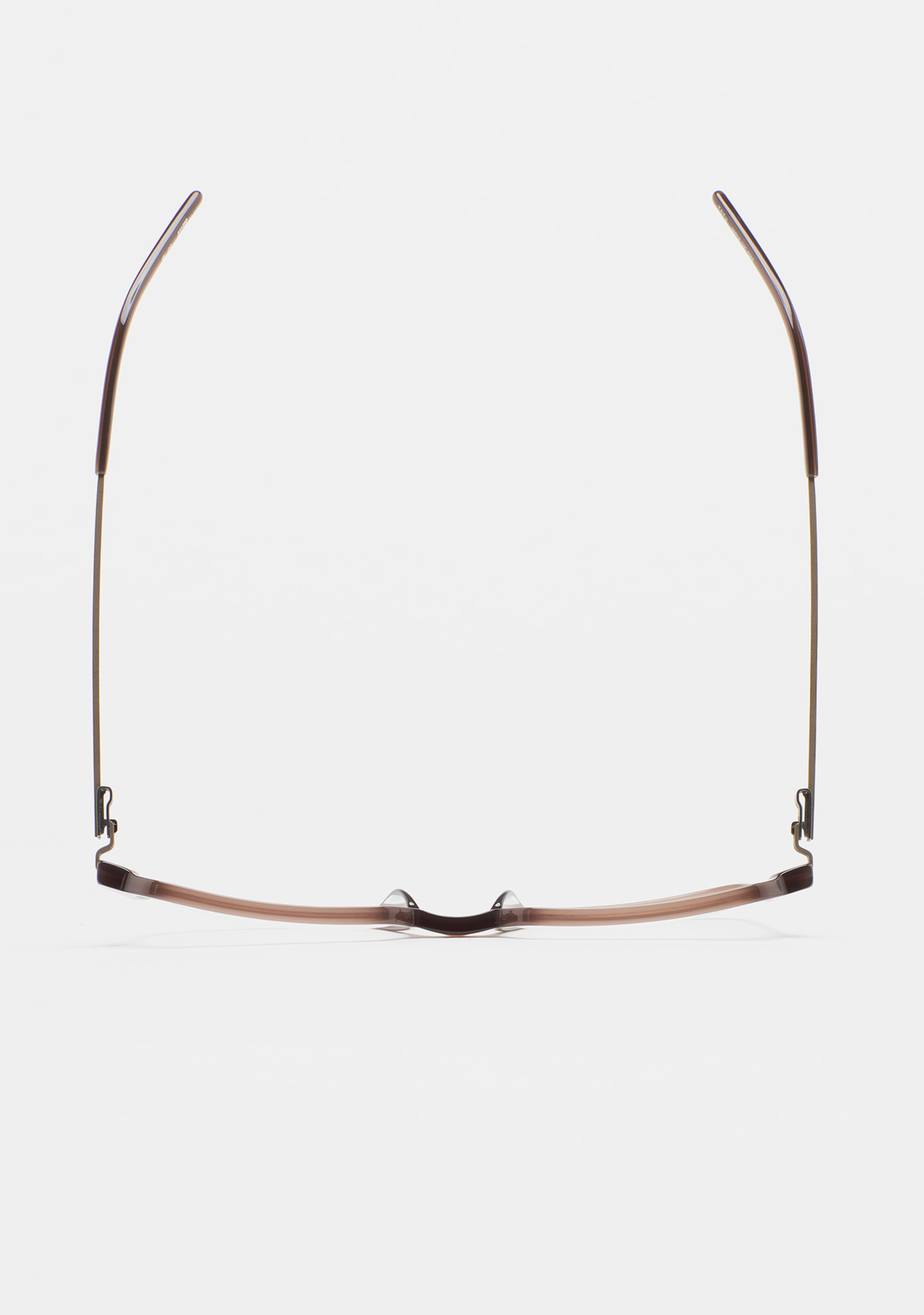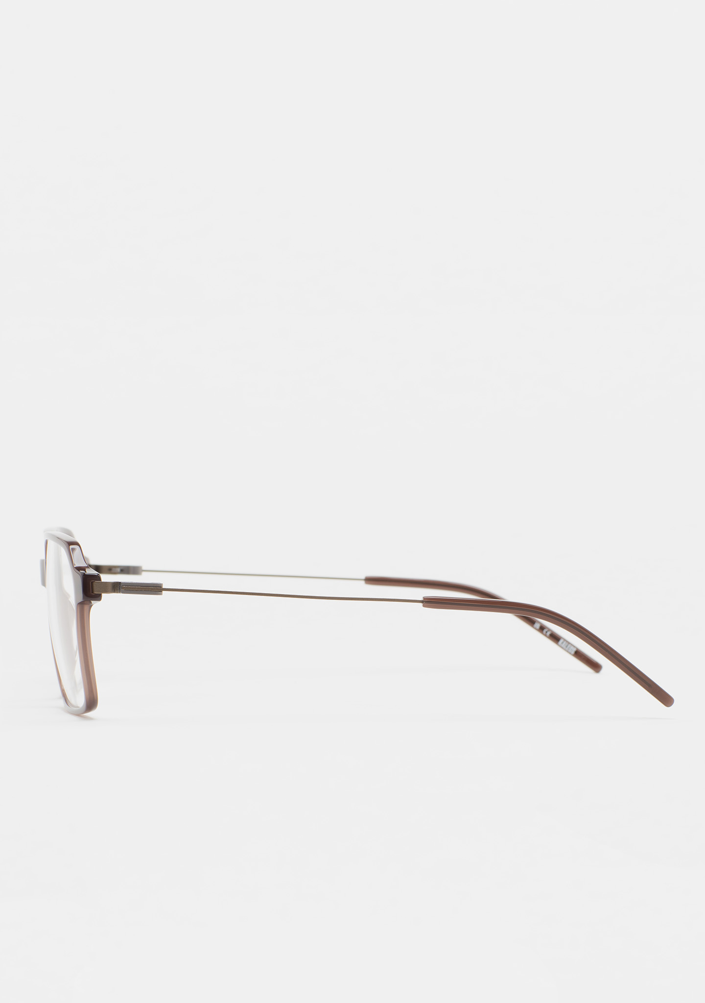 Sehhilfe in rechteckiger Form. Front aus transluzent dunkelbraunem High-Density-Acetat. Bügel aus braunem Edelstahl mit dunkelbraunen Endstücken. Bügel mit neuer schraubenloser Scharniertechnologie. Integrierte Acetat-Nasenpads. Handgefertigt.