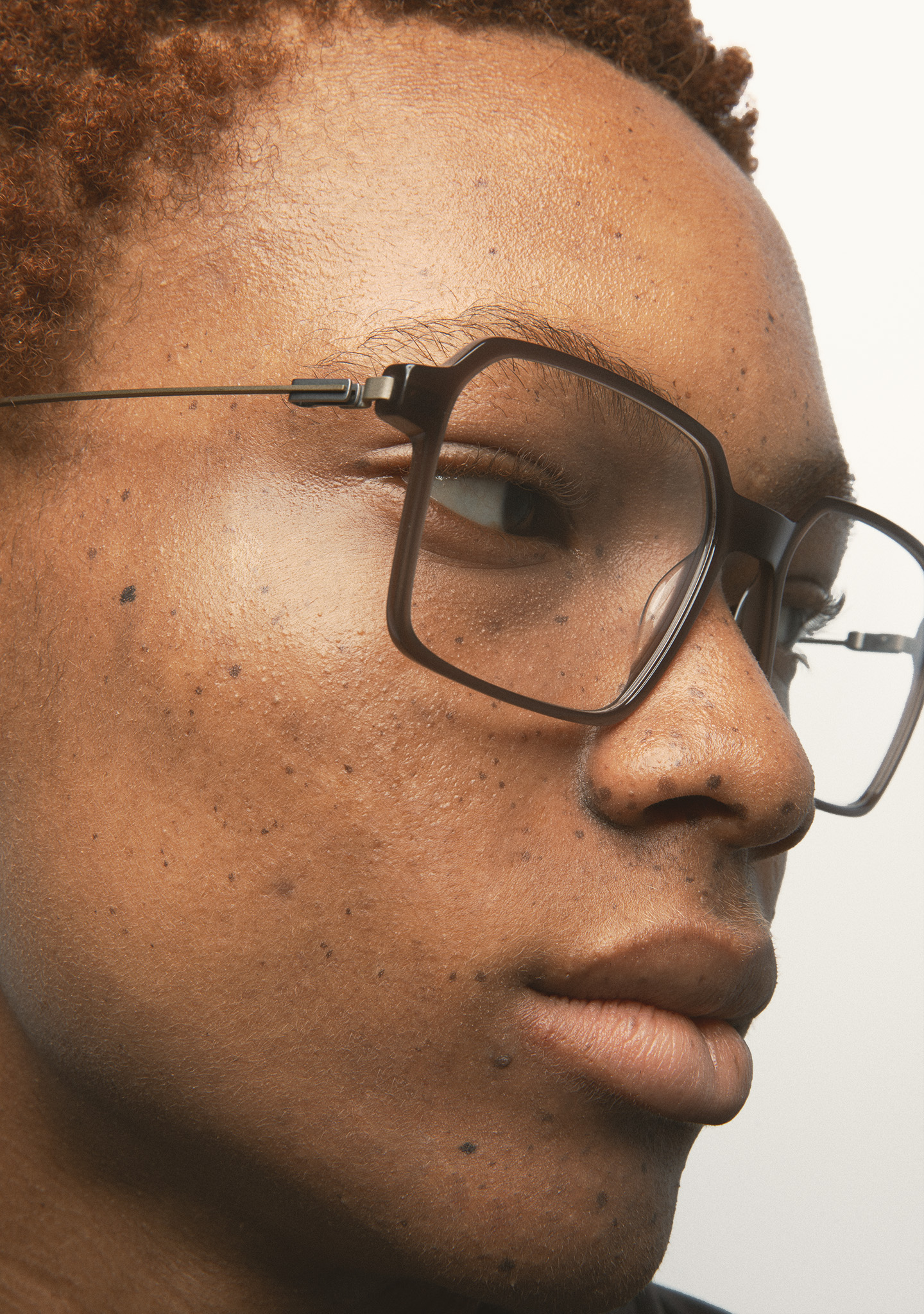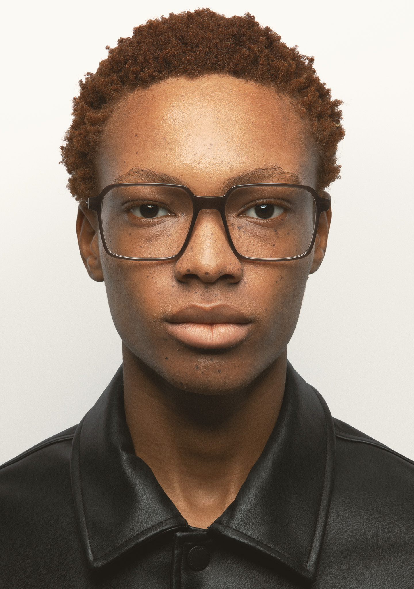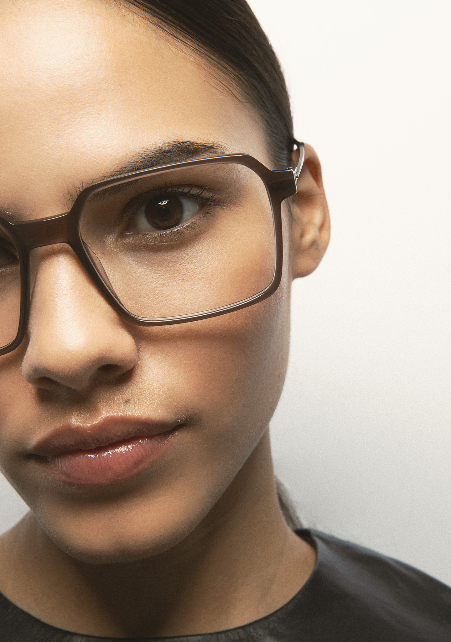 Sehhilfe in rechteckiger Form. Front aus transluzent dunkelbraunem High-Density-Acetat. Bügel aus braunem Edelstahl mit dunkelbraunen Endstücken. Bügel mit neuer schraubenloser Scharniertechnologie. Integrierte Acetat-Nasenpads. Handgefertigt.