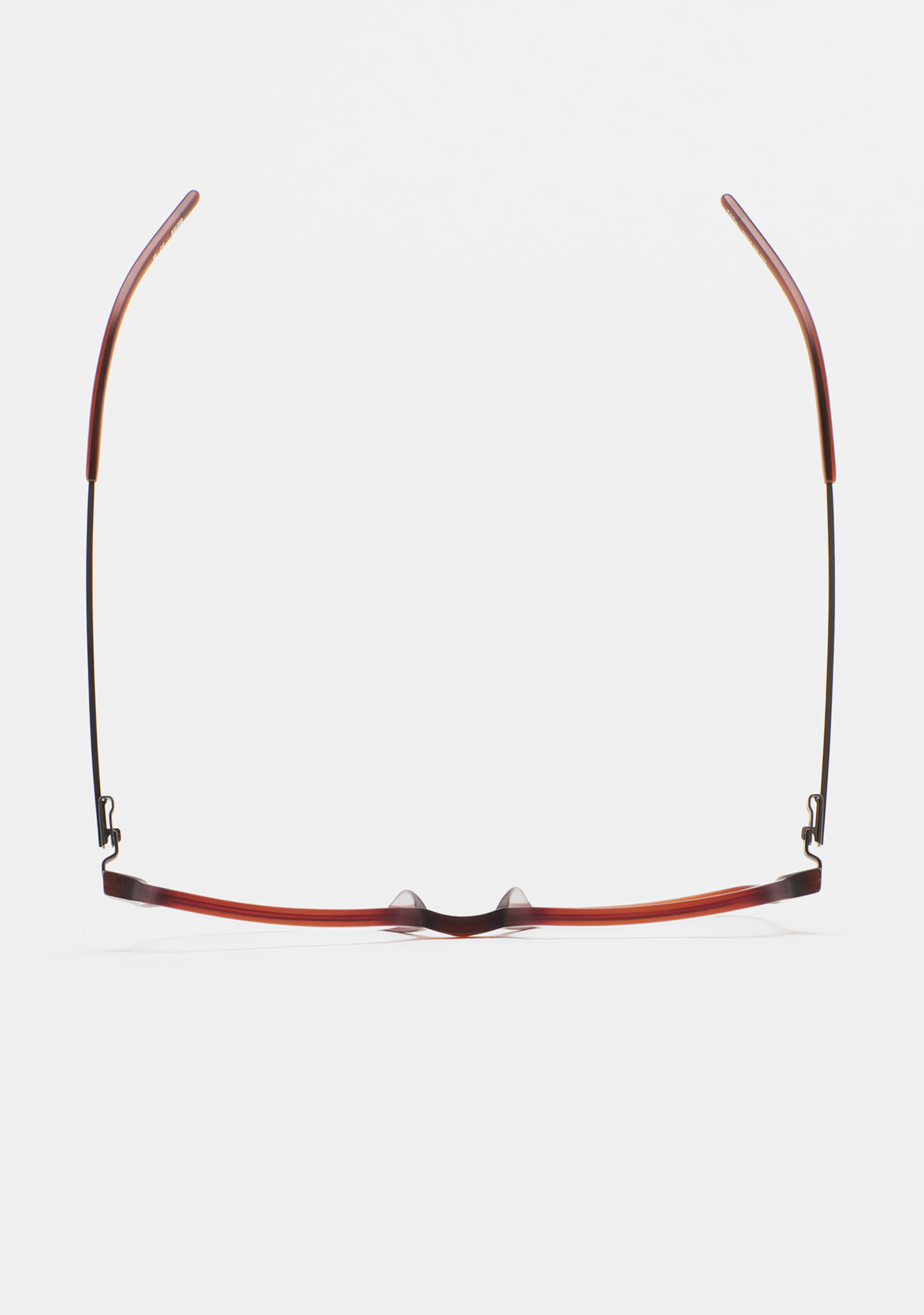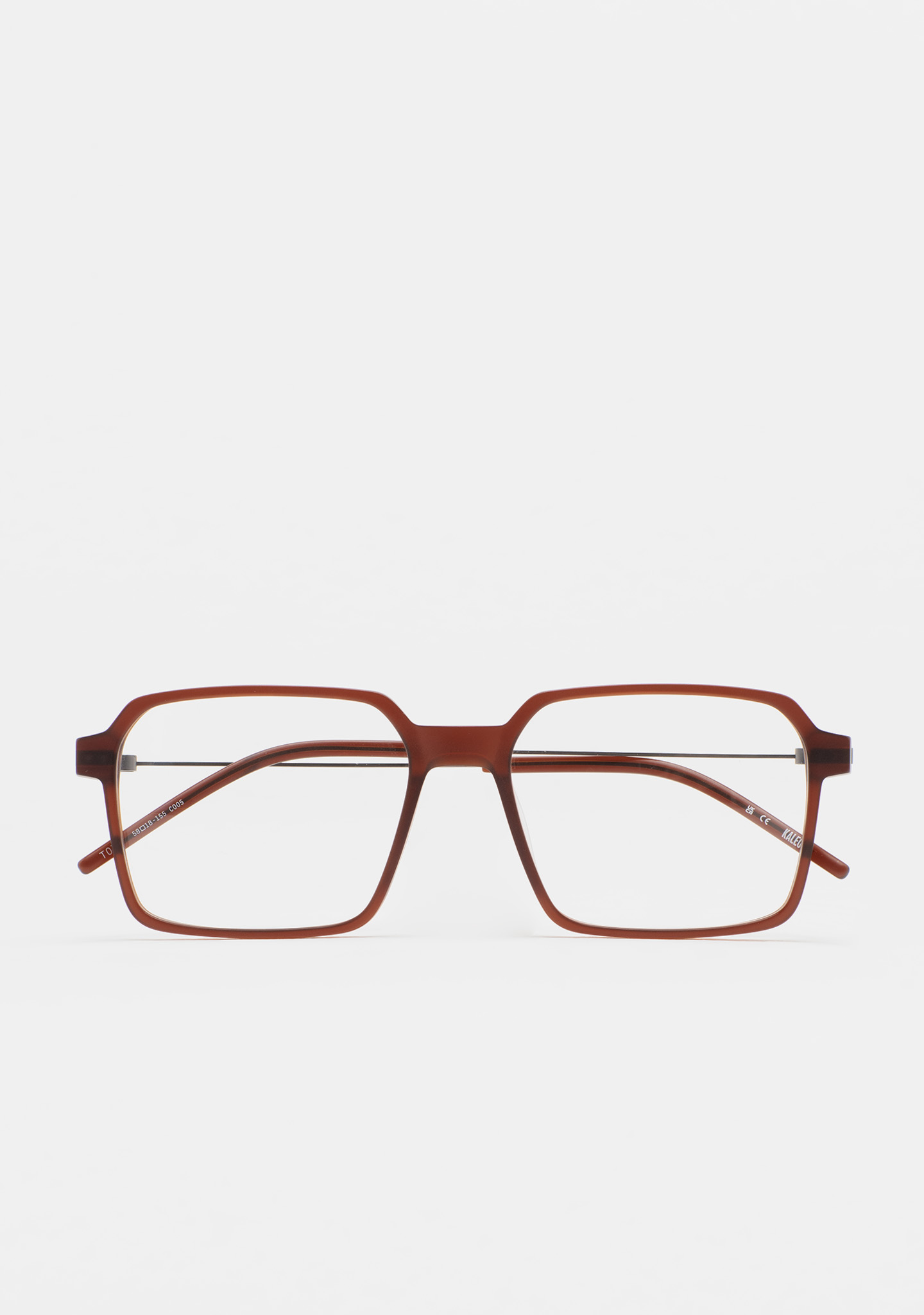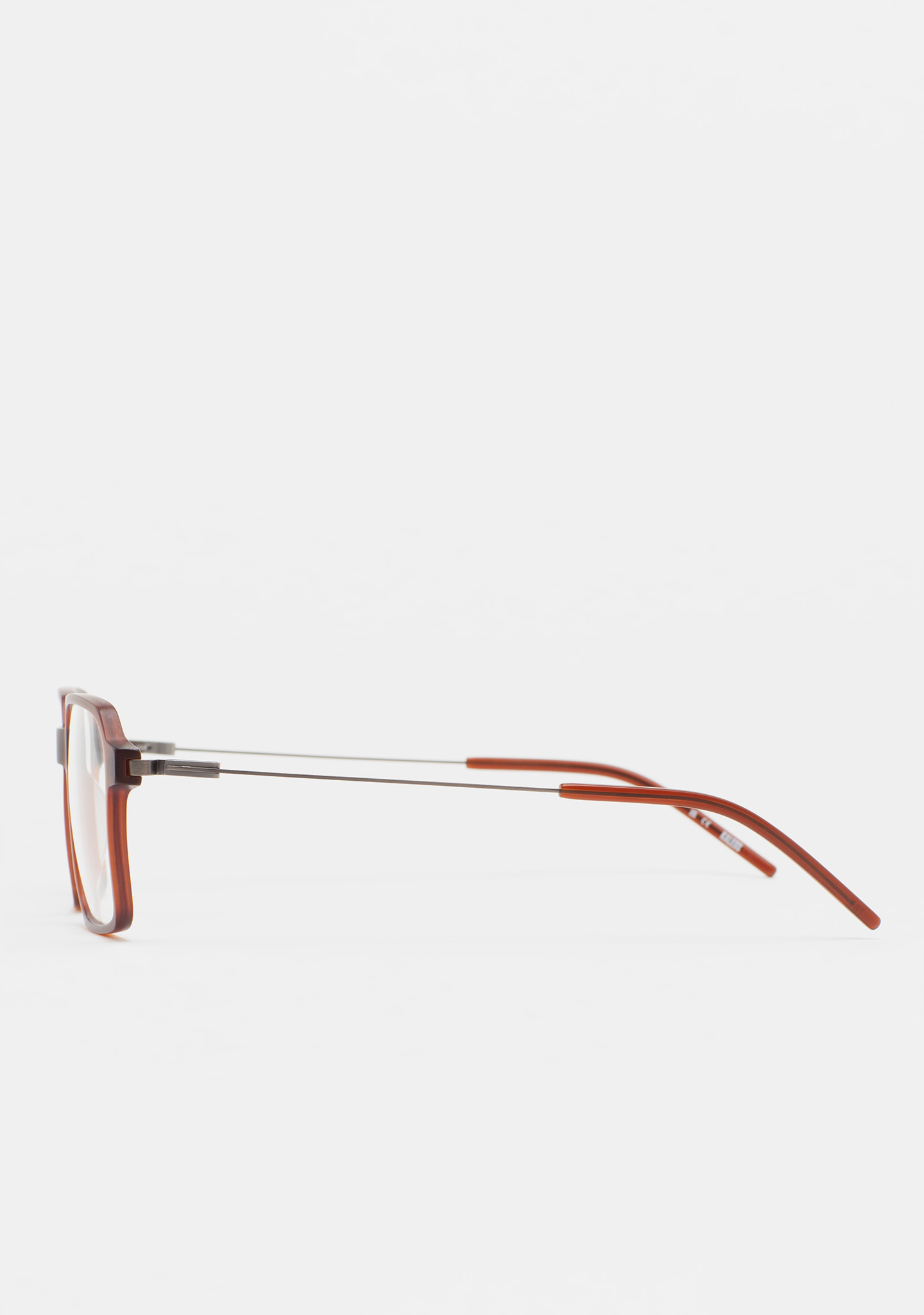 Sehhilfe in rechteckiger Form. Front aus matt transparent braunem High-Density-Acetat. Bügel aus matt dunkelgrauem Edelstahl mit braunen Endstücken. Bügel mit neuer schraubenloser Scharniertechnologie. Integrierte Acetat-Nasenpads. Handgefertigt.