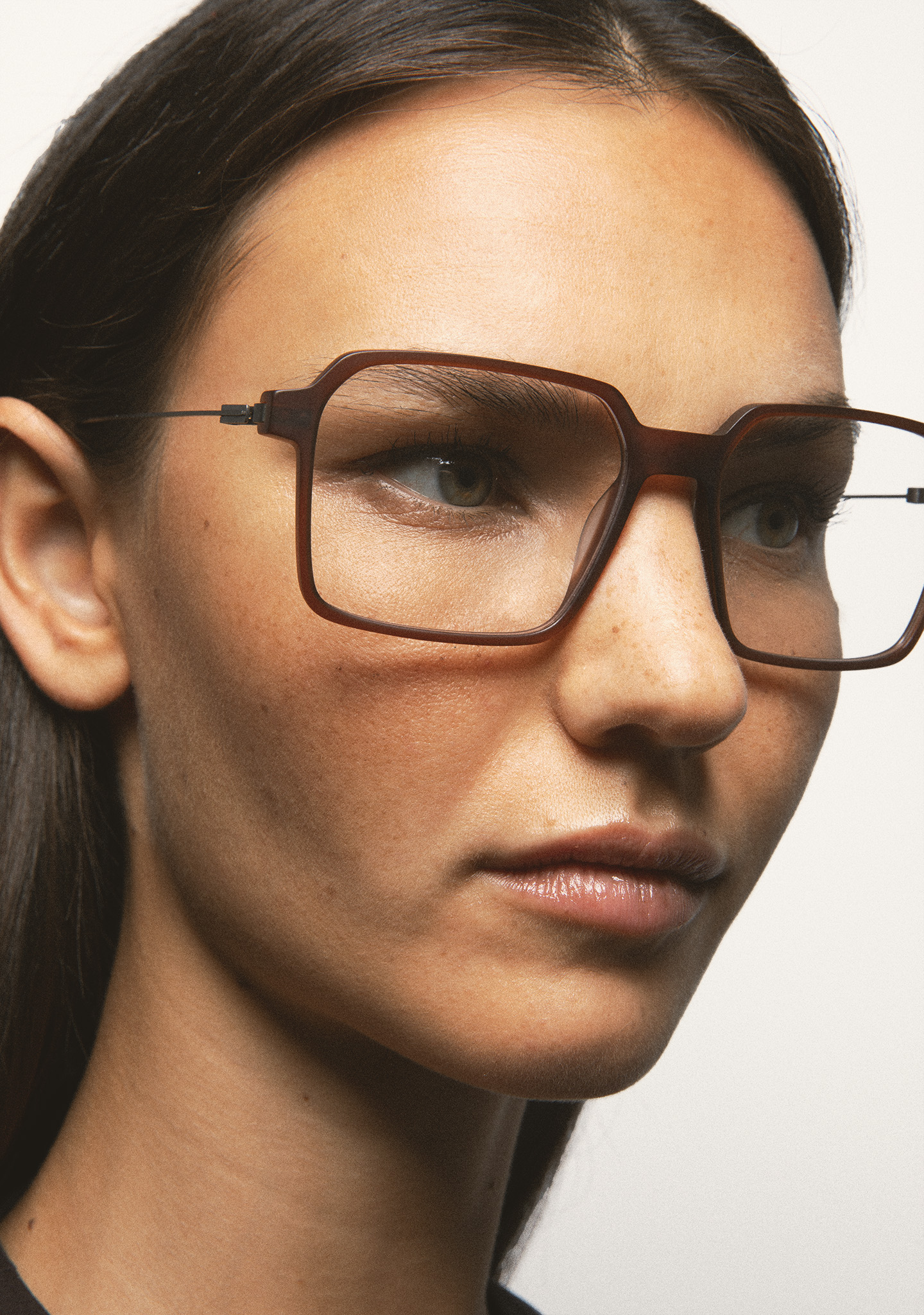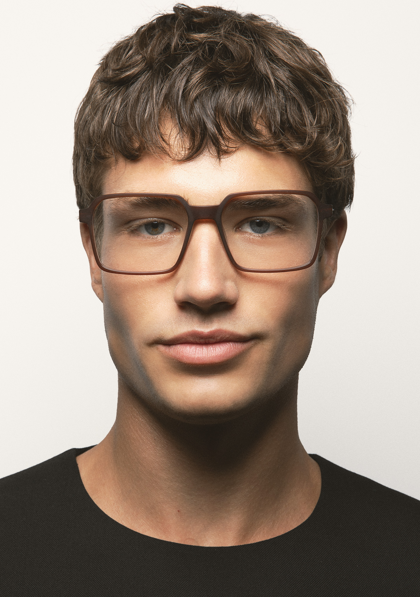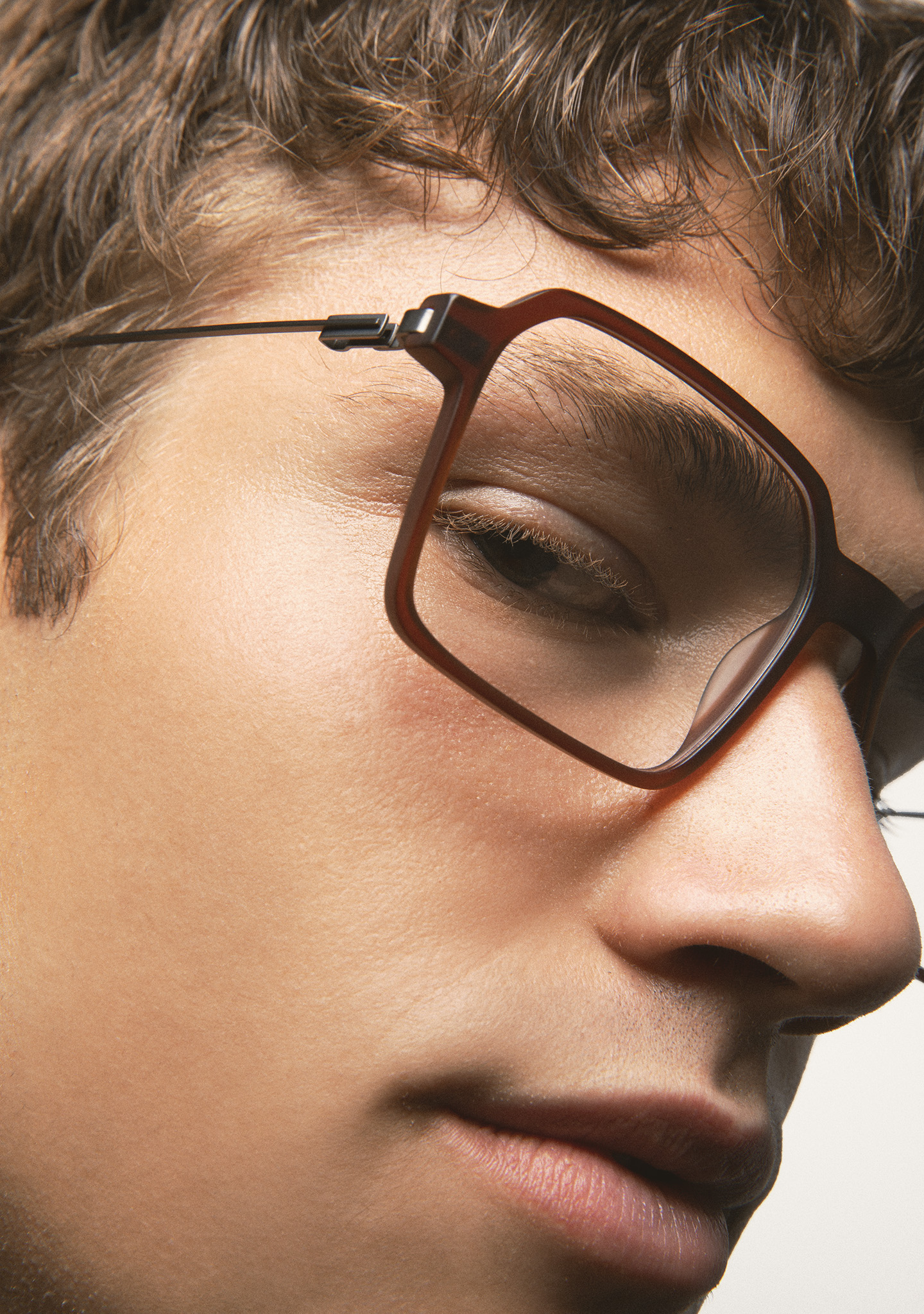Sehhilfe in rechteckiger Form. Front aus matt transparent braunem High-Density-Acetat. Bügel aus matt dunkelgrauem Edelstahl mit braunen Endstücken. Bügel mit neuer schraubenloser Scharniertechnologie. Integrierte Acetat-Nasenpads. Handgefertigt.